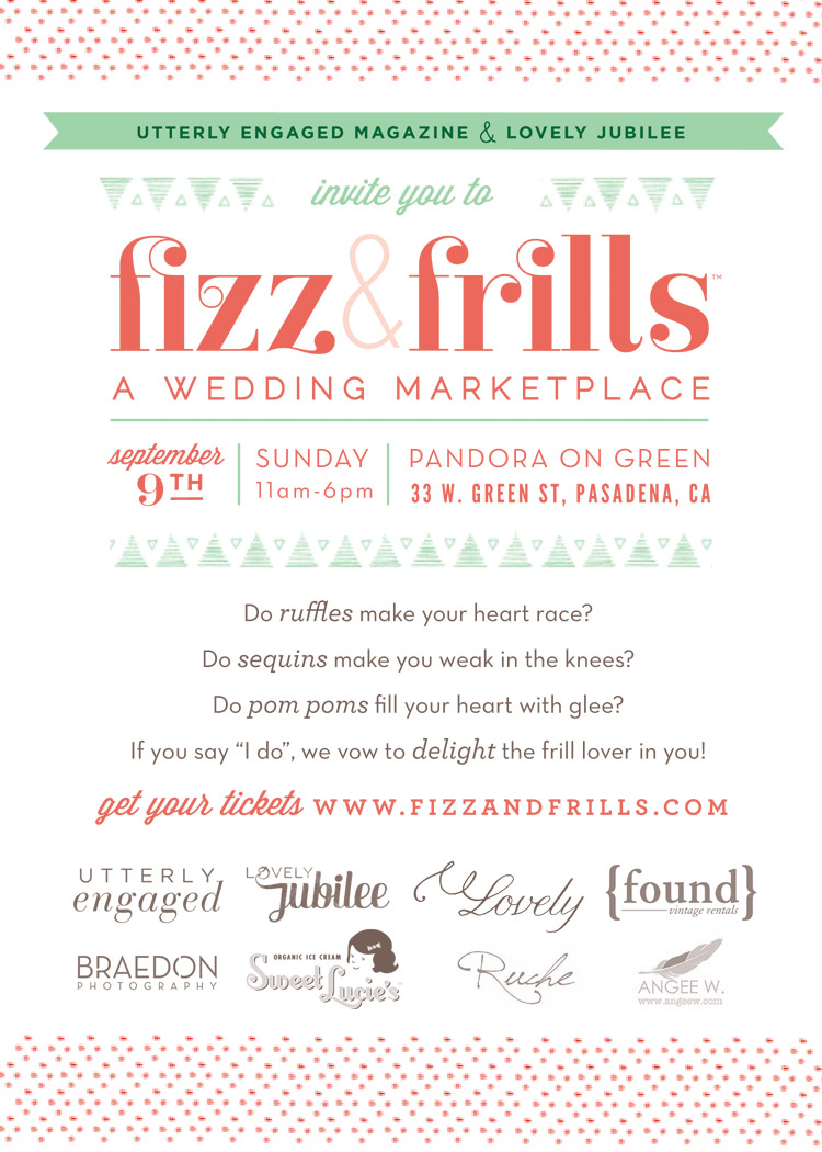 I am so so SO excited to be a part of Fizz & Frills hosted by fantastic ladies of Utterly Engaged. The event will include amazing vendors such as Ruche, 31 Bits, Lovely Bride and Sweet Lucie’s. Get your tickets and come hang out with us on September 9th!
