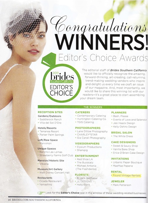 I am SO excited to share this news! I found out about a month ago that Found was the Winner of the Brides Southern California Editors Choice Award for Rentals! When I got a copy of the magazine in the mail and a letter tucked inside congratulating me, I seriously just stared at it for a good five minutes. Seriously?!?! What a tremendous honor to be on a list with such AMAZINGLY Talented professionals in this industry! I am humbled, and honored!