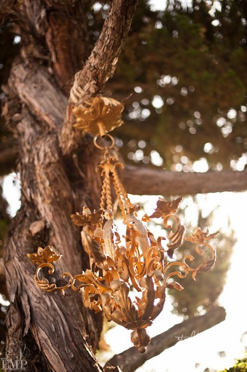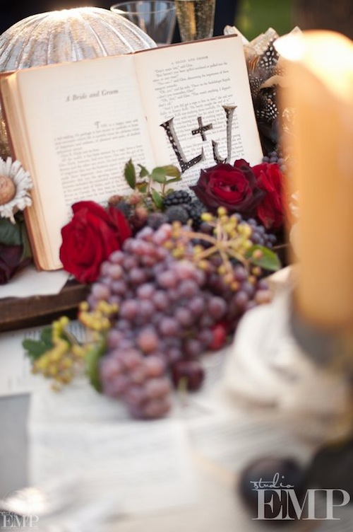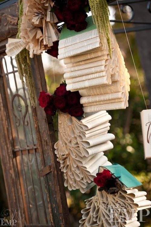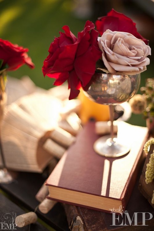Create a place for guests to feel comfortable, like an inviting living room. Conversations will grow beneath these gold chandeliers and around the refurbished red velvet wingback chairs, gold armchairs with grain sack upholstery and rolled arm couches. Vintage books, glass candles embraced in novel pages, antique picture frames, worn-in leather luggage, and oversized pillar candles dotted with champagne cork flowers and strung wine corks adorn the mantel while a cascade of book pages and roses flow out of the fireplace.