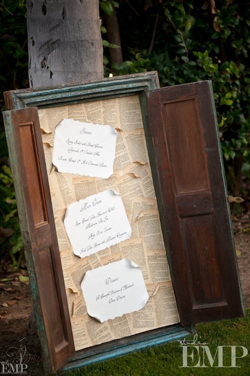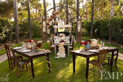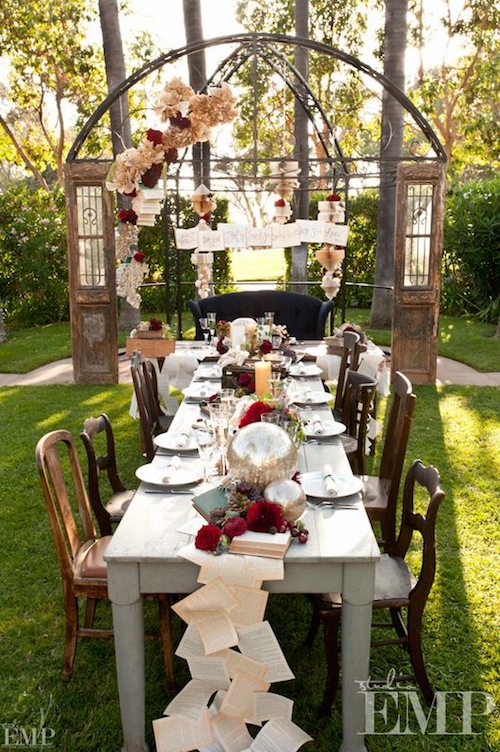 Design a warm and welcoming dinner atmosphere where guests can eat, drink and be merry. The goal is to have the evening less formal and save more intricate designs for the following night, while still setting the mood and keeping with the feel of the weekend. A weathered cupboard door announces the oversized menu, replacing traditional individual menu cards. You and your love can take your seats in a navy blue wingback settee at the head of the table underneath the pergola. Iron and wood architectural doors designed with hanging books that spell out a love sonnet frame the backdrop for the picture perfect event. Centerpieces were created using a Remington typewriter, deconstructed books and pages, feathers, glass orbs and a variety of Roses, Hanging Amaranthus, Poppy and Scabiosa pods, Magnolia leaves, Dinner Plate and Pom Pom Dahlias, and berries. Family and friends gather on assorted antique wooden chairs around the grey farm table where they feast under the stars served family-style on bronze and pewter pieces.