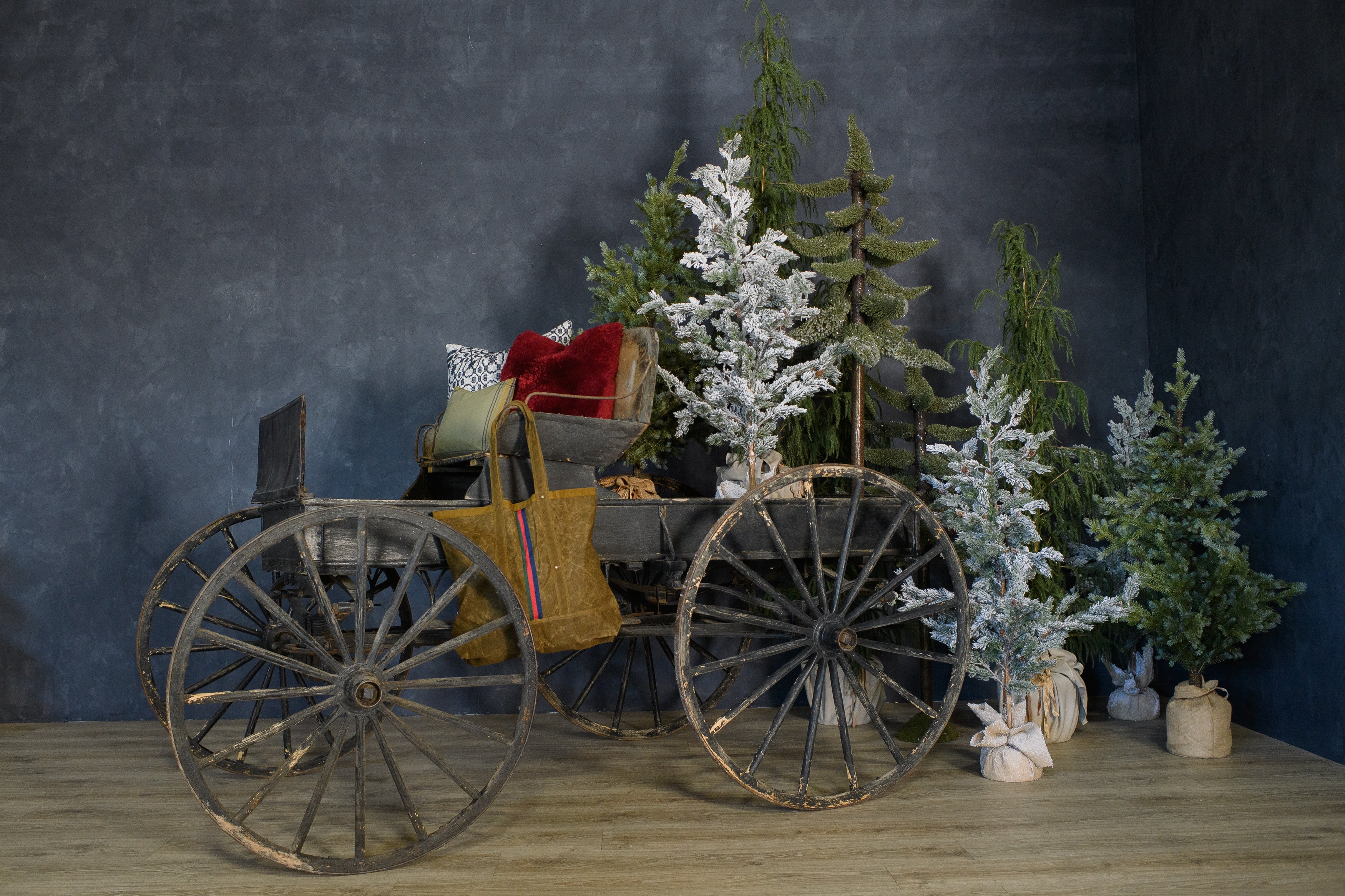 A vintage carriage with worn black paint, large spoked wheels, and a weathered seat that speaks to its age. This piece brings instant storytelling to any setup and works beautifully as a photo moment, display base, or thematic prop for seasonal and outdoor events.
