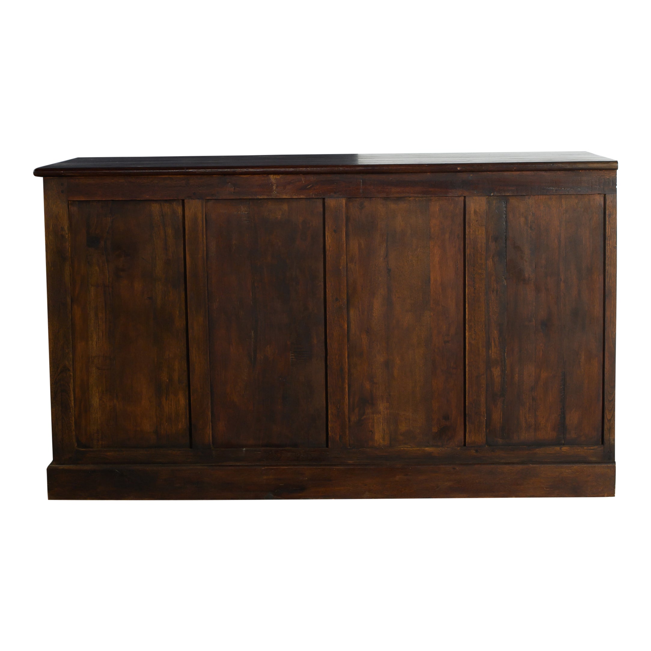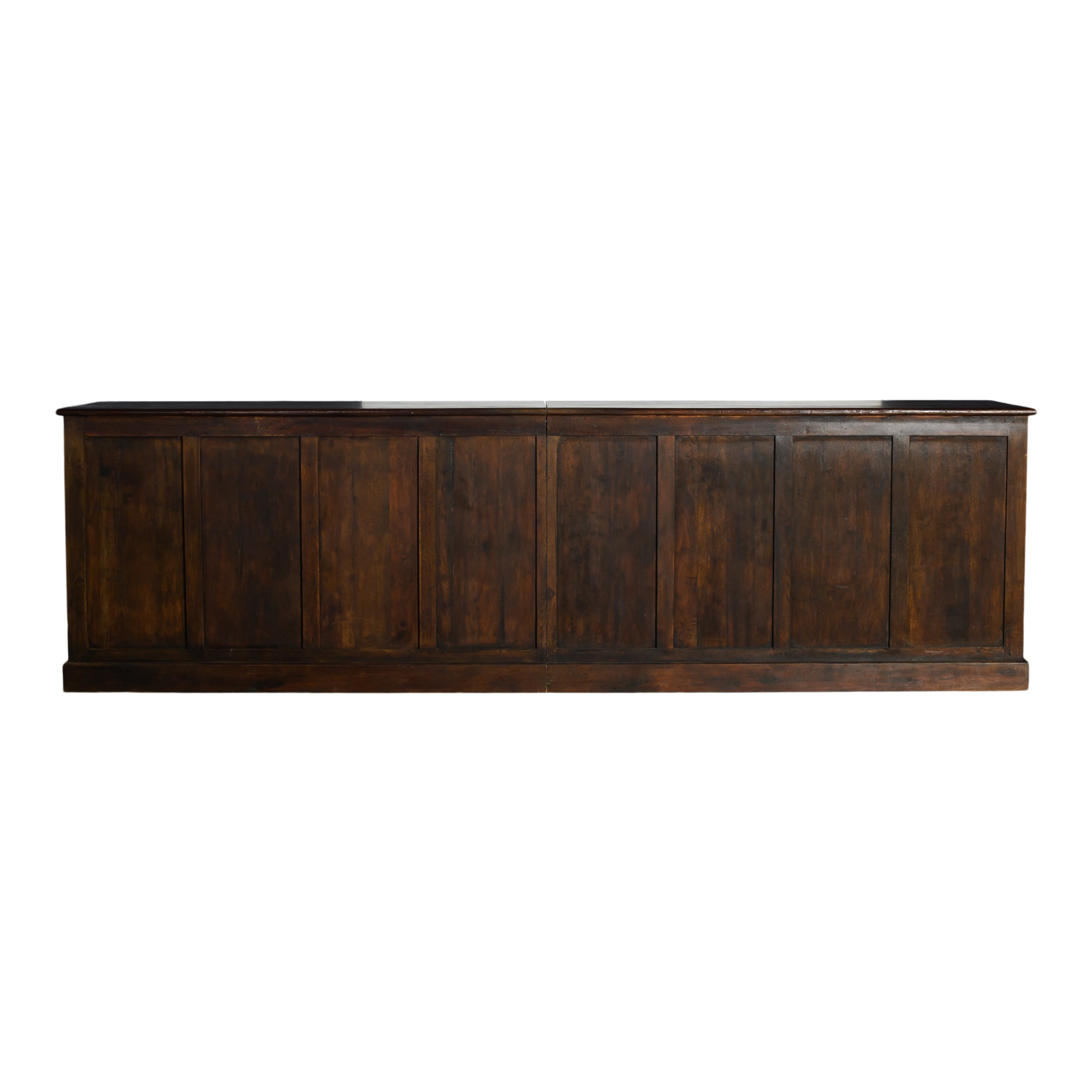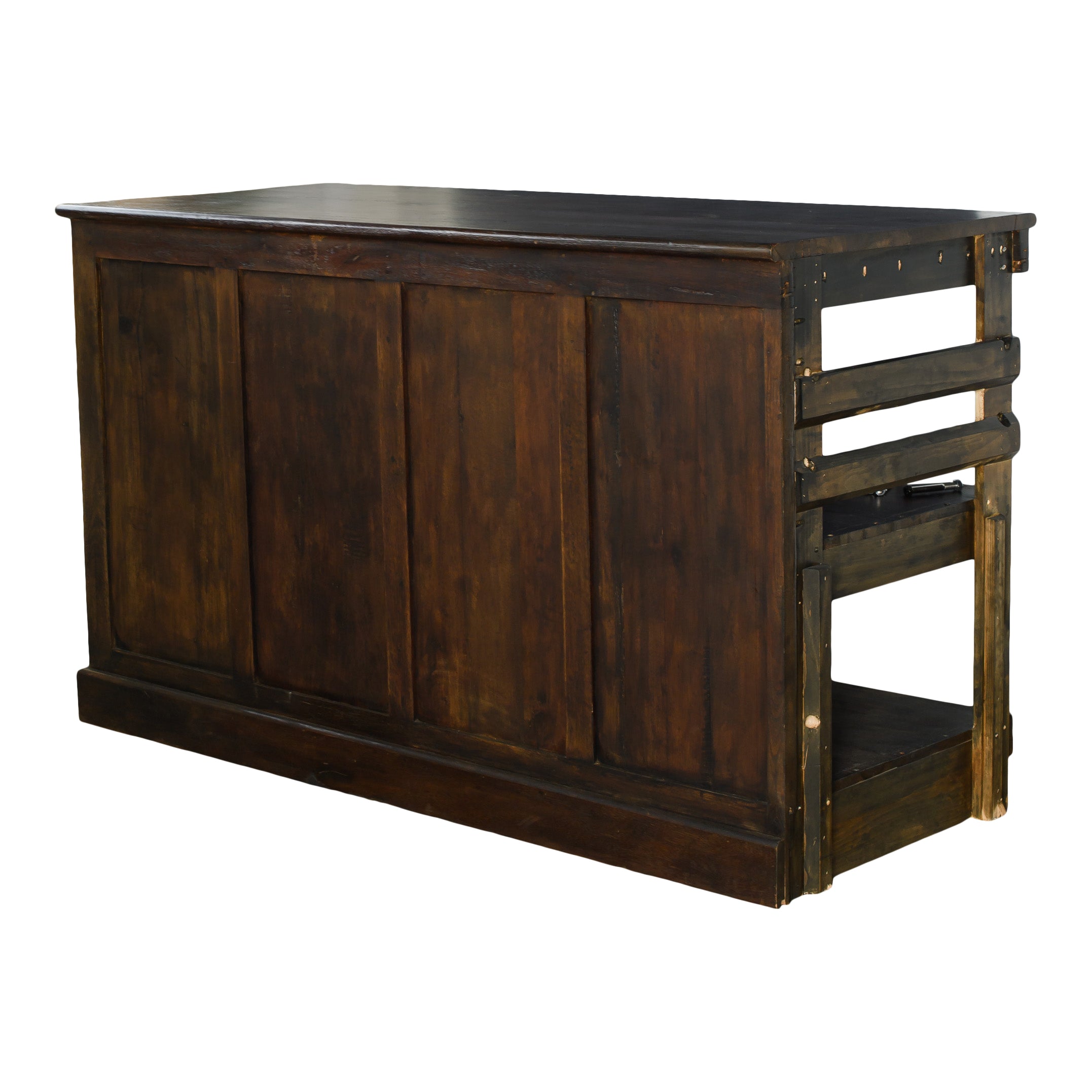 A large walnut wood bar that makes a strong focal point for gatherings. Its spacious surface provides plenty of room for serving drinks or displaying food. Dimensions: 144 x 29.5 x 42
