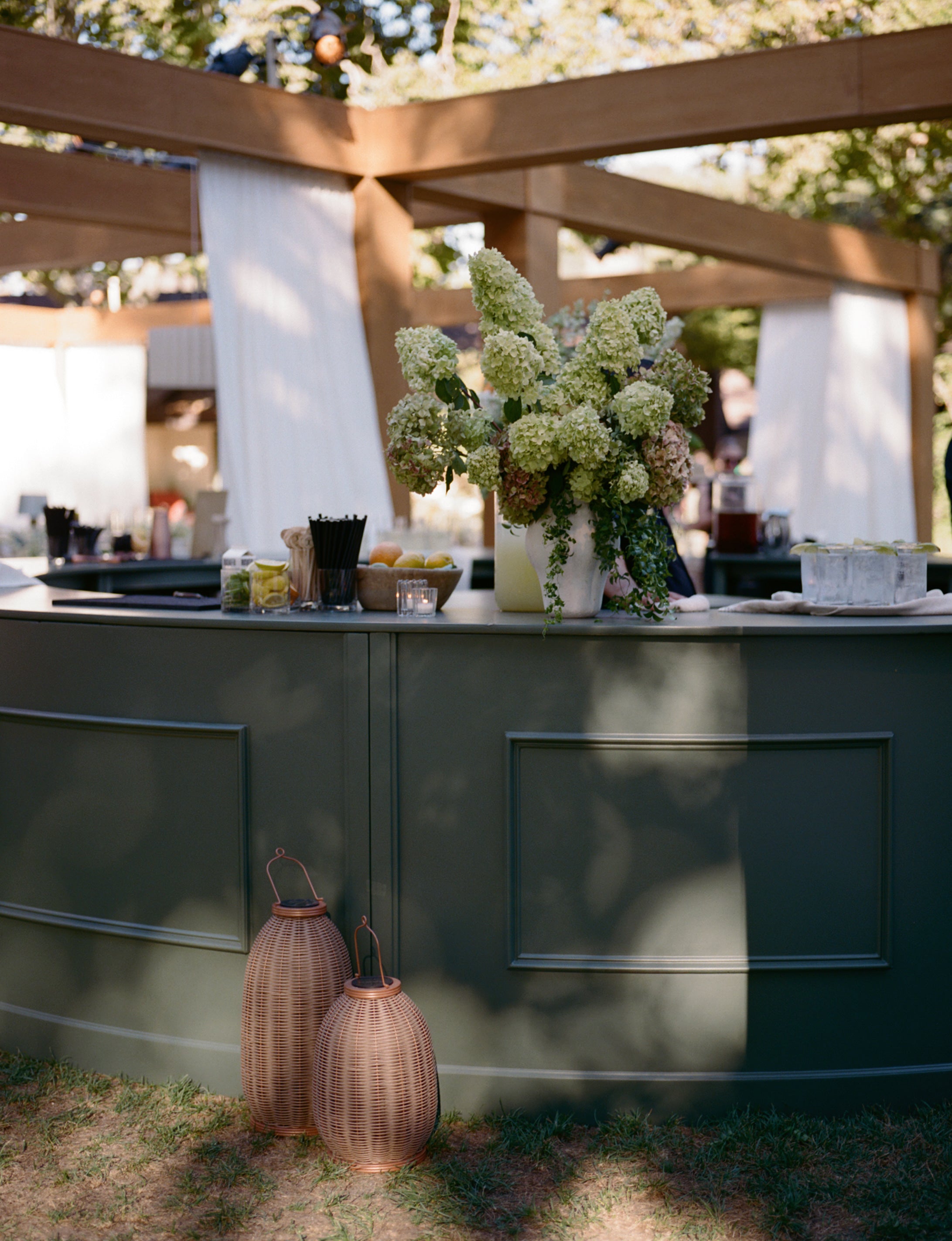 Custom 360 degree green bar. Comes in 11 pieces. Inside diameter: 155", Opening: 29.5-39", Shelf height: 13.75" Made by Found Dimensions: 202.5 x 202.5 x 41