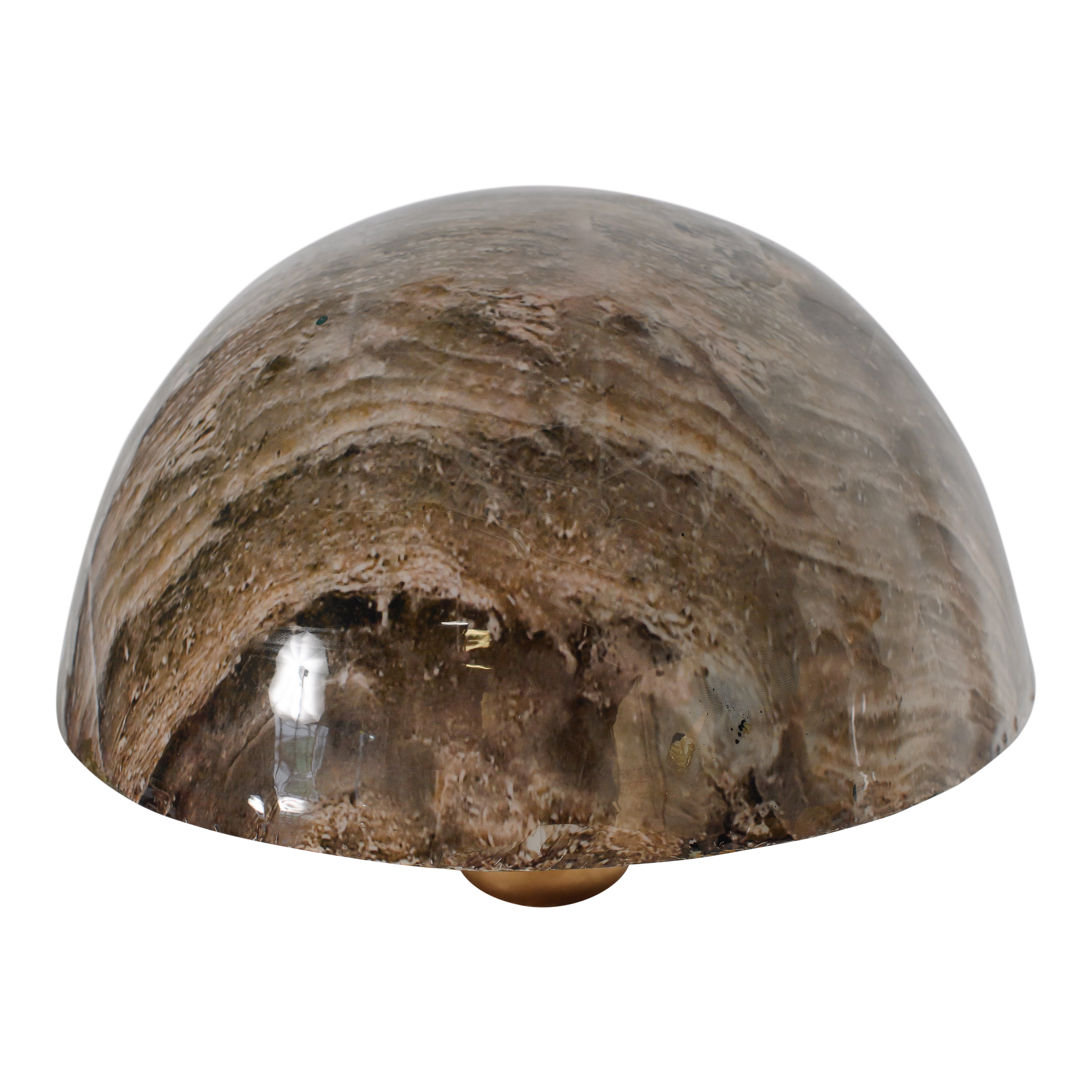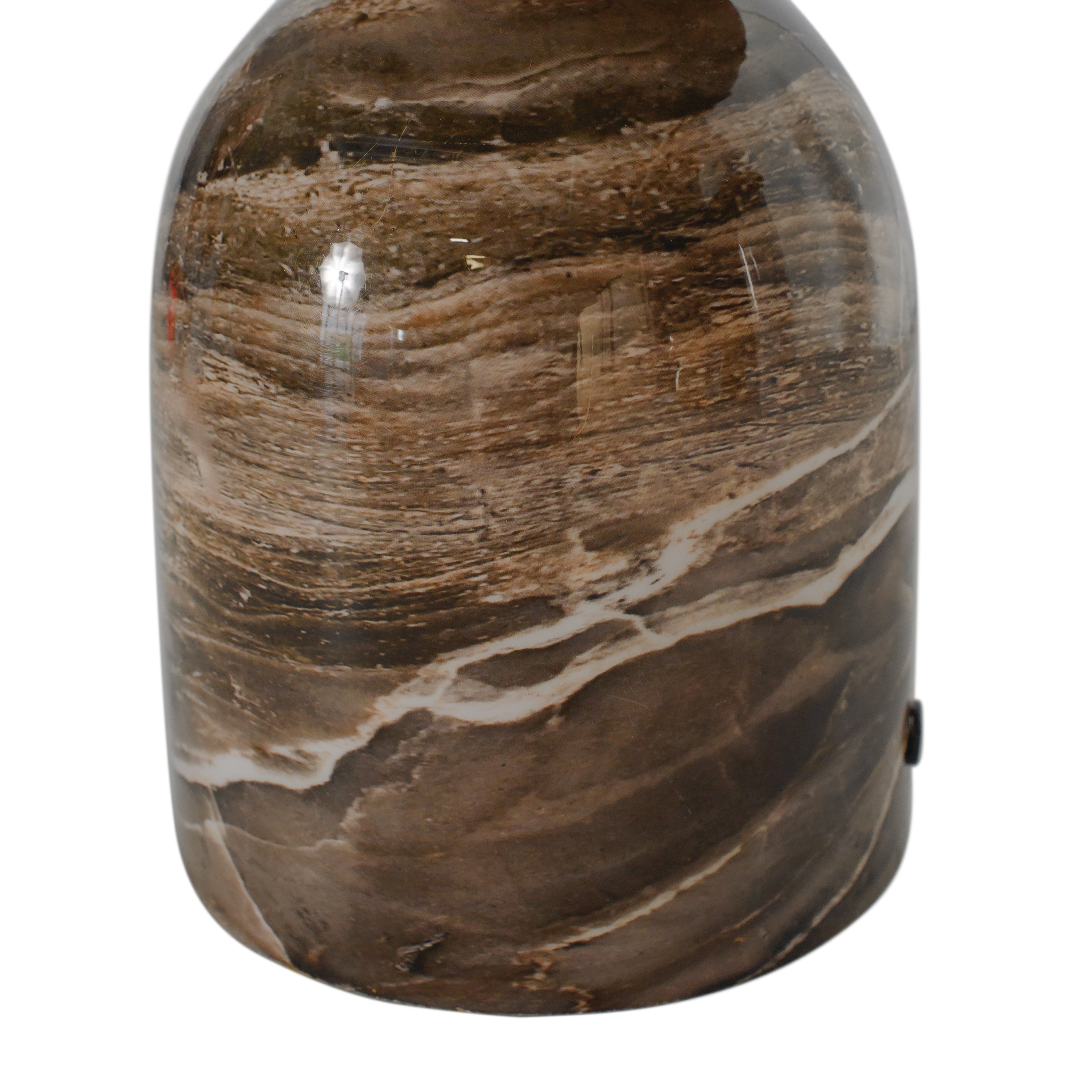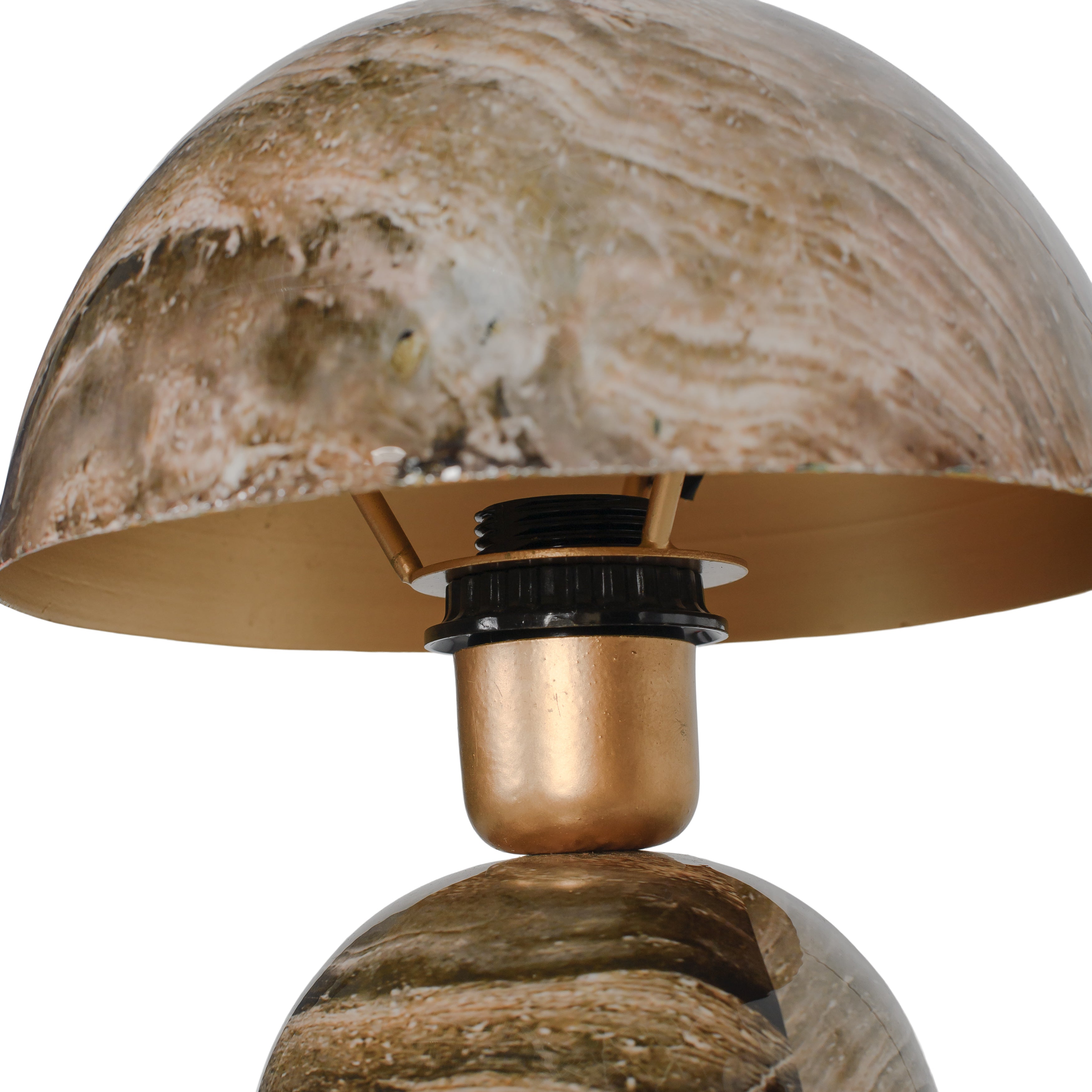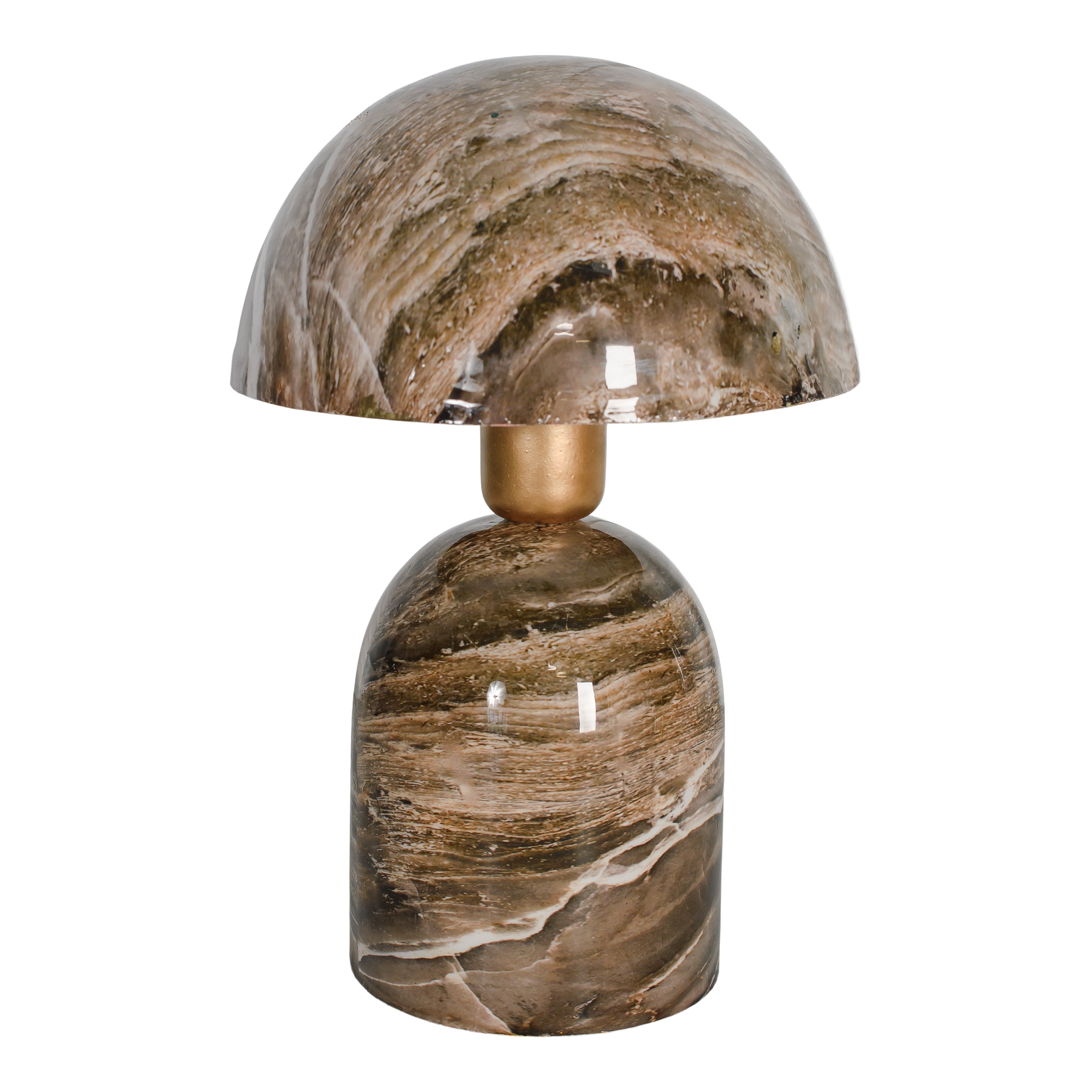 A dome-shaded lamp featuring a rich, stone-like marbled finish in earthy tones. Its rounded silhouette and warm metal accent at the neck give it a sculptural presence, making it an eye-catching layer for side tables, bars, or styled vignettes.