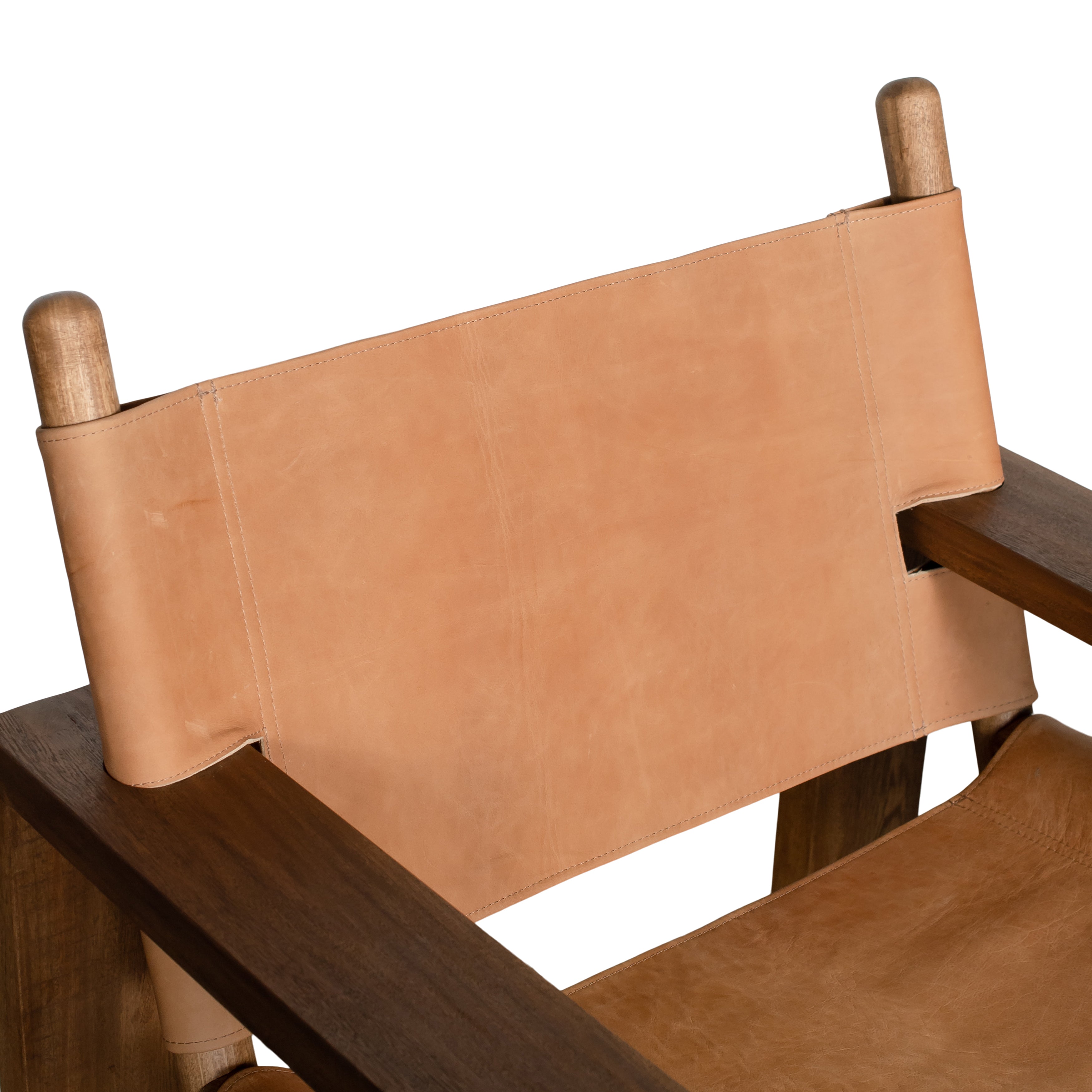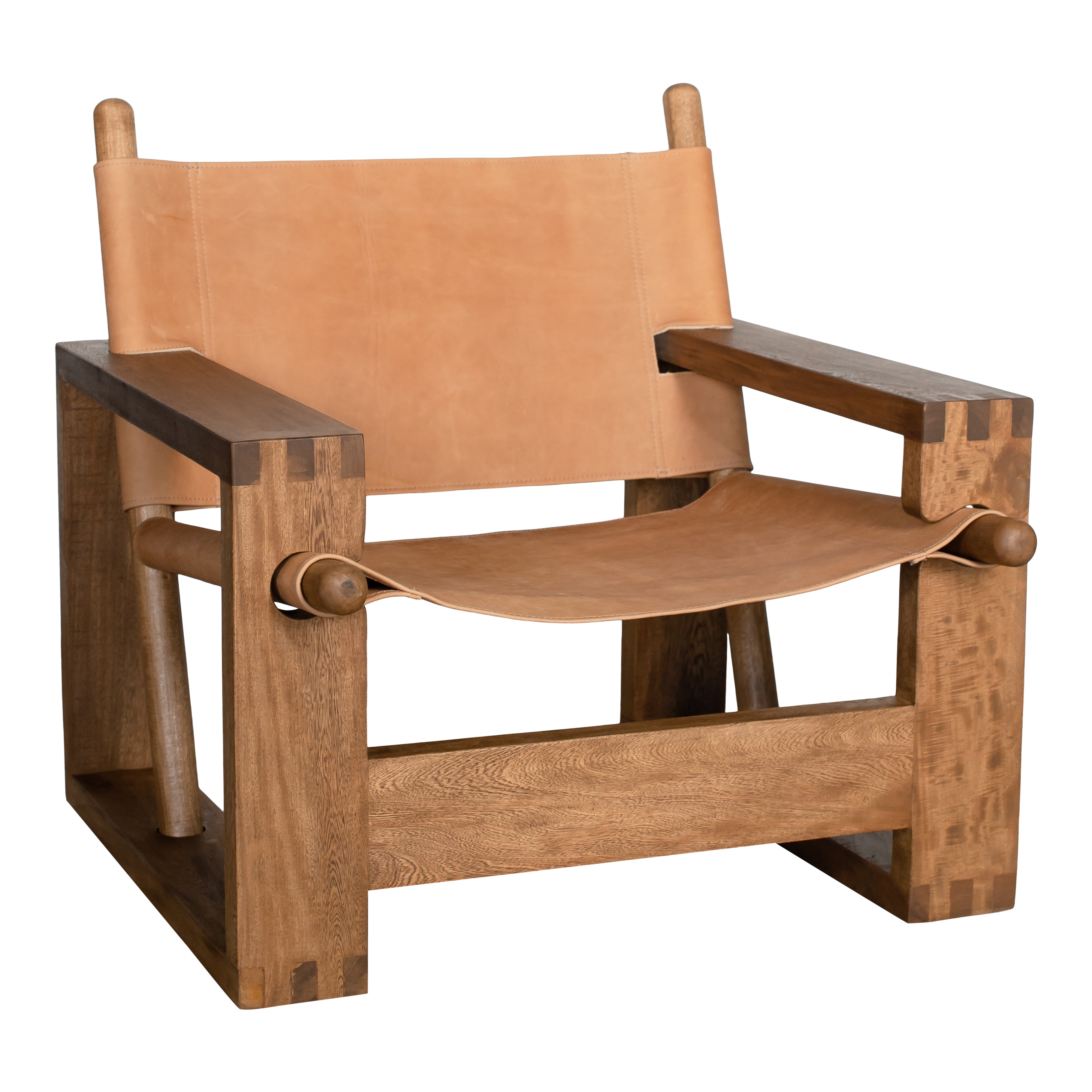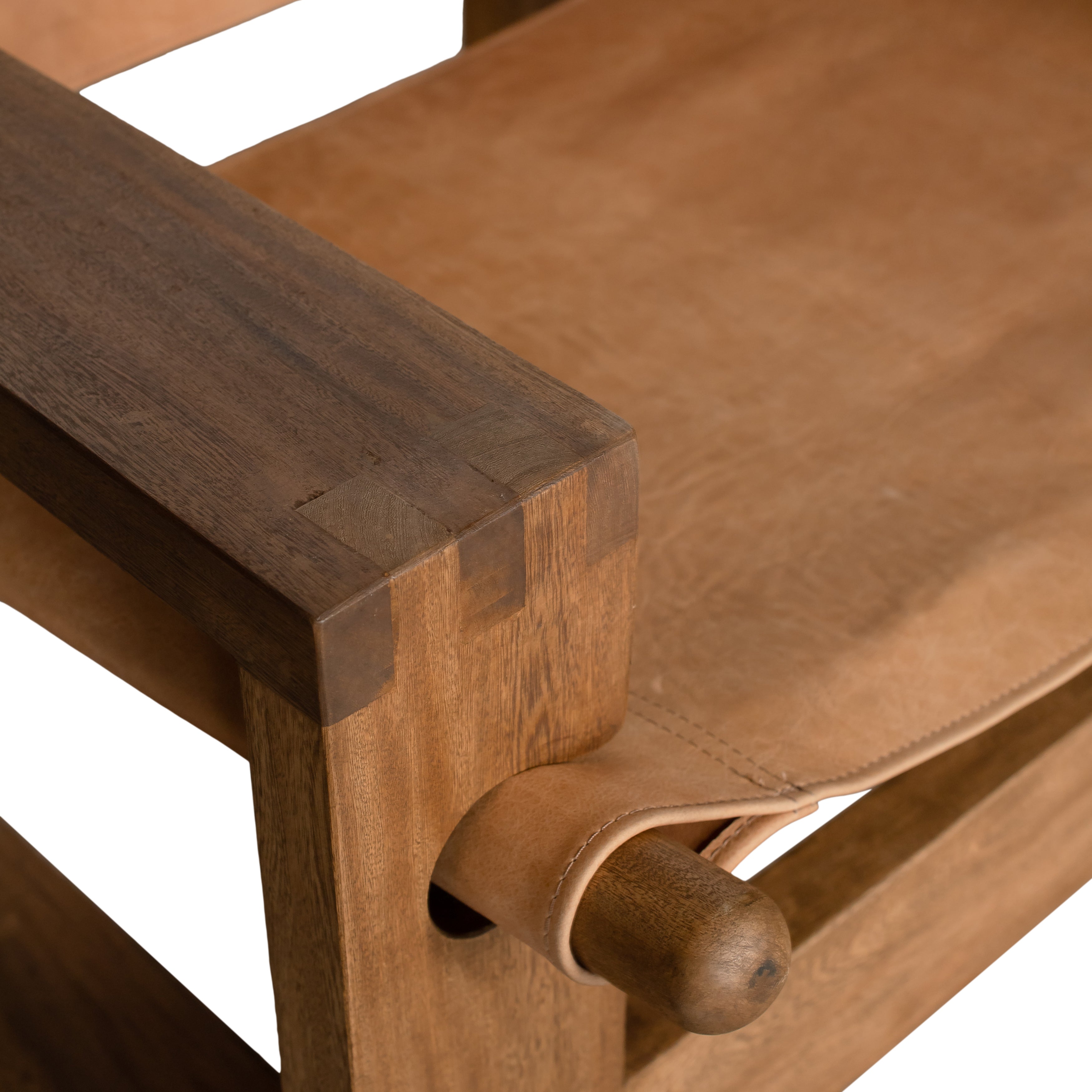 The Briggs Cognac Armchair combines a solid wood frame with natural leather seating for a look that’s both bold and timeless. Its sling-style seat and backrest bring a relaxed feel, while the angular frame and dovetail joinery showcase craftsmanship and detail. Ideal for lounge areas or paired seating arrangements.