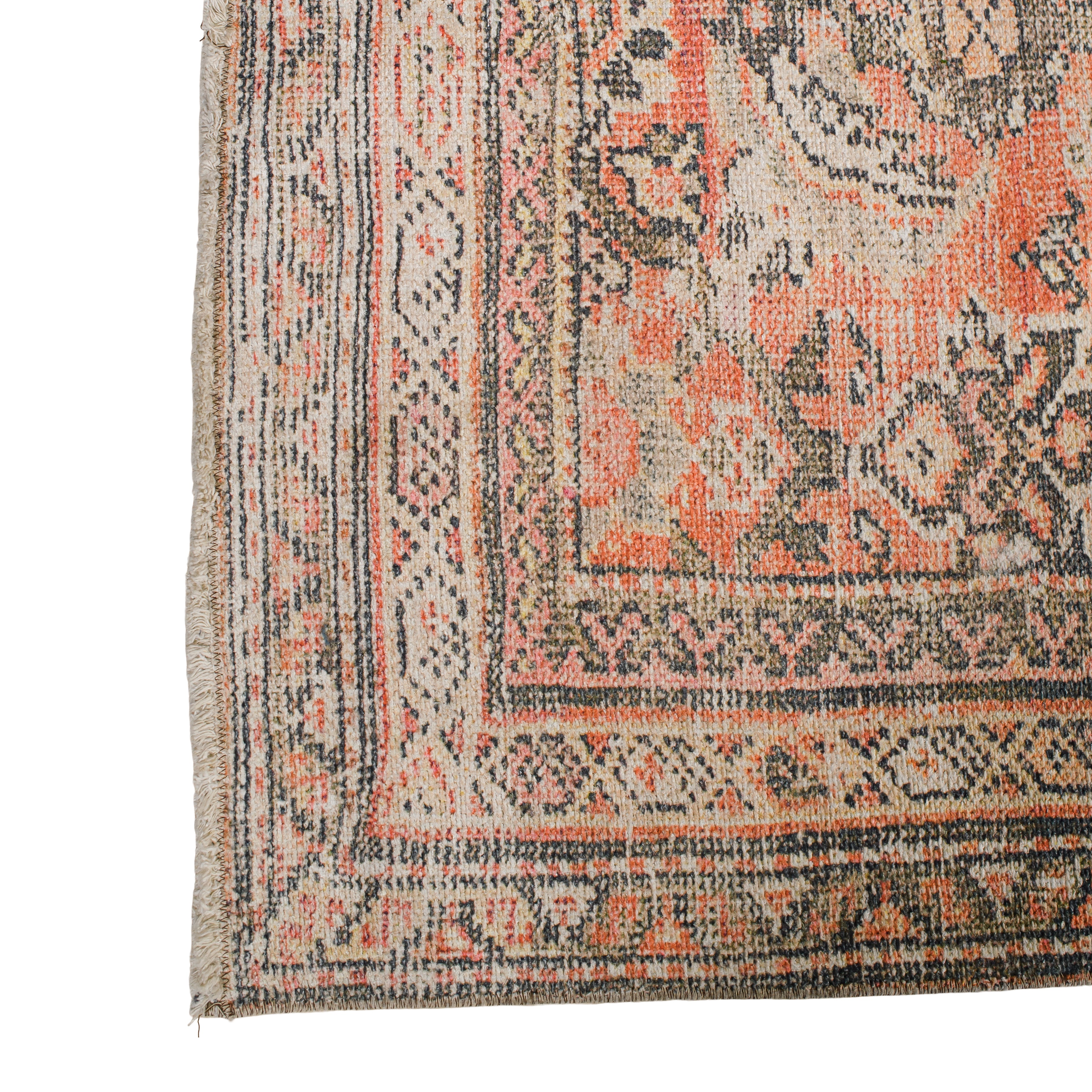 A vintage inspired rug with a soft, faded palette of coral and neutral tones. Its detailed pattern adds texture and warmth, making it a great layer for event lounges or styled spaces. Dimensions: 89 x 113
