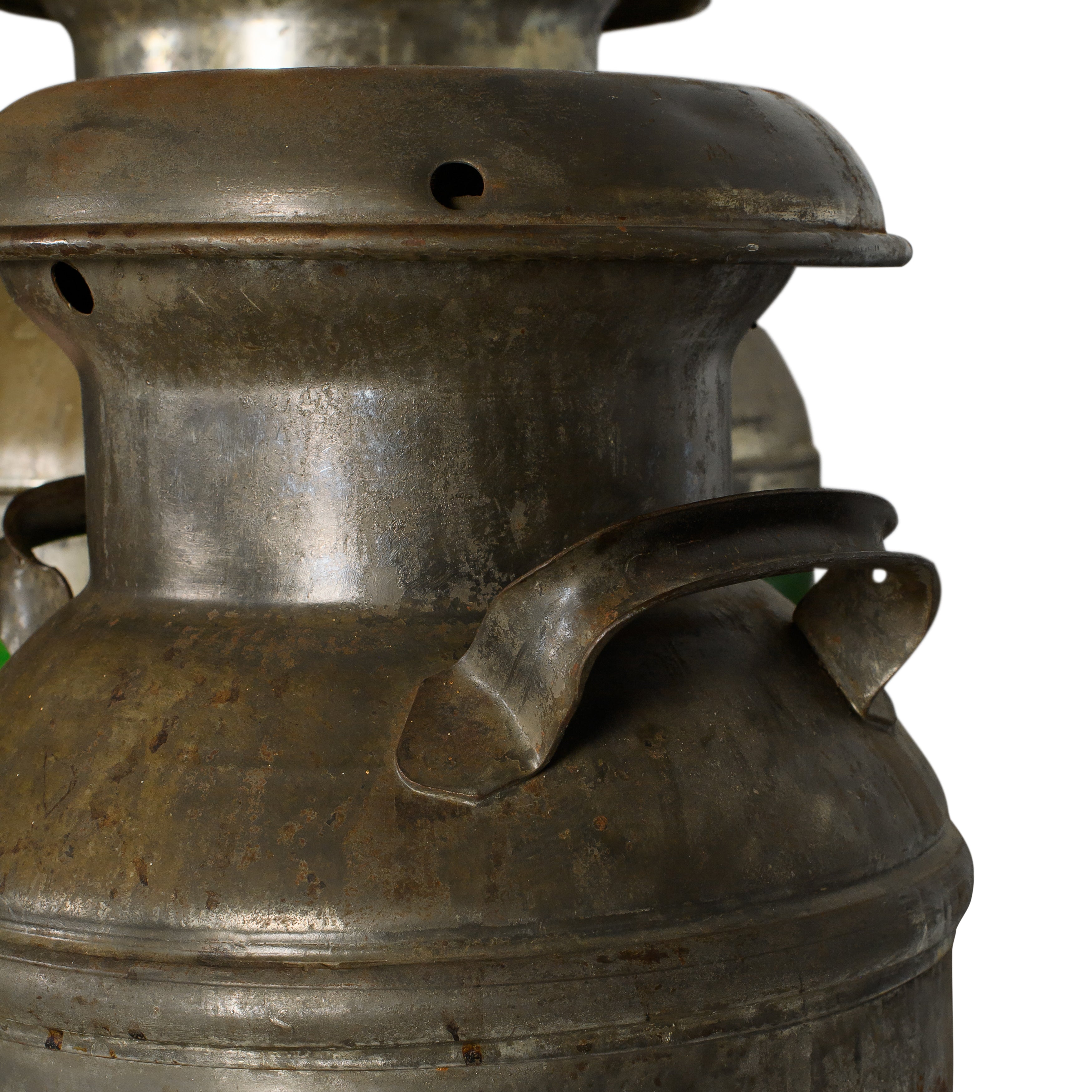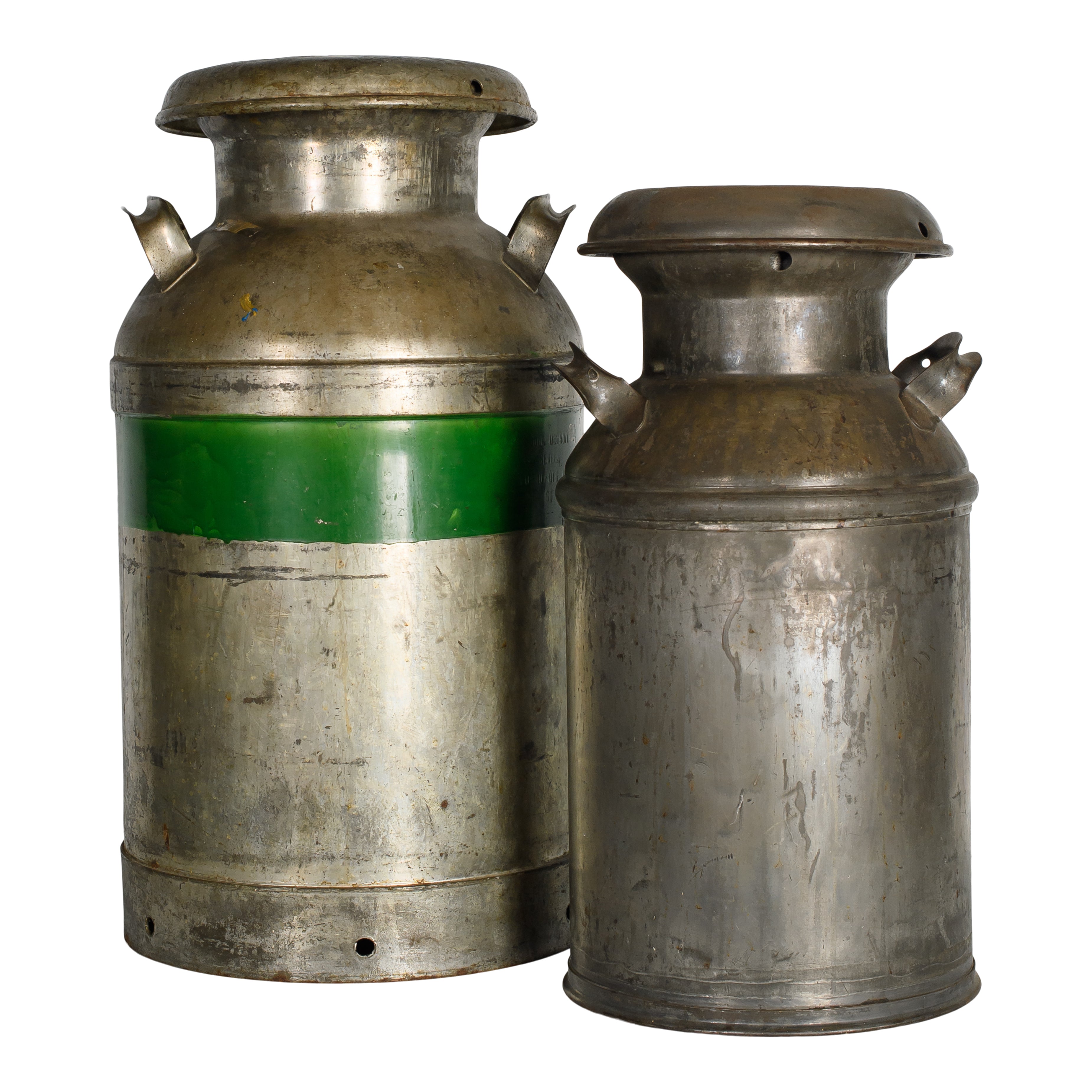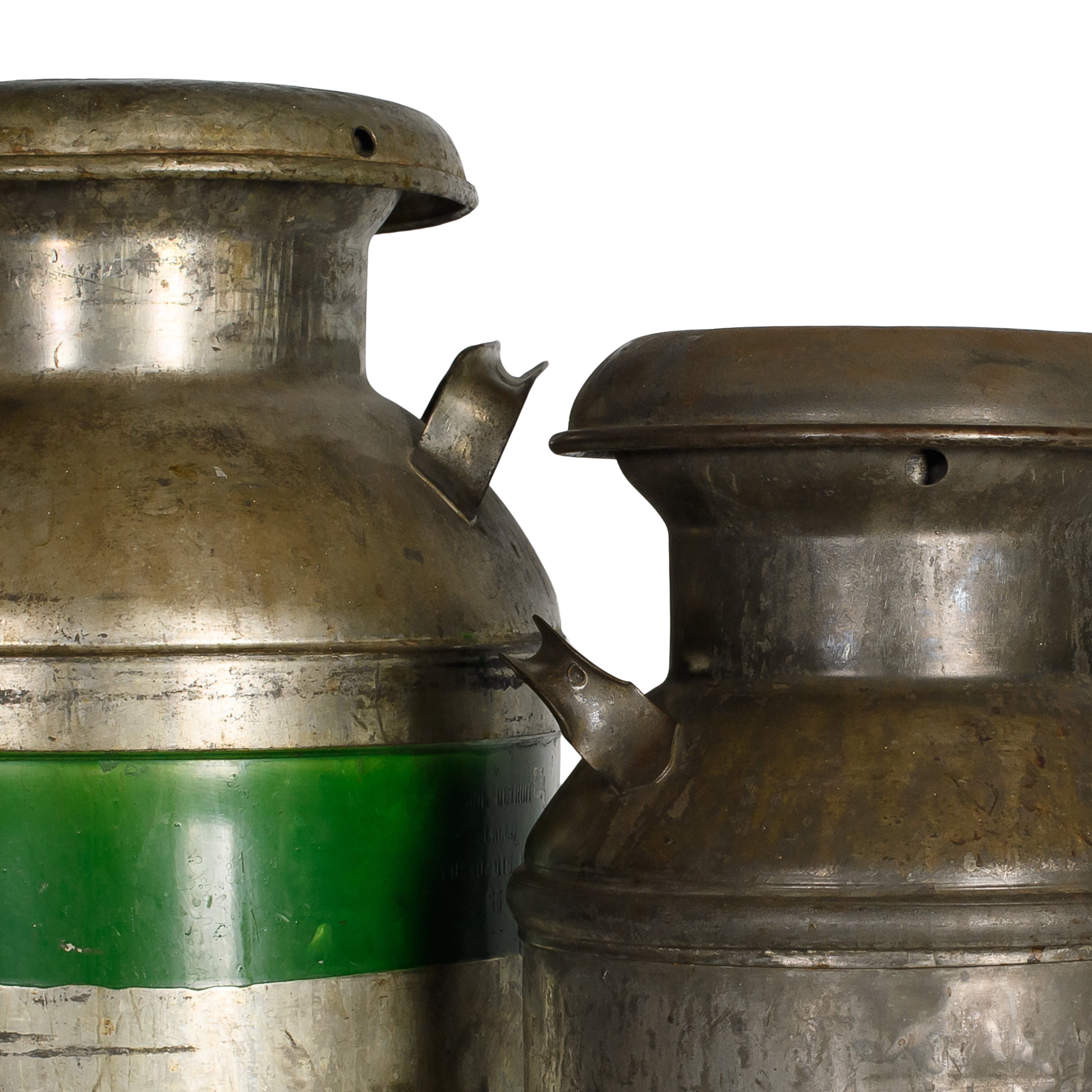 A pair of vintage metal milk vessels with sturdy forms, rounded lids, and side handles that show their practical origins. Their patinated surfaces and subtle variations in tone give them a collected, storied character that adds depth to styled events.