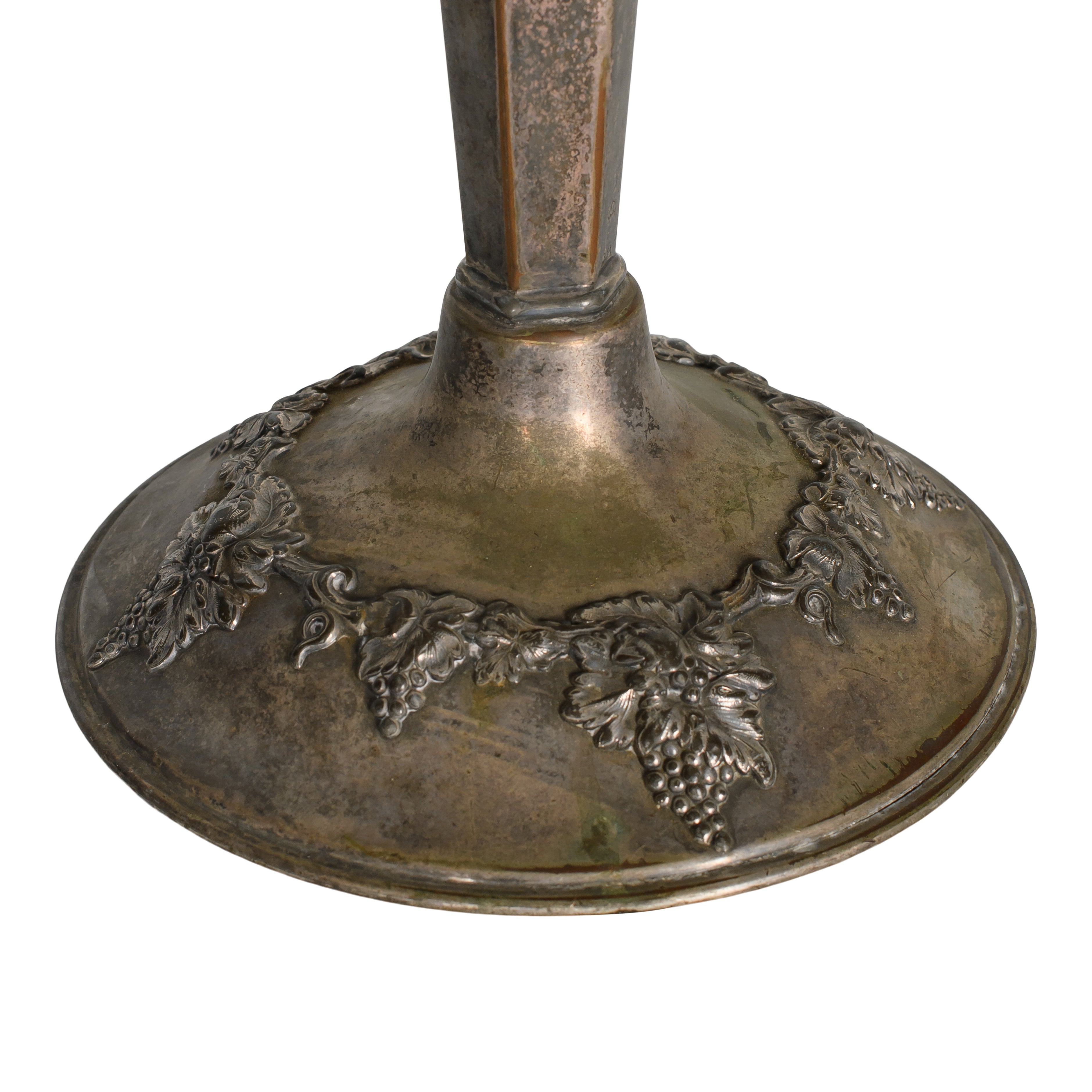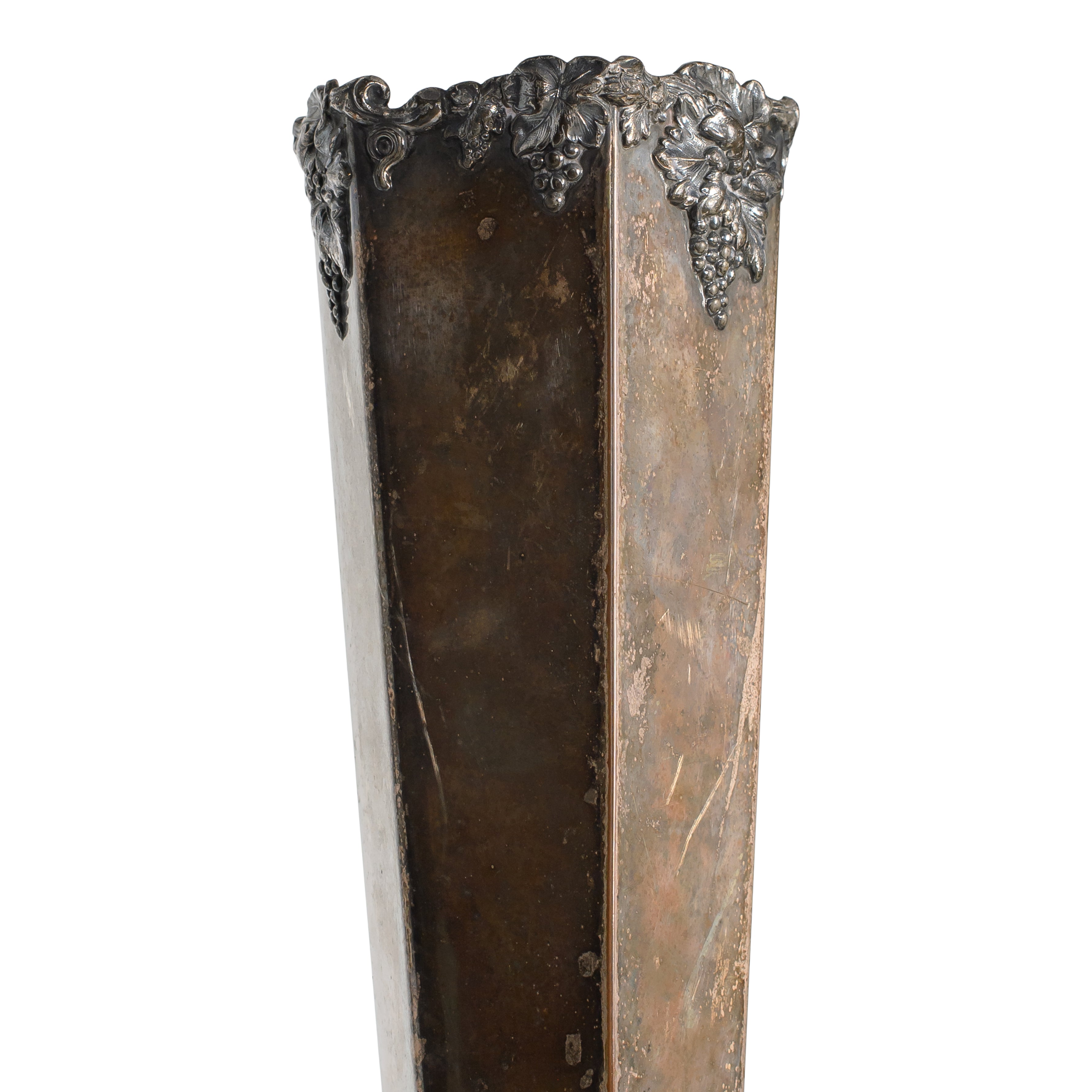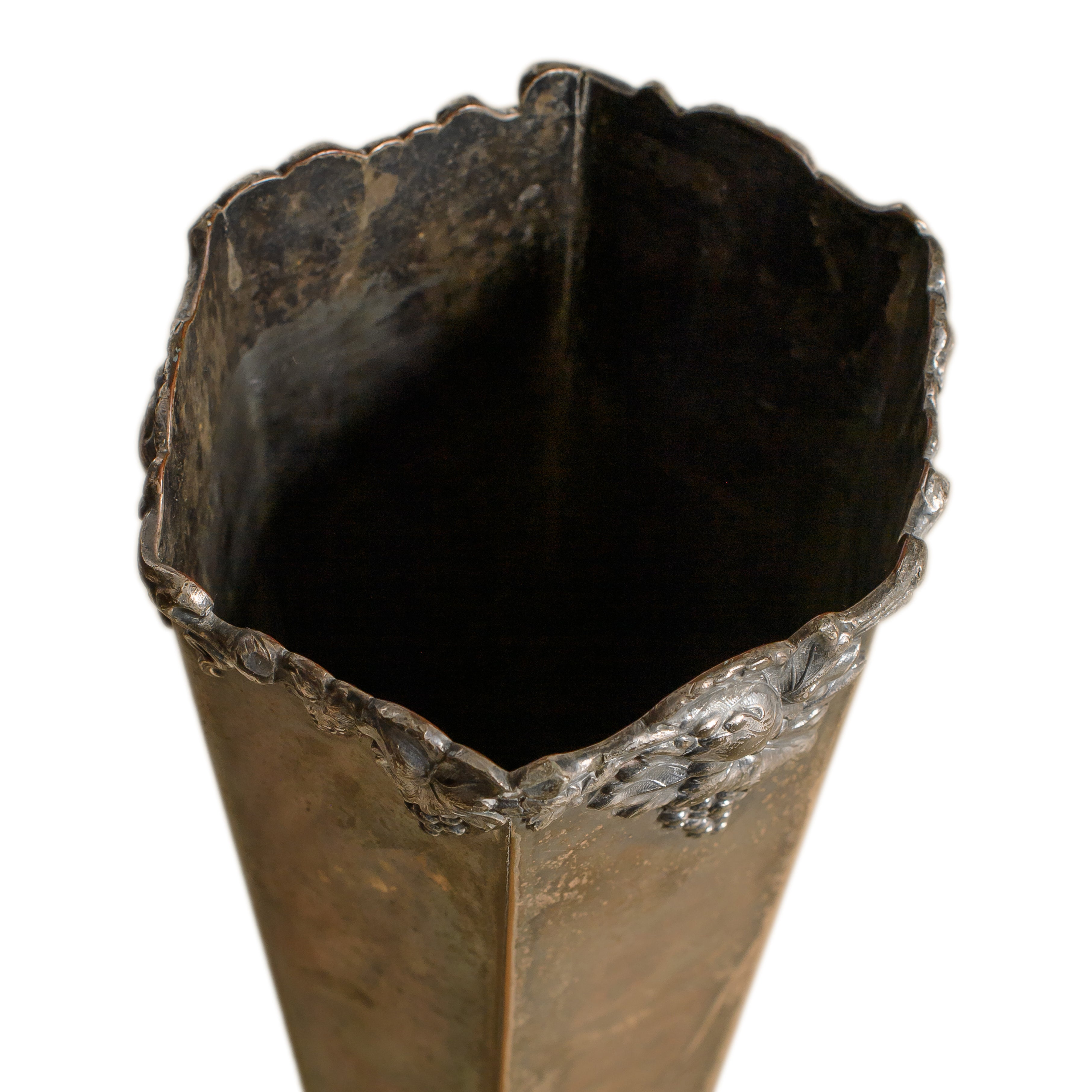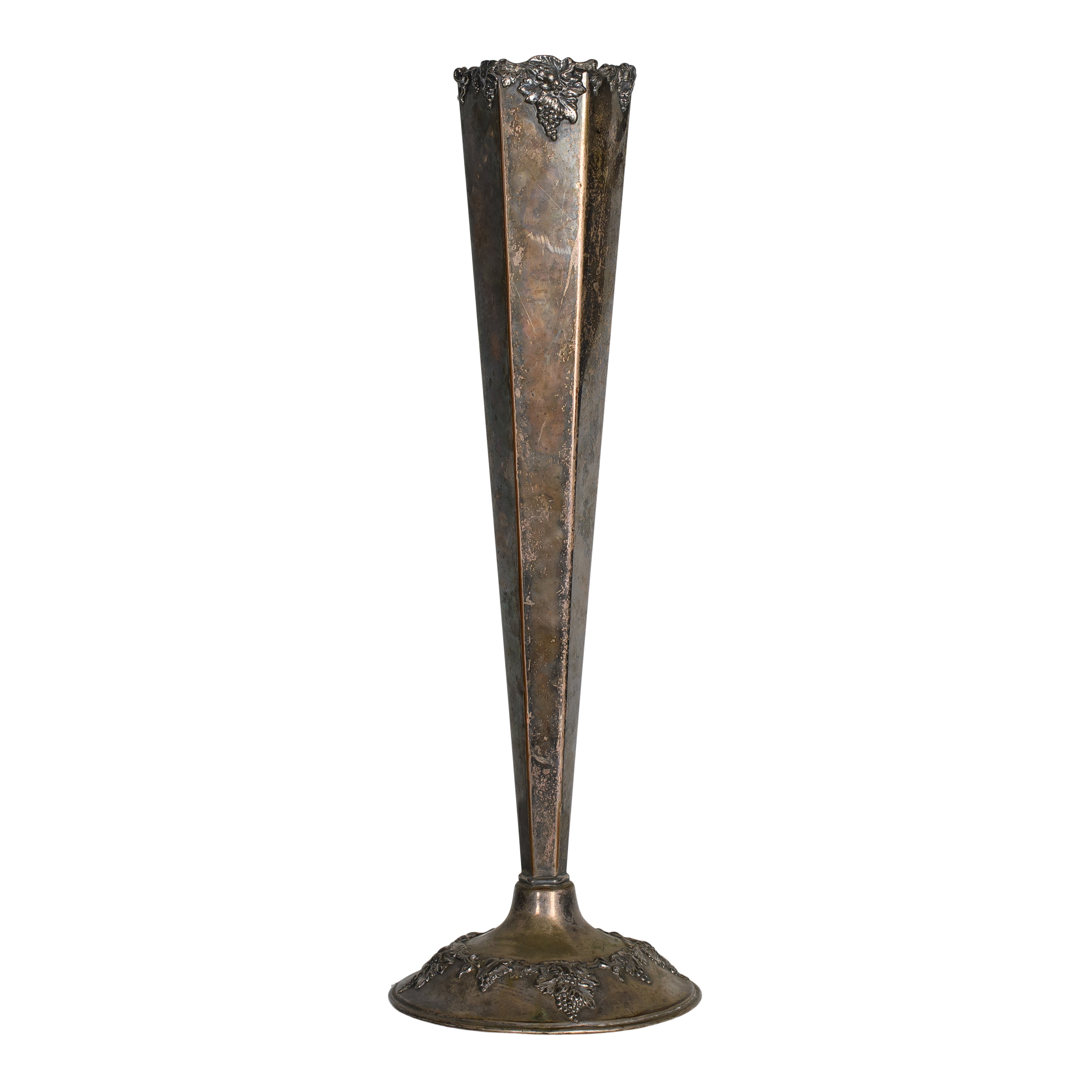 Tall metal vase with a narrow tapered body, decorative detailing at the rim, and a round embossed base. A simple way to add a refined touch to event décor.