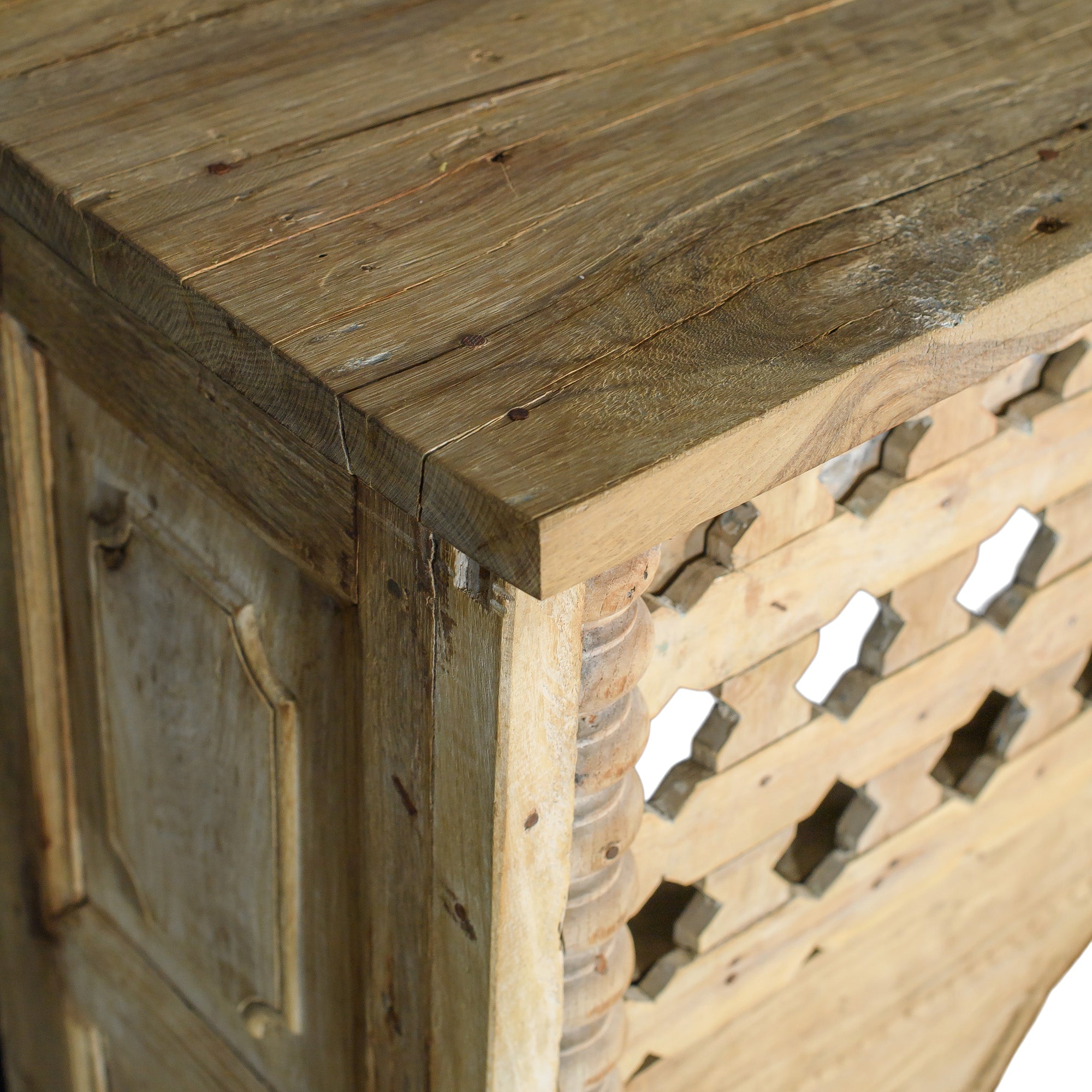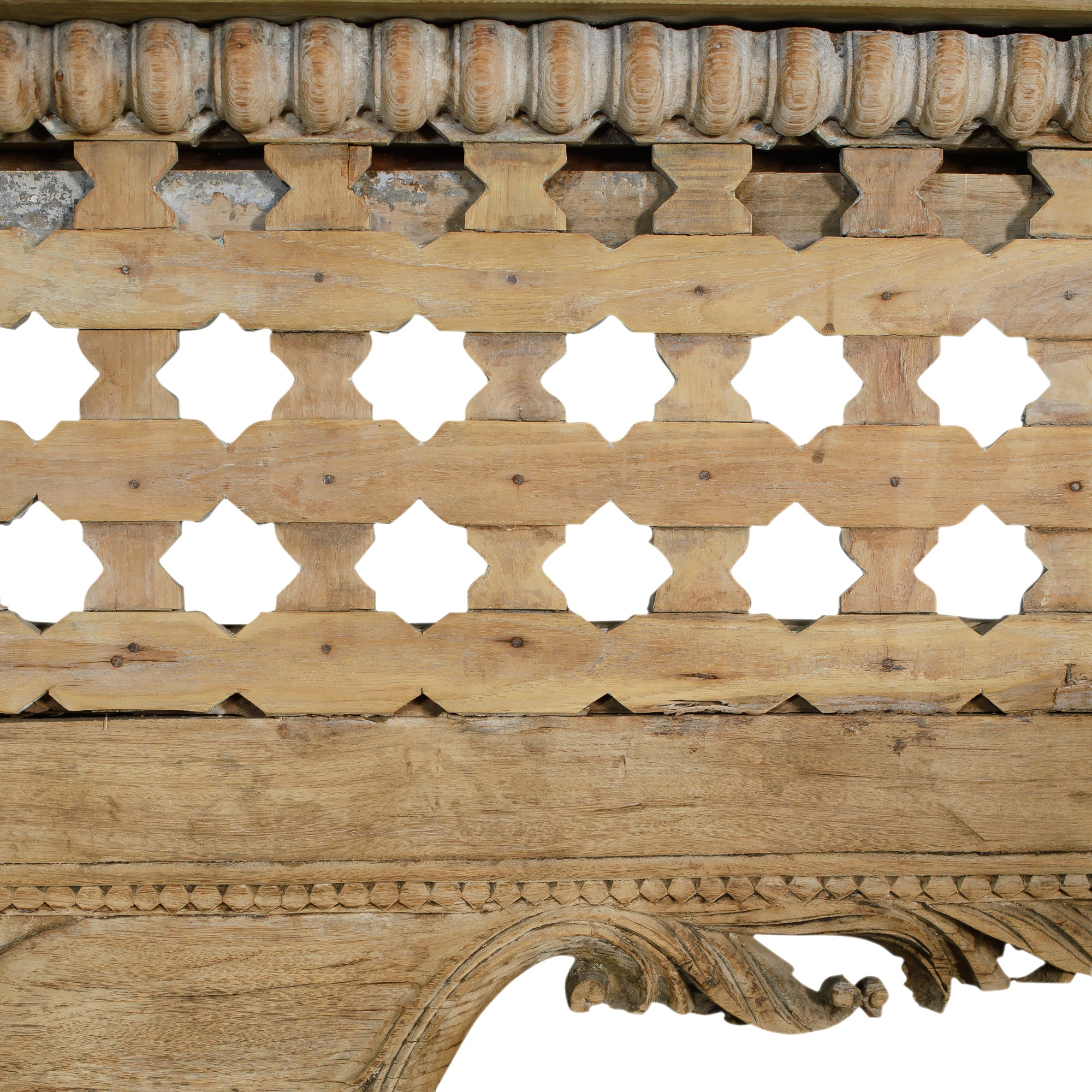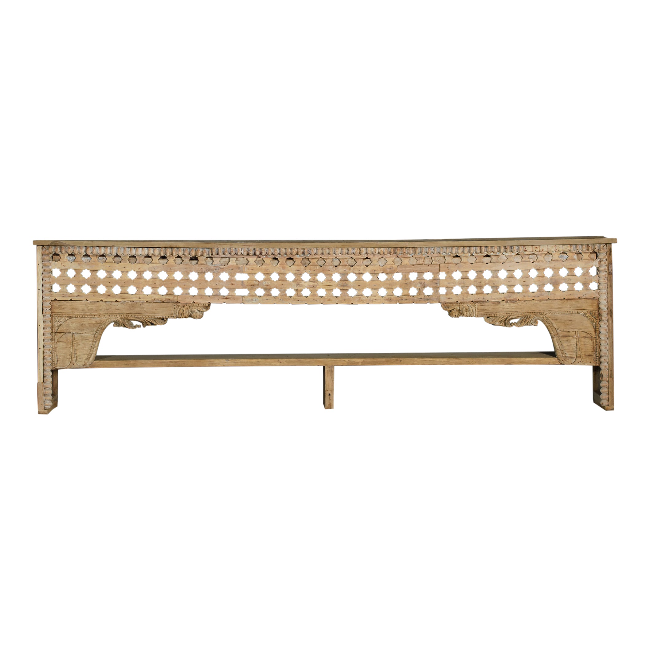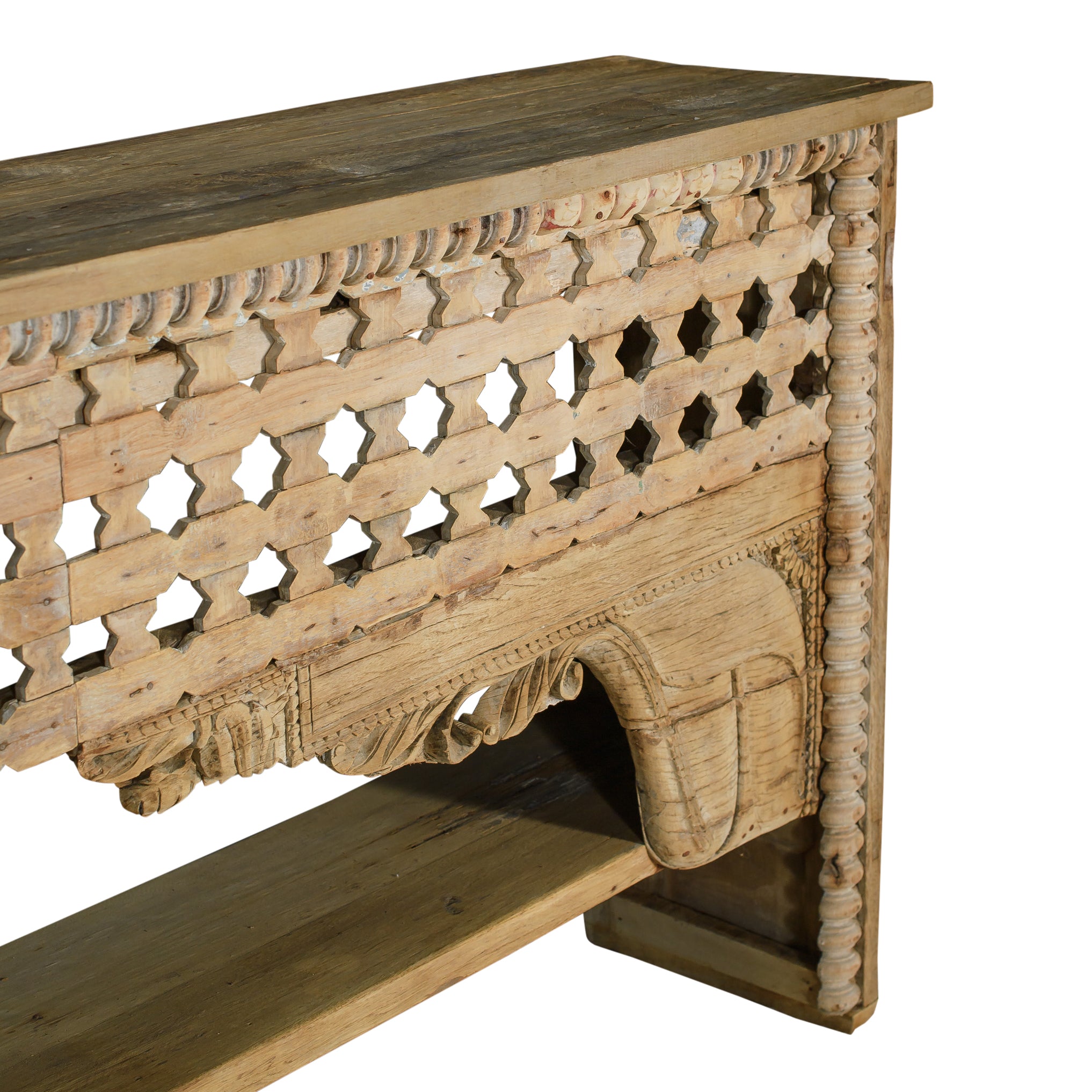 A long, carved wood console table featuring an intricate front and sculpted bracket details. Its light, natural finish and openwork design make it a standout piece for escort arrangements, lounge vignettes or layered décor moments.