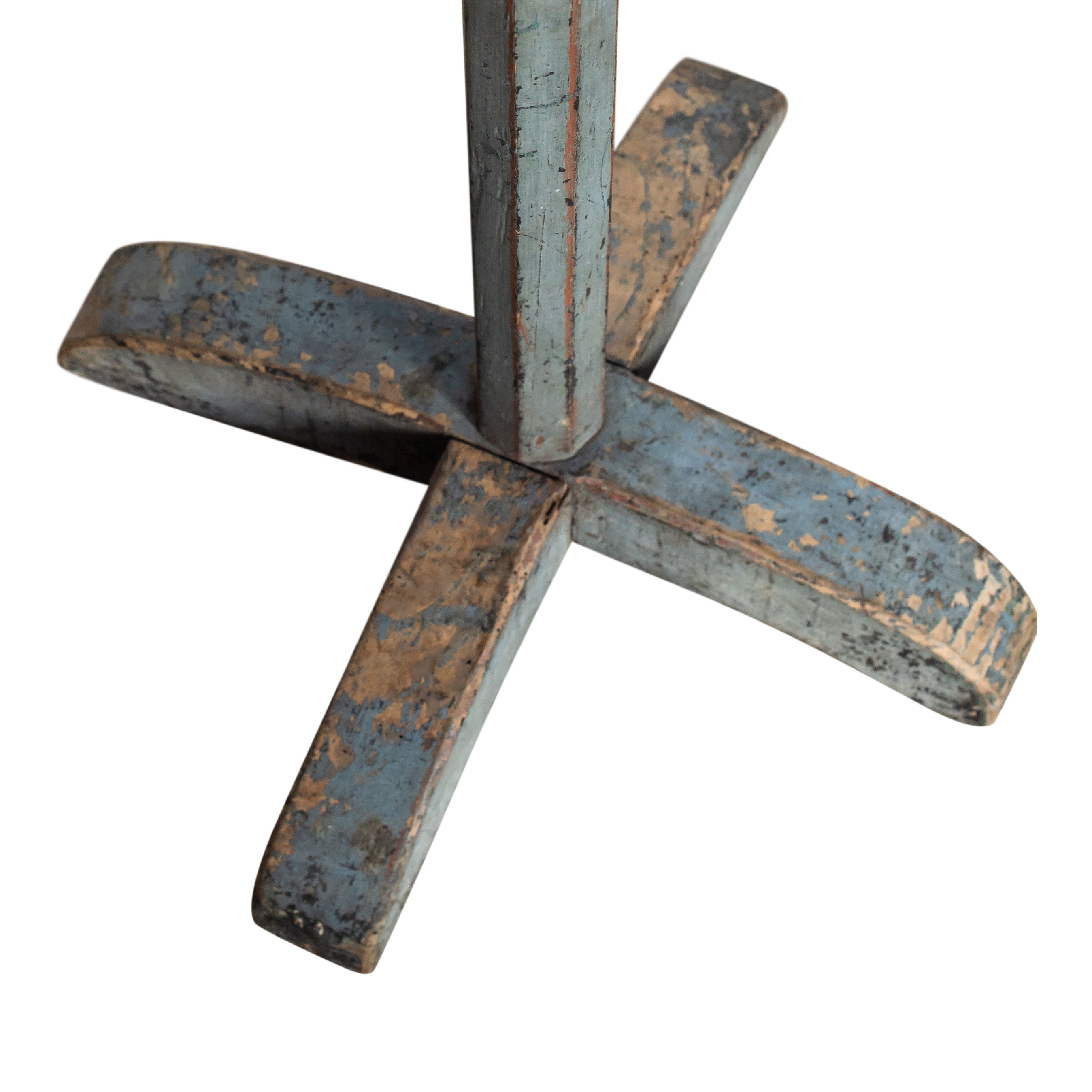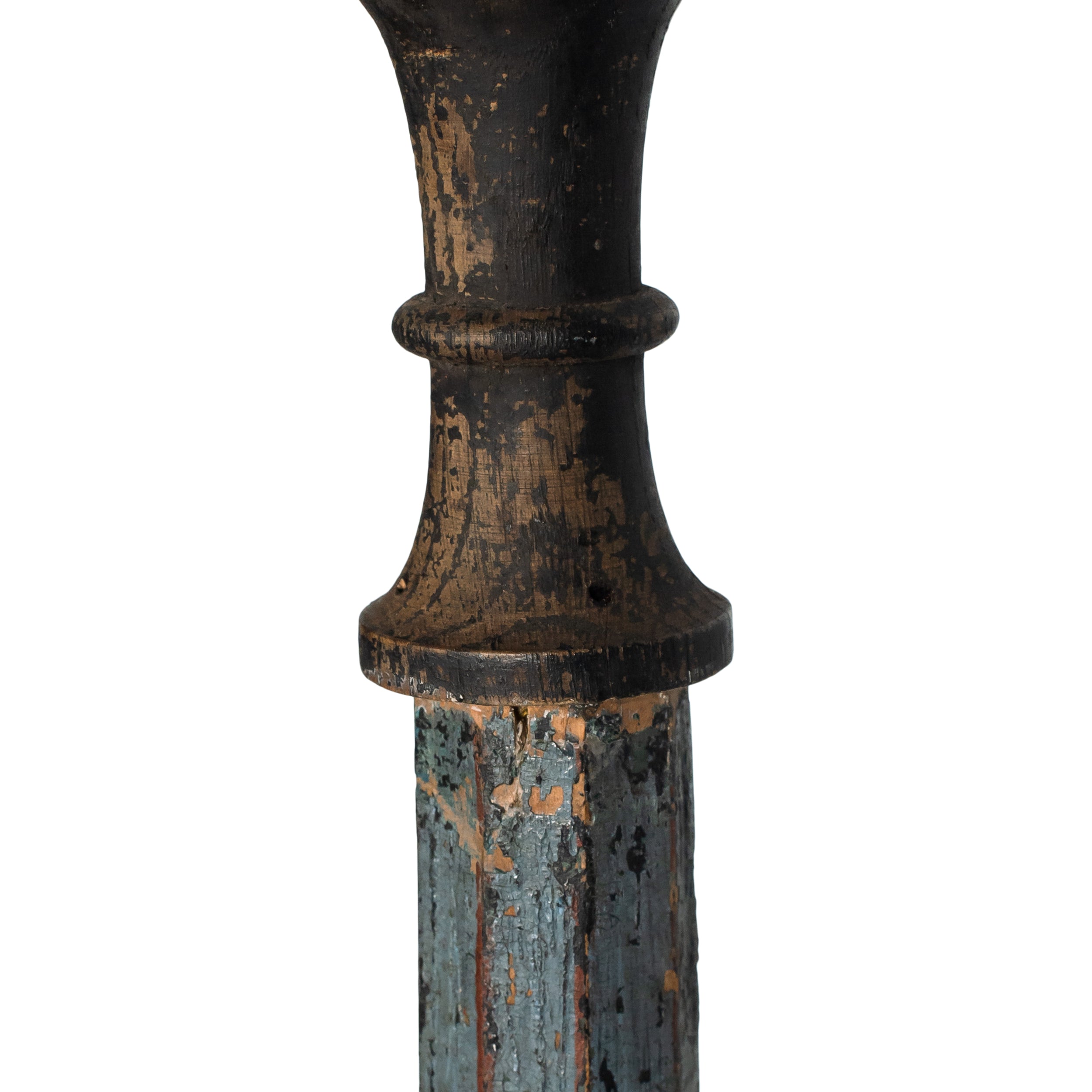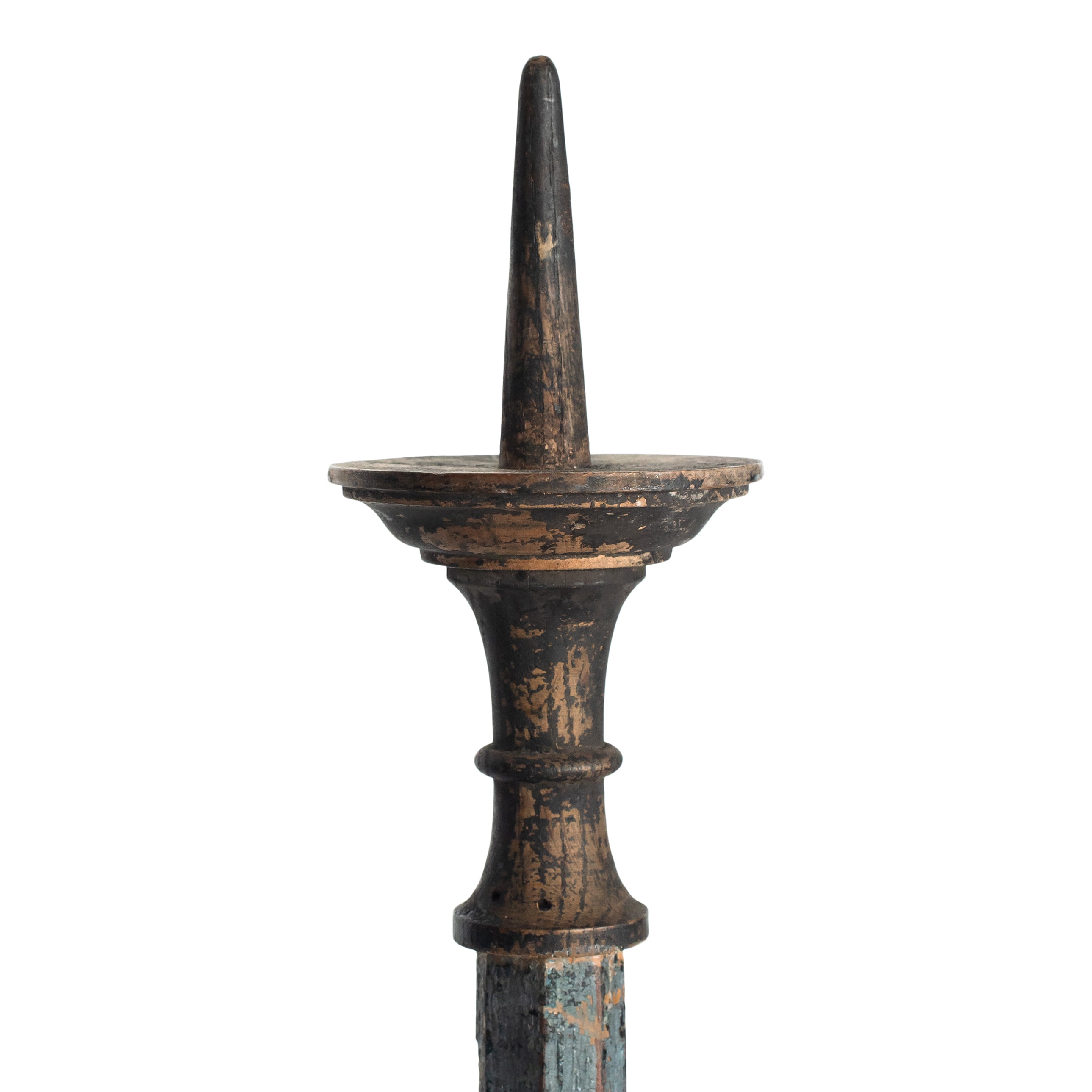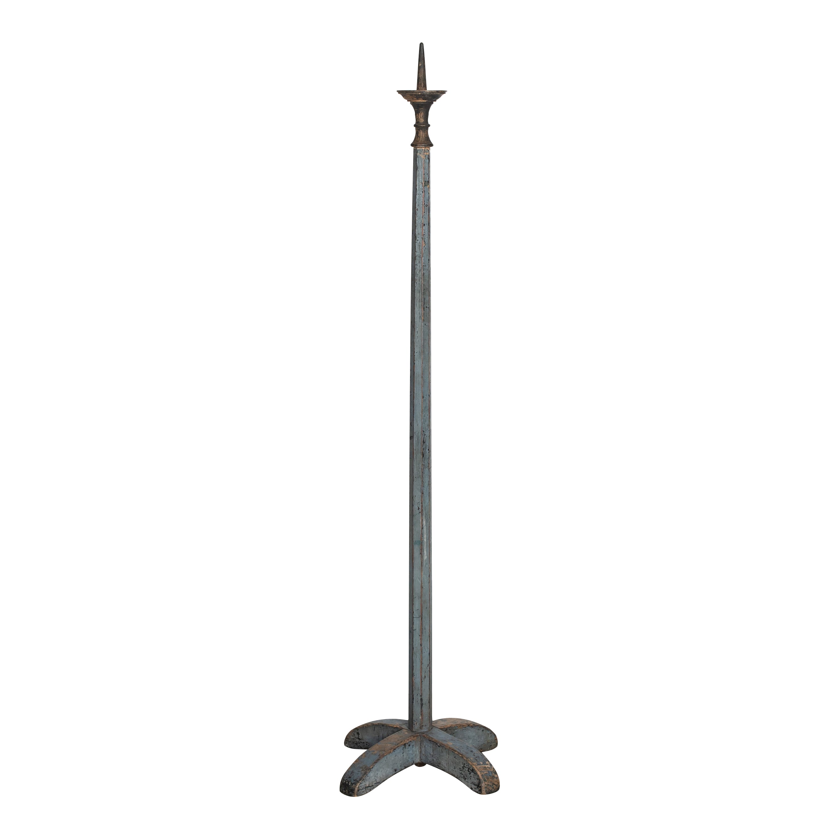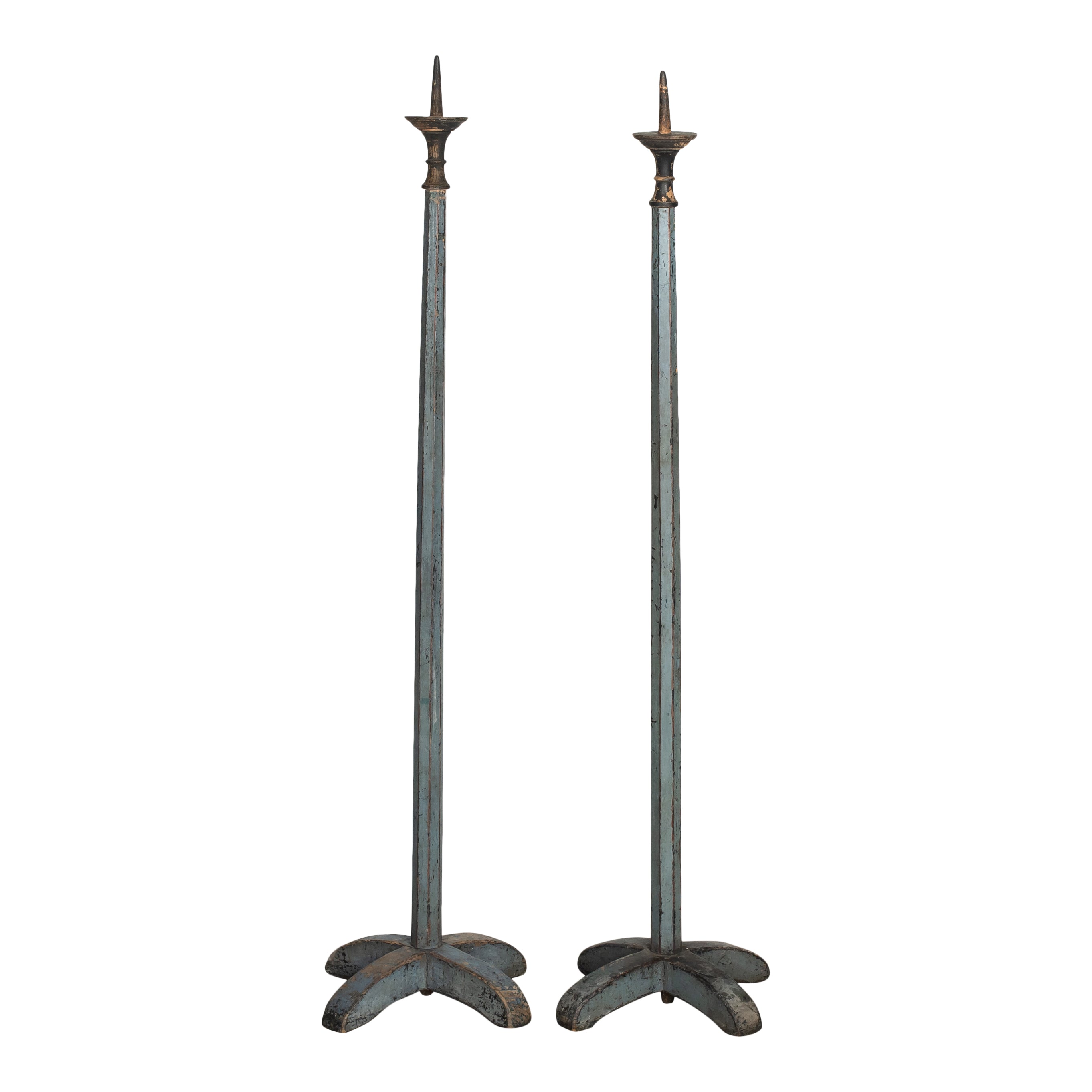 Pair of tall vintage candlesticks with a chippy blue finish and metal spike tops. Their height and patina make them great for framing an entry, adding dimension to altars, or floor-level vignettes. Natural wear is expected and adds to their character.