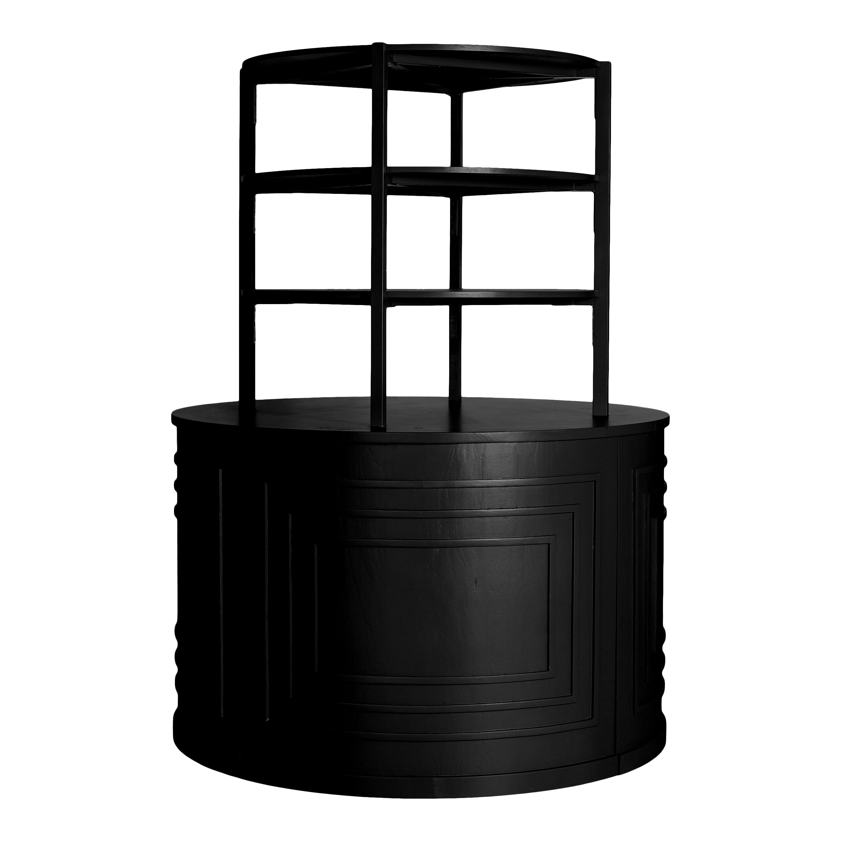 Designed to fit perfectly in the center of the Kidman Black Round Bar, this coordinating back bar adds height and display space. Featuring tiered curved shelving and a matching round base, it creates a seamless, built-in look while offering ample room for glassware, bottles, and styling elements.