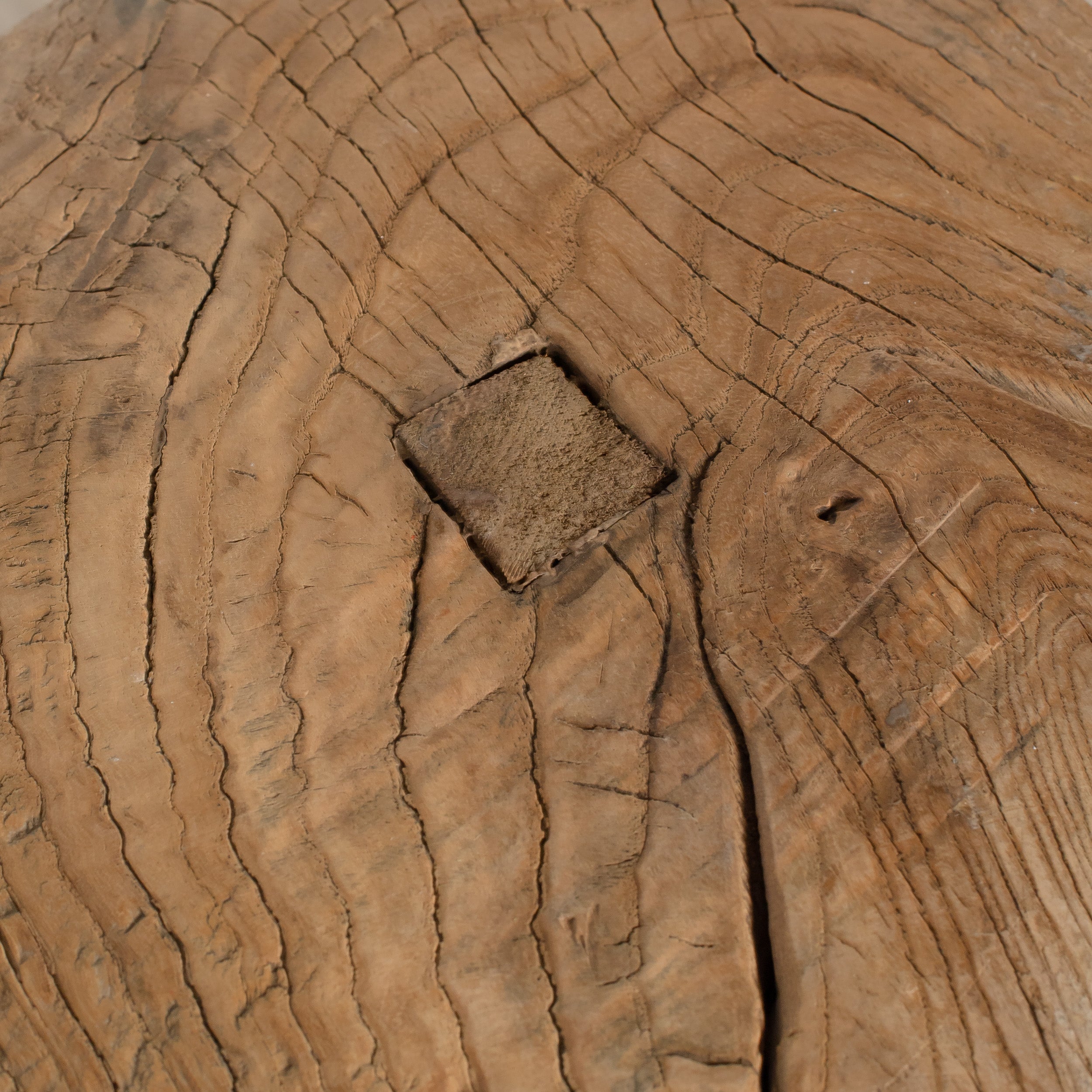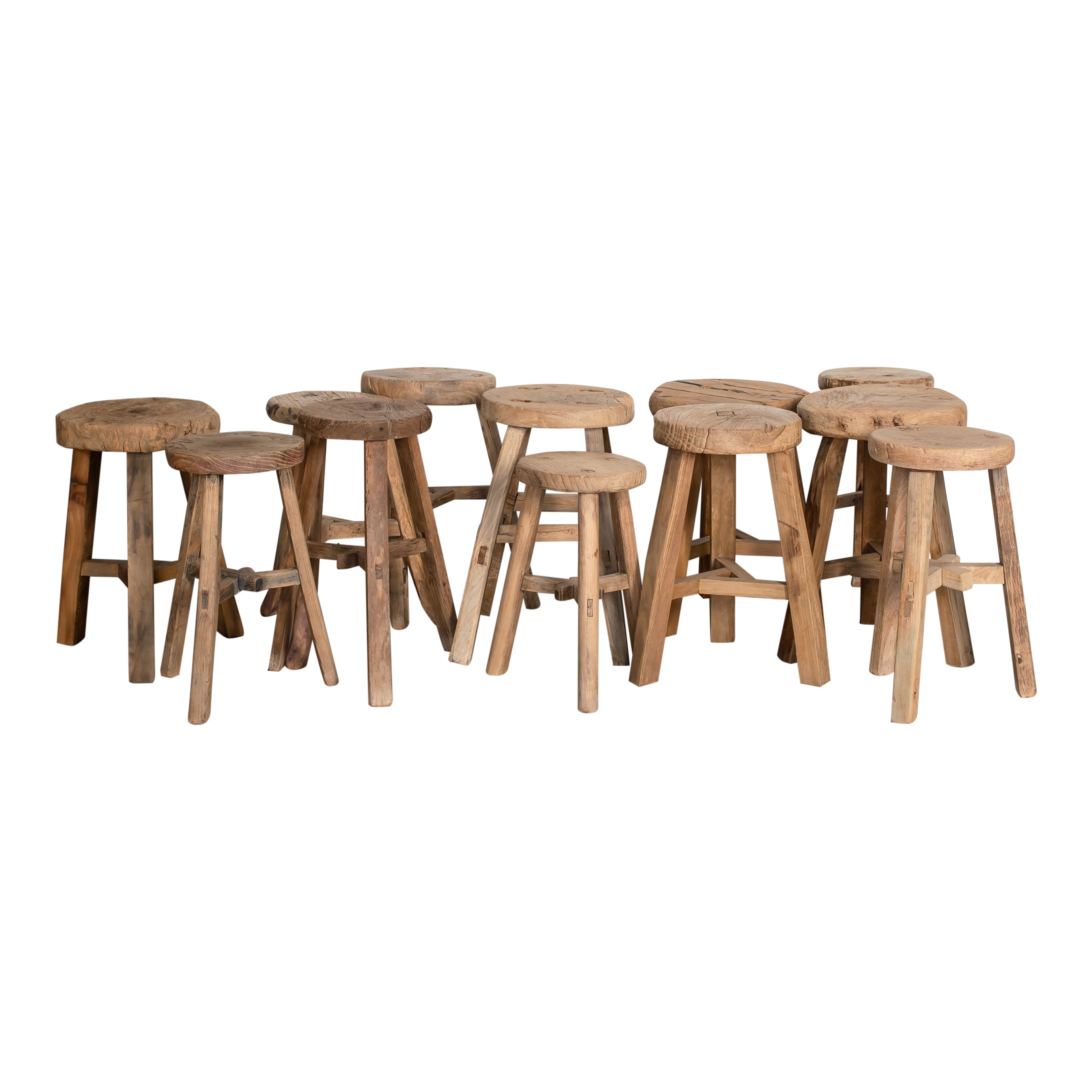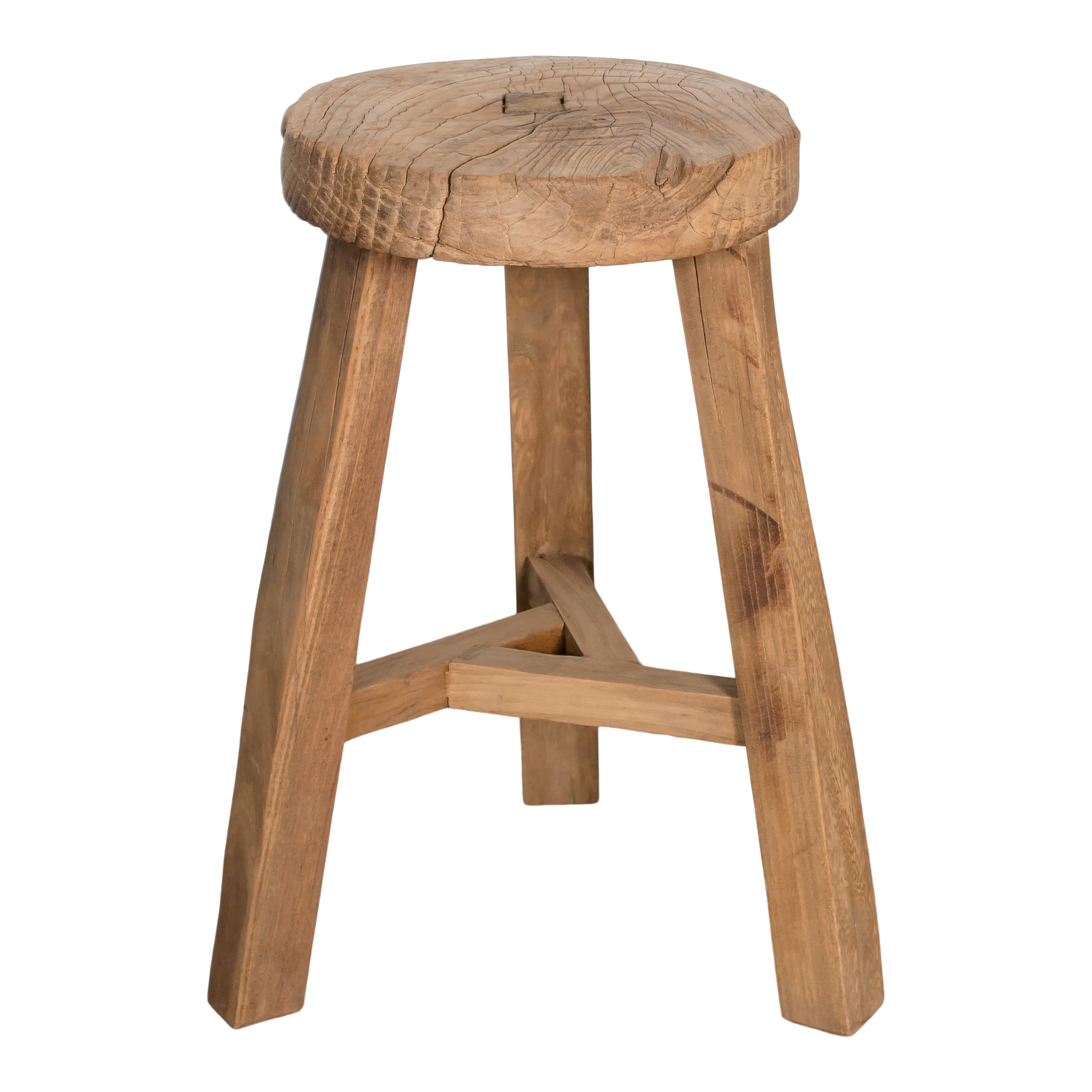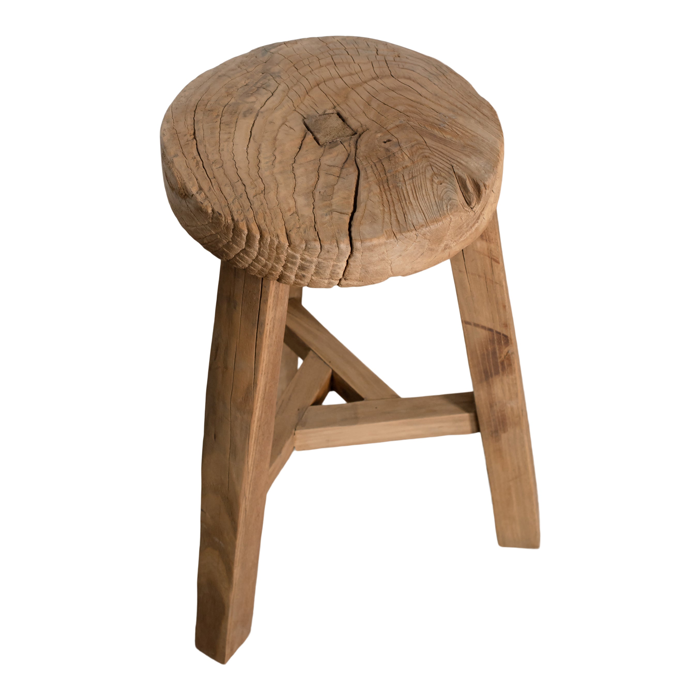 Handcrafted vintage stool from China with a beautifully worn, organic look. Each piece features a thick, textured wooden seat and sturdy legs, making it just as useful as a small side table as it is a perch. Color, shape, and size vary, giving every stool its own distinct character.