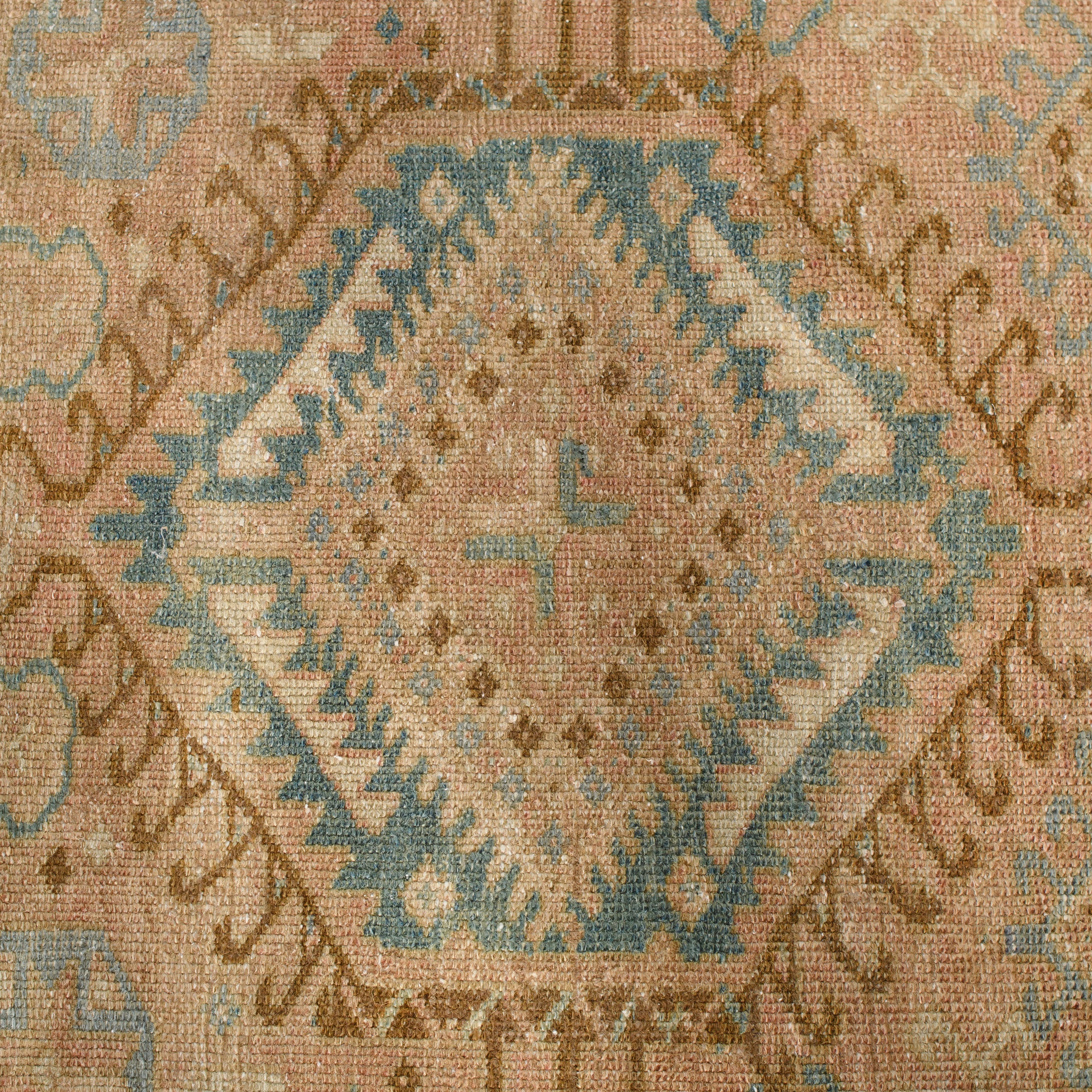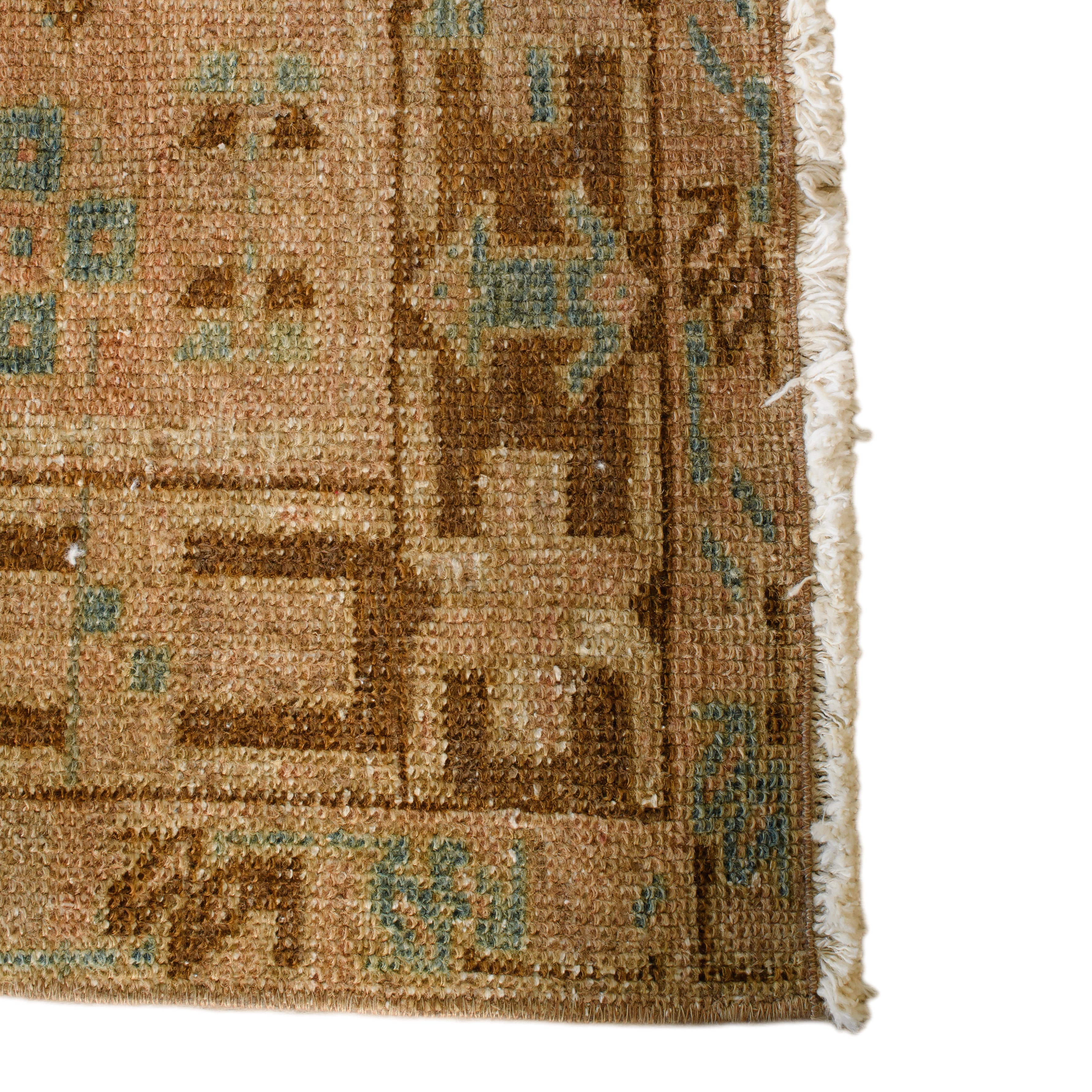 The Ozella Vintage Runner features a soft, time-faded palette of tan, blue, and muted peach with intricate geometric motifs. Its handwoven texture and subtle wear bring character and warmth to any walkway or ceremony aisle.