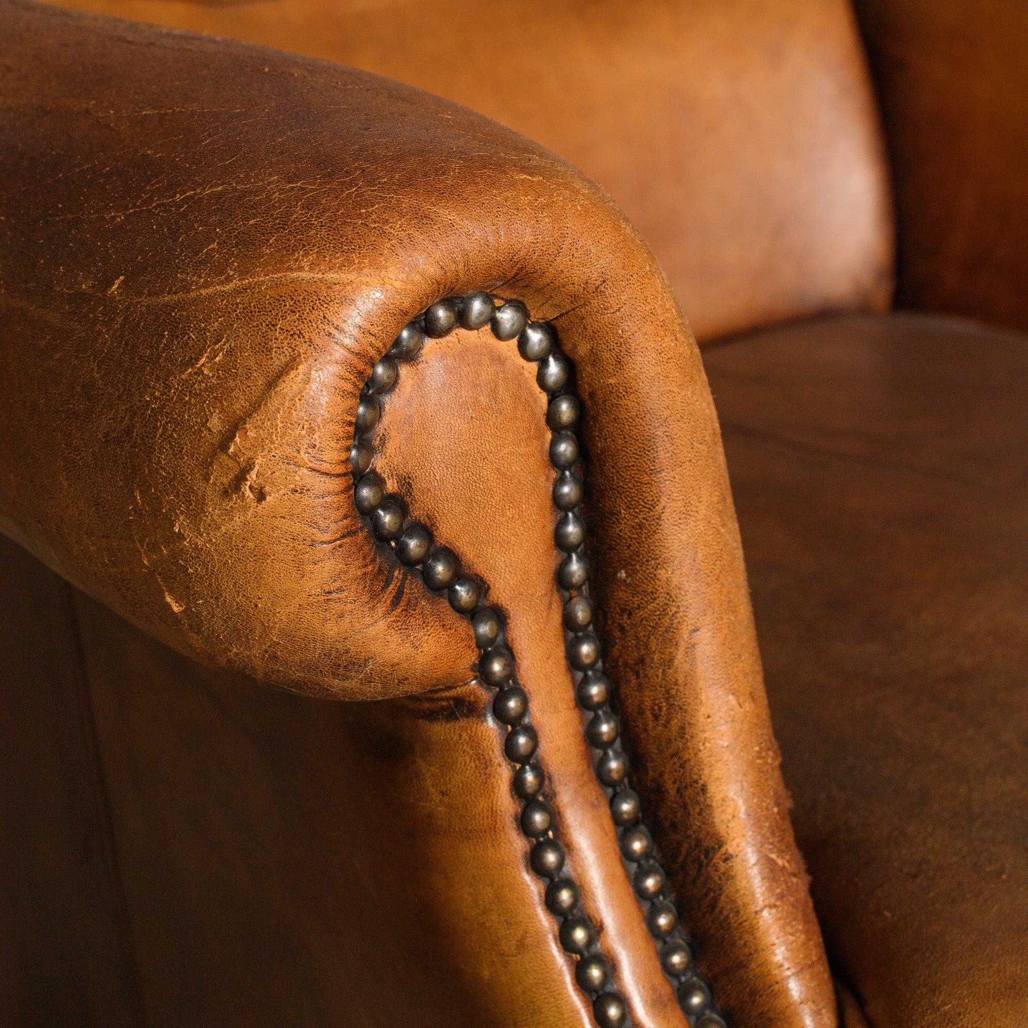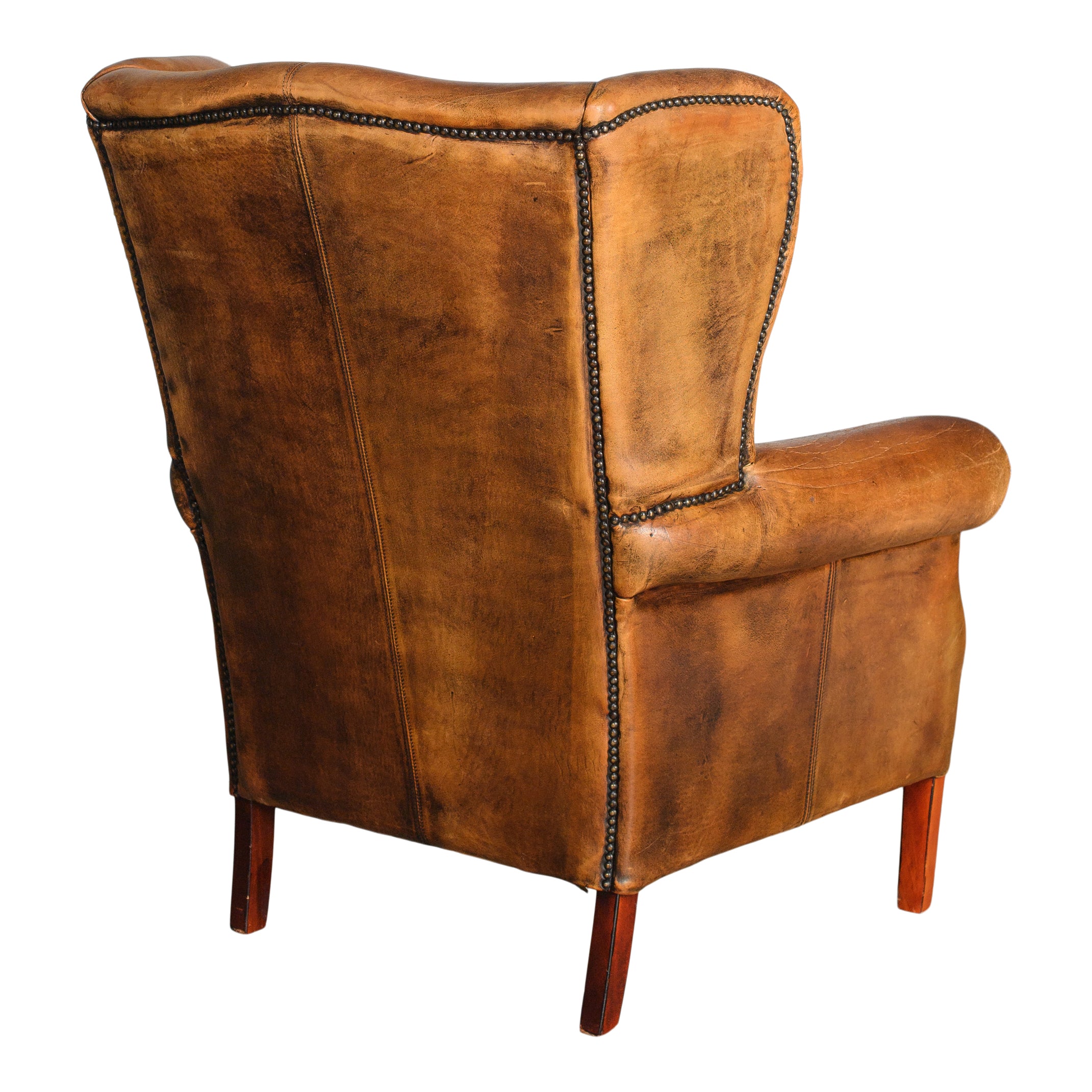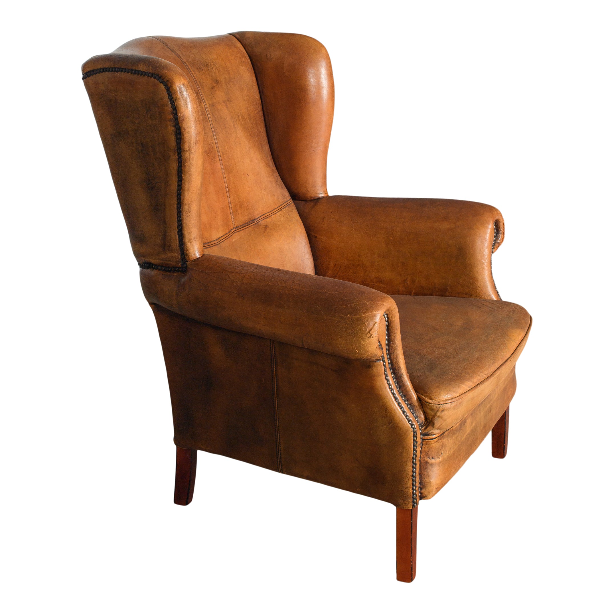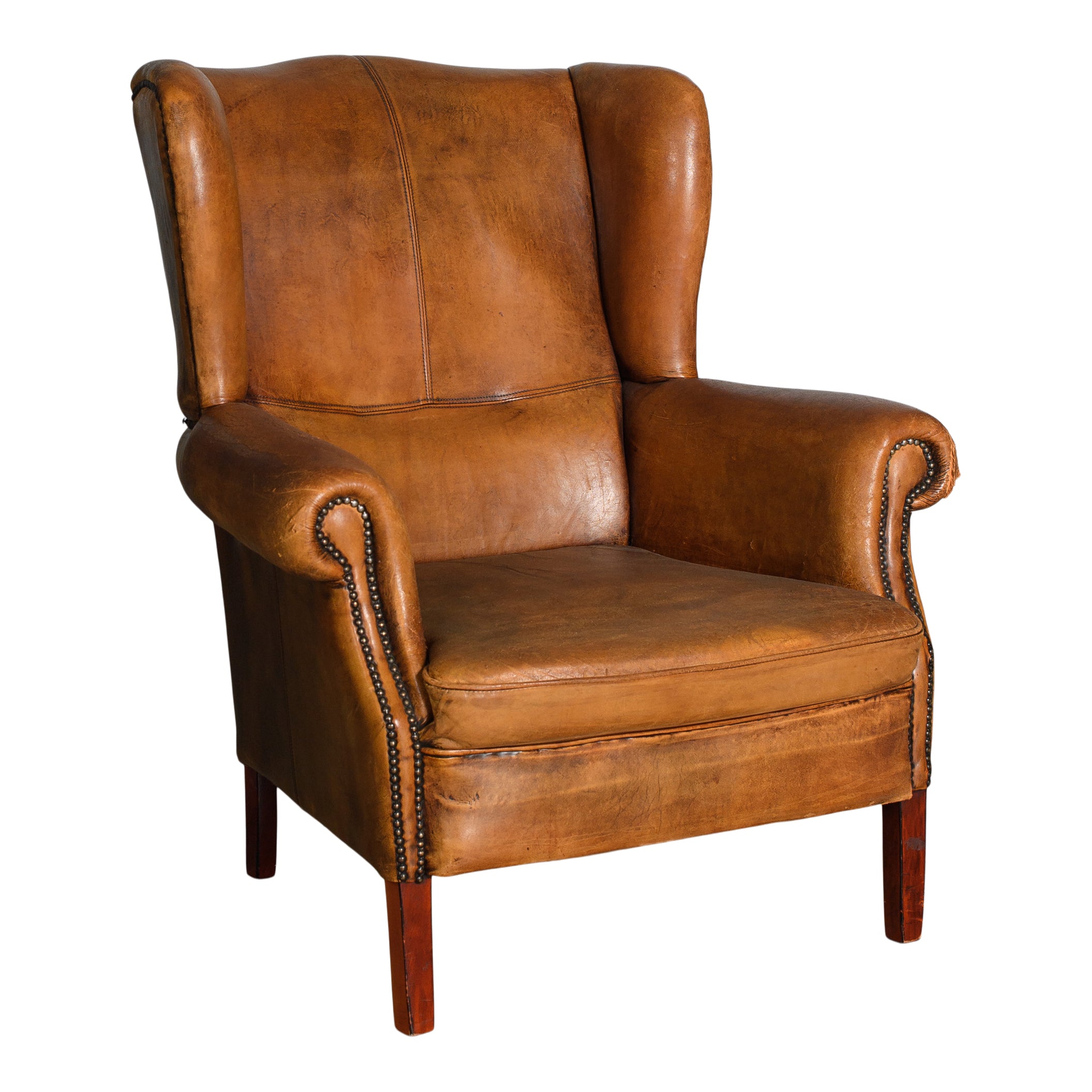 The Pierson Chair is a traditional vintage leather wingback chair with T-stitching, rich patina, rolled arms, and sturdy wooden legs. Comfortable, grounded, and timeless.