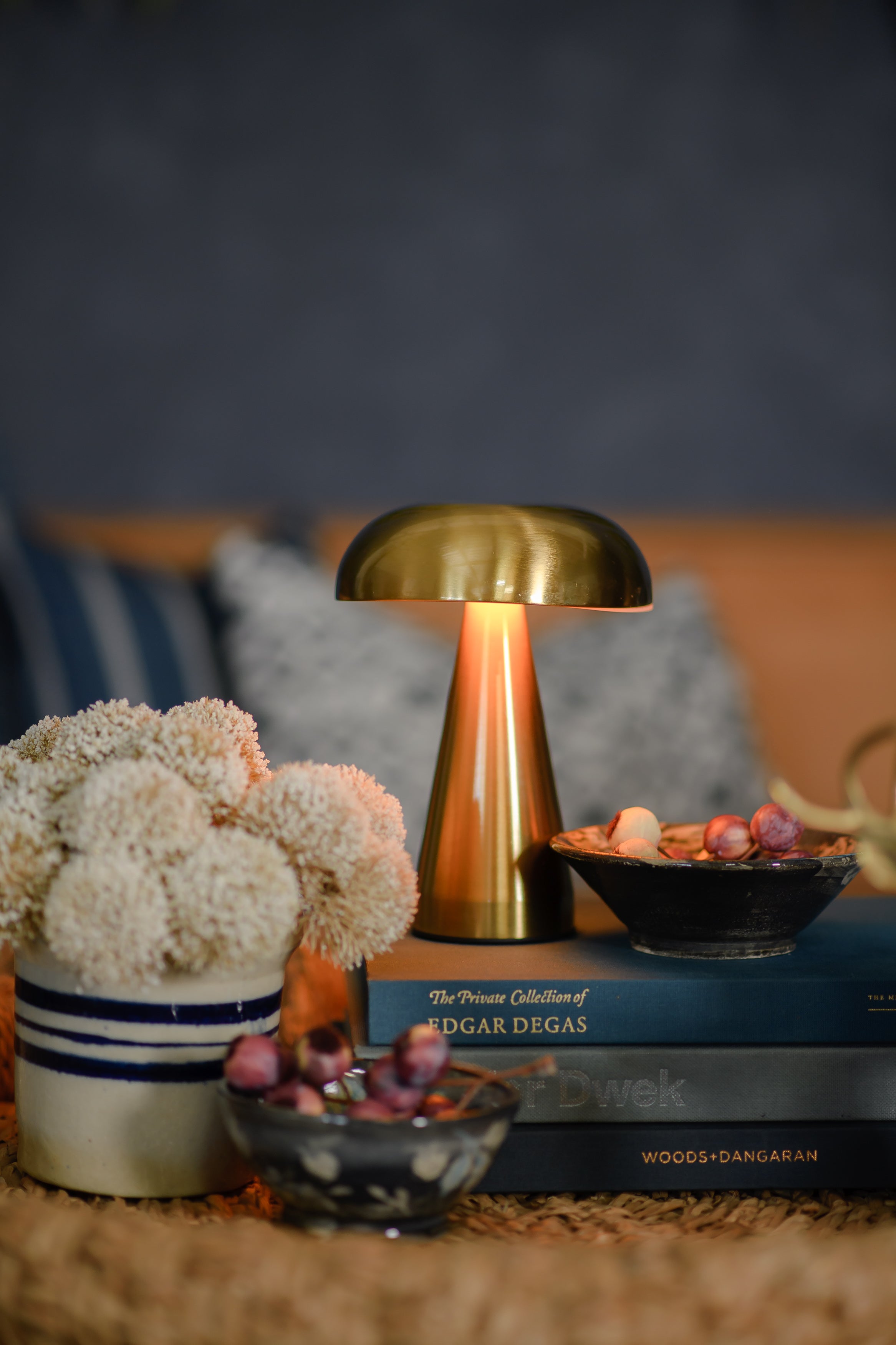 The Porcini Gold Lamp brings a sculptural touch with its domed shade and tapered base finished in brushed gold. Compact and cordless, it offers warm ambient lighting perfect for dining tables, bars, or display shelves. Its modern mushroom silhouette adds a refined metallic accent to any setting.