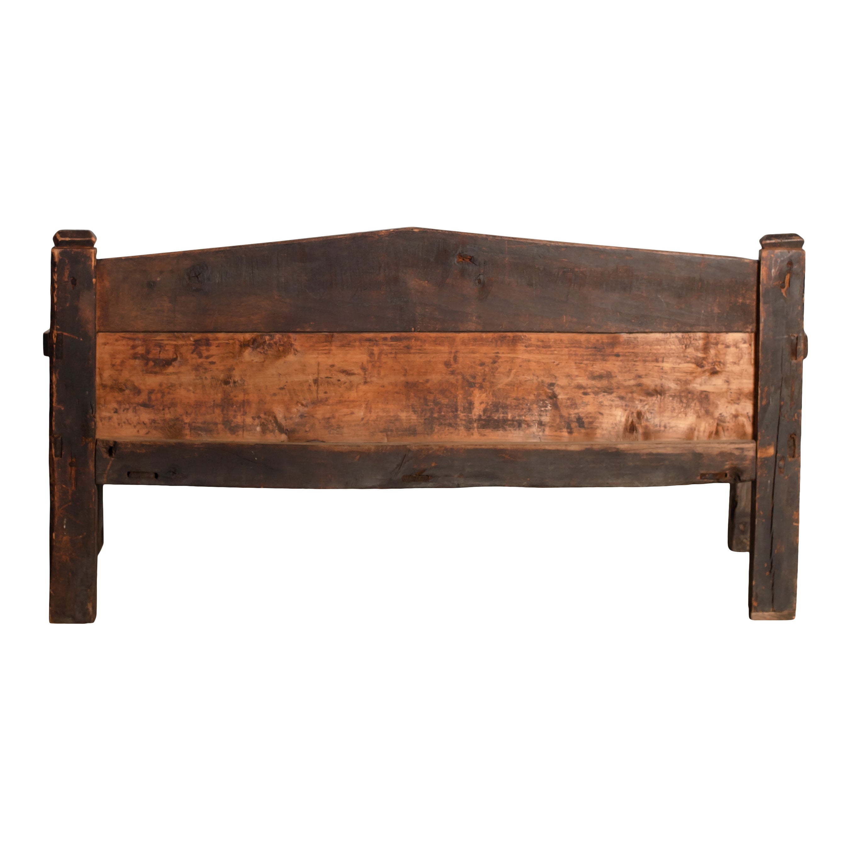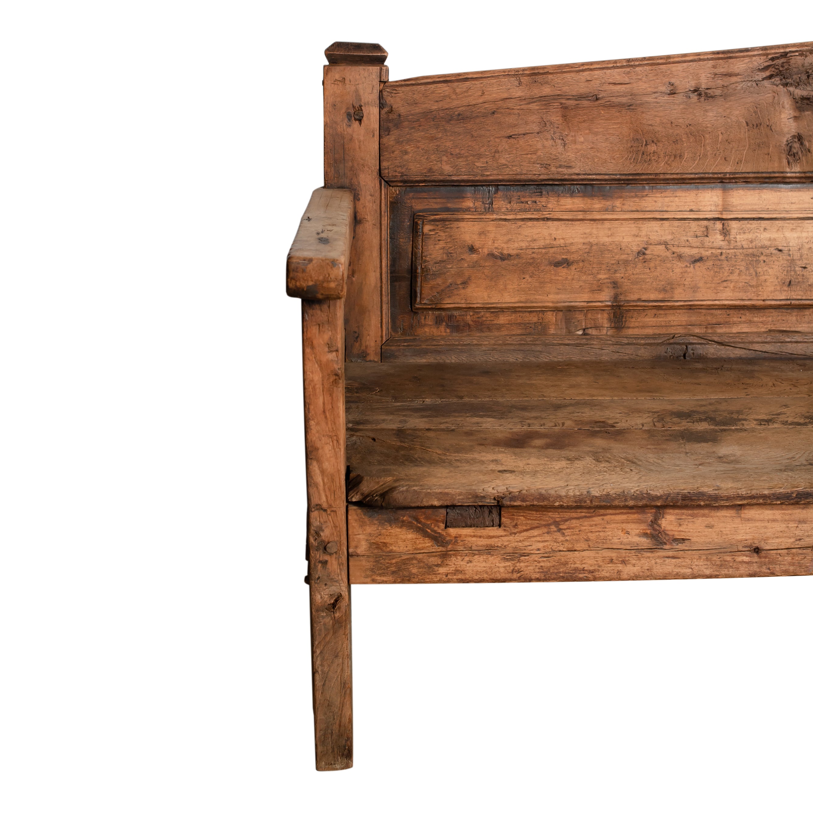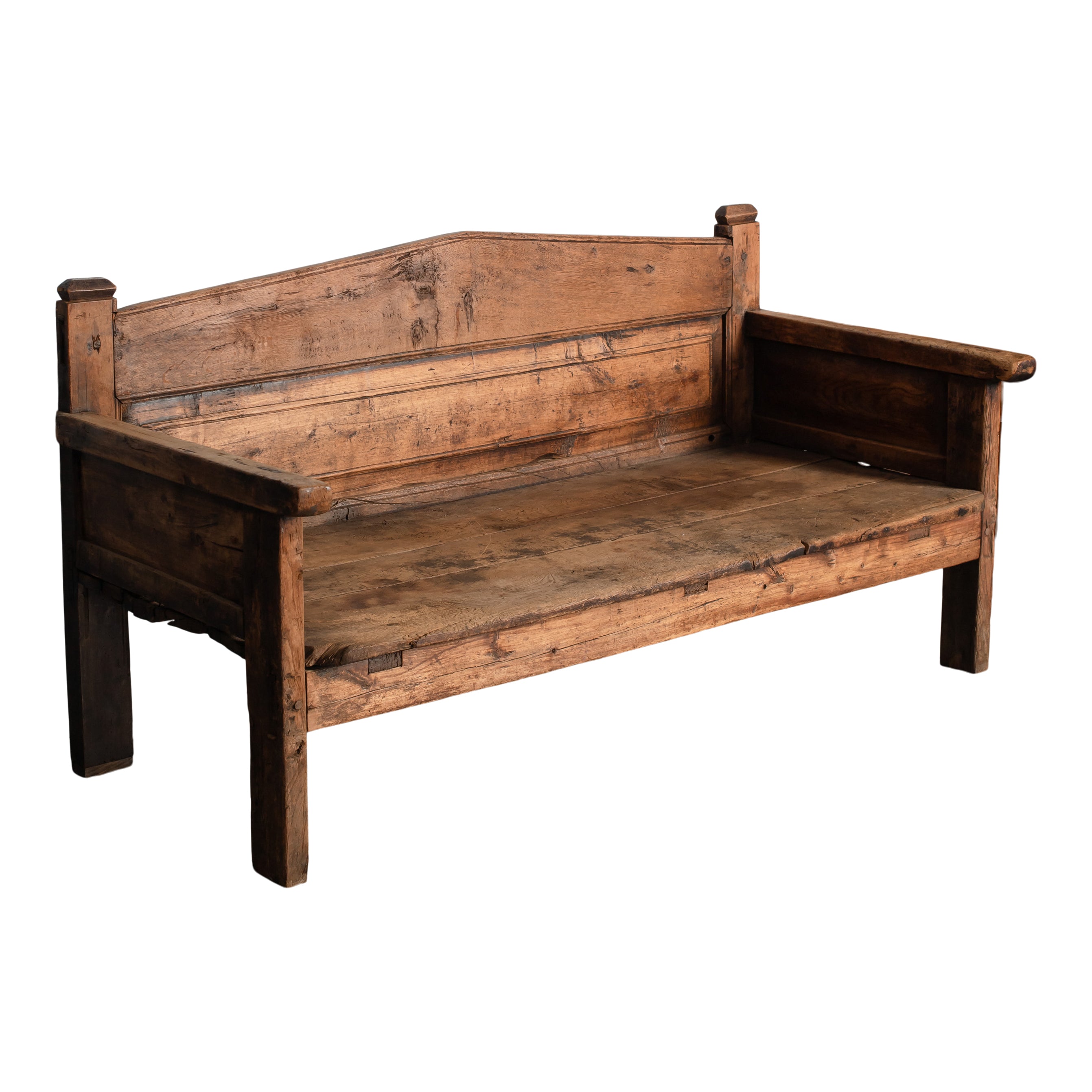 A vintage wooden bench with a high back, straight arms, and a beautifully aged surface that shows off its history. The weathered grain, natural imperfections, and solid construction give it a grounded, collected feel.