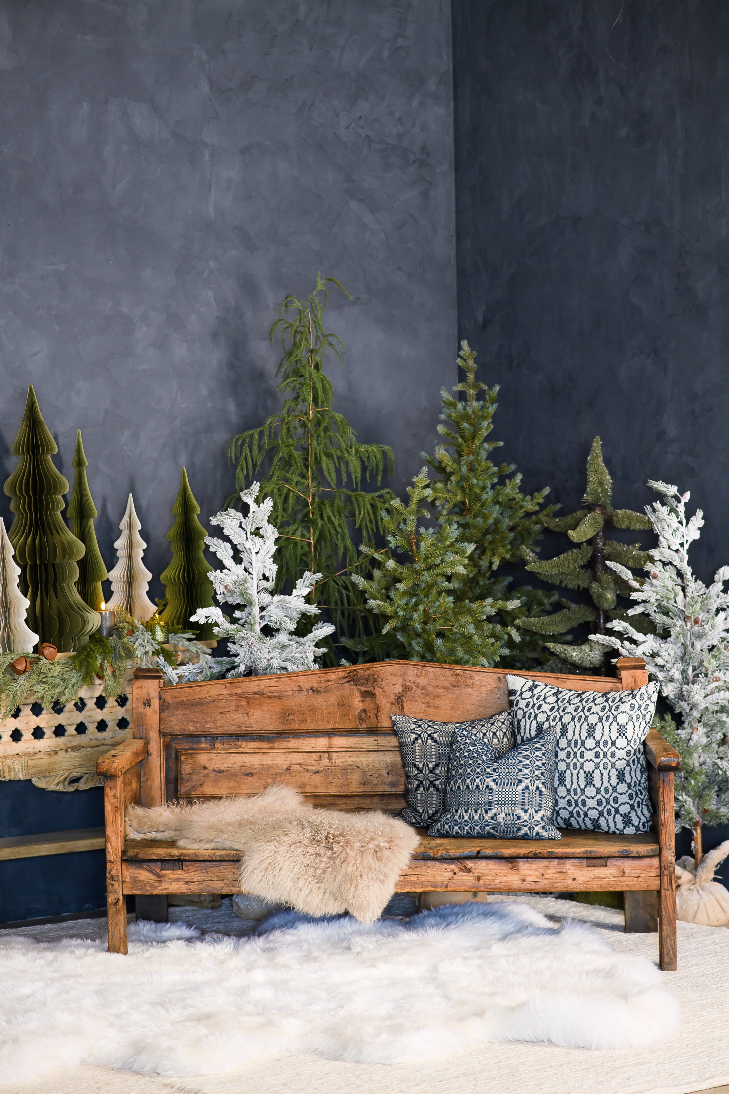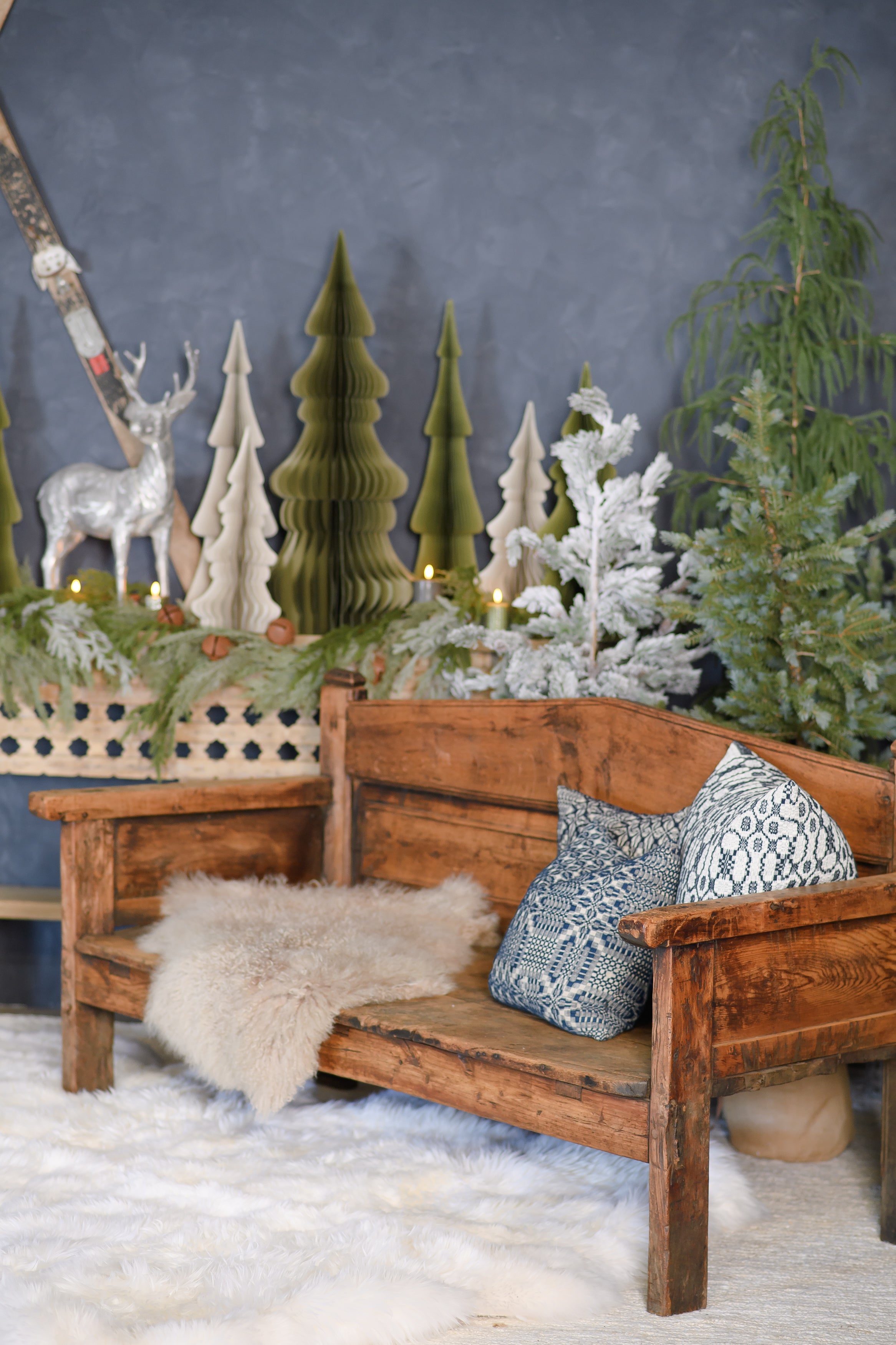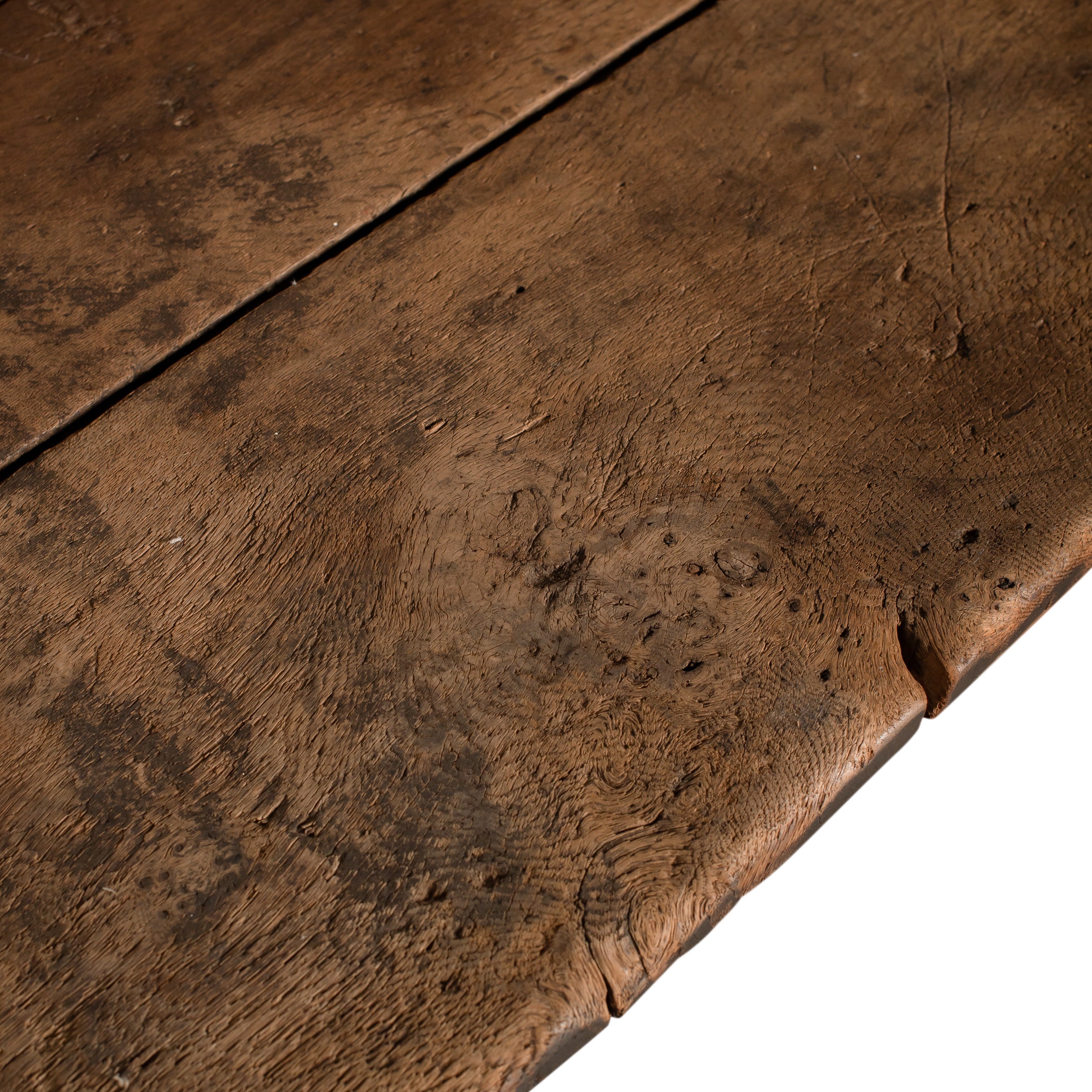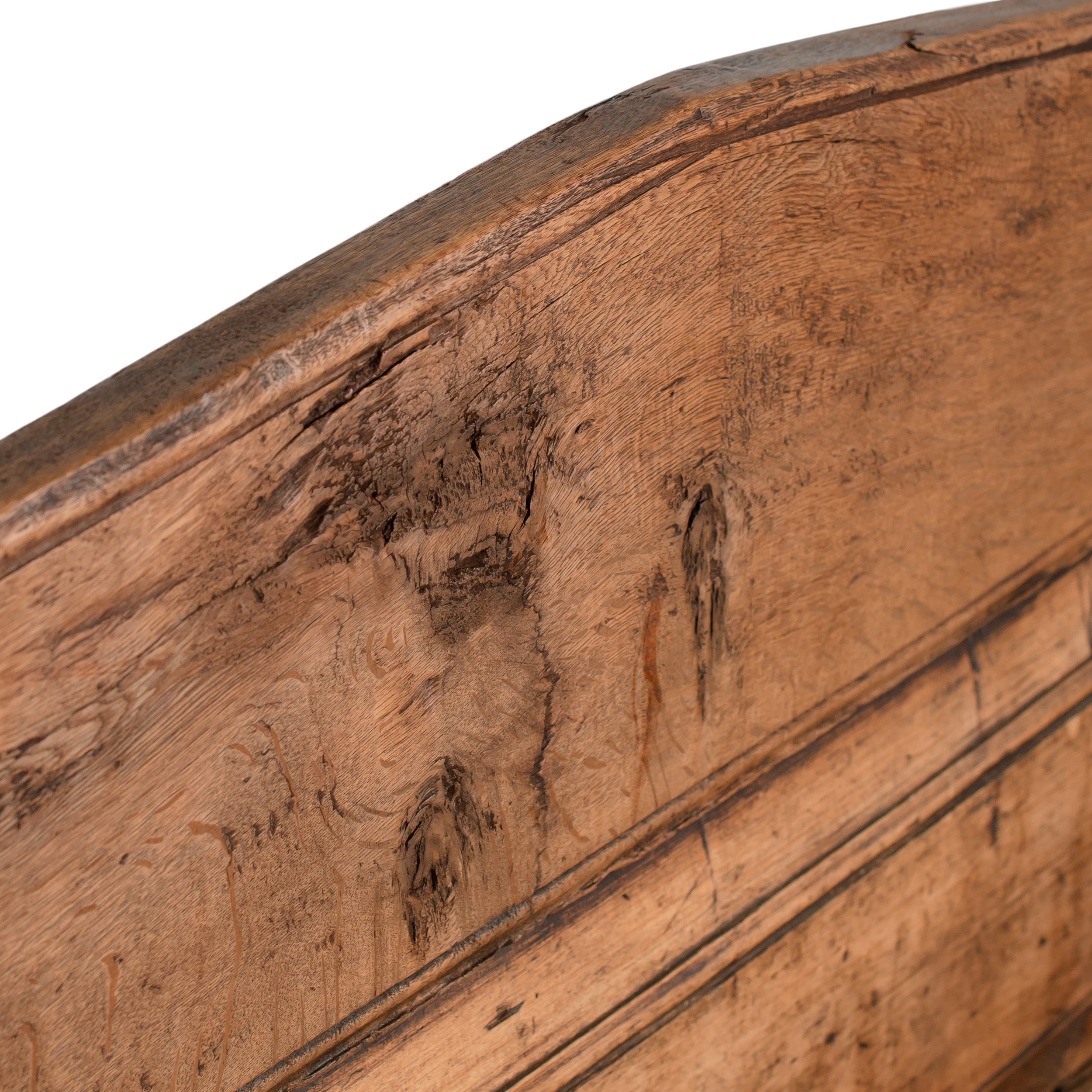 A vintage wooden bench with a high back, straight arms, and a beautifully aged surface that shows off its history. The weathered grain, natural imperfections, and solid construction give it a grounded, collected feel.
