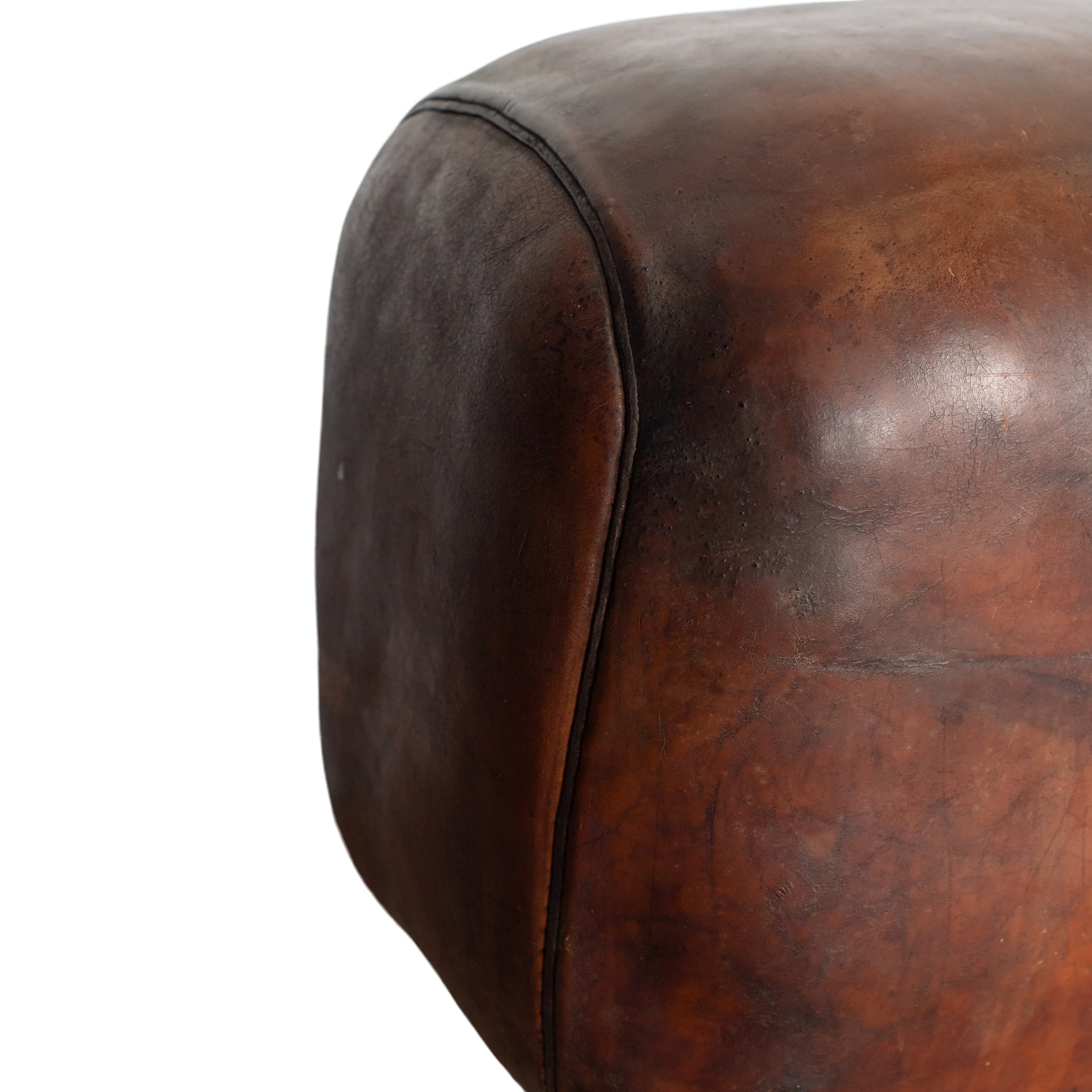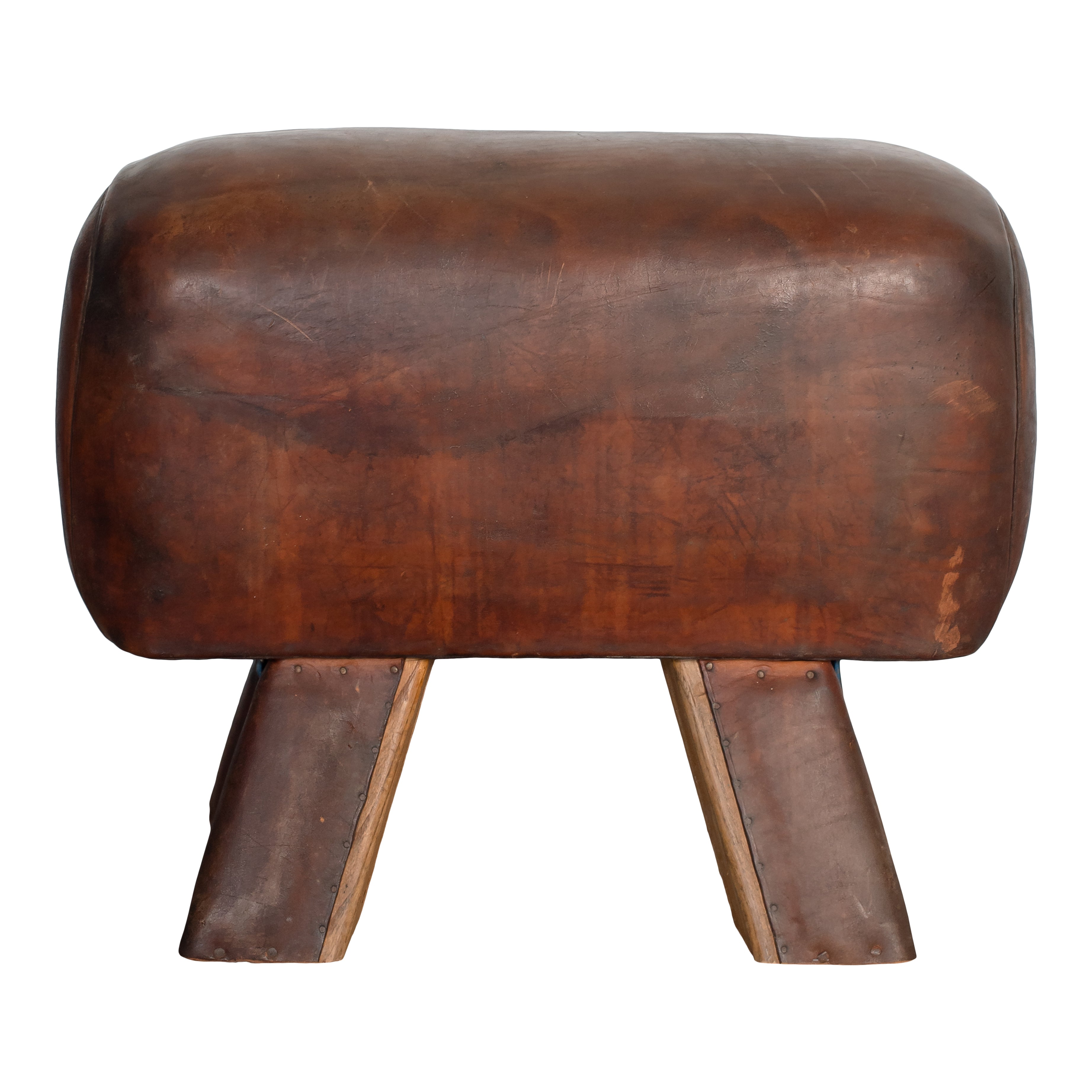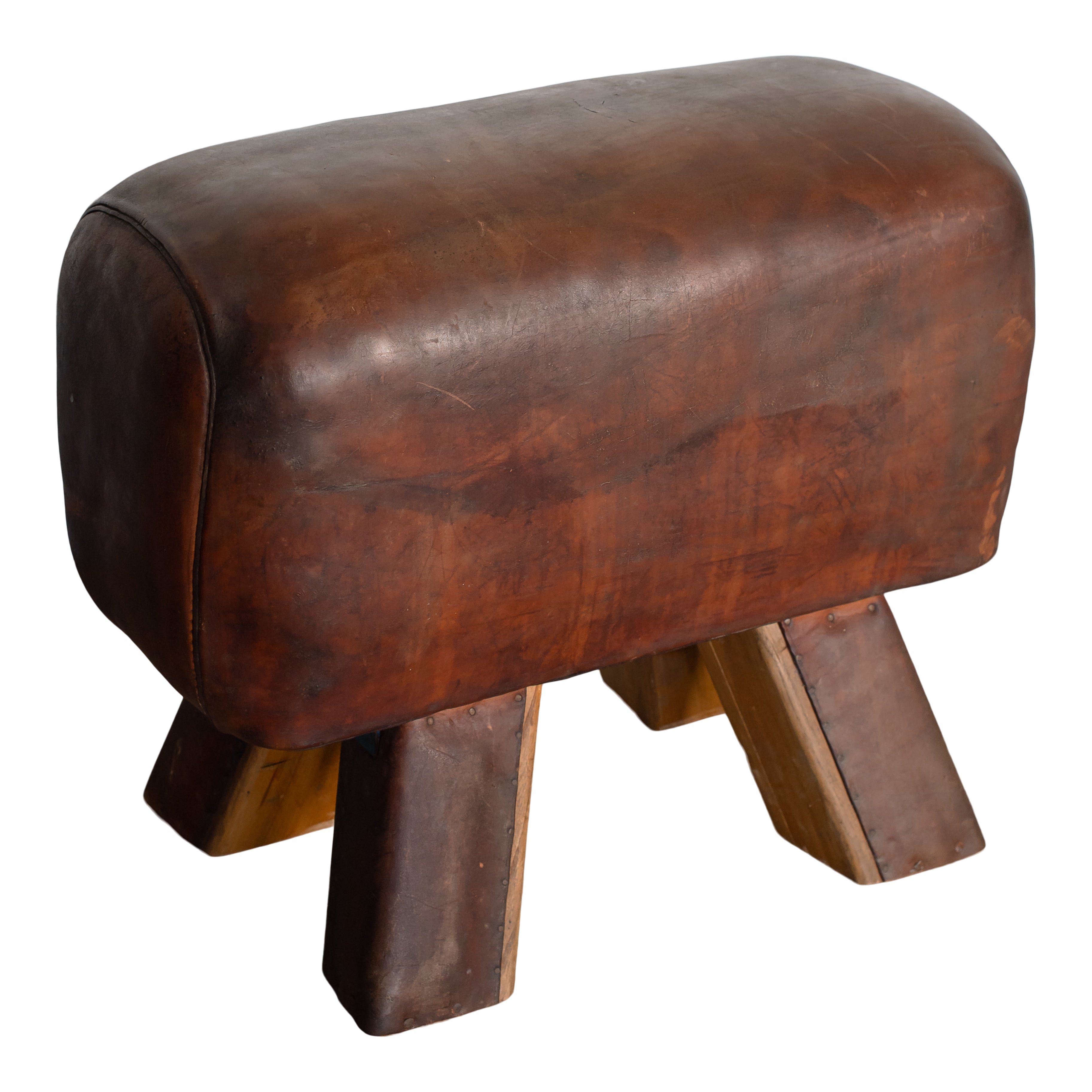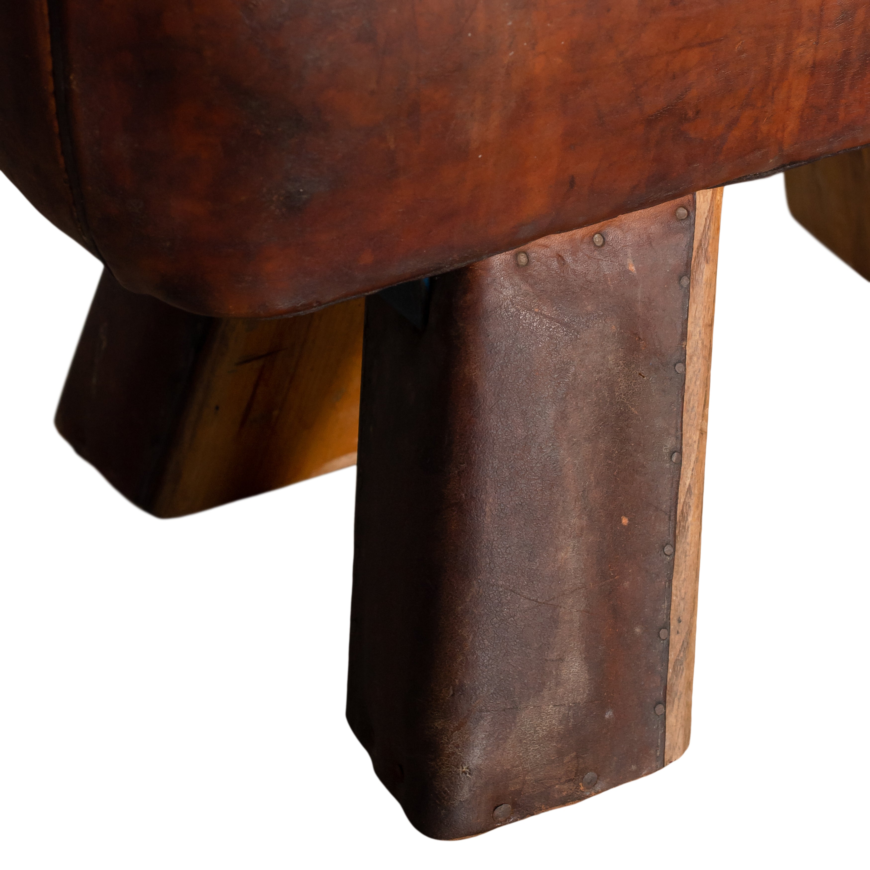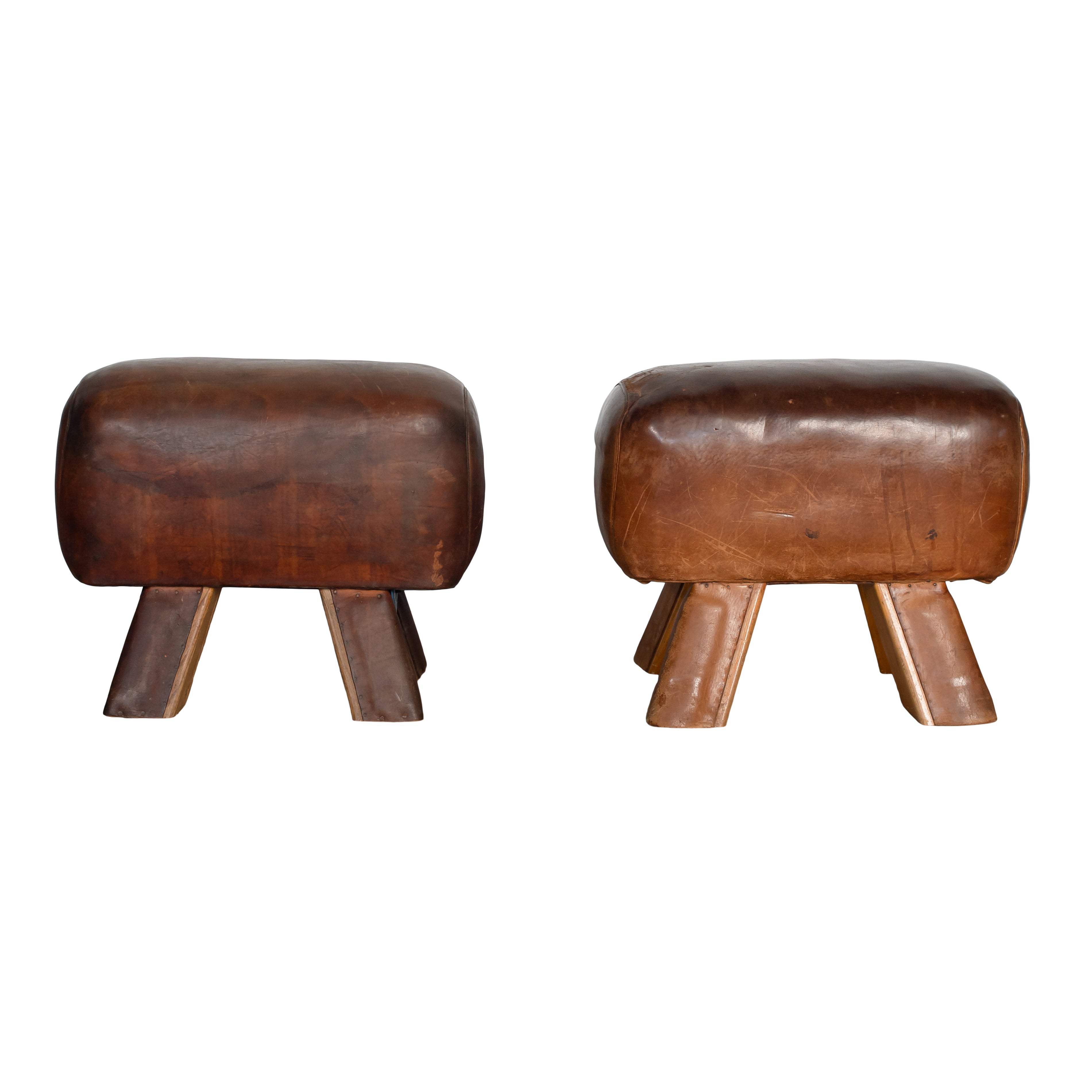 The Ryker Pommel Horse Stools feature worn brown leather tops and solid wood legs, each showing signs of authentic age and use. Once part of vintage gym equipment, they now serve as distinctive accent pieces or ottomans.
