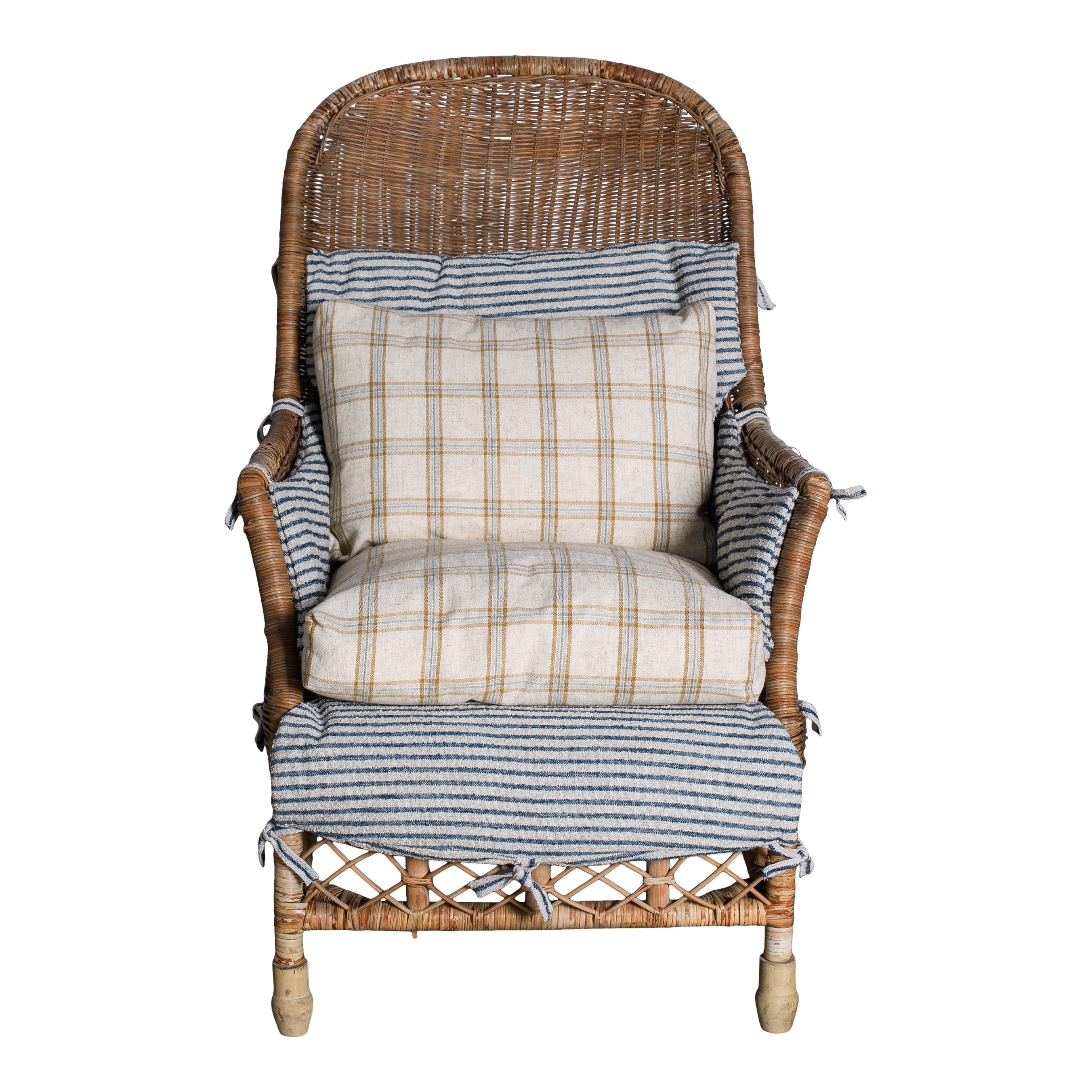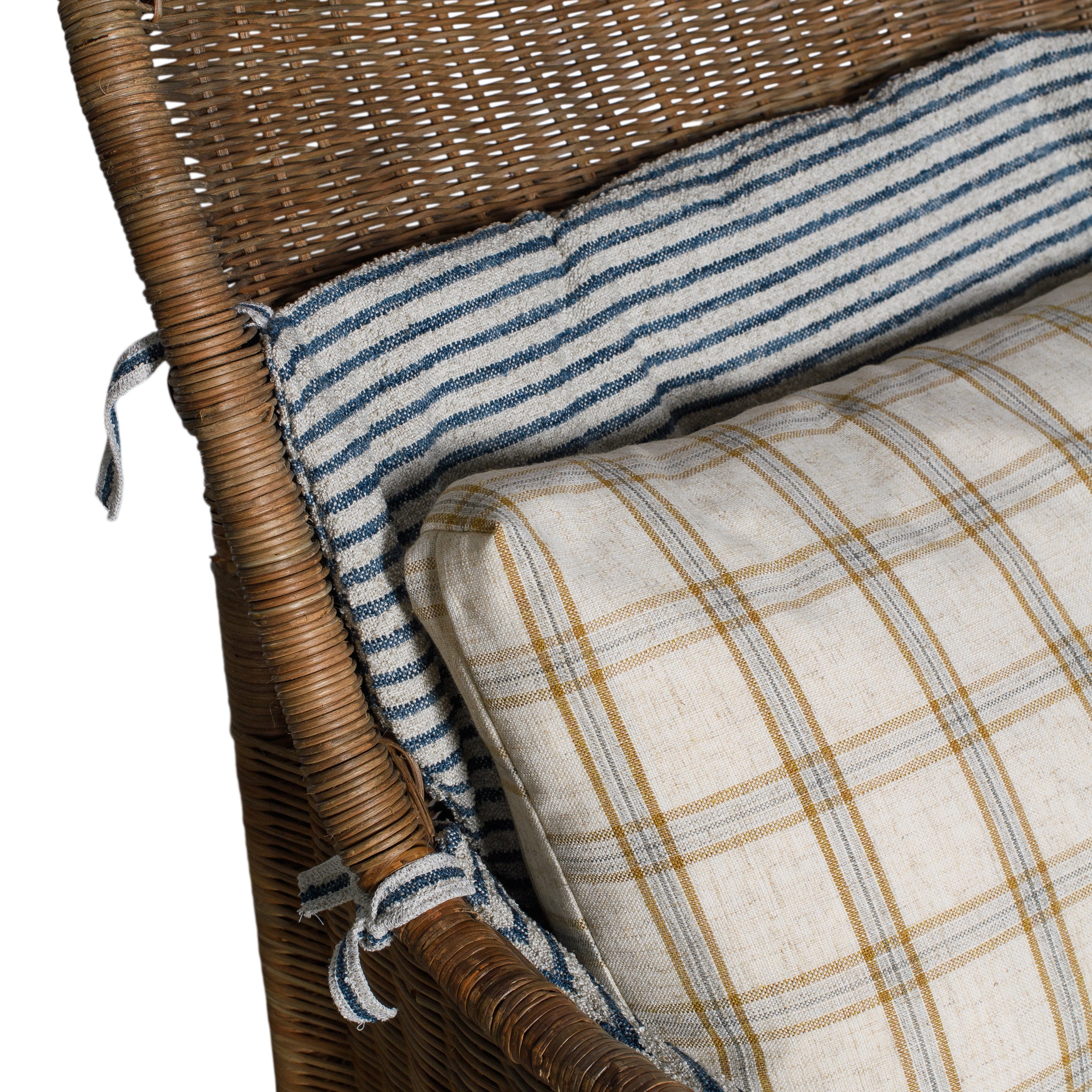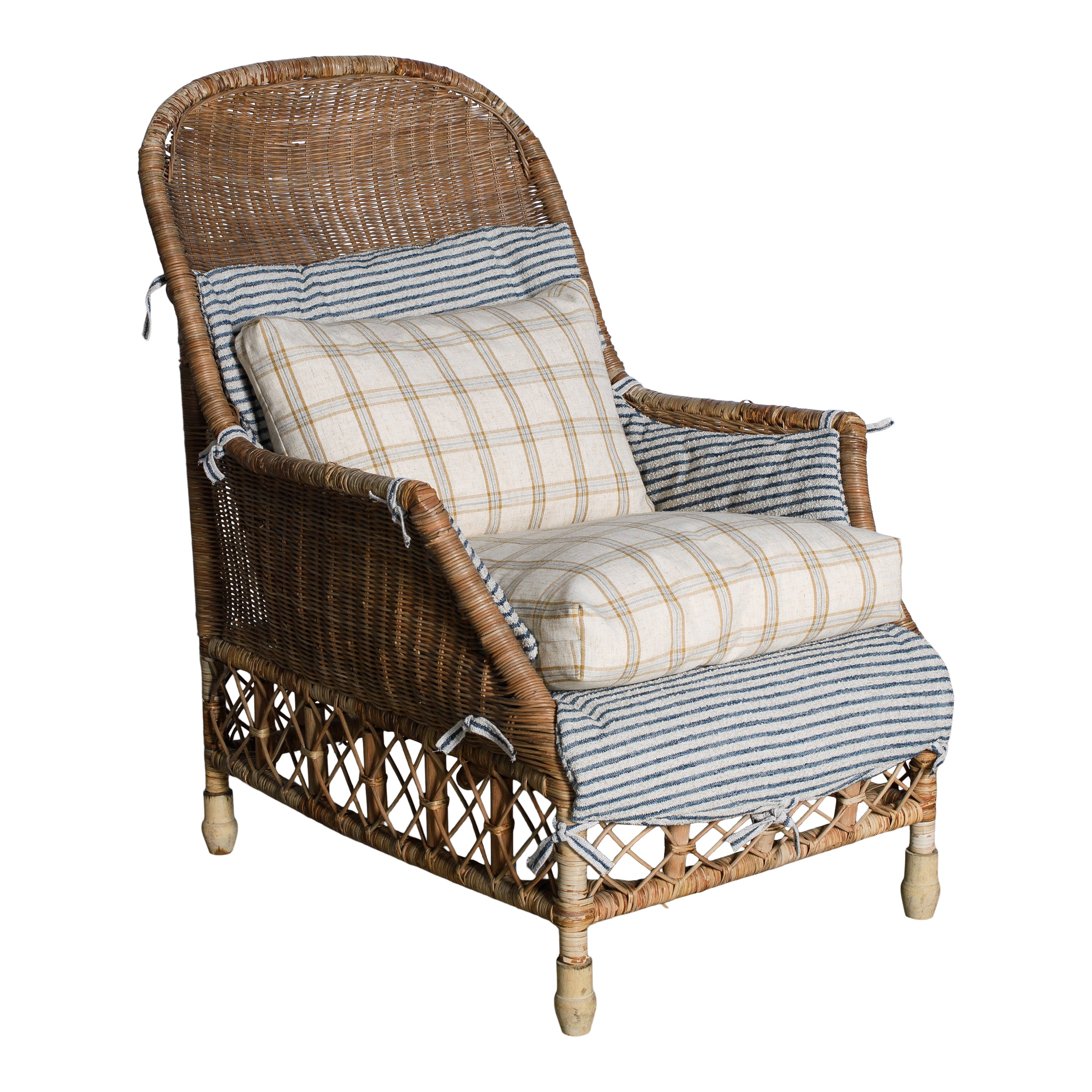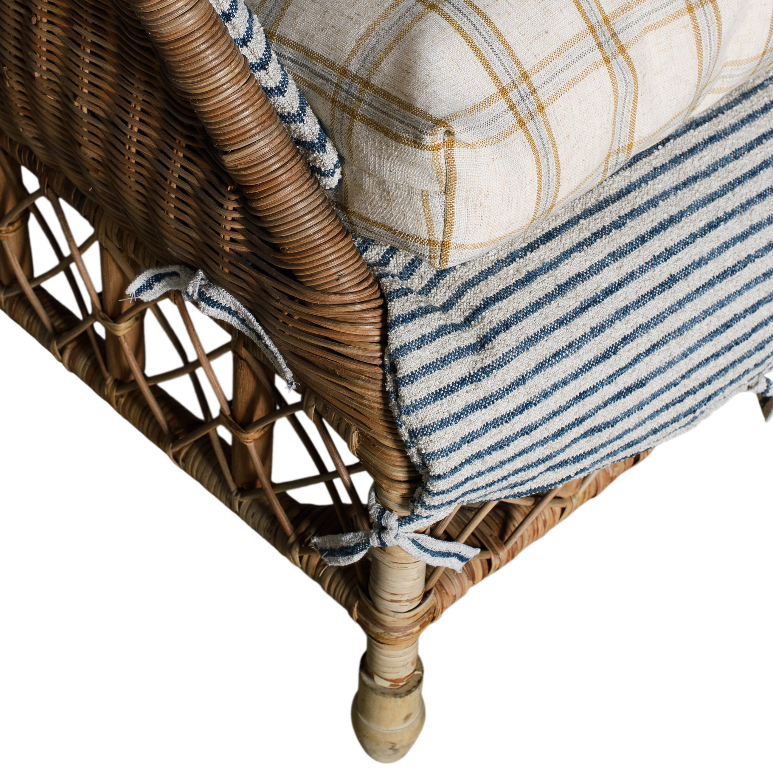 The Tahiti Plaid Chair pairs classic rattan with layered textiles for a relaxed, coastal feel. A woven wicker frame is topped with a blue and ivory striped cushion set, accented by a warm neutral plaid back pillow and seat cushion.