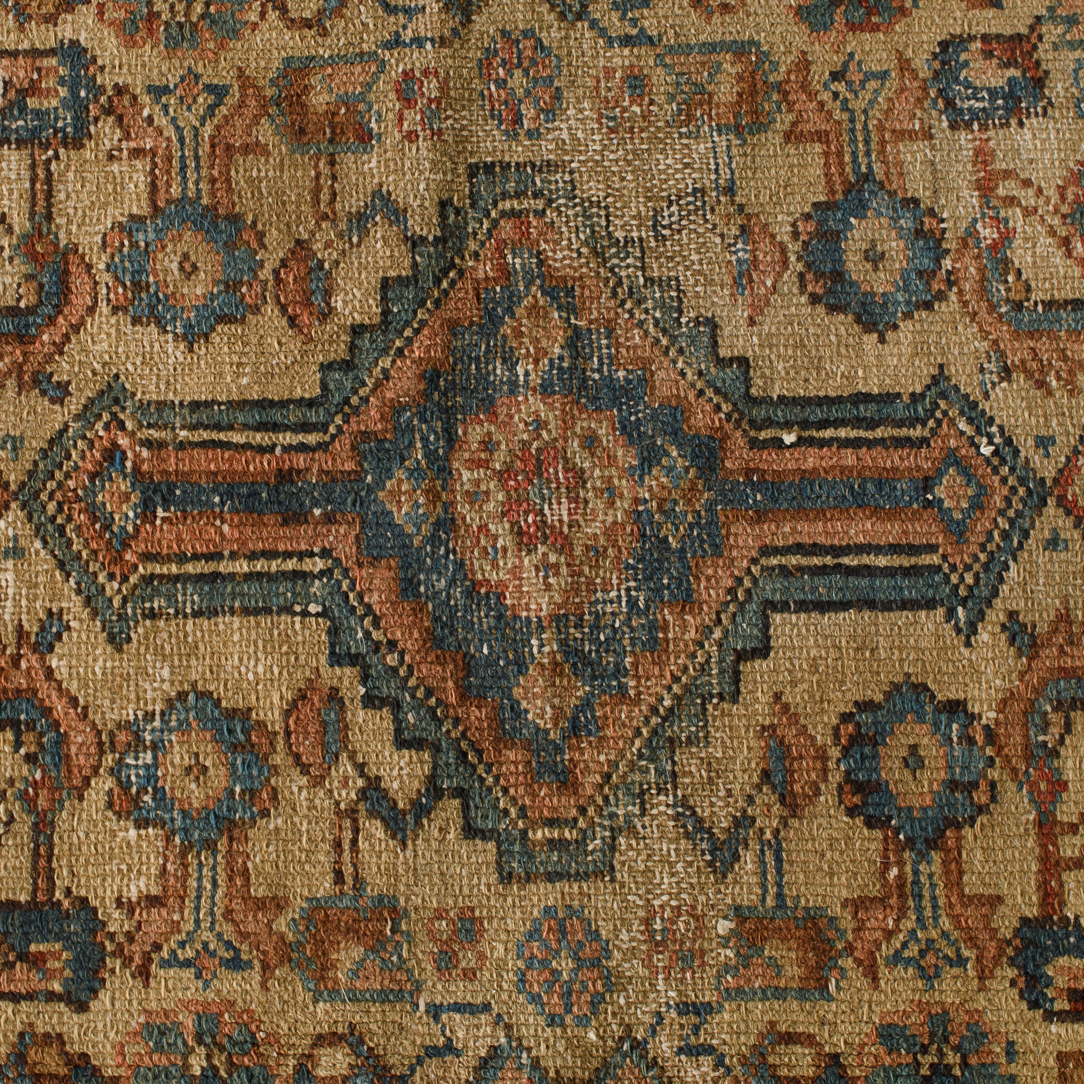 The Welda Vintage Rug showcases a traditional medallion pattern in warm rust, blue, and sand tones. Its compact size and aged character make it a perfect accent for a layered ceremony aisle.