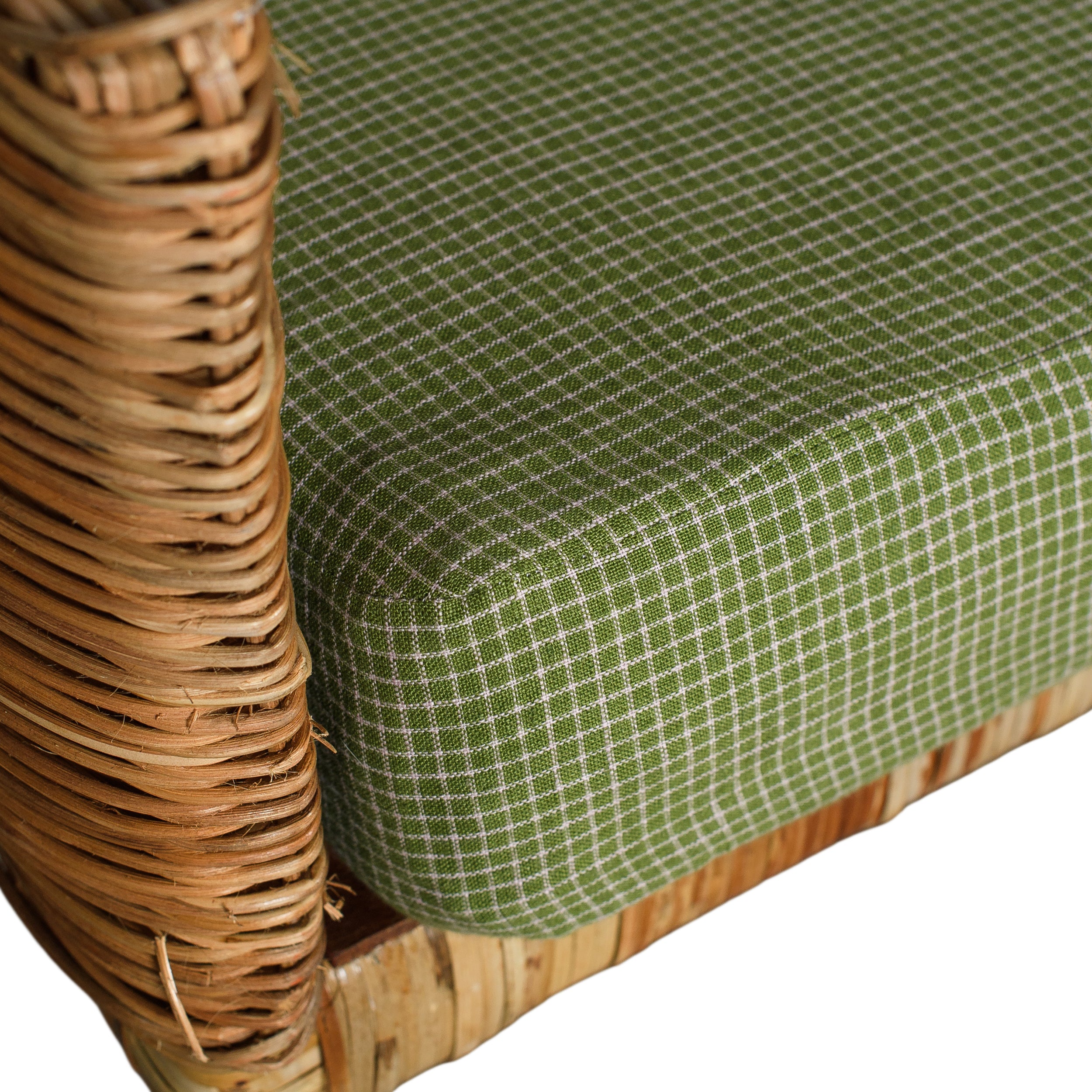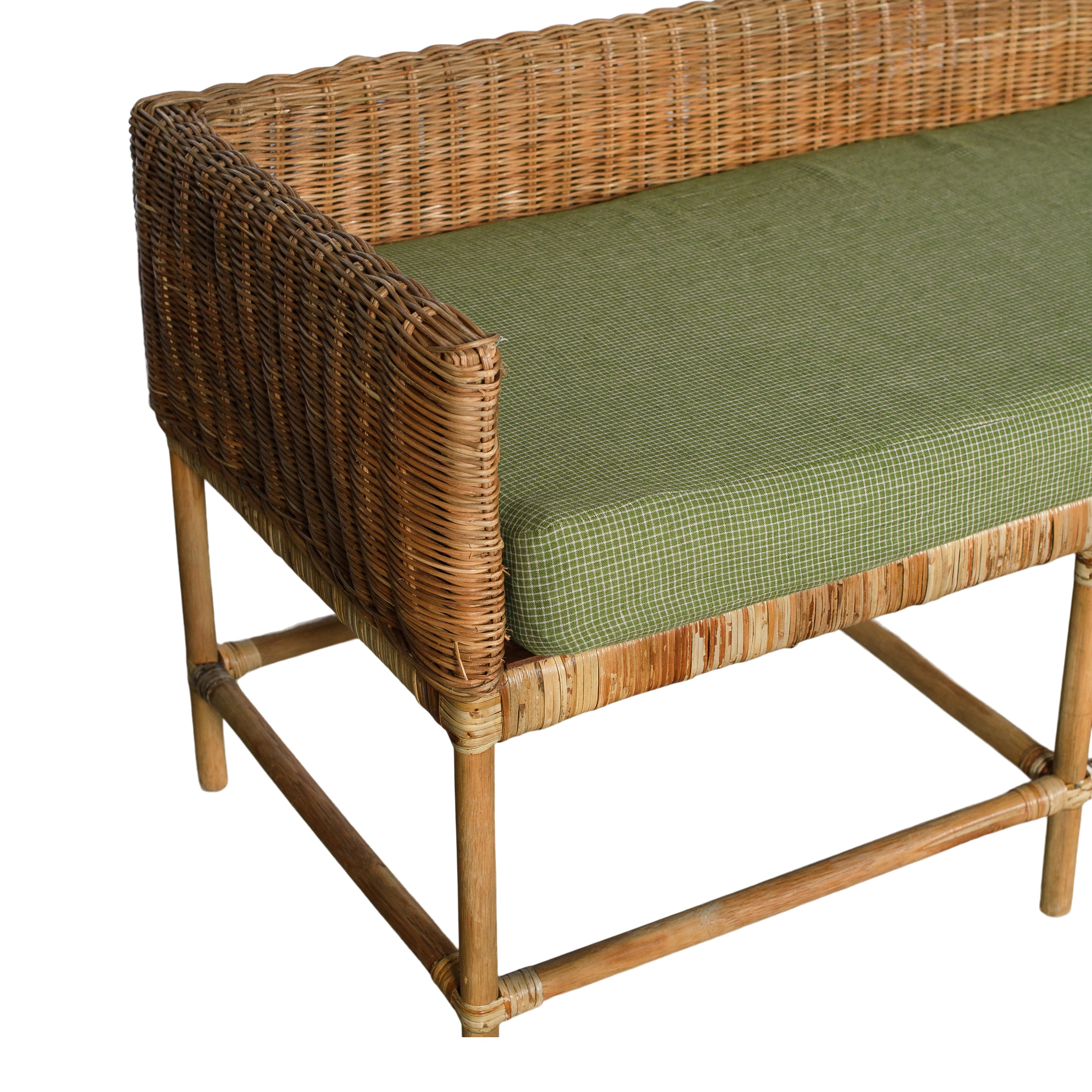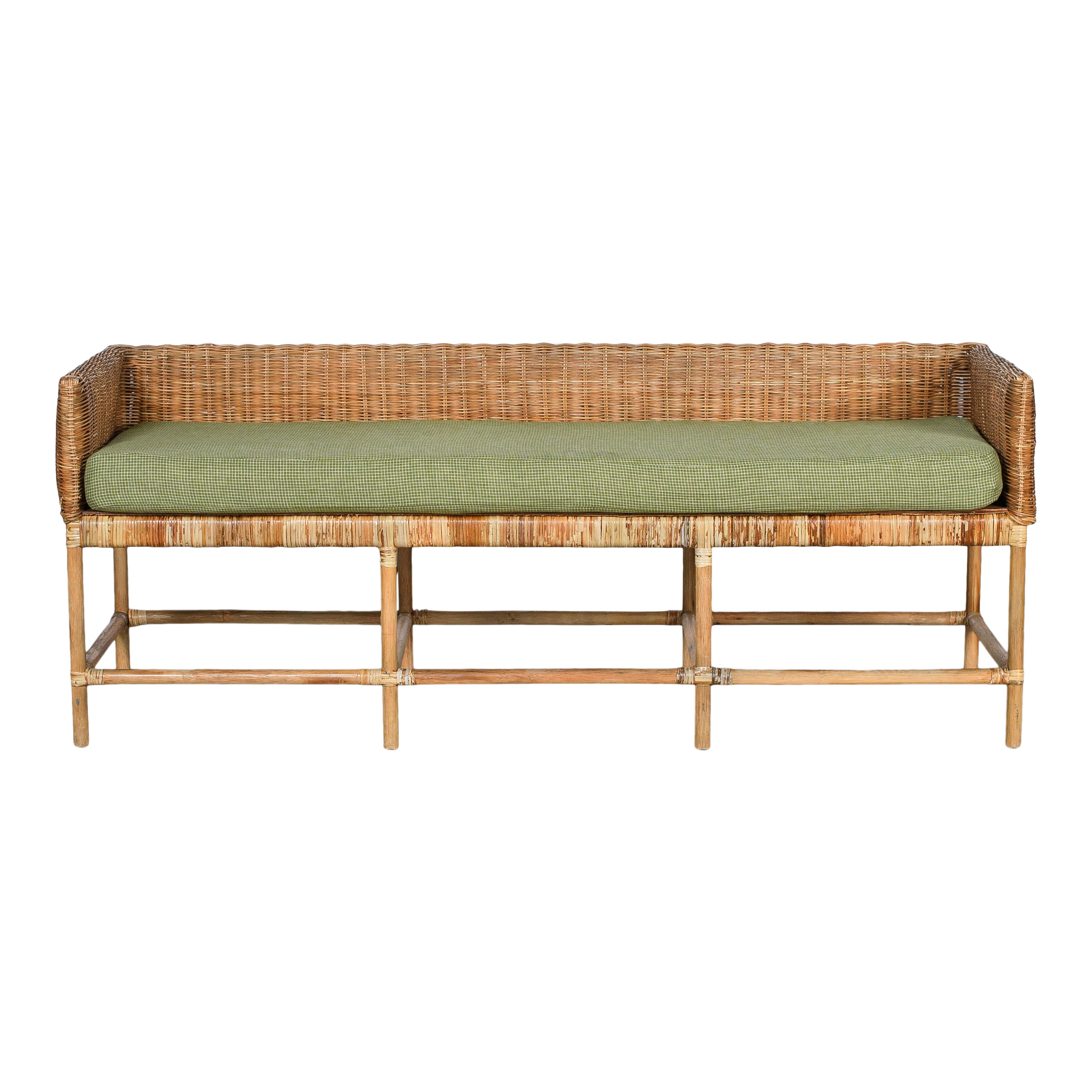 The Britt Bench is a rattan bench featuring a green micro-check upholstered cushion. Its natural texture and soft, neutral seat create a balanced look that suits a variety of spaces. Perfect for extra seating or as a stylish accent piece.