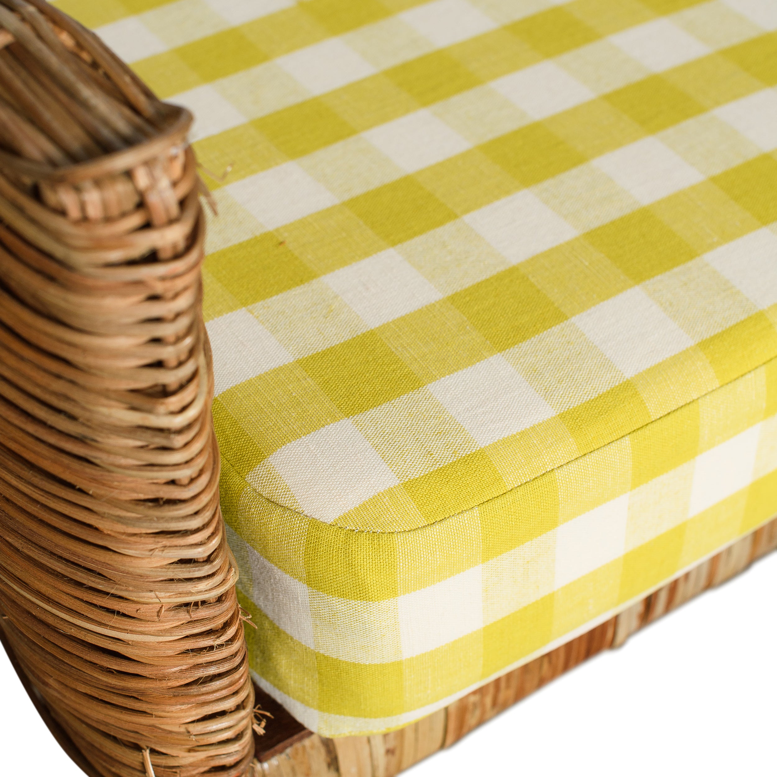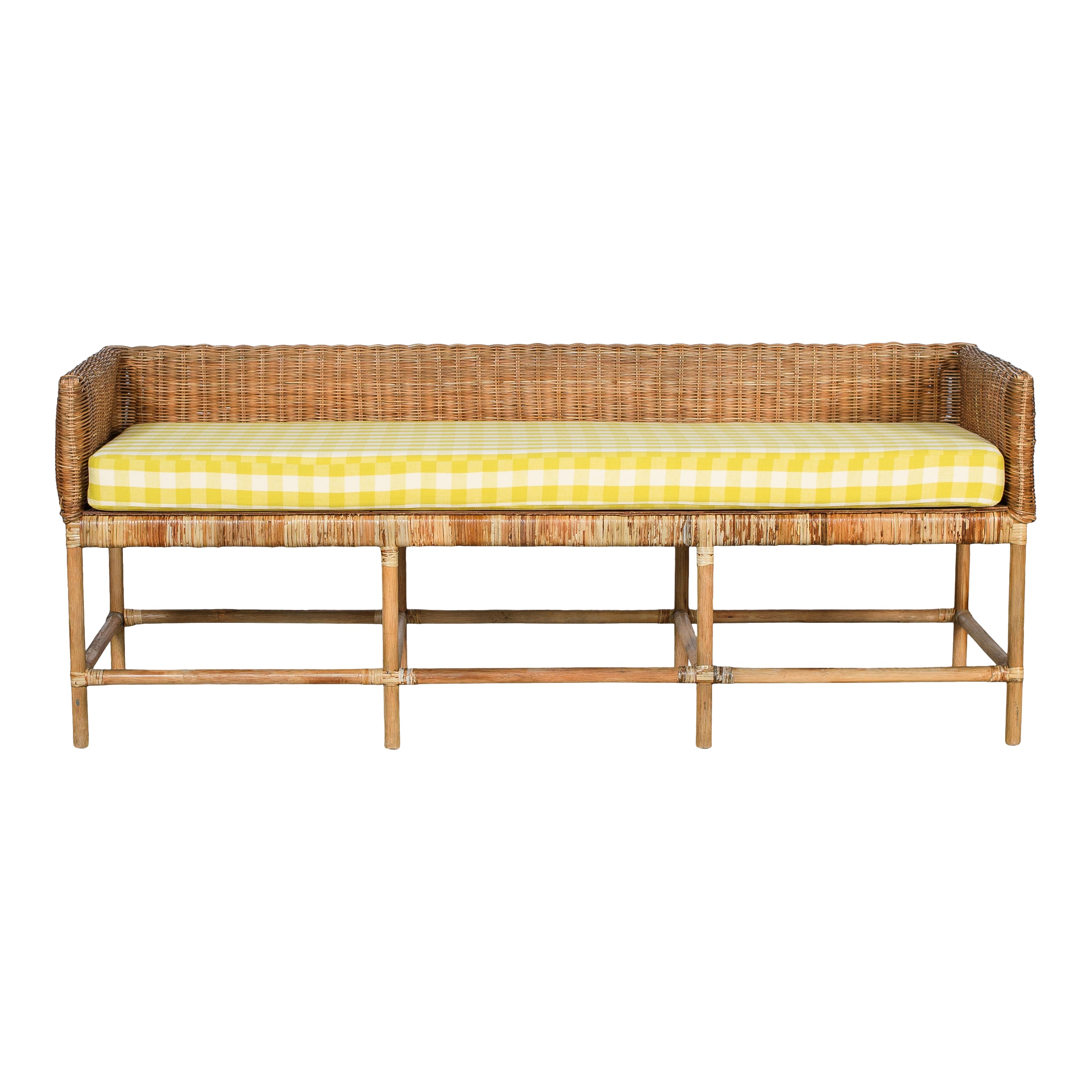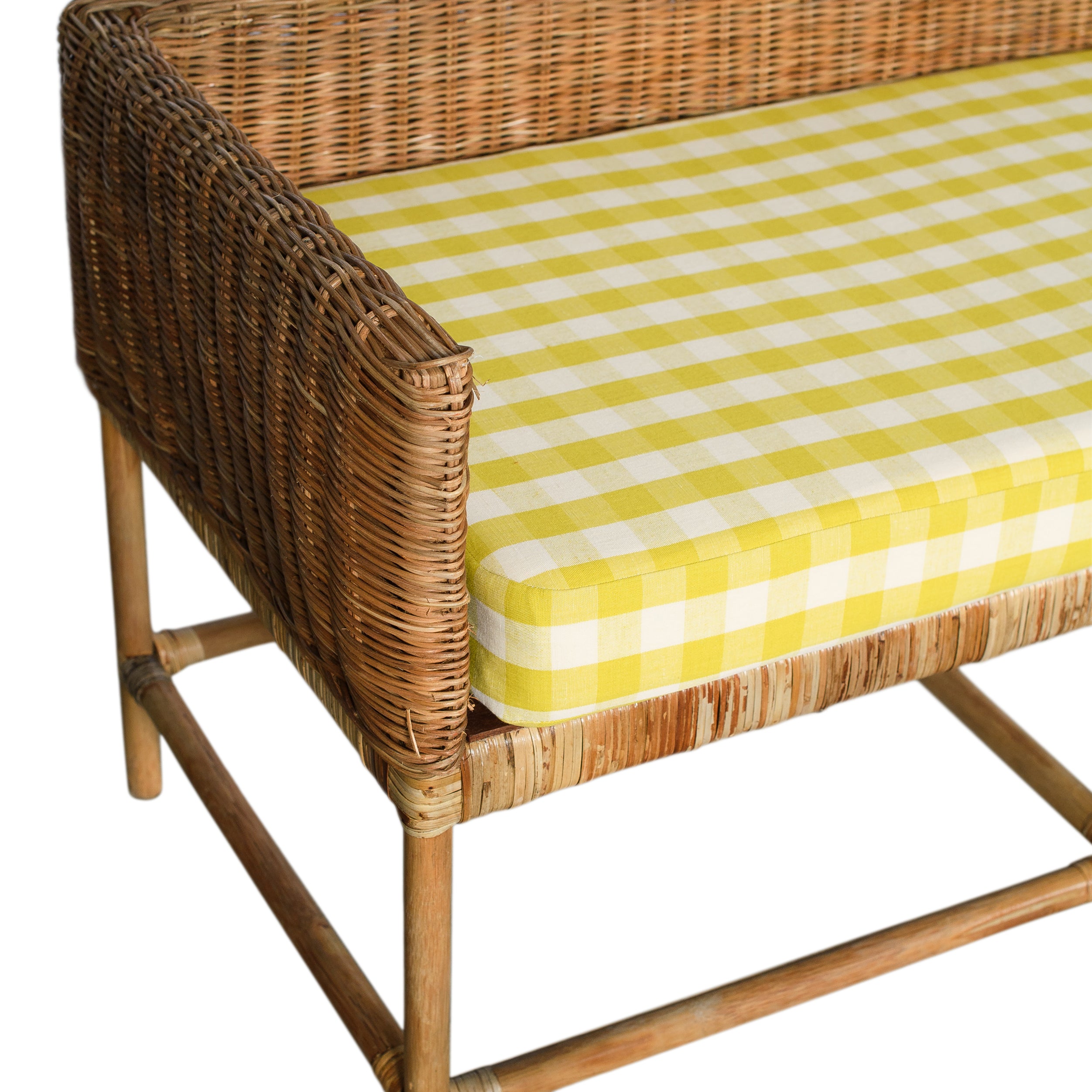 The Britt Bench is a rattan bench featuring a yellow gingham upholstered cushion. Its natural texture and soft, neutral seat create a balanced look that suits a variety of spaces. Perfect for extra seating or as a stylish accent piece.