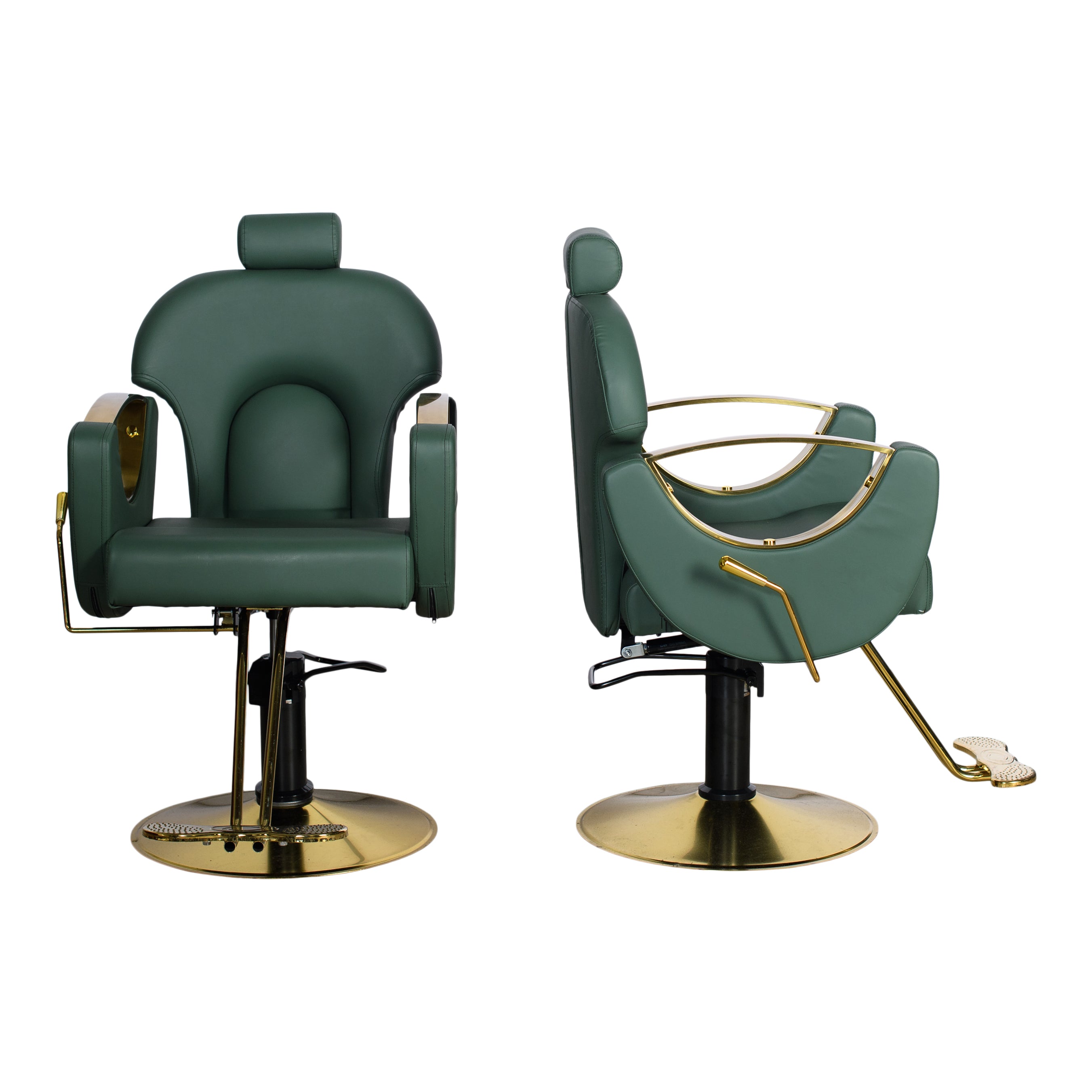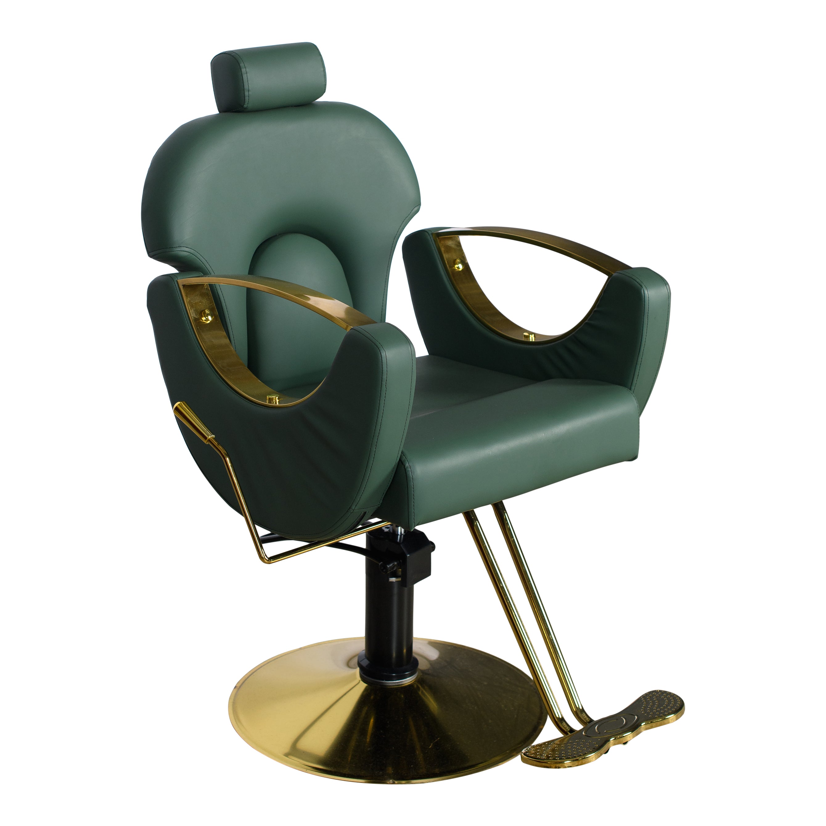 The Kimble Barber Chair features a bold, sculptural design upholstered in green leather with brass accents. A statement piece perfect for hair and beauty focused events.