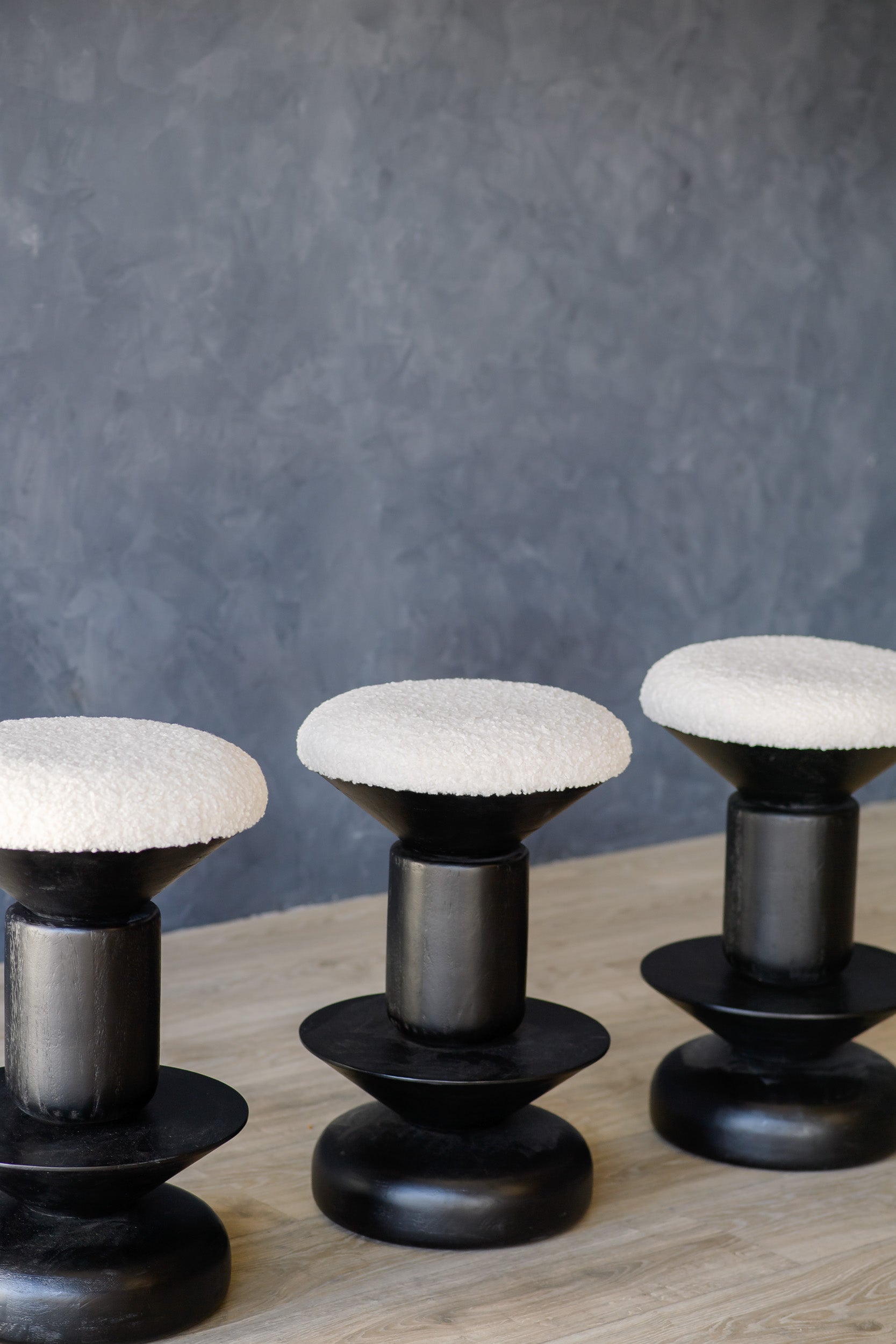 The Stef Counter Stool features a bold sculptural silhouette with a black wood base and an ivory boucle seat. Its striking form makes it a standout piece for modern counter-height seating, perfect for adding a chic and bold touch.