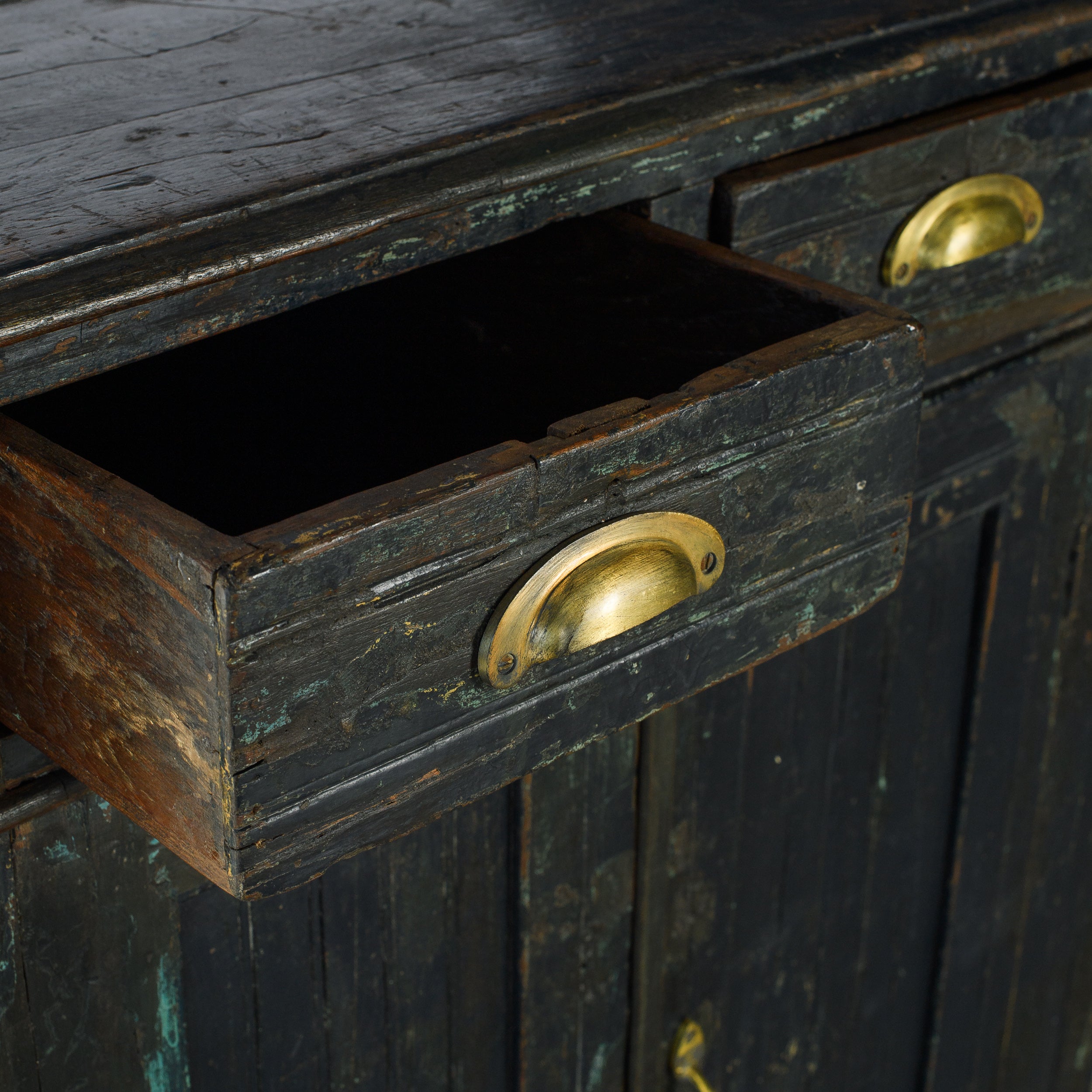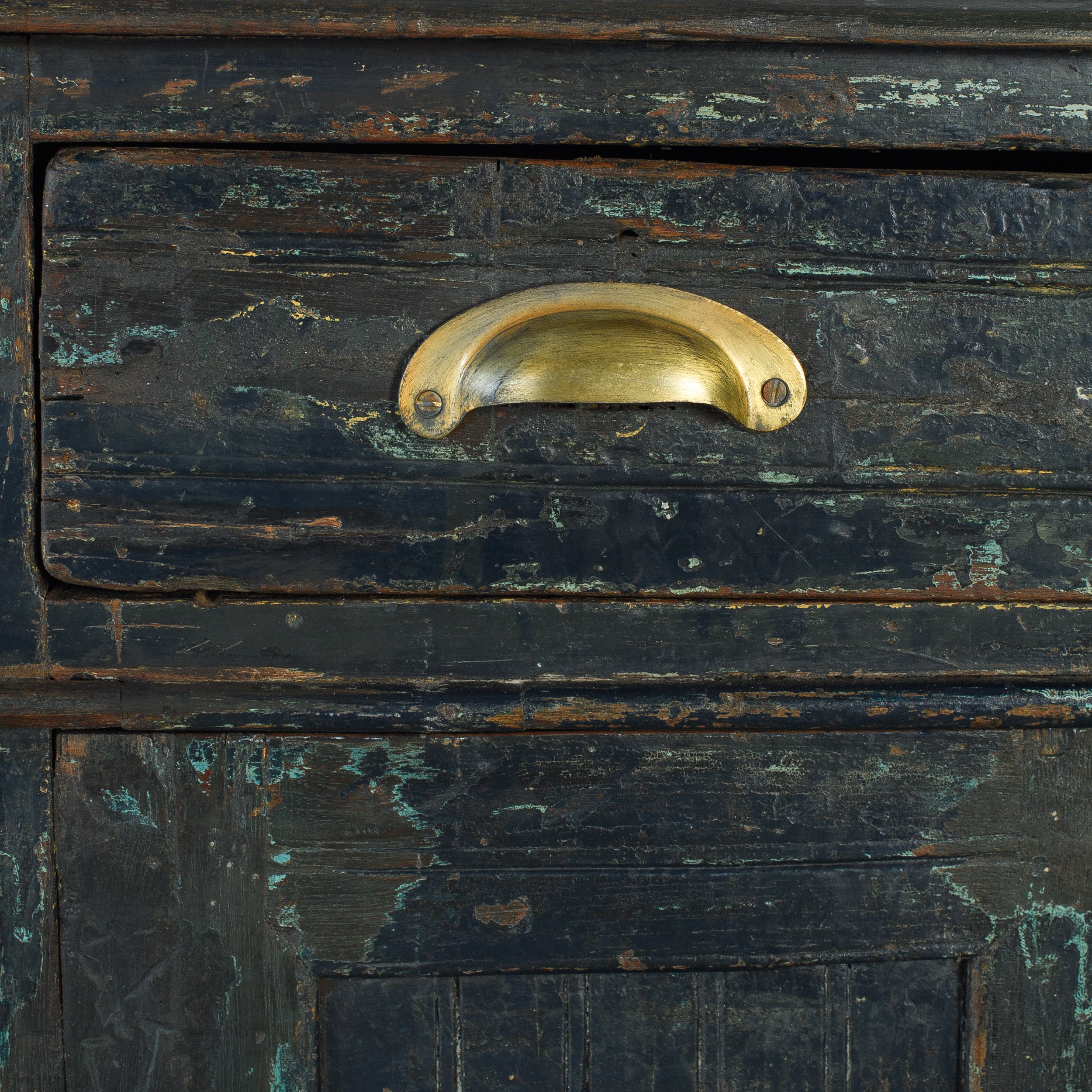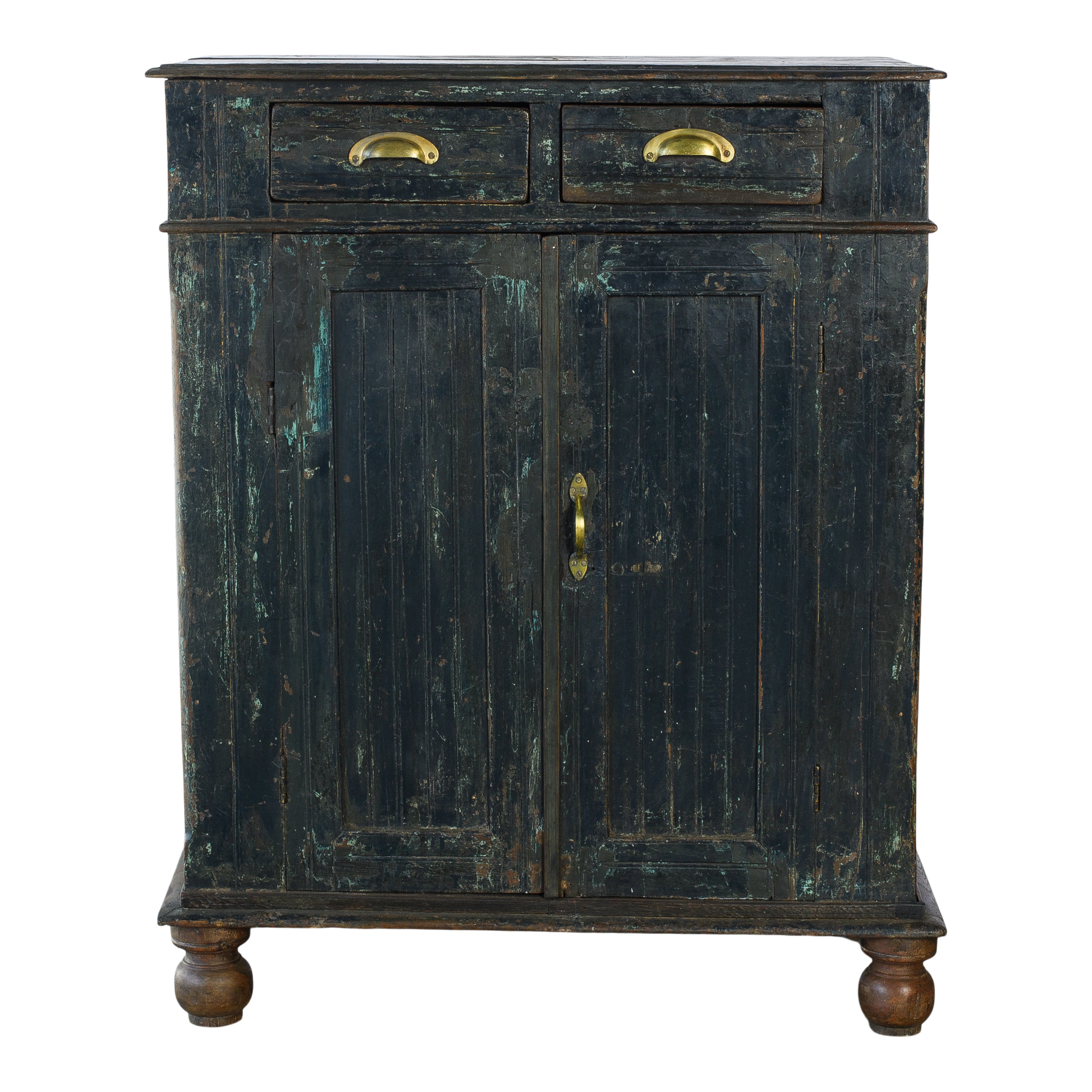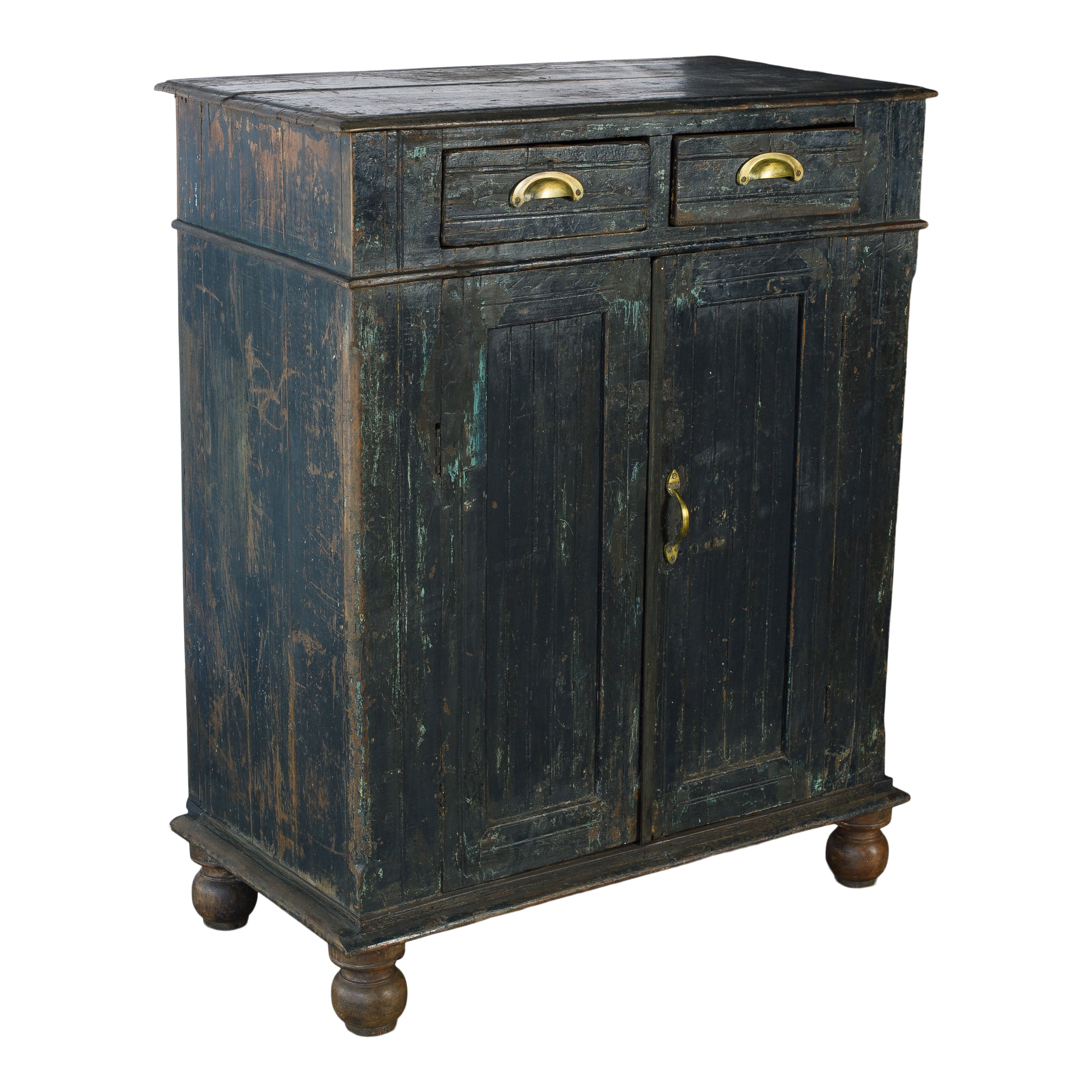This vintage wood cabinet features a richly layered painted finish in deep tones with areas of exposed wood and aged patina throughout. Two upper drawers with brass cup pulls sit above paneled cabinet doors fitted with a central brass handle.