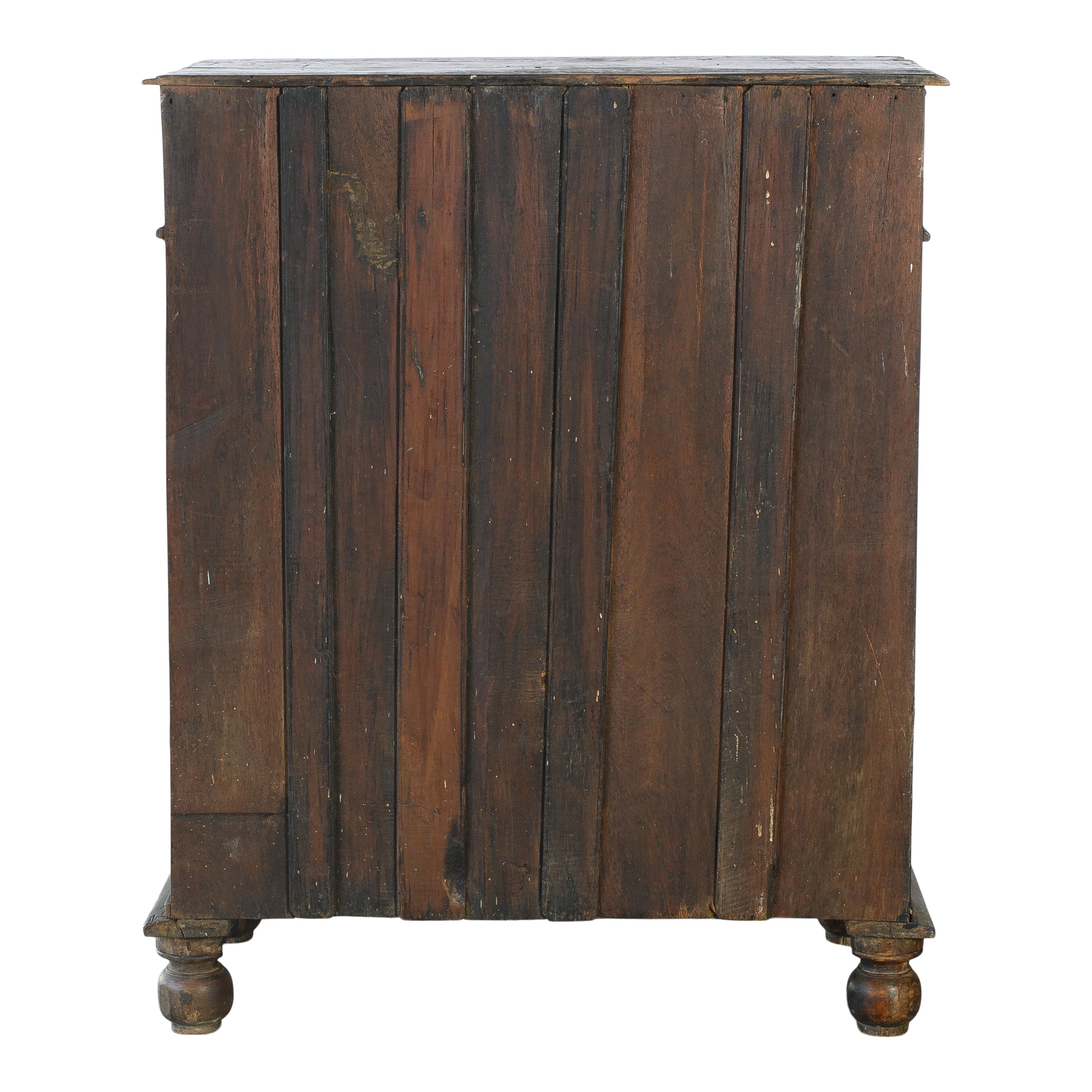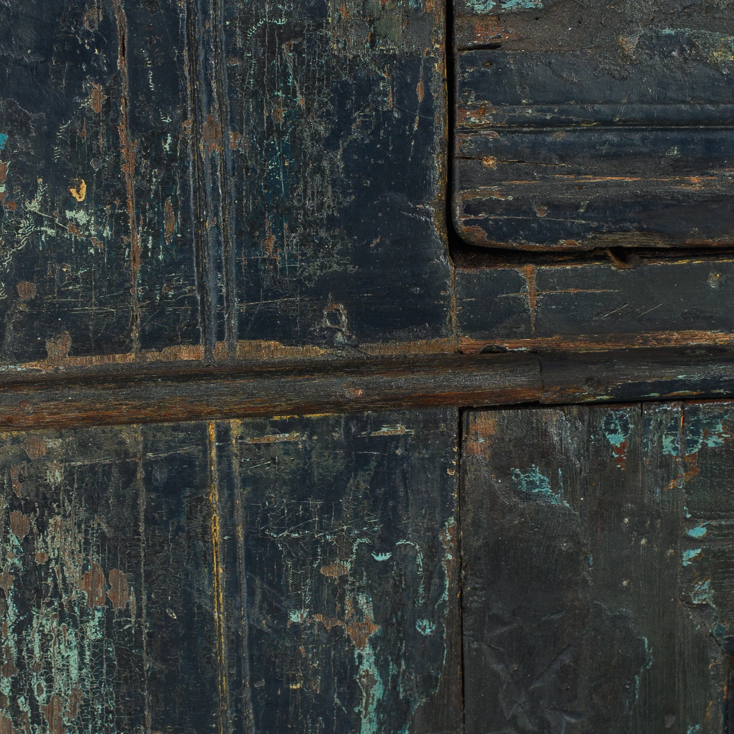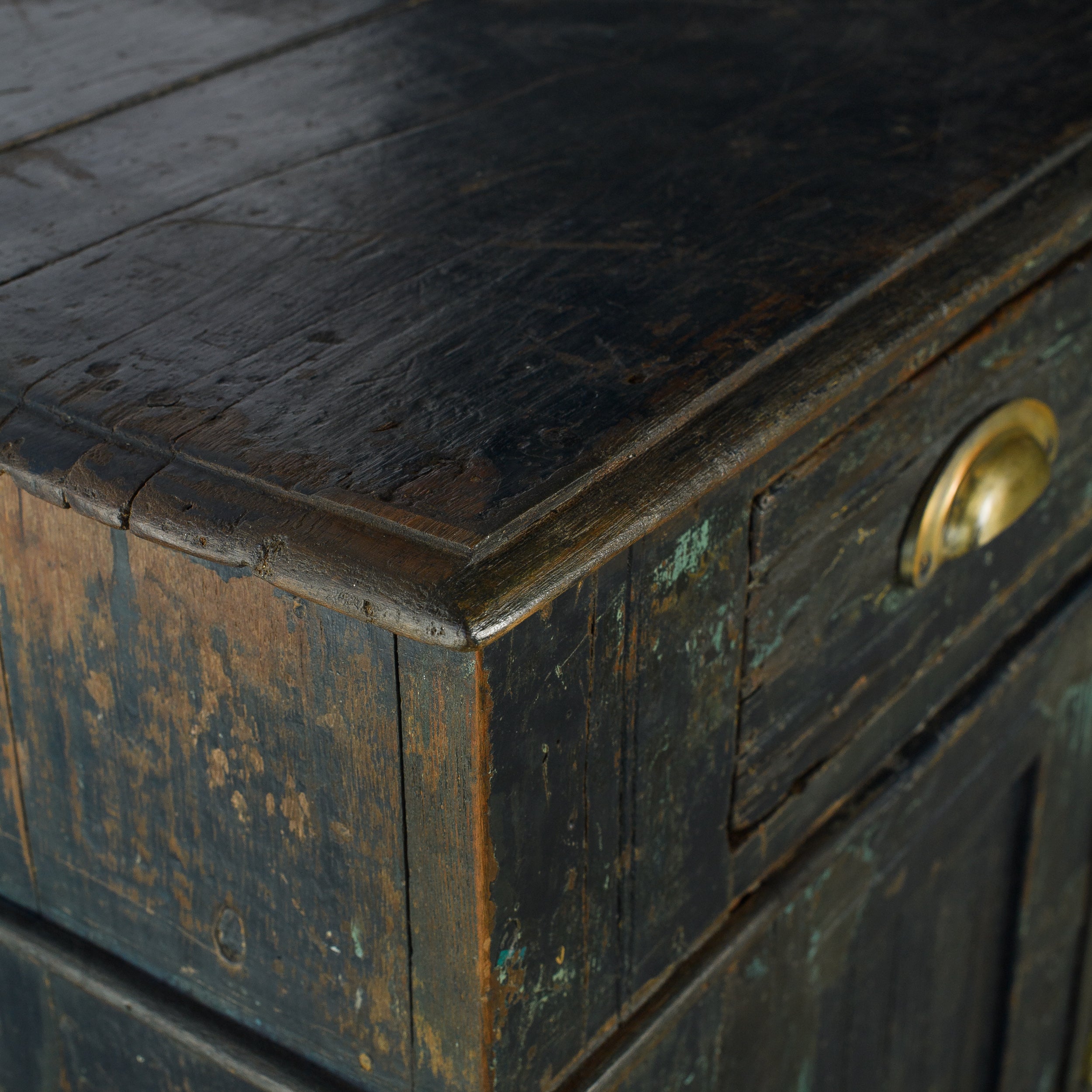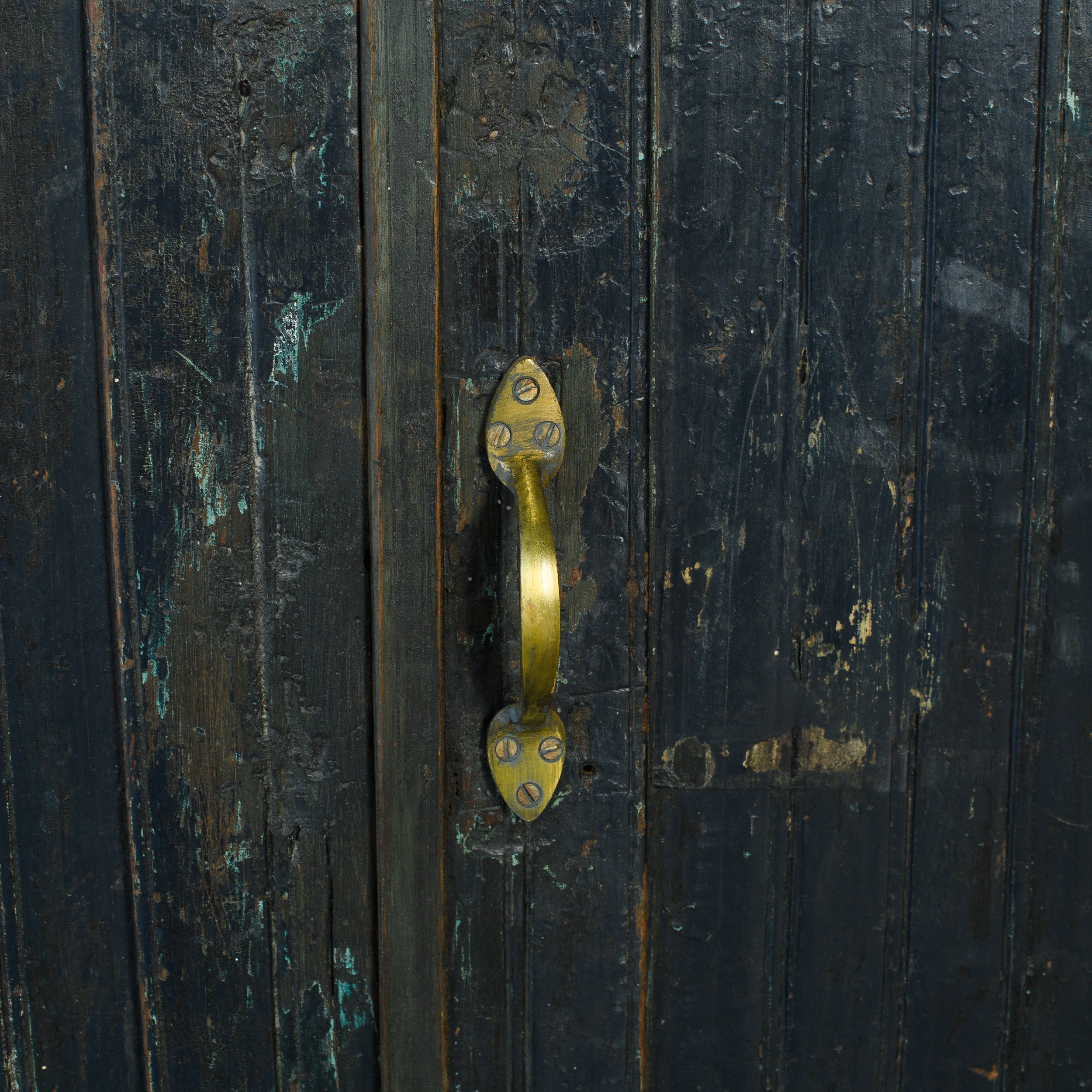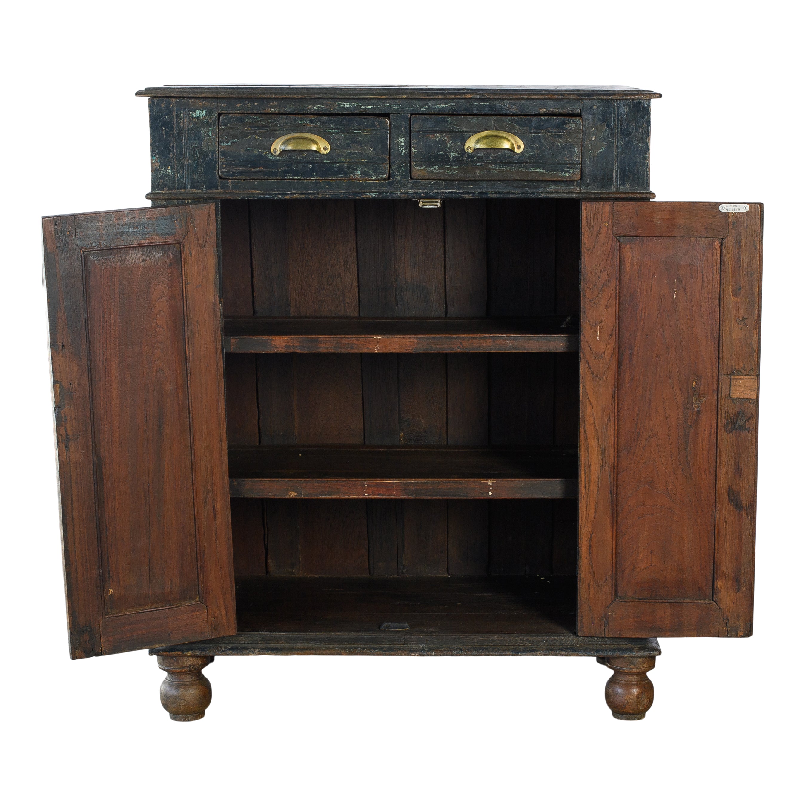 This vintage wood cabinet features a richly layered painted finish in deep tones with areas of exposed wood and aged patina throughout. Two upper drawers with brass cup pulls sit above paneled cabinet doors fitted with a central brass handle.