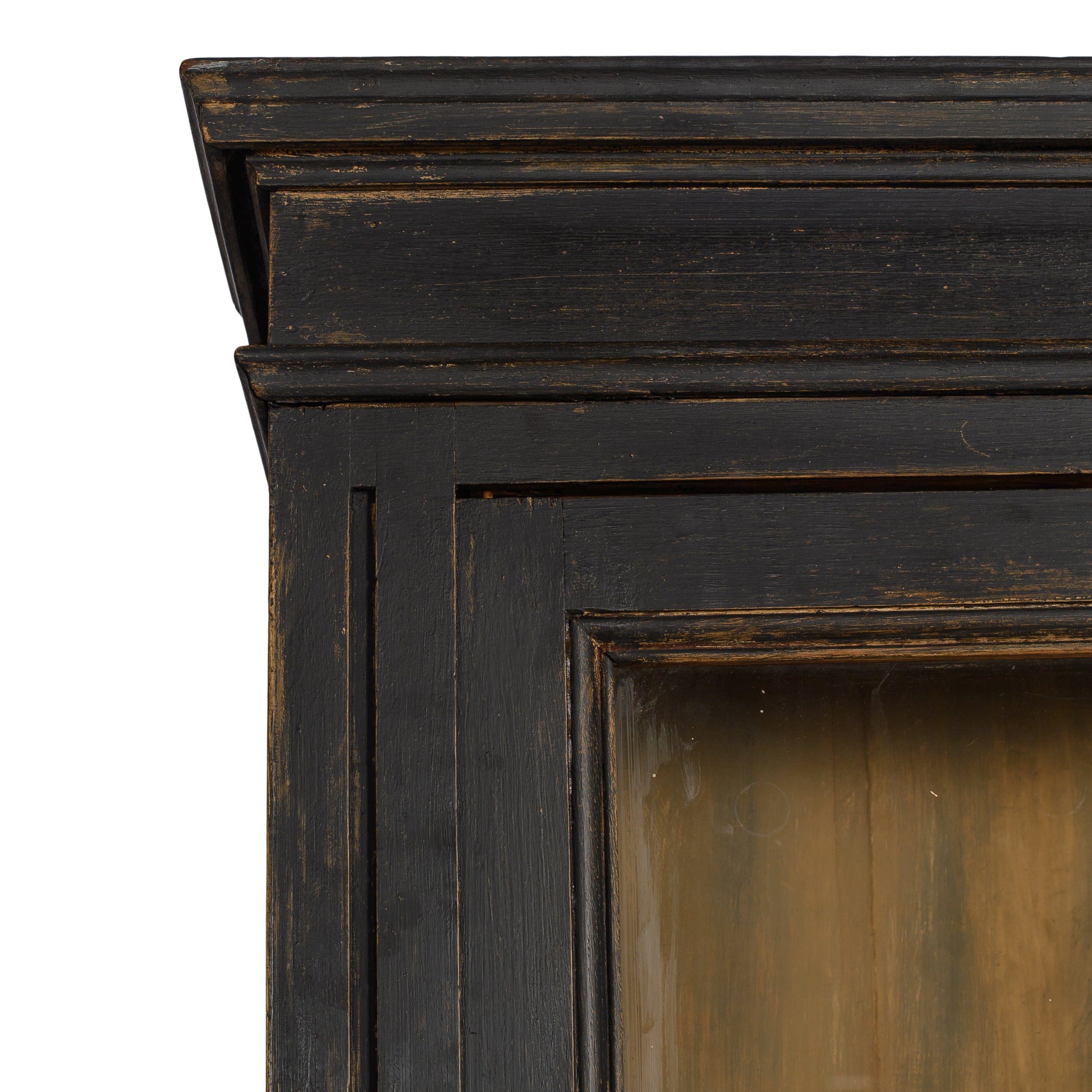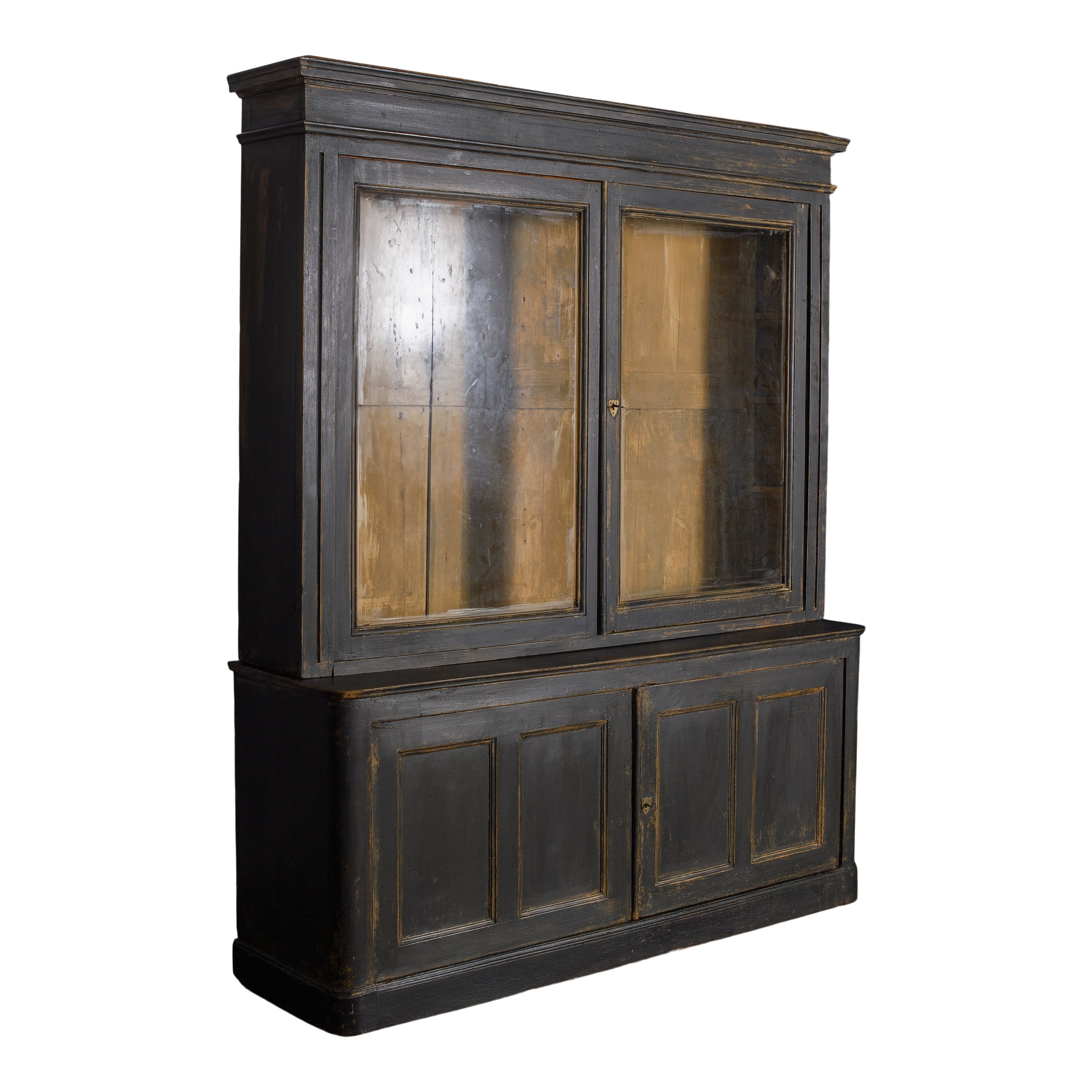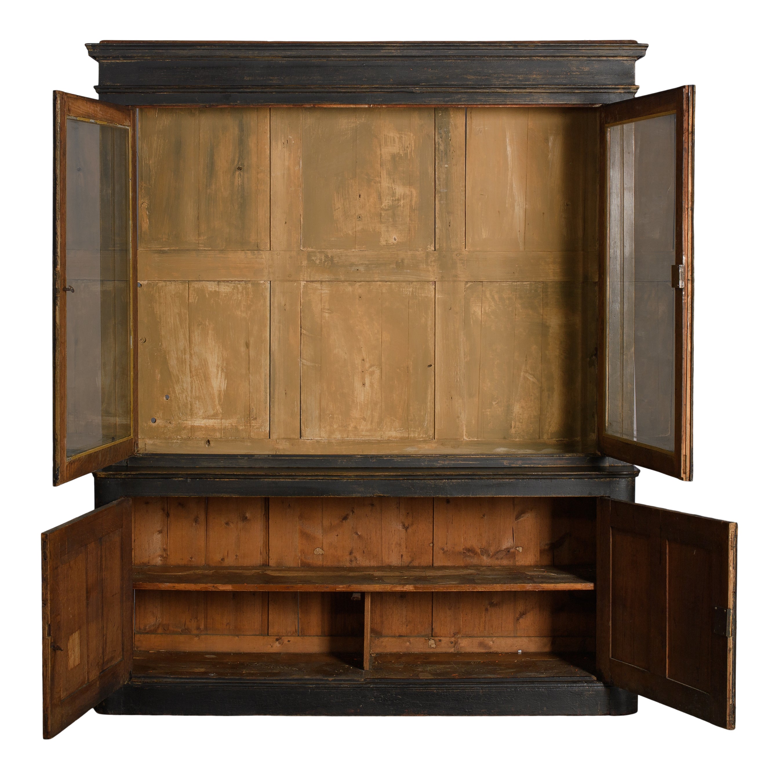 This vintage cabinet features a tall, two-piece form with glass-front upper doors and solid paneled doors below. Finished in a deep, timeworn black, the surface shows areas of rubbed edges, subtle color variation, and signs of age that add depth and character. The upper section offers visibility for display, while the lower cabinet provides concealed storage behind framed doors.
