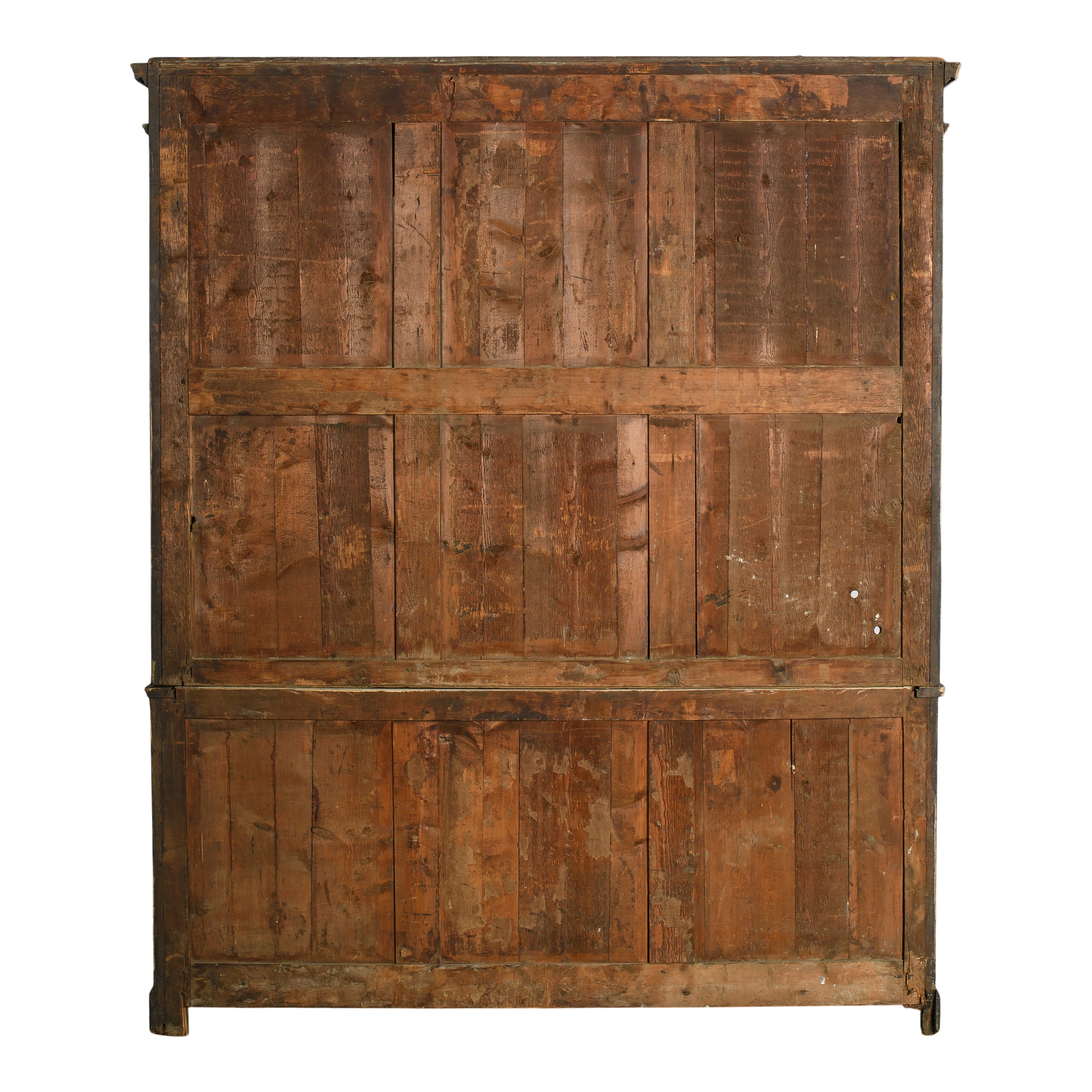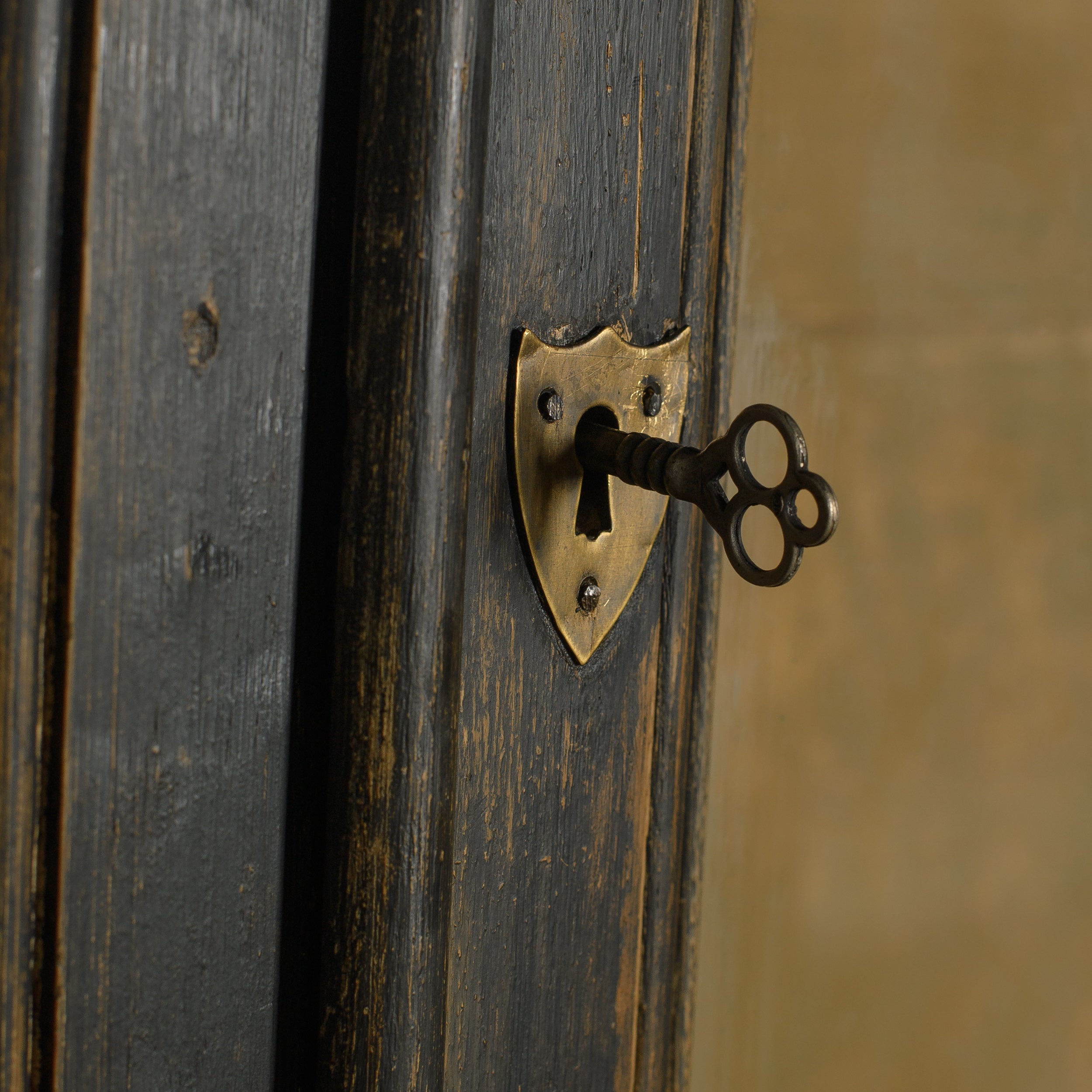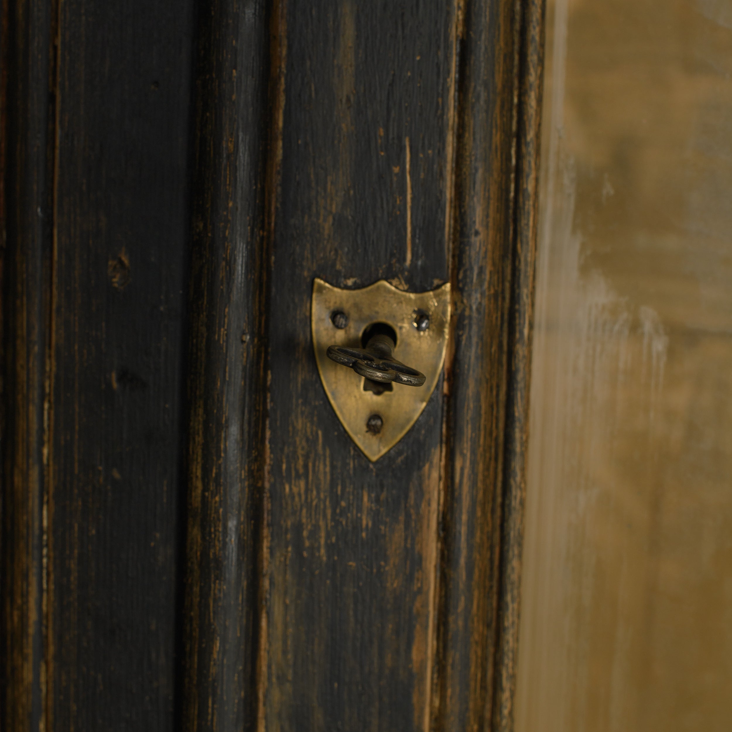 This vintage cabinet features a tall, two-piece form with glass-front upper doors and solid paneled doors below. Finished in a deep, timeworn black, the surface shows areas of rubbed edges, subtle color variation, and signs of age that add depth and character. The upper section offers visibility for display, while the lower cabinet provides concealed storage behind framed doors.