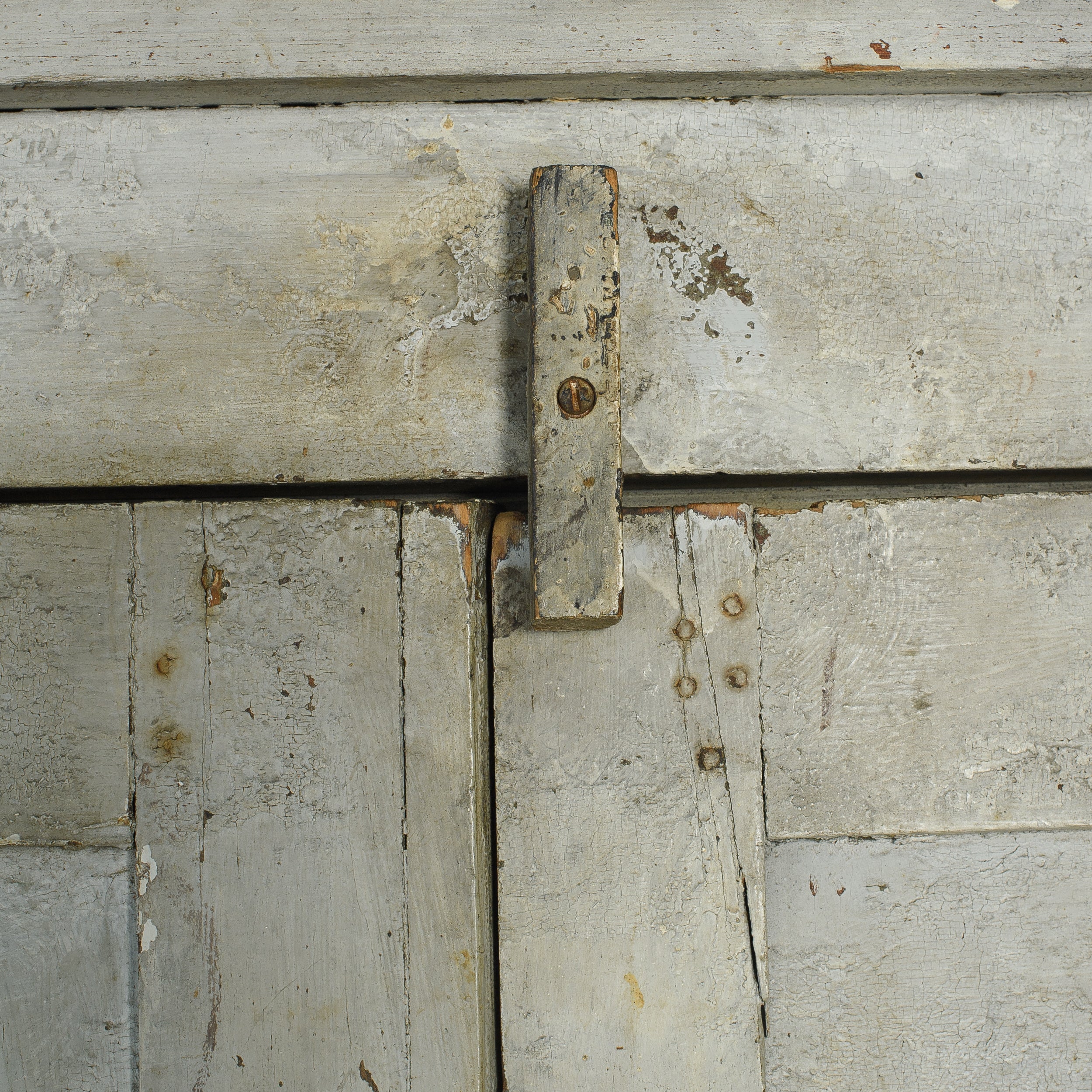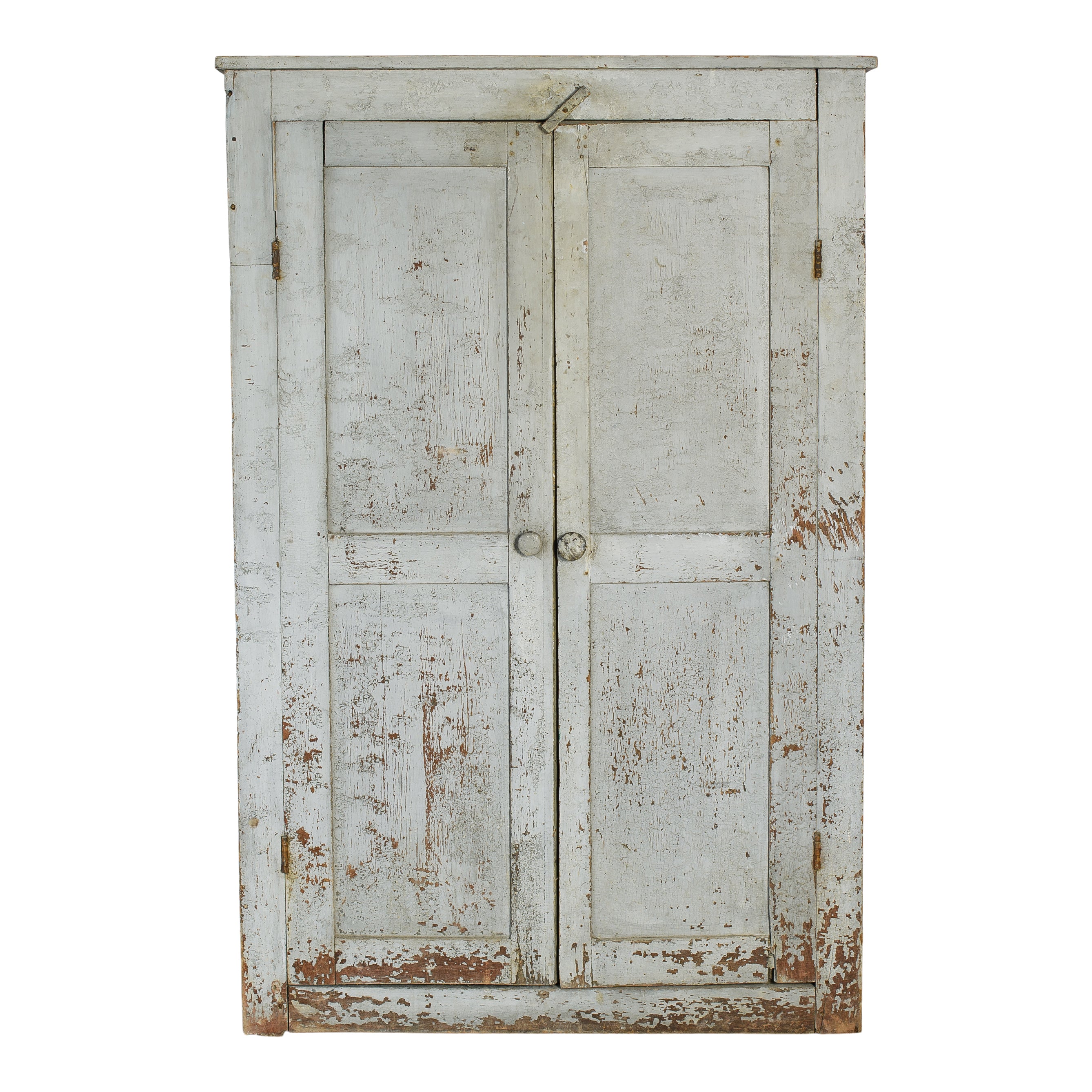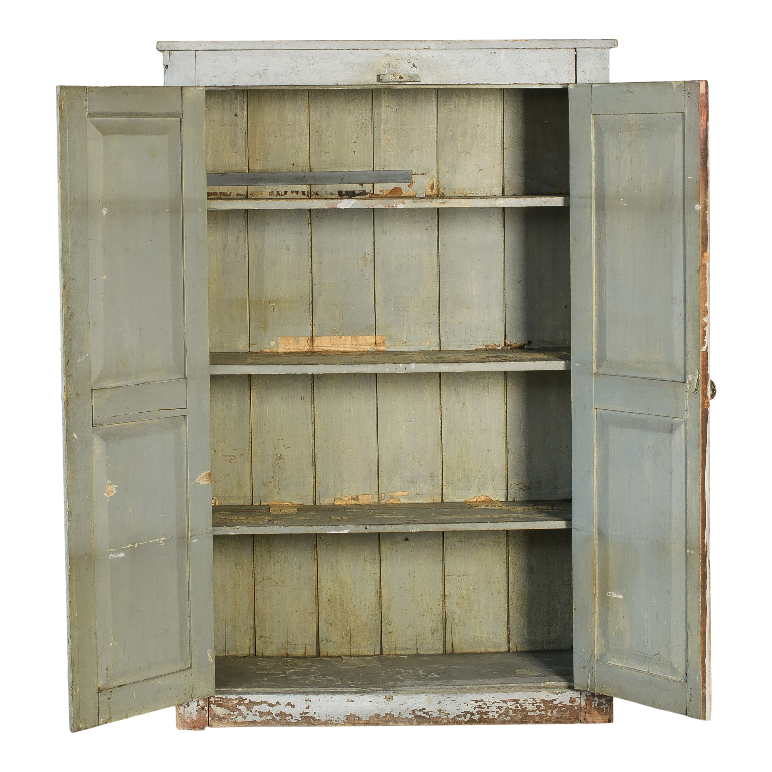 This vintage wood cabinet features double paneled doors and a softly weathered painted finish with visible chipping and layered patina throughout. The exterior shows areas of exposed wood and worn edges that reflect years of use, while the interior reveals a muted painted surface with fixed shelving for organized storage.