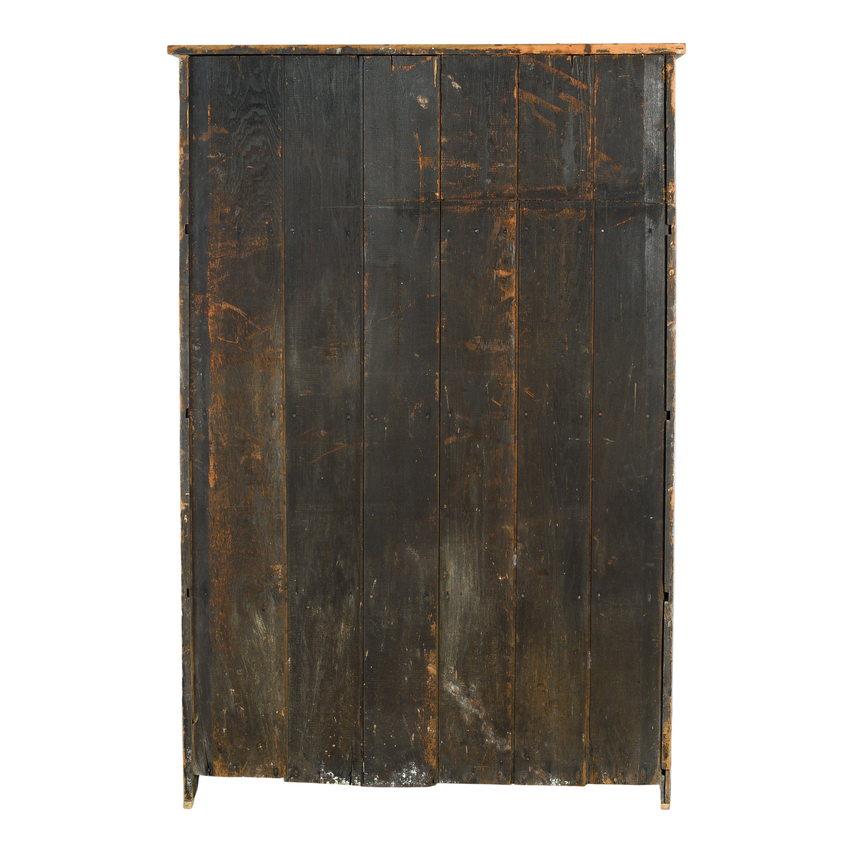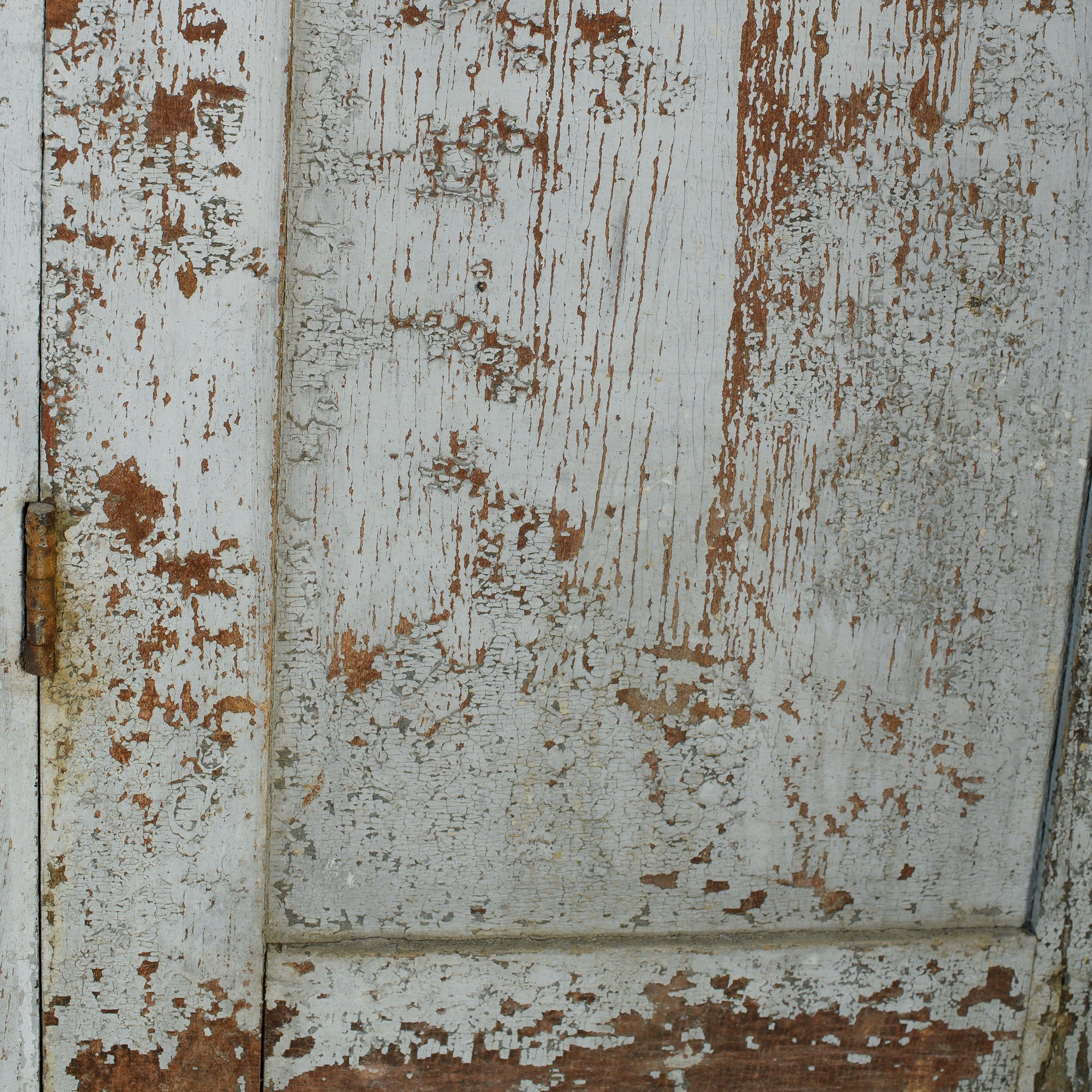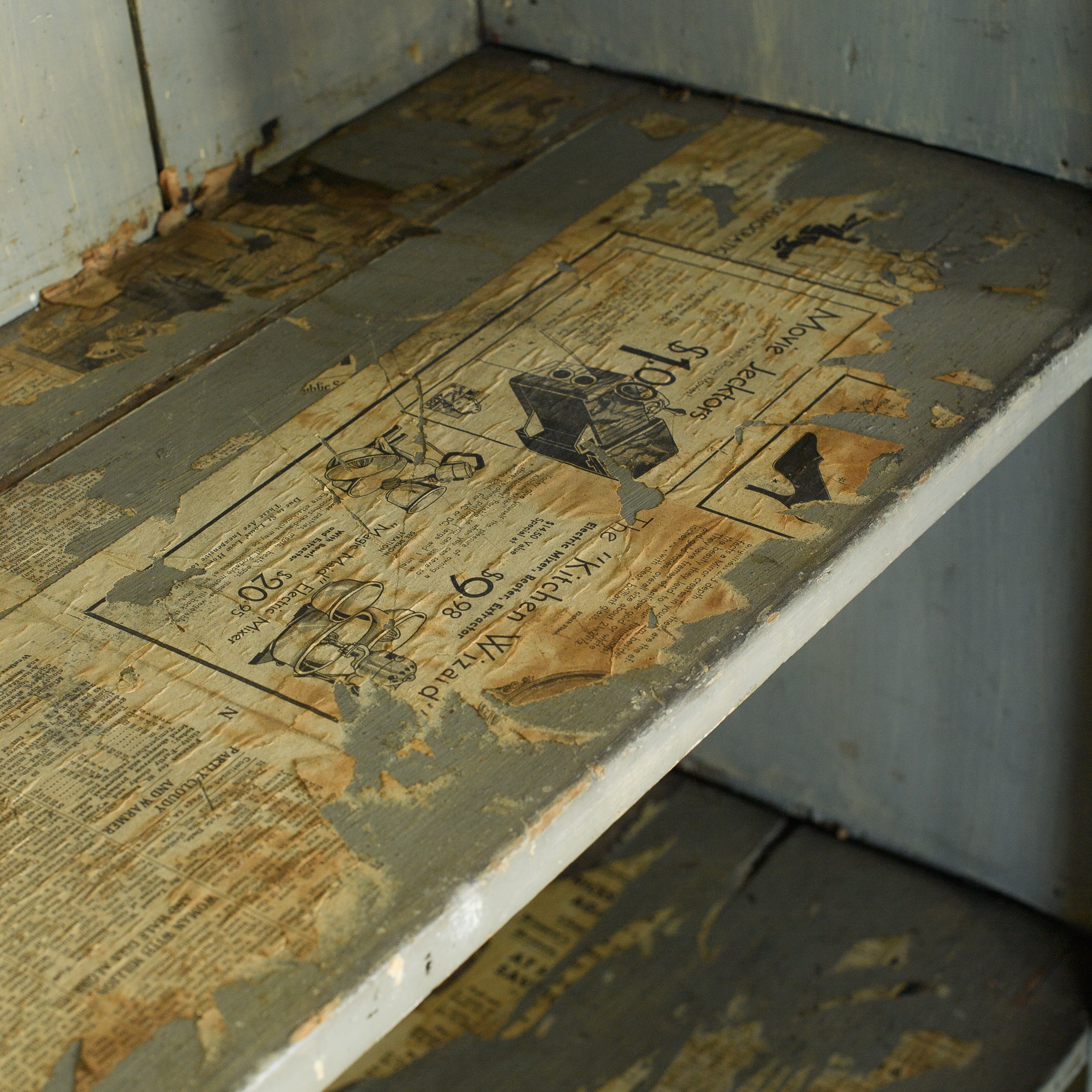 This vintage wood cabinet features double paneled doors and a softly weathered painted finish with visible chipping and layered patina throughout. The exterior shows areas of exposed wood and worn edges that reflect years of use, while the interior reveals a muted painted surface with fixed shelving for organized storage.