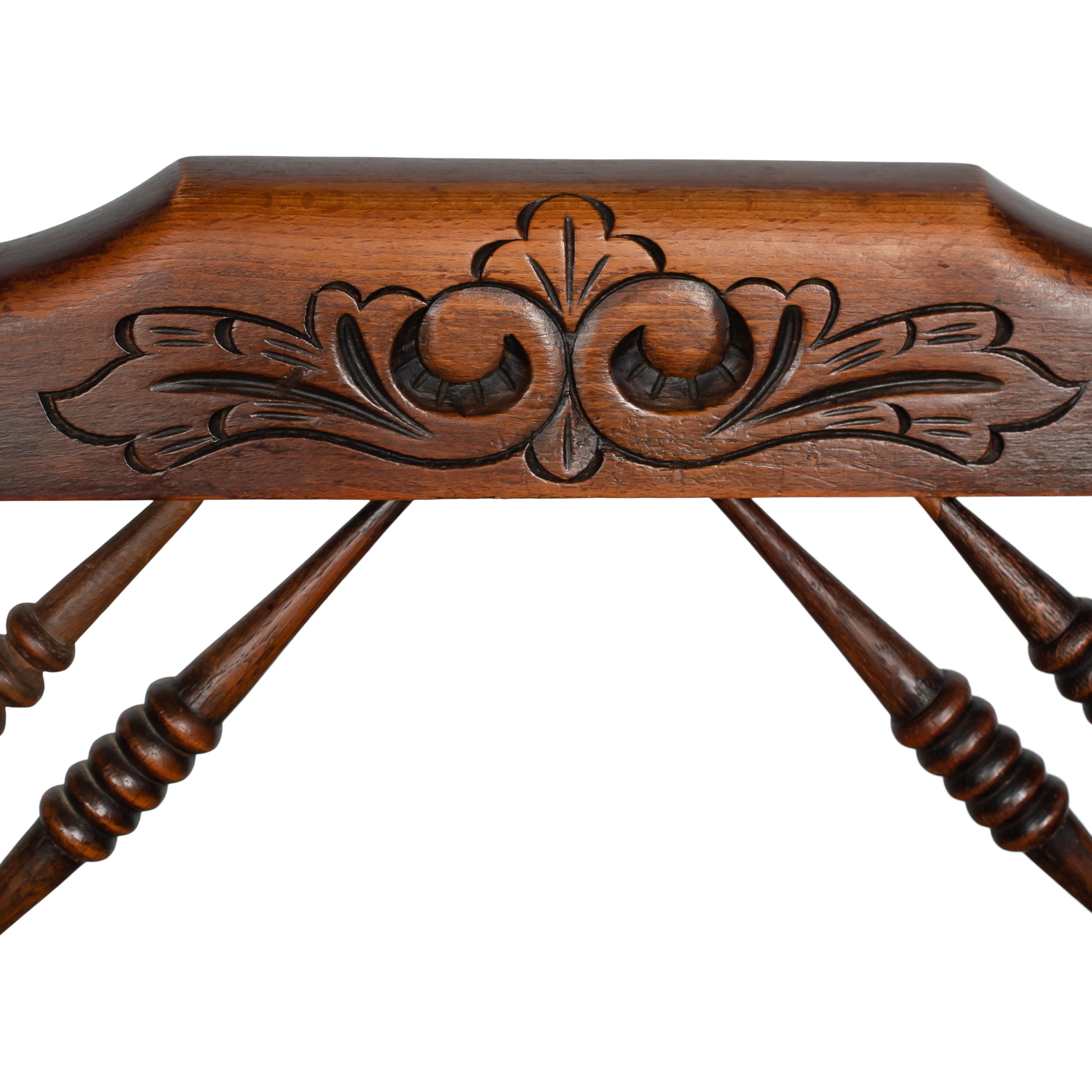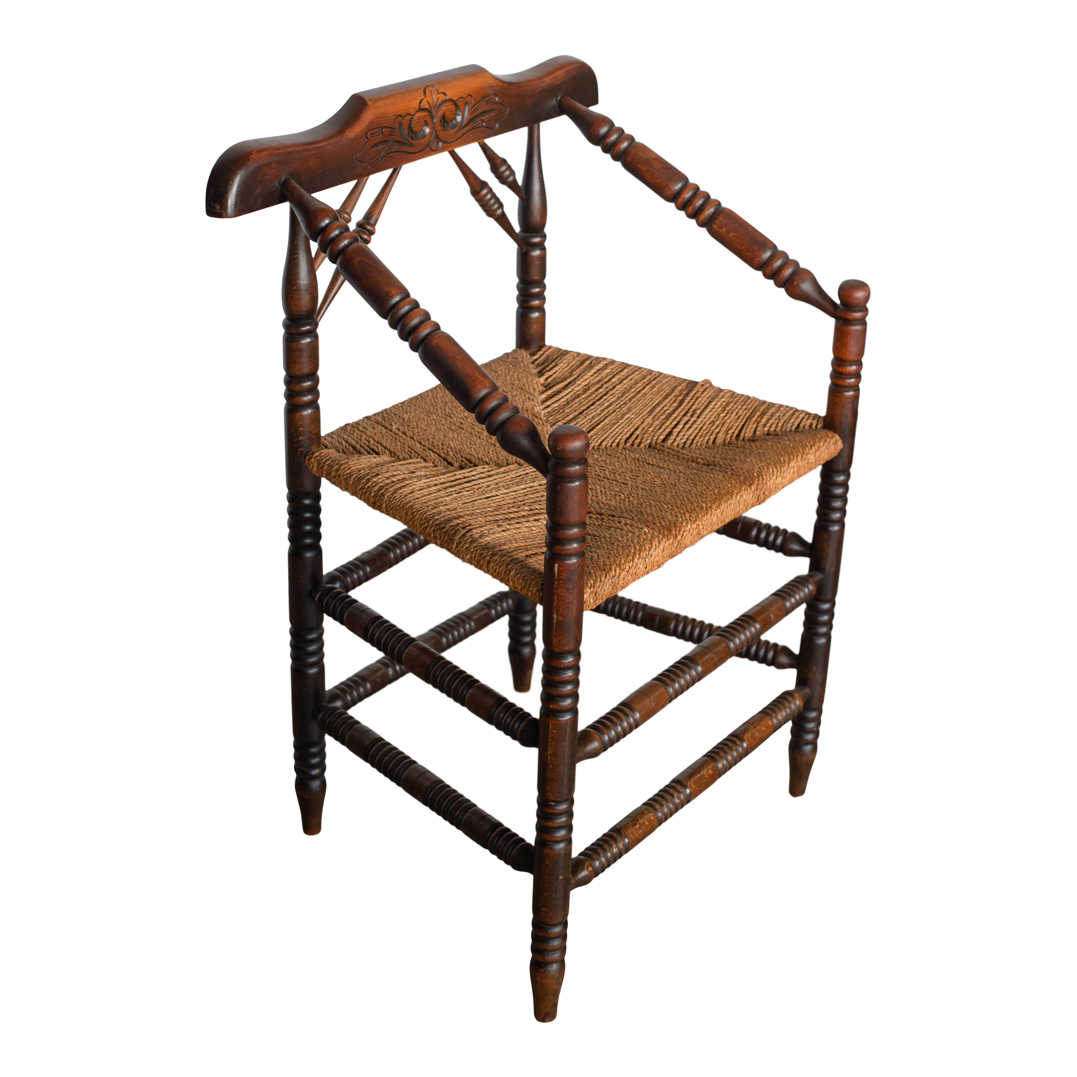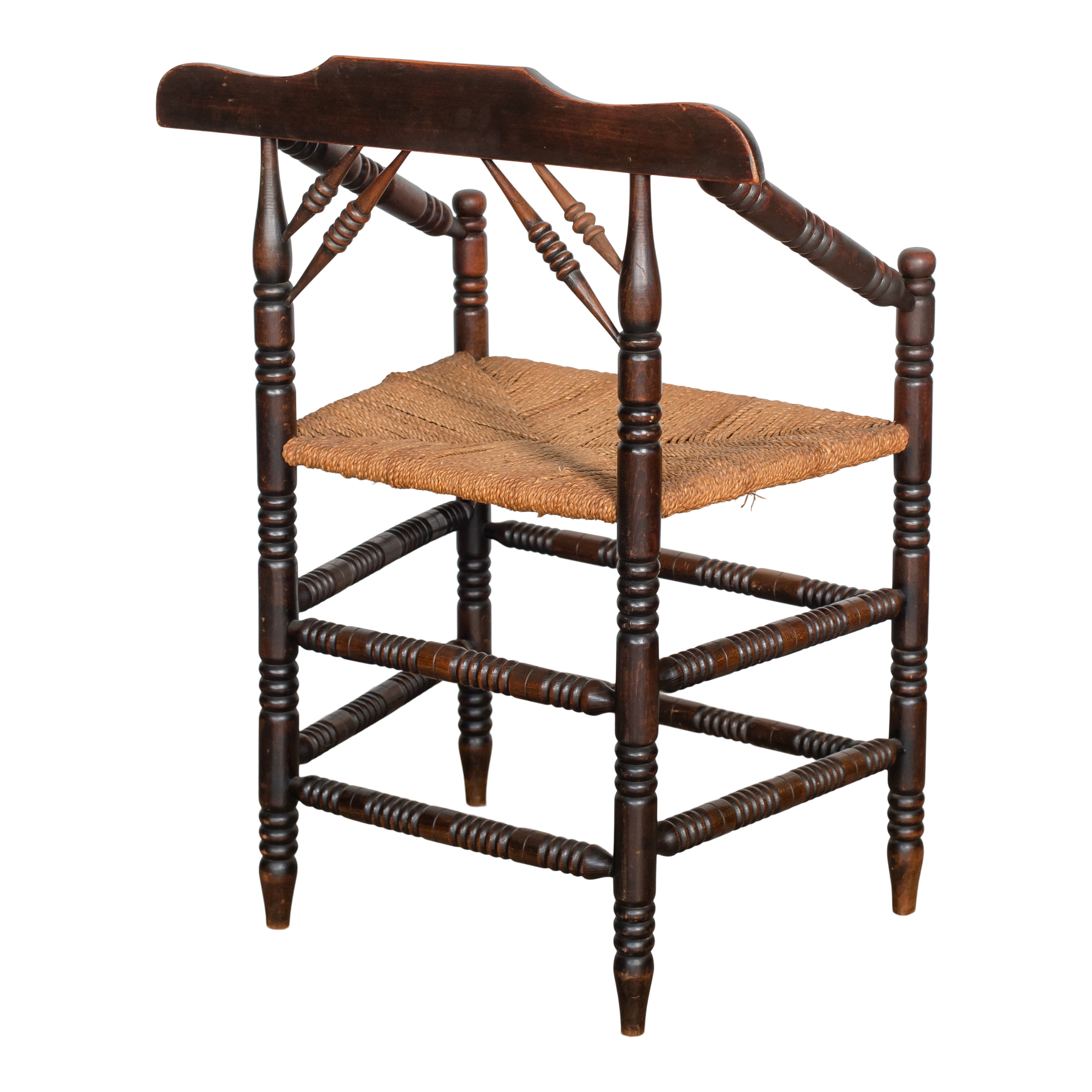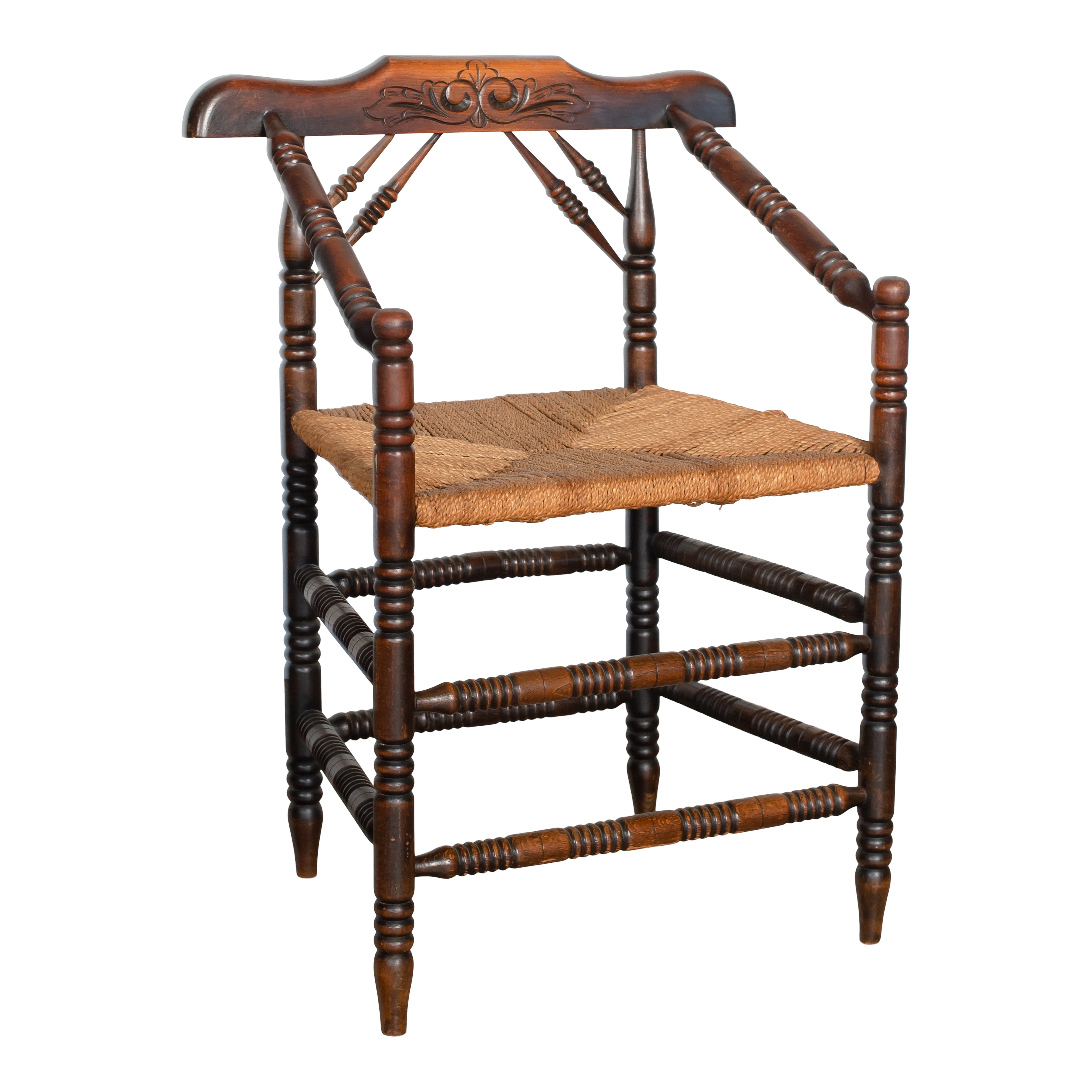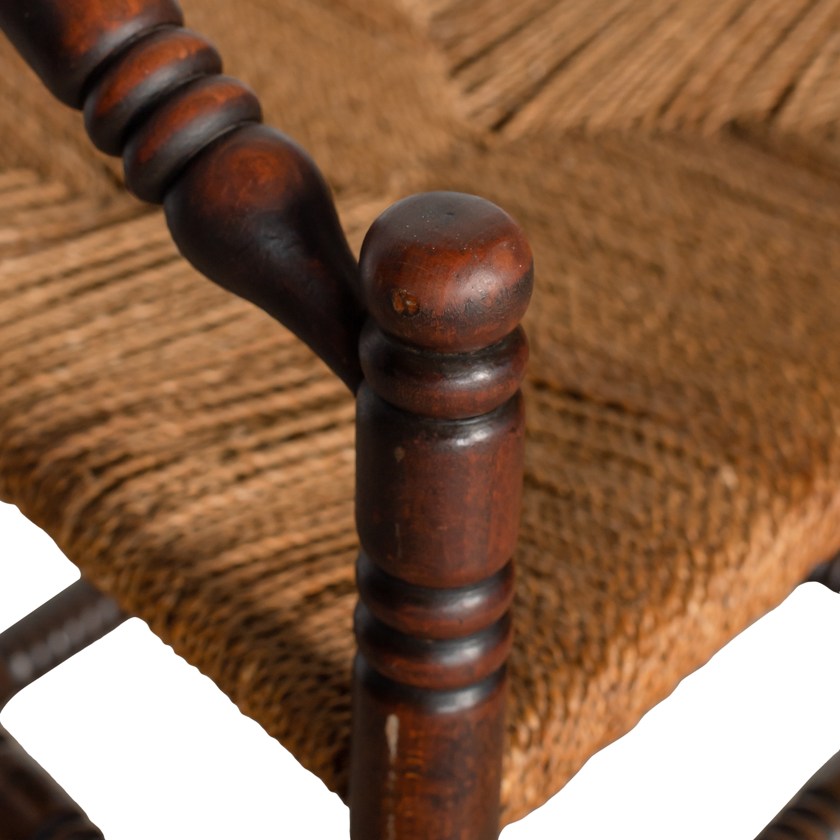 This vintage armchair showcases a dark wood frame with finely turned legs, arms, and stretchers, paired with a hand-woven rush seat for added texture. Seat height: 19.5" Dimensions: 23.5 x 16 x 32.5