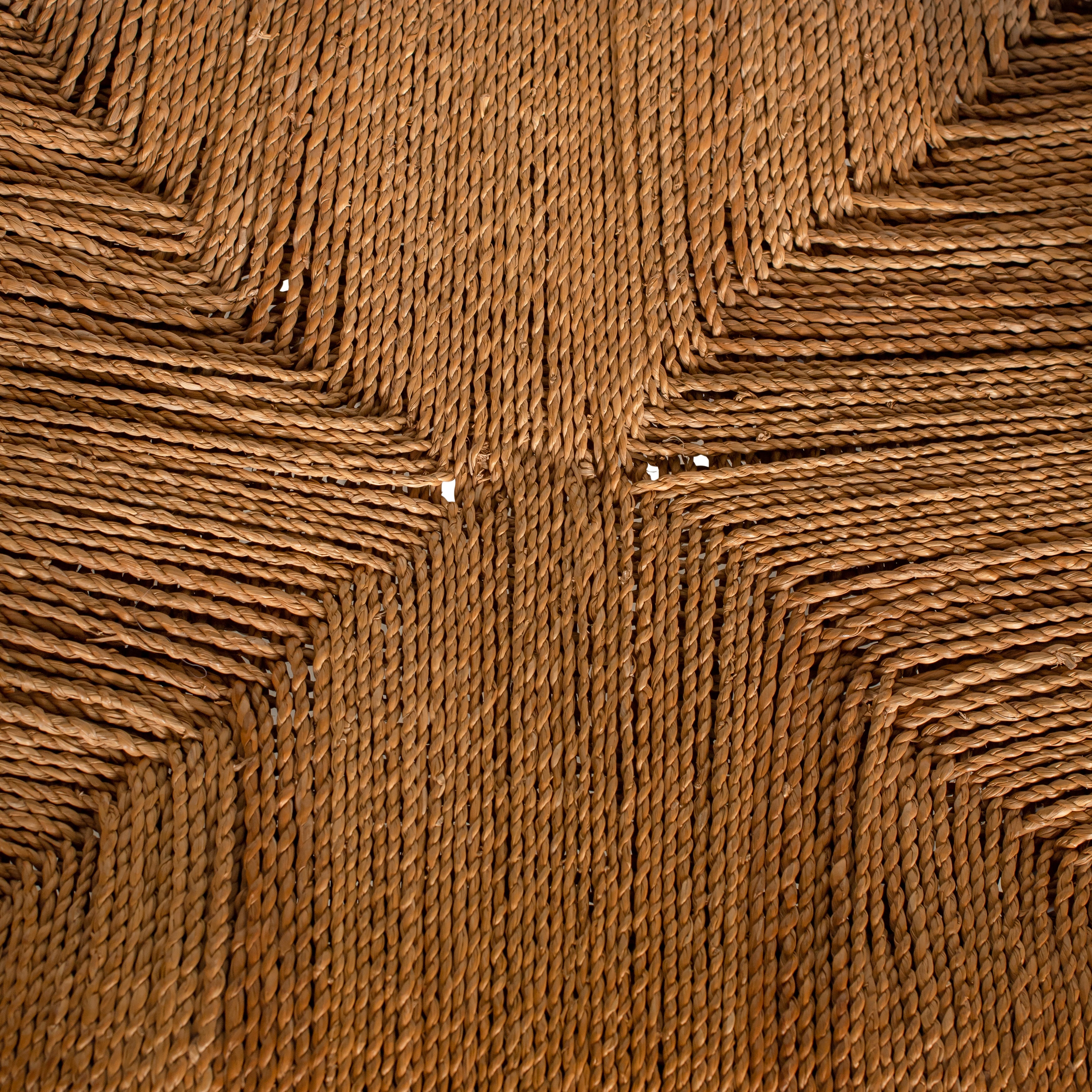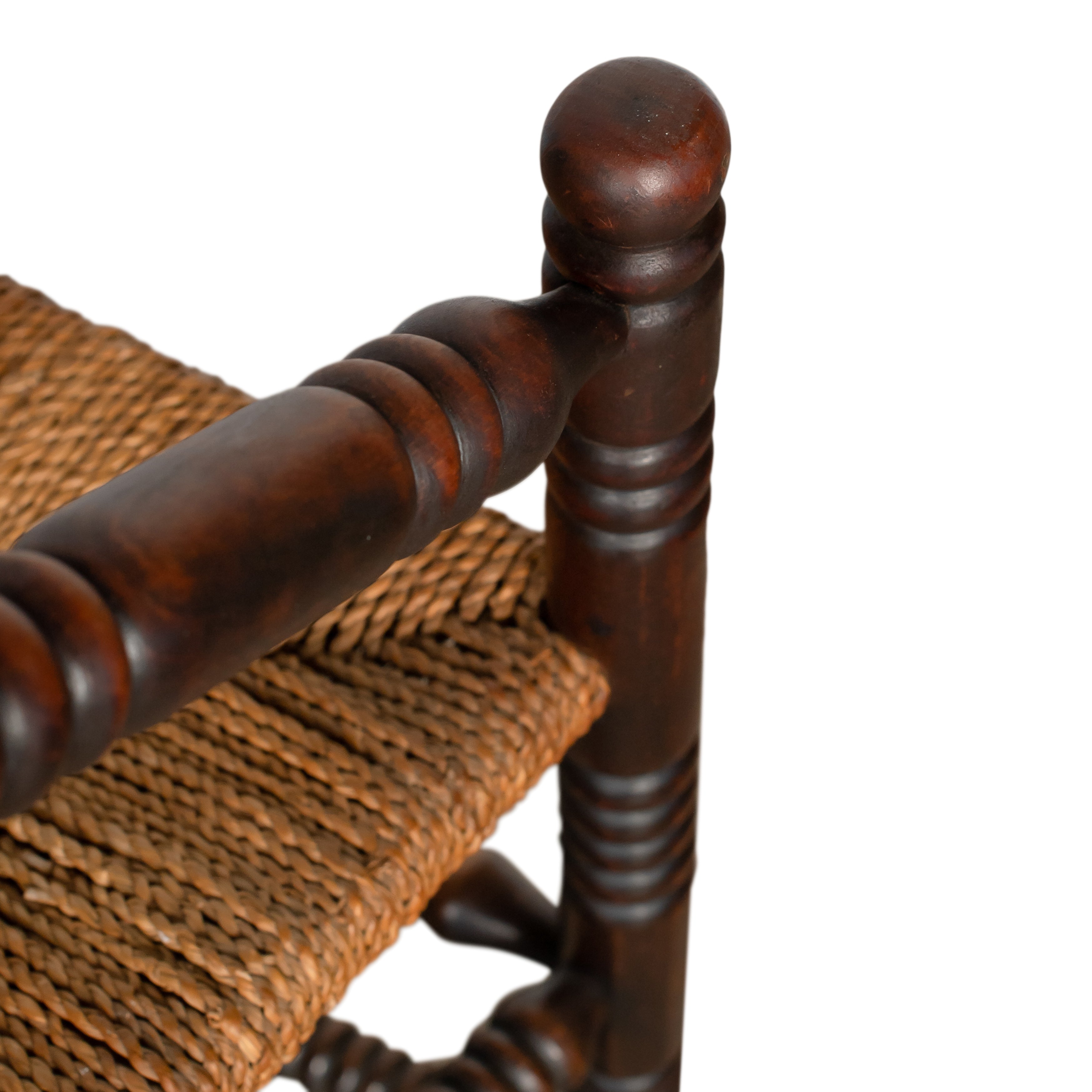 This vintage armchair showcases a dark wood frame with finely turned legs, arms, and stretchers, paired with a hand-woven rush seat for added texture.