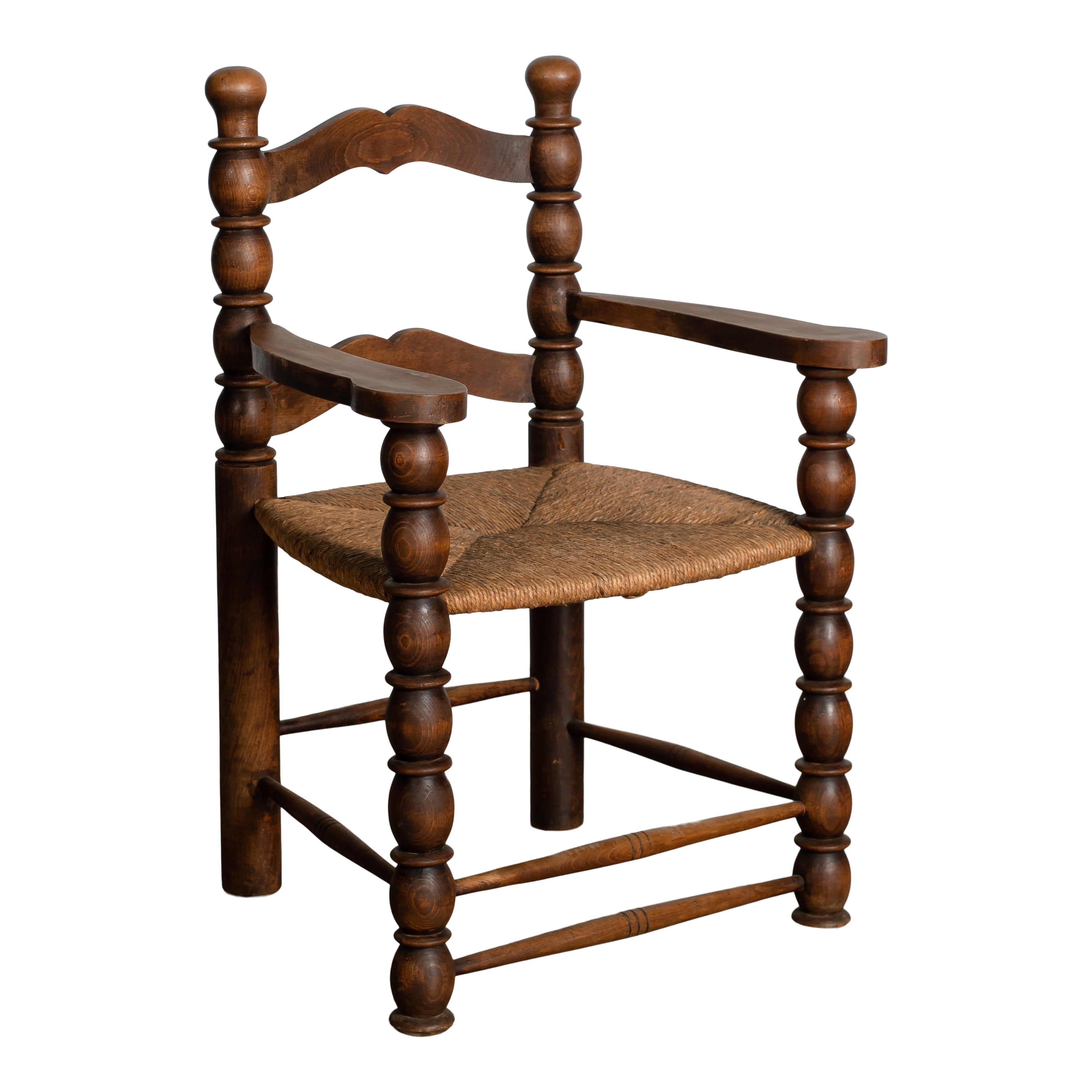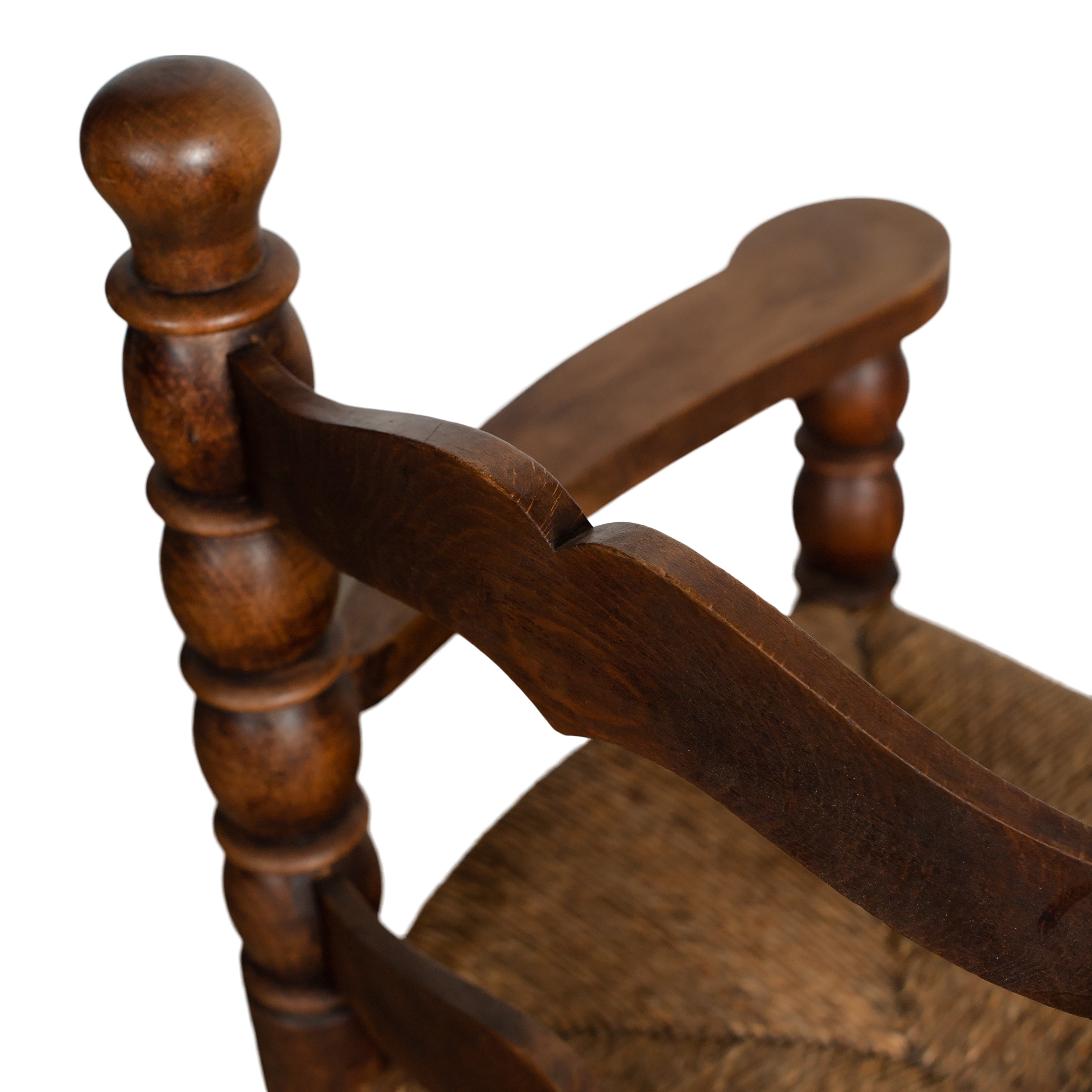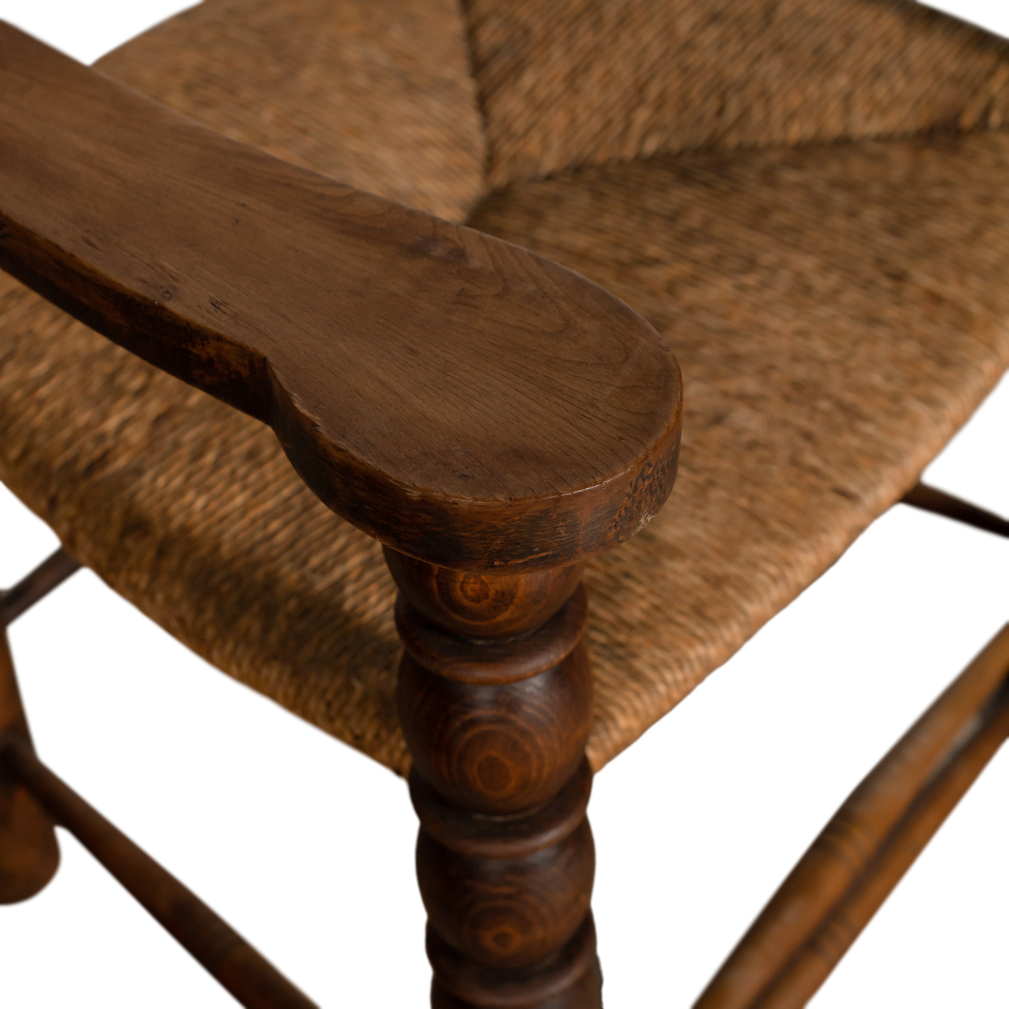 This vintage armchair features a solid wood frame with classic turned detailing throughout and gently curved arms for a sculptural profile. The hand-woven rush seat adds natural texture and contrast against the warm, timeworn wood finish.