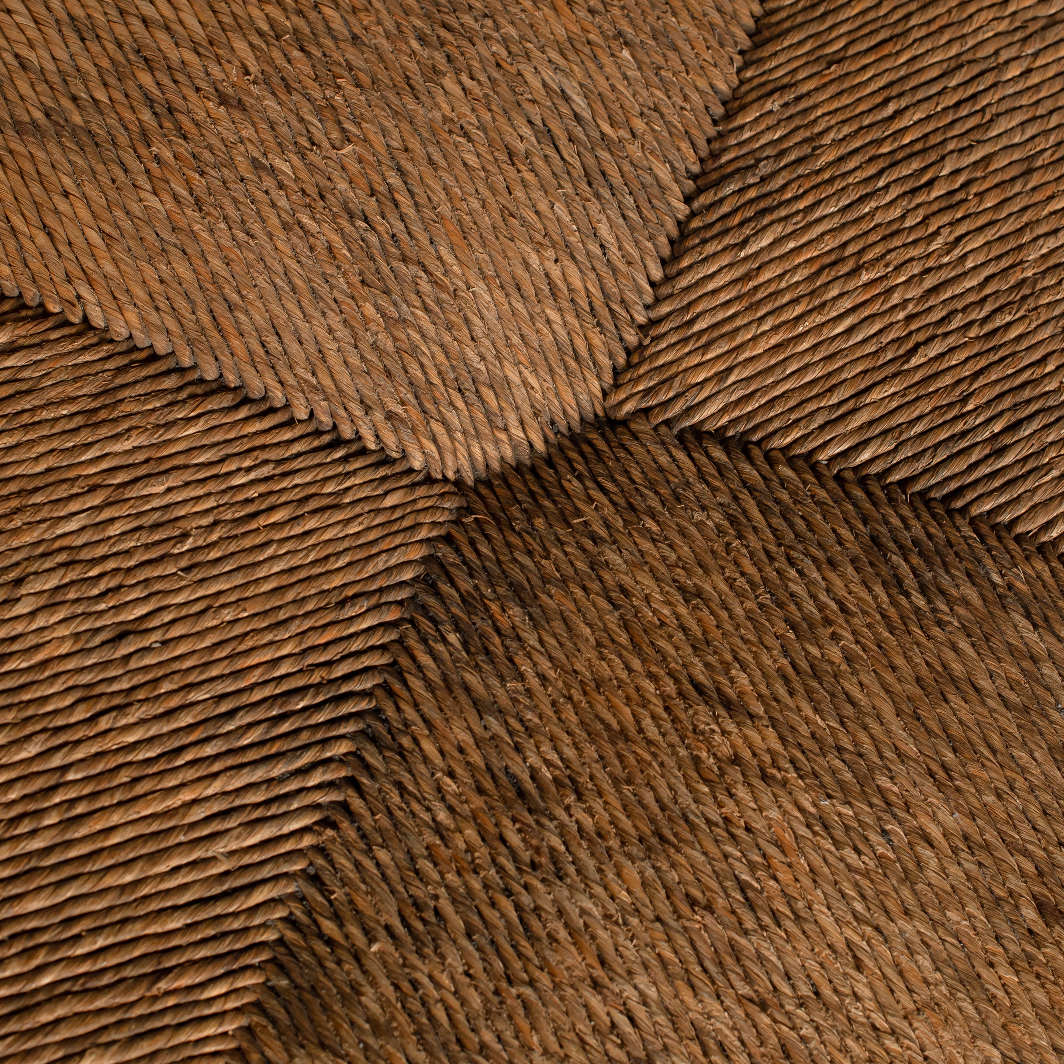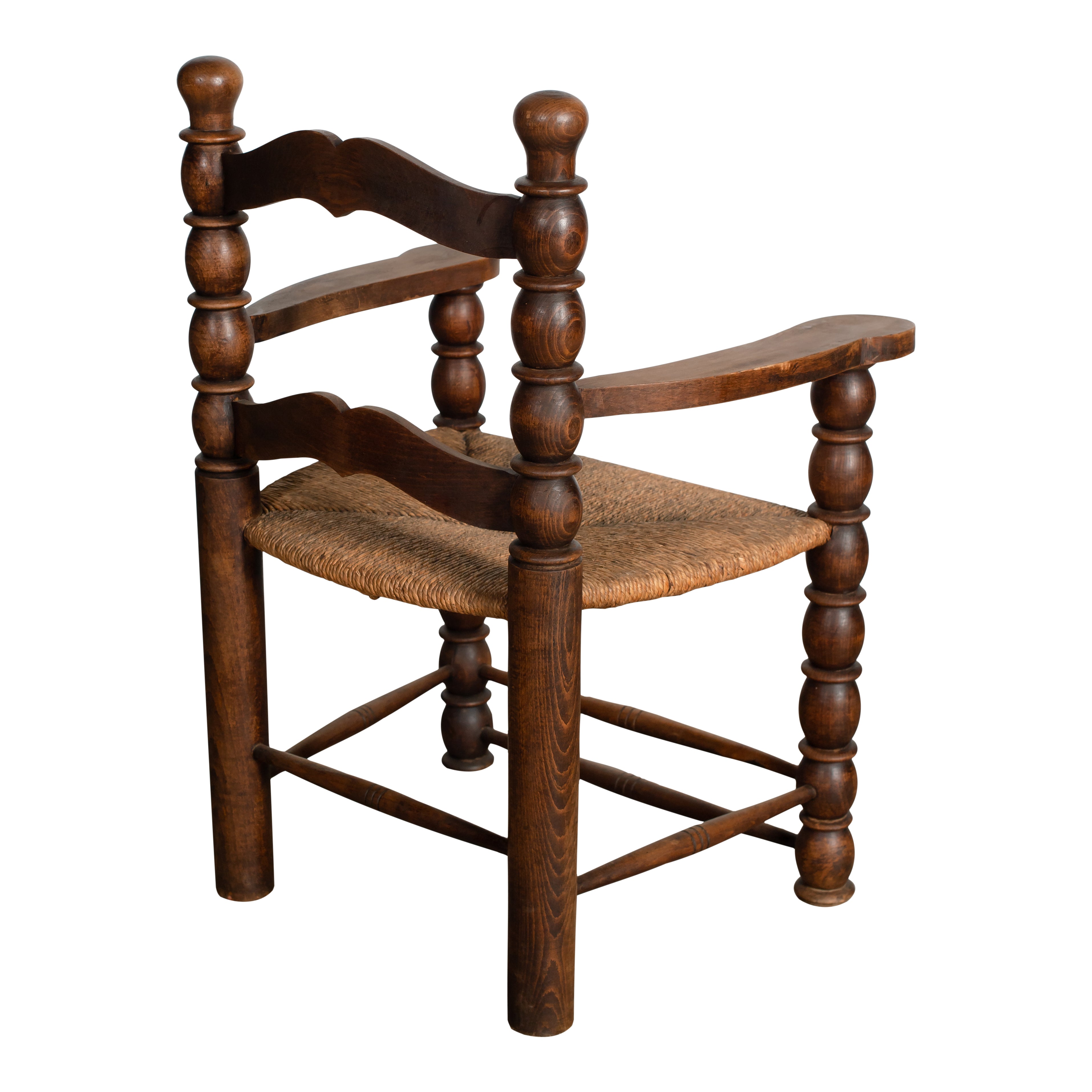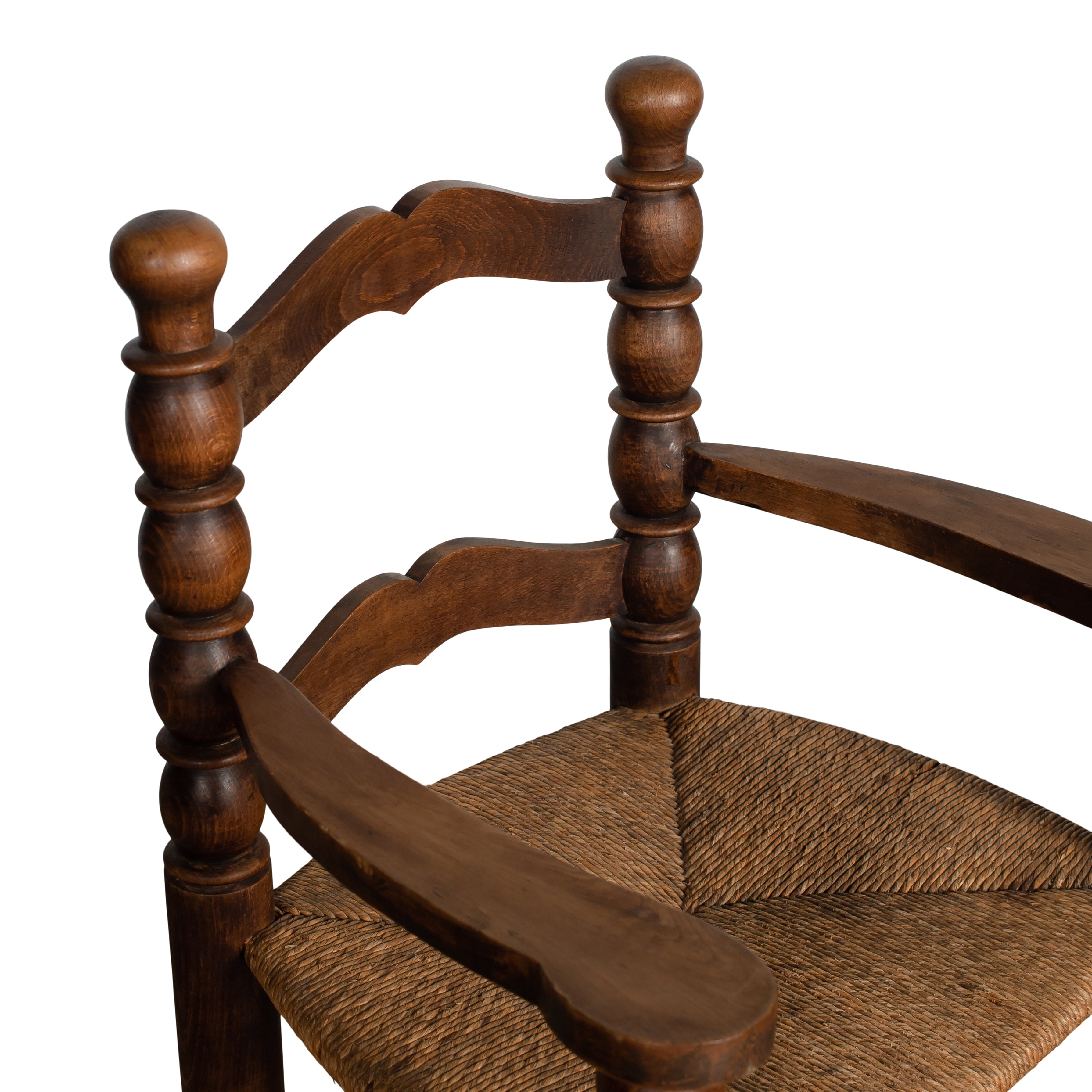 This vintage armchair features a solid wood frame with classic turned detailing throughout and gently curved arms for a sculptural profile. The hand-woven rush seat adds natural texture and contrast against the warm, timeworn wood finish.
