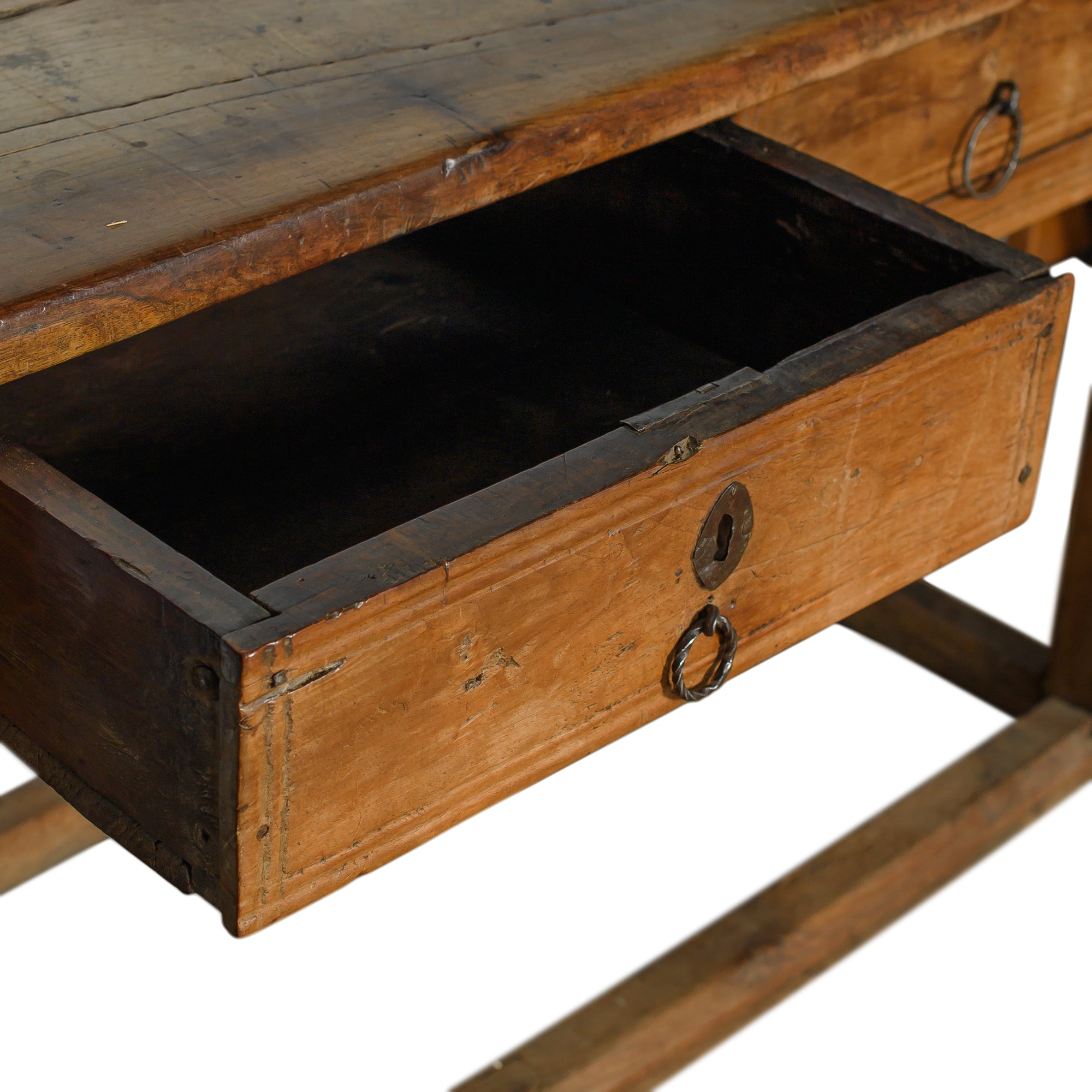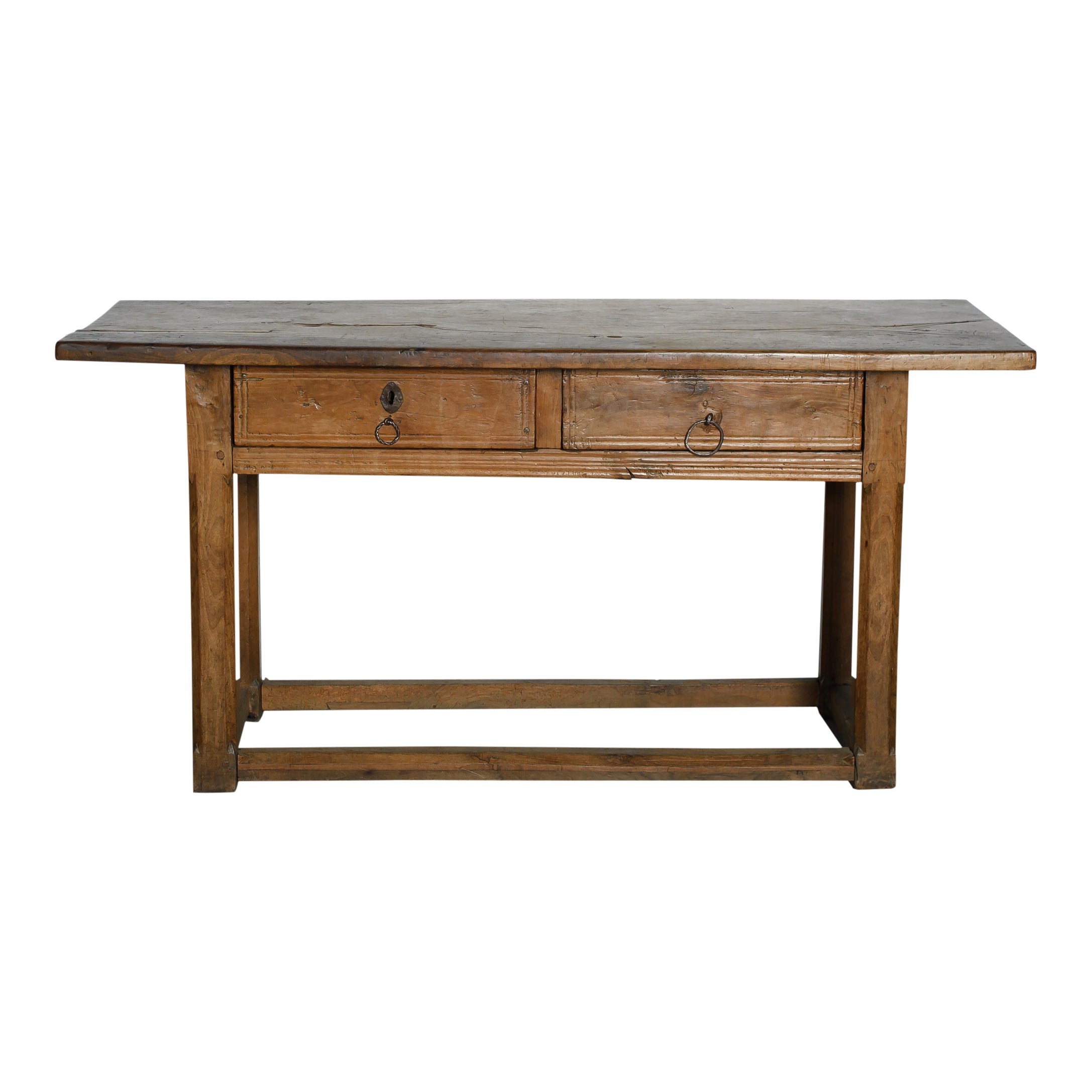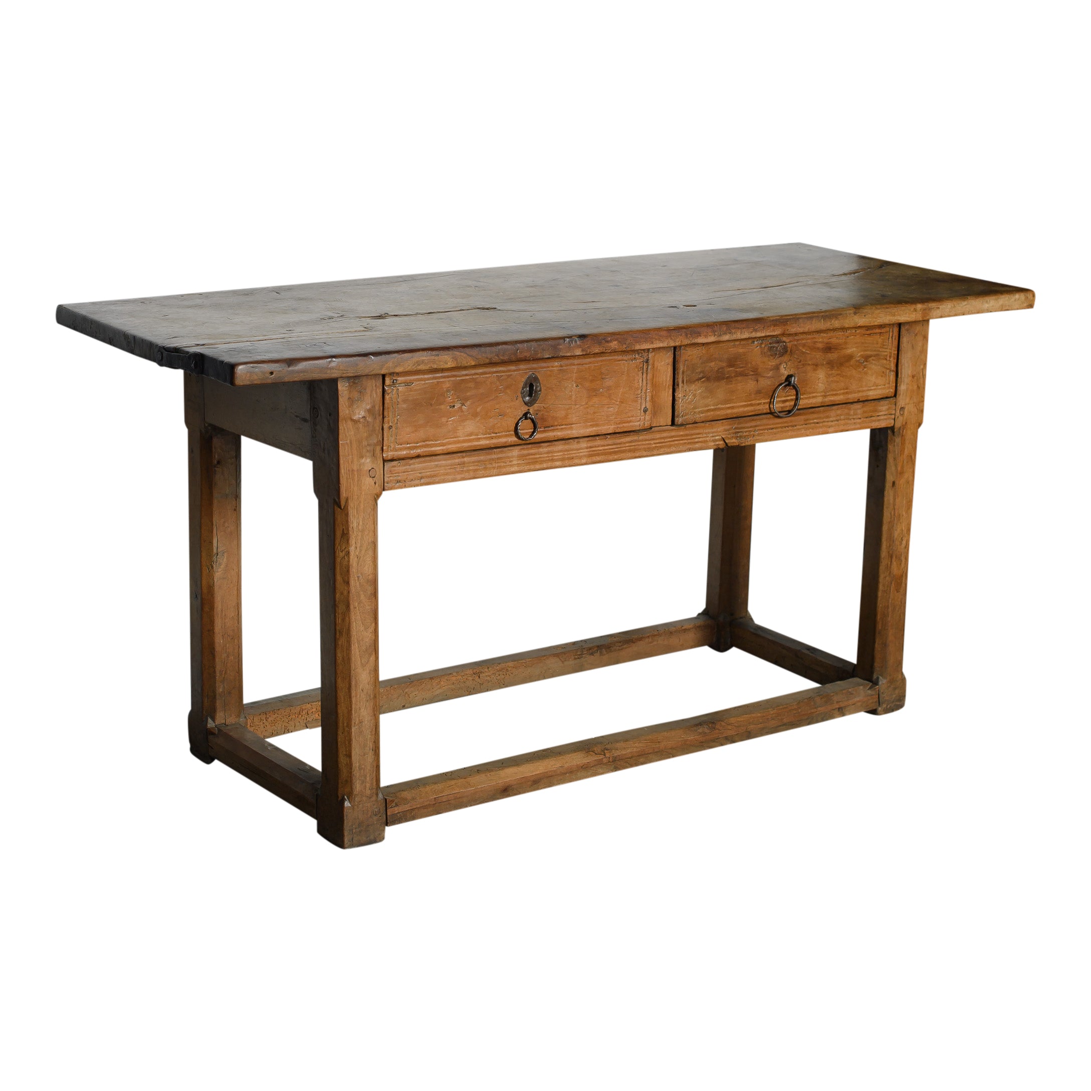 An antique Spanish wood console table with a warm, well-worn surface and a straightforward, utilitarian form. The plank-style top shows natural markings and patina, while two front drawers with original ring pulls add functional storage and visual interest. Solid legs and a lower stretcher give the piece a grounded presence, reflecting its practical origins and enduring craftsmanship.