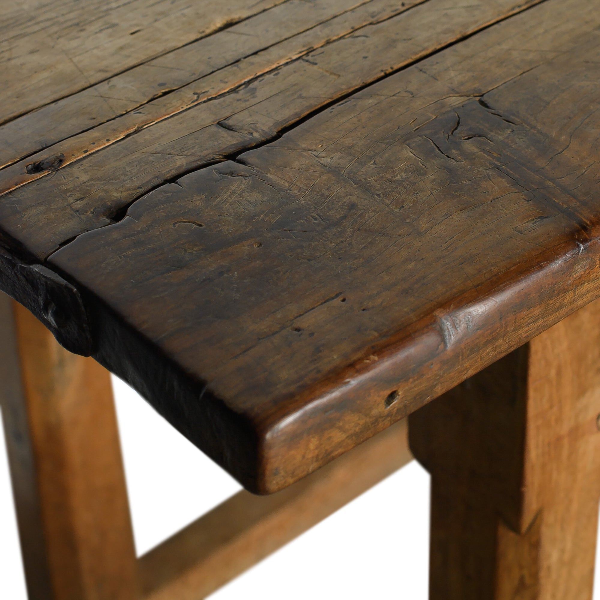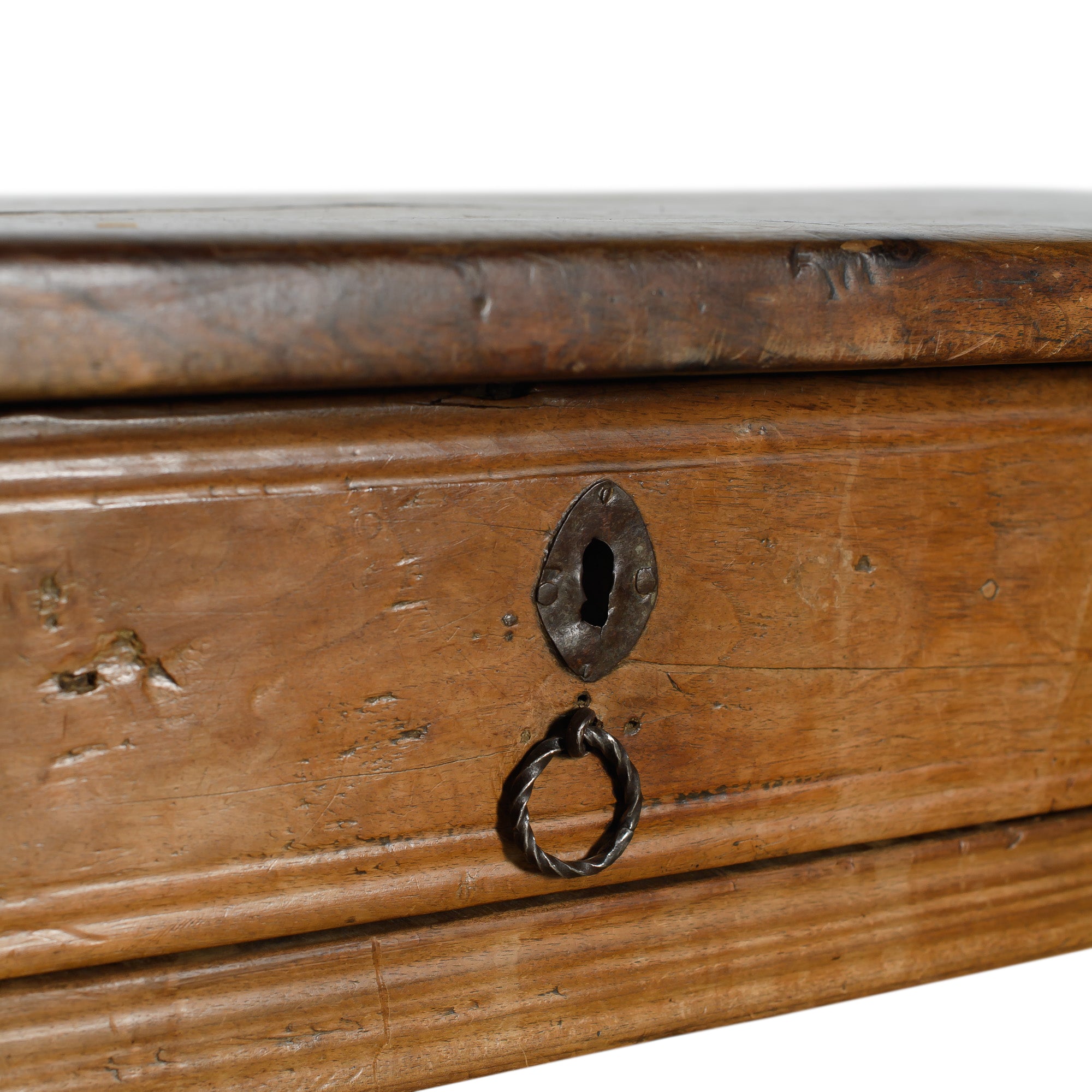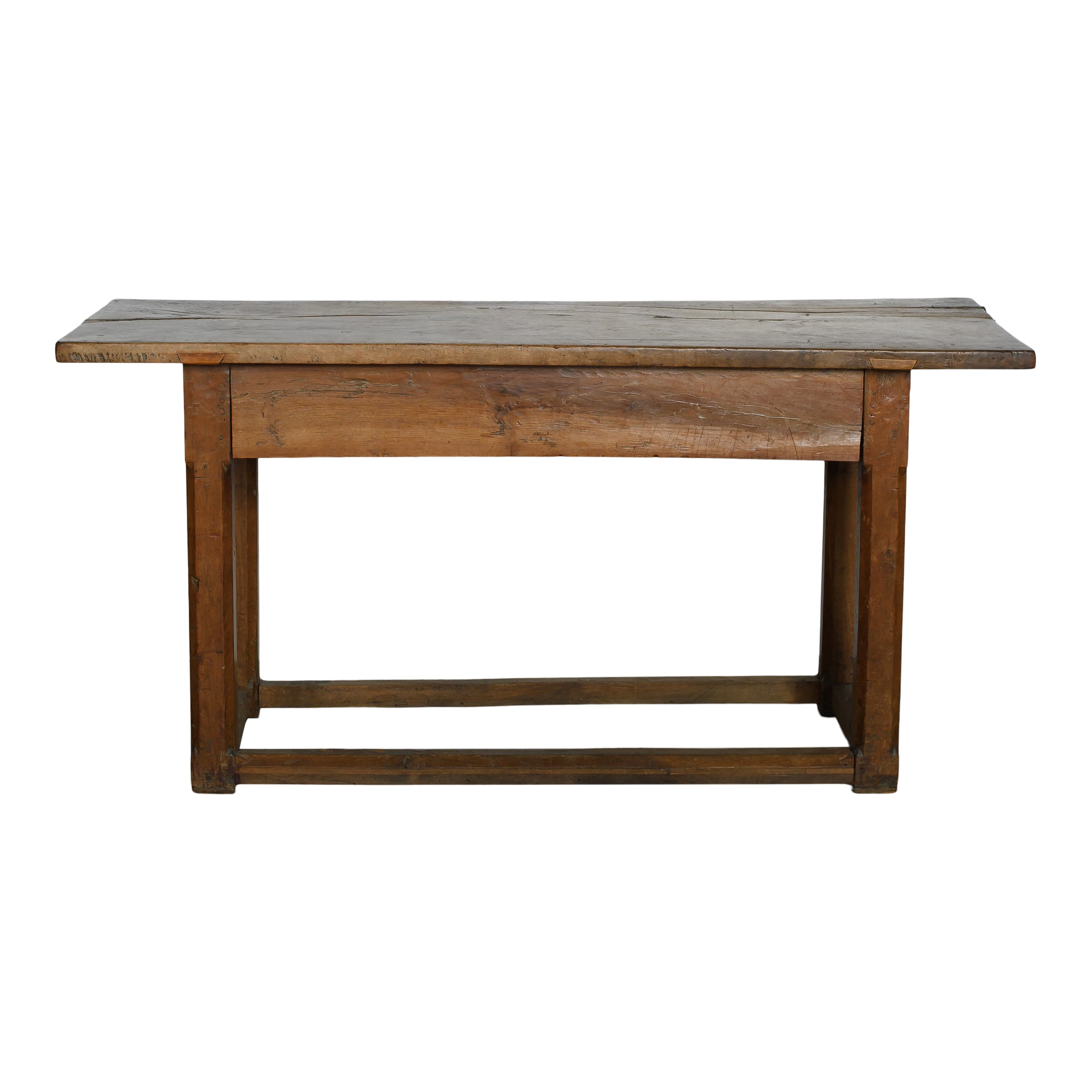 An antique Spanish wood console table with a warm, well-worn surface and a straightforward, utilitarian form. The plank-style top shows natural markings and patina, while two front drawers with original ring pulls add functional storage and visual interest. Solid legs and a lower stretcher give the piece a grounded presence, reflecting its practical origins and enduring craftsmanship.