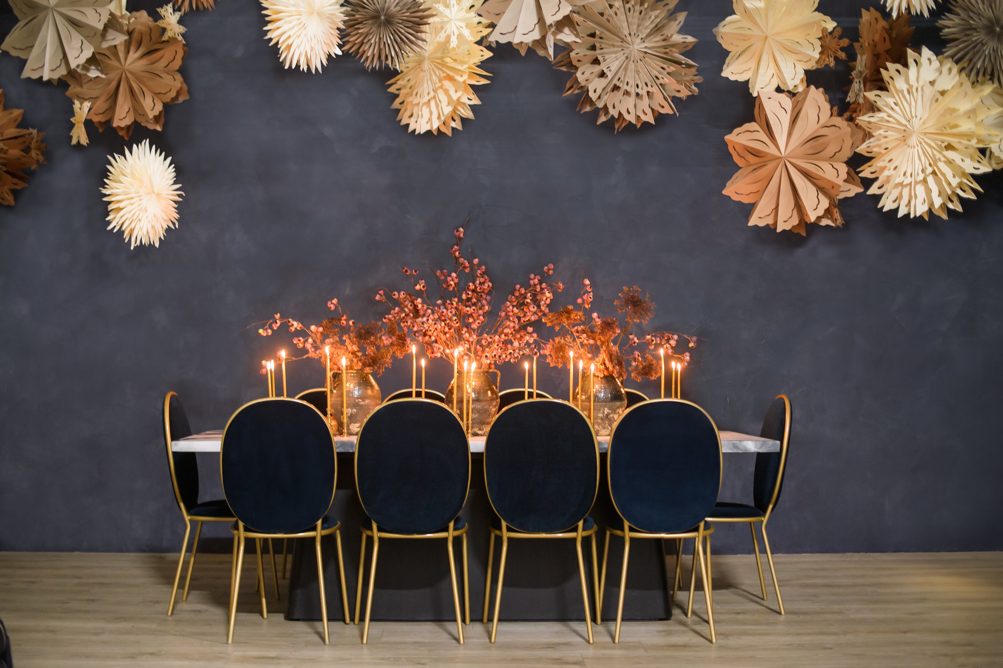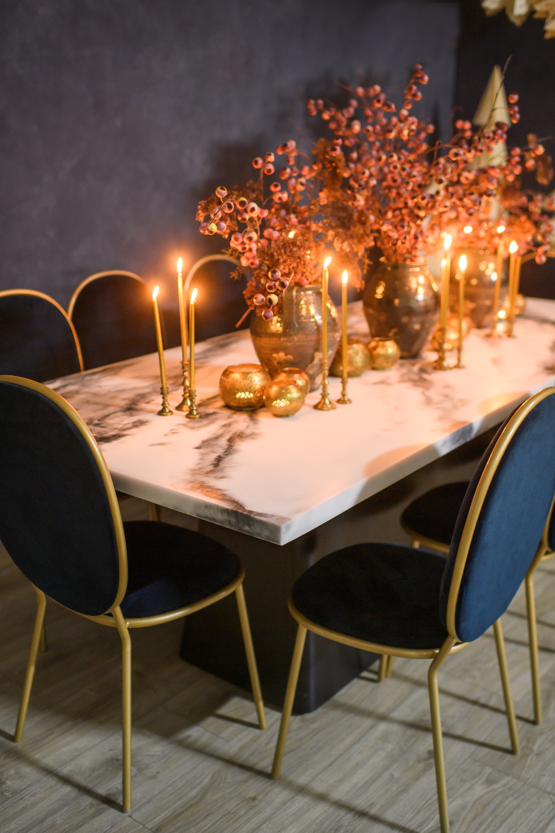 The Avalon Marbled Table makes a bold statement with its striking contrast of textures and tones. A sleek faux marble top rests on a deep black tapered base, creating a sculptural foundation for dining or display settings. Its clean lines and modern profile make it a versatile piece for contemporary gatherings or monochrome-inspired designs.