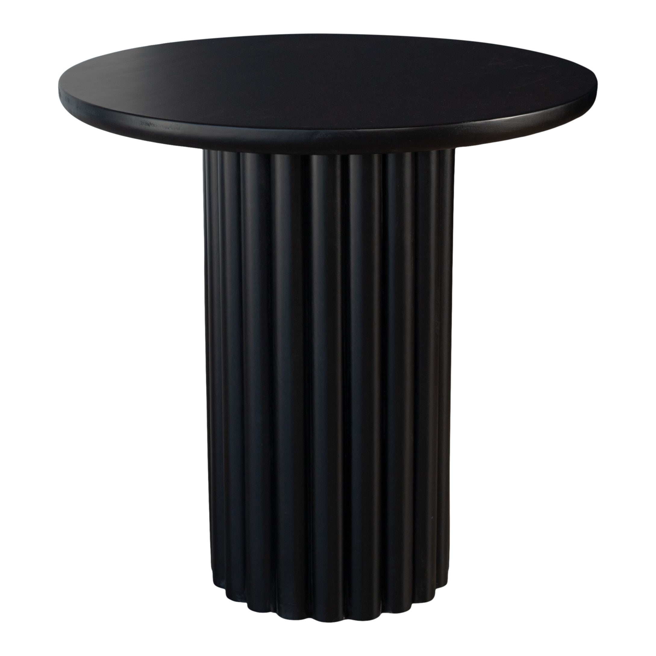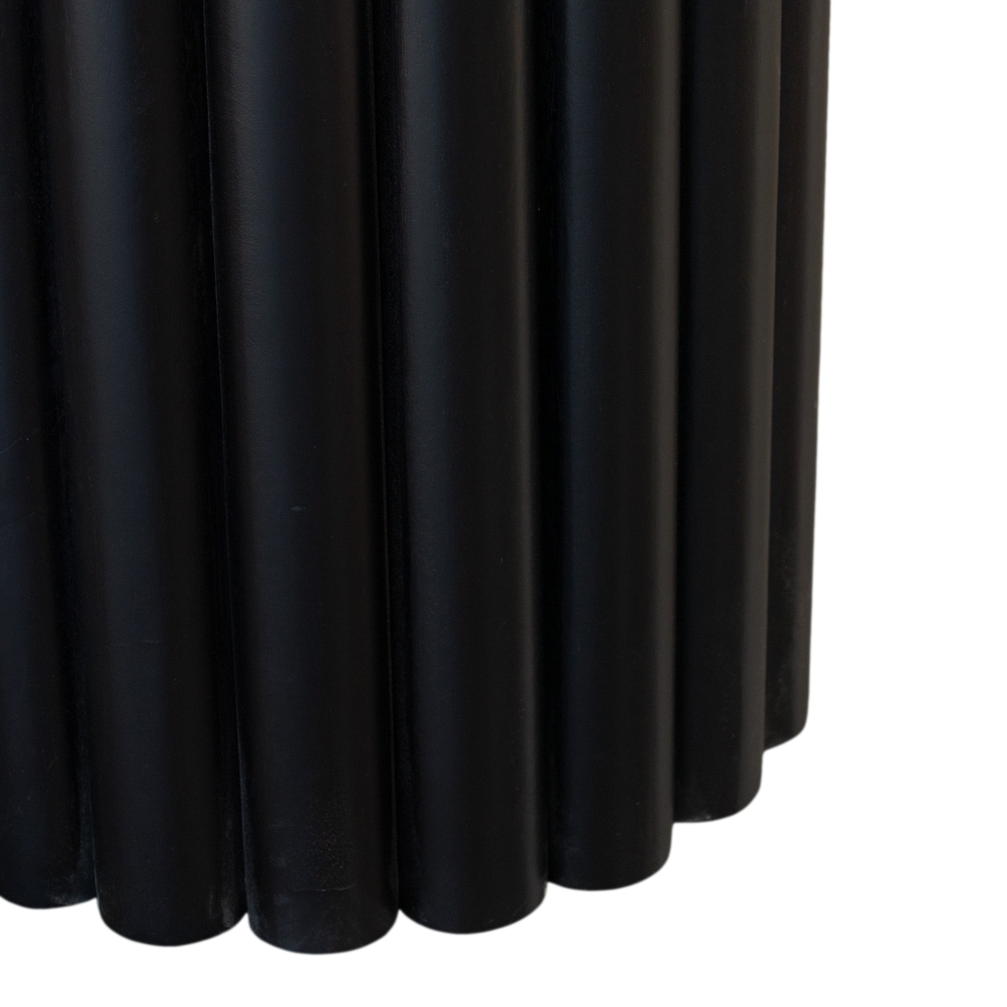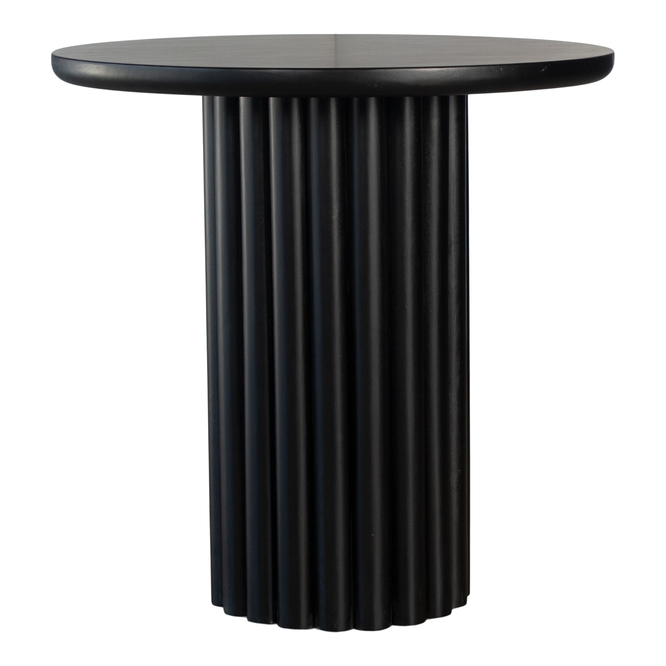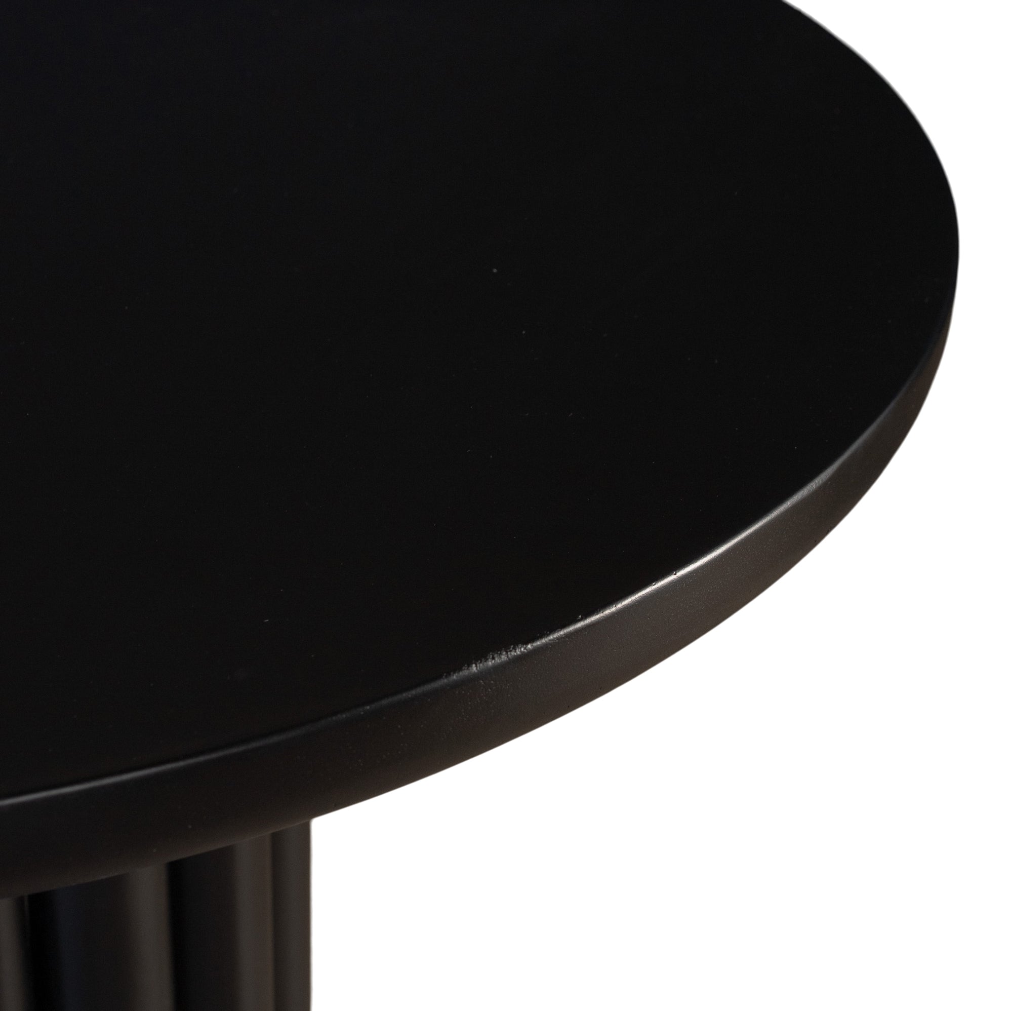 The Cadence Counter Table features a sleek black wood top paired with a pedestal ribbed base. Its clean lines and modern profile make it a standout piece for contemporary setups.