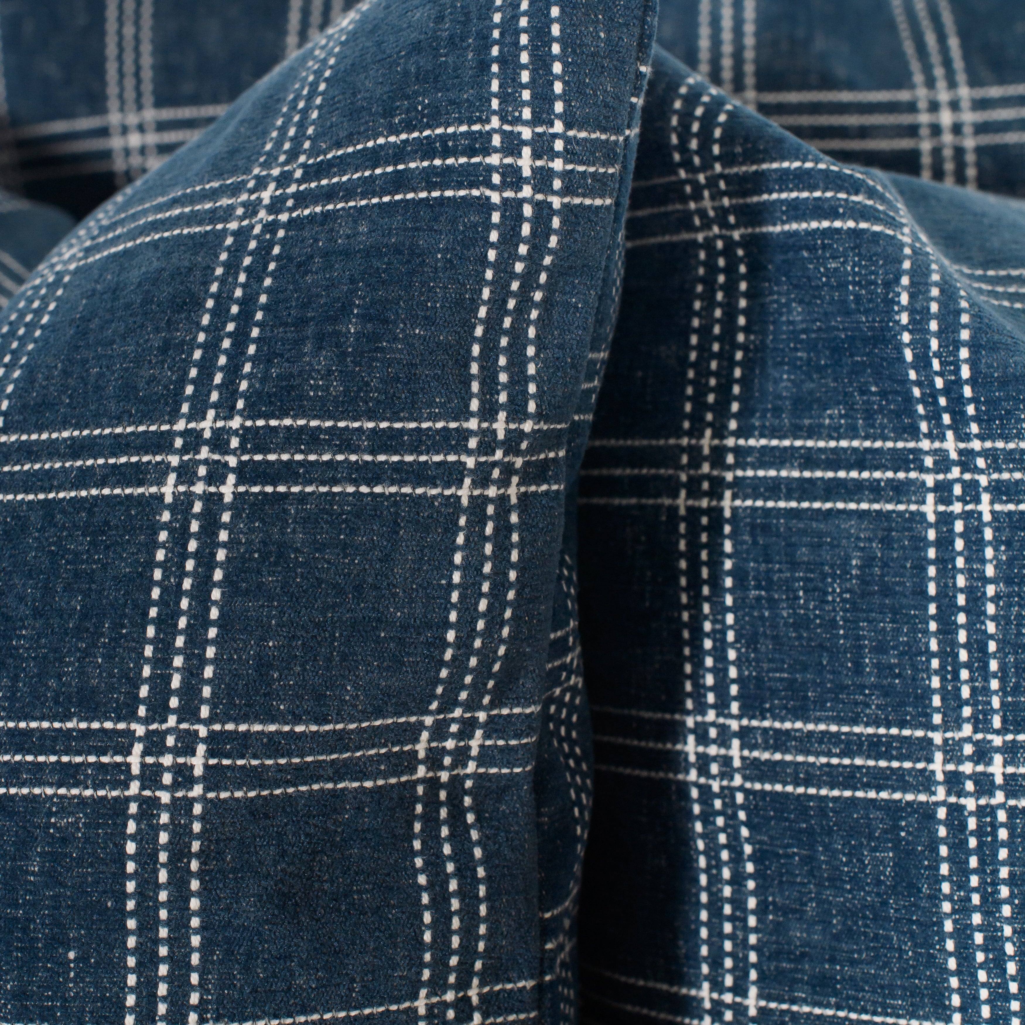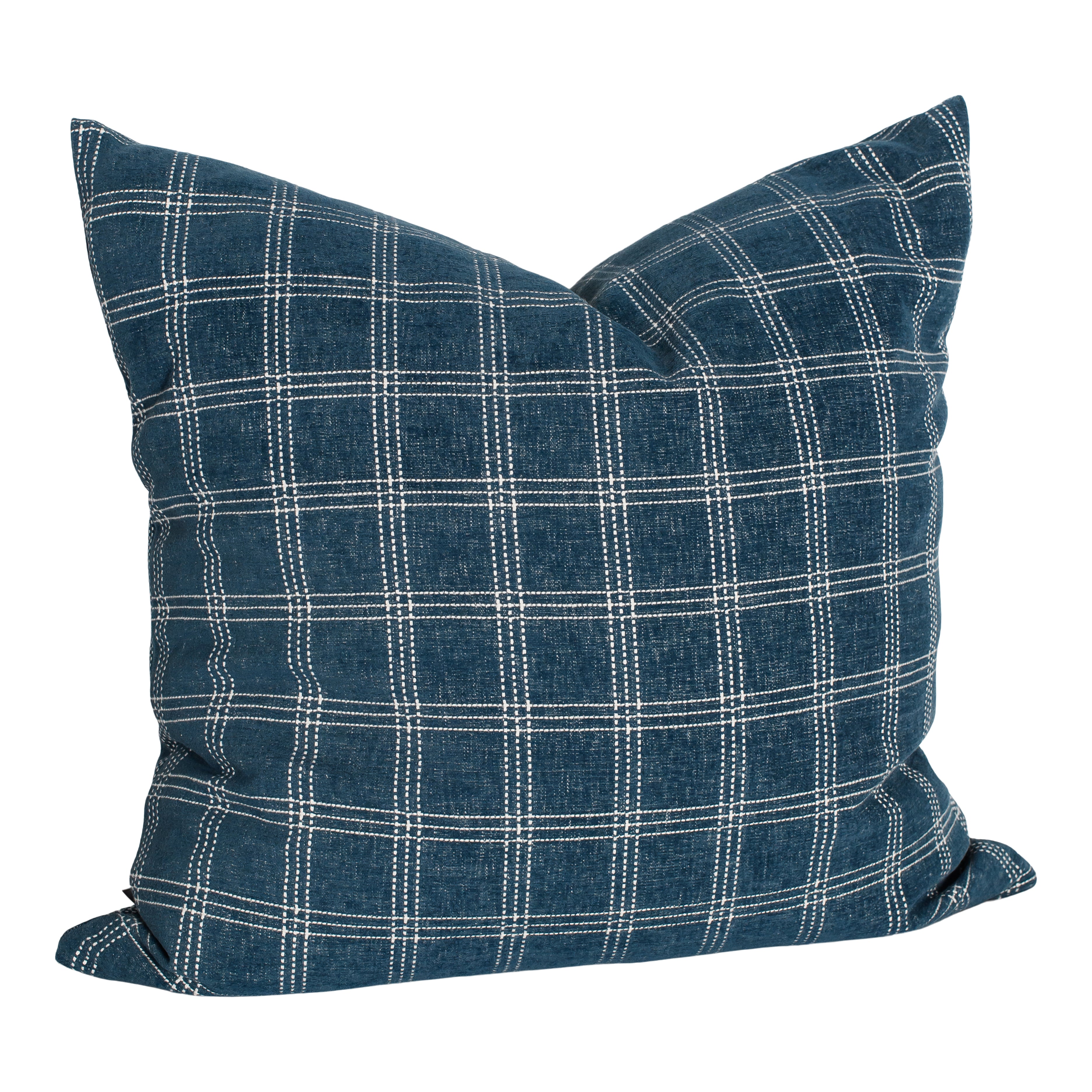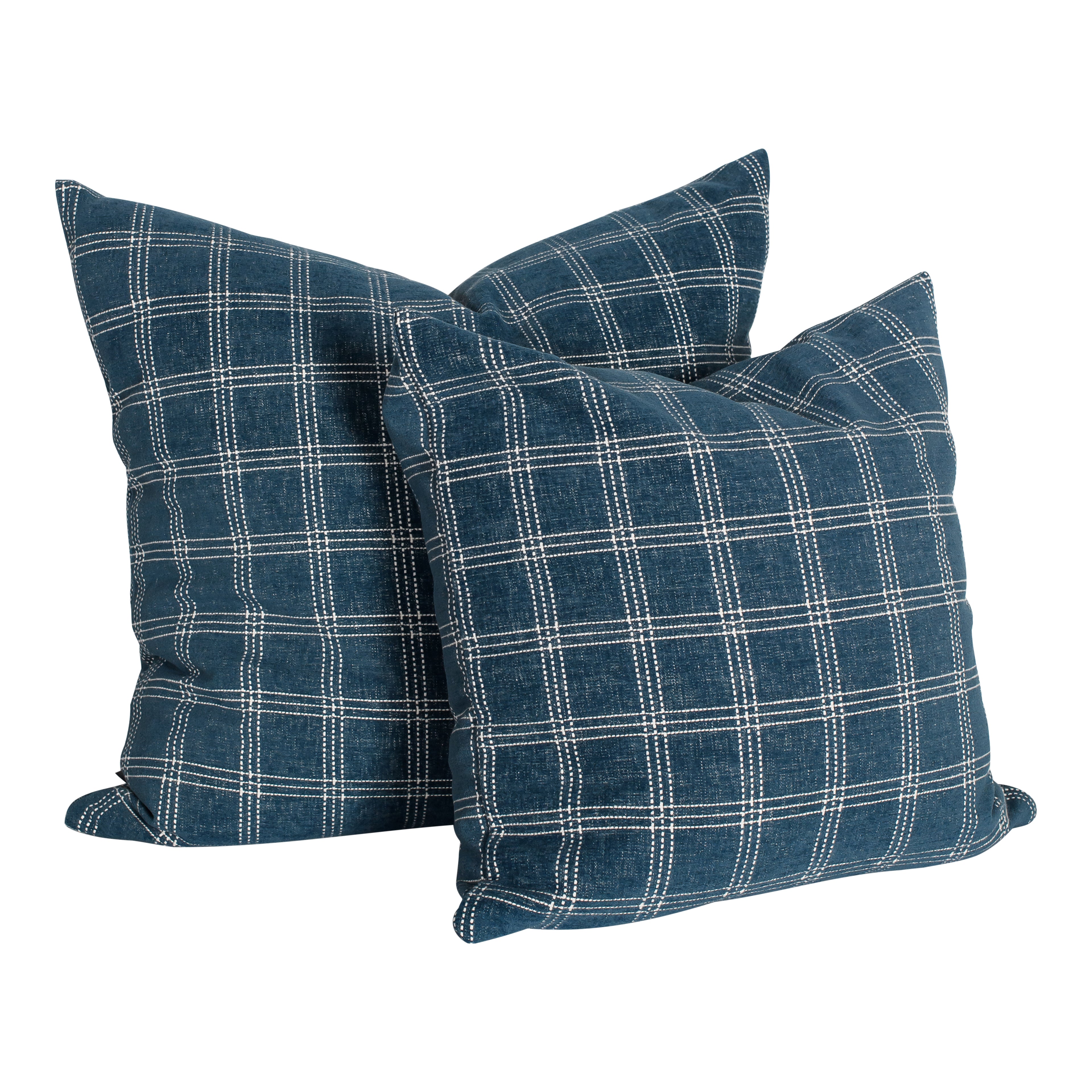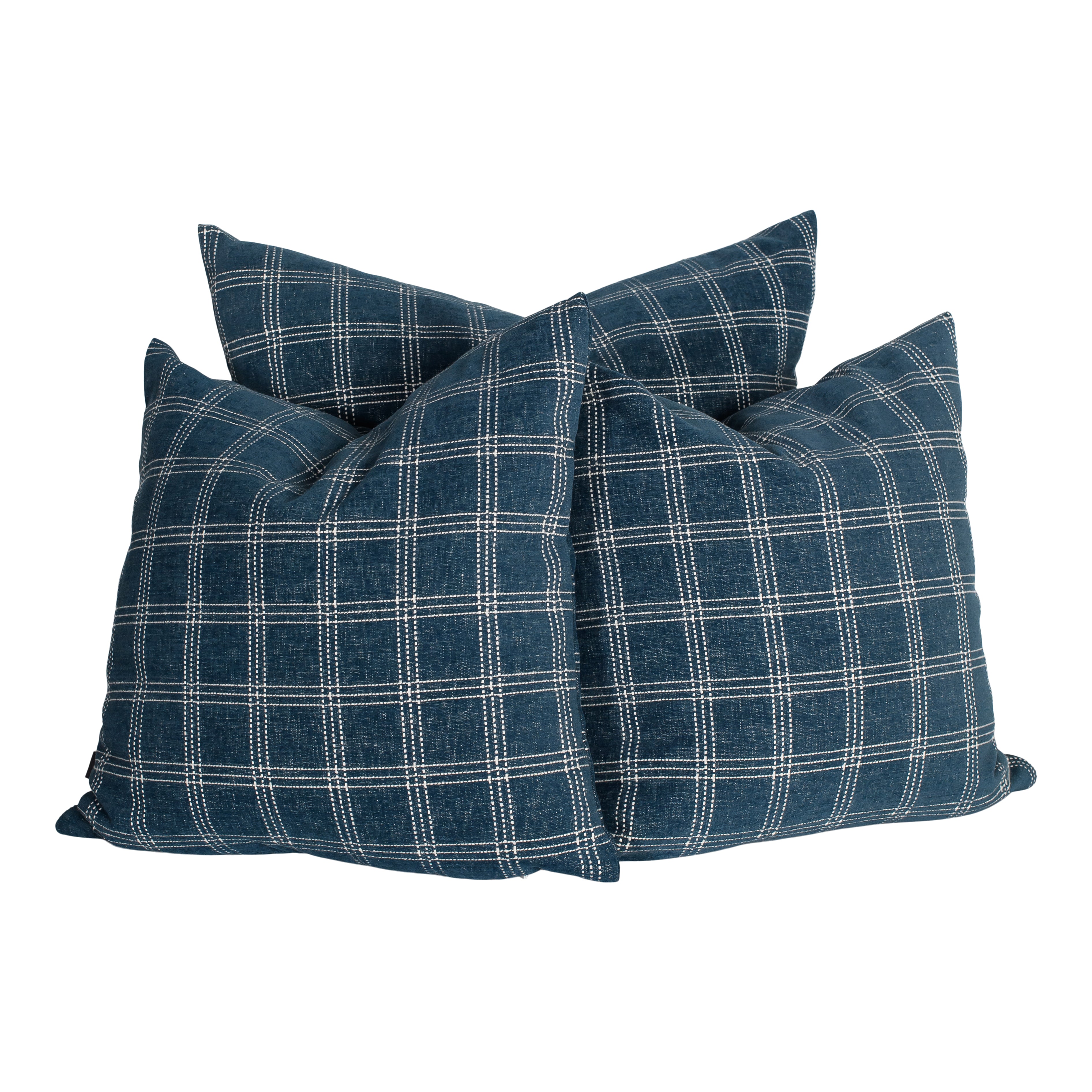 The Junia Plaid Pillows feature a classic navy and white grid pattern on soft woven fabric, offering a timeless look with a tailored edge. Their structured design makes them ideal for layering with solids, textures, or vintage prints. Rented as a set of 3, these pillows bring a polished, versatile accent to any lounge vignette.