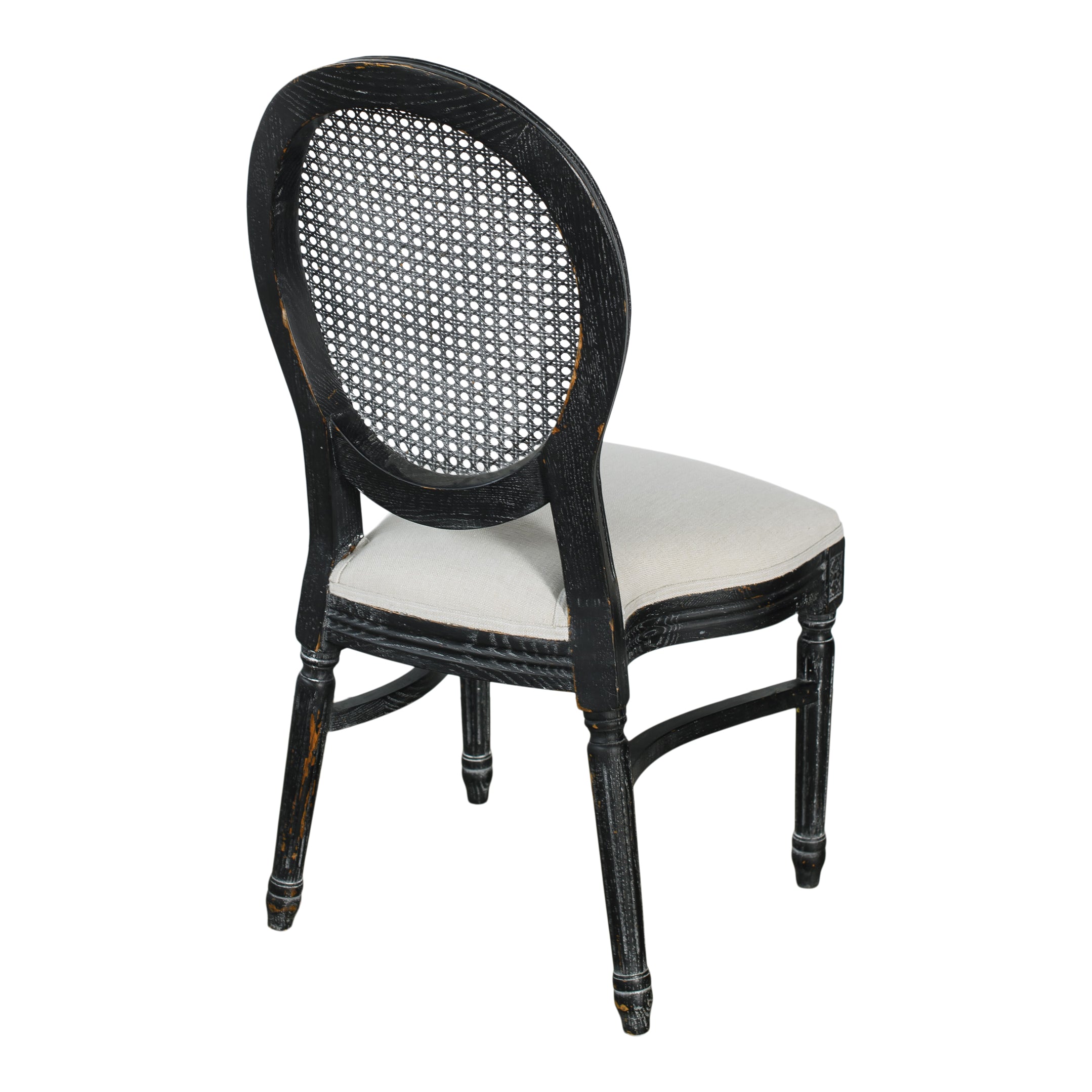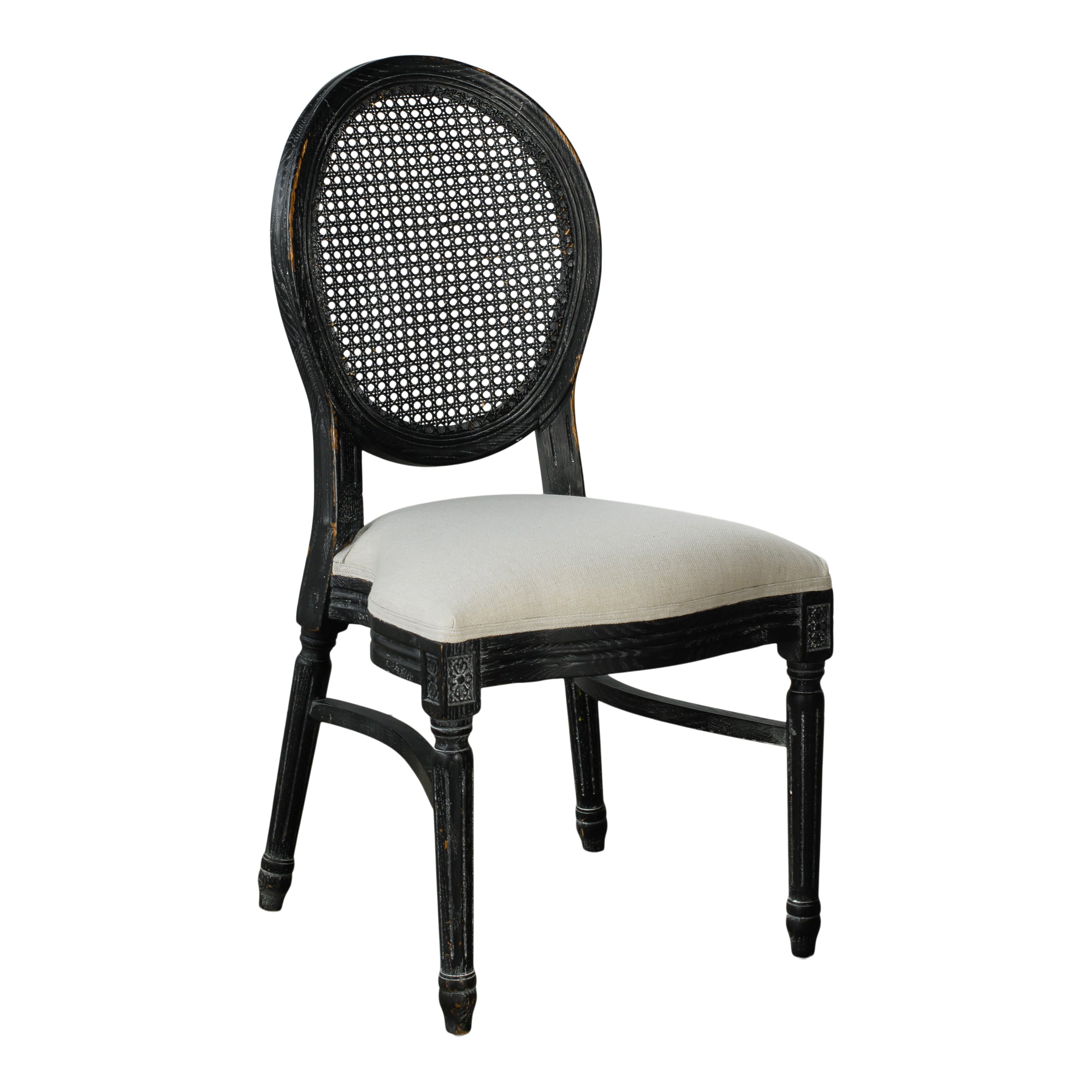 Black cane back dining chair with a flax linen upholstered seat. Beautiful seating at any large event or wedding. Seat height: 19" Dimensions: 19.5 x 17 x 38.25