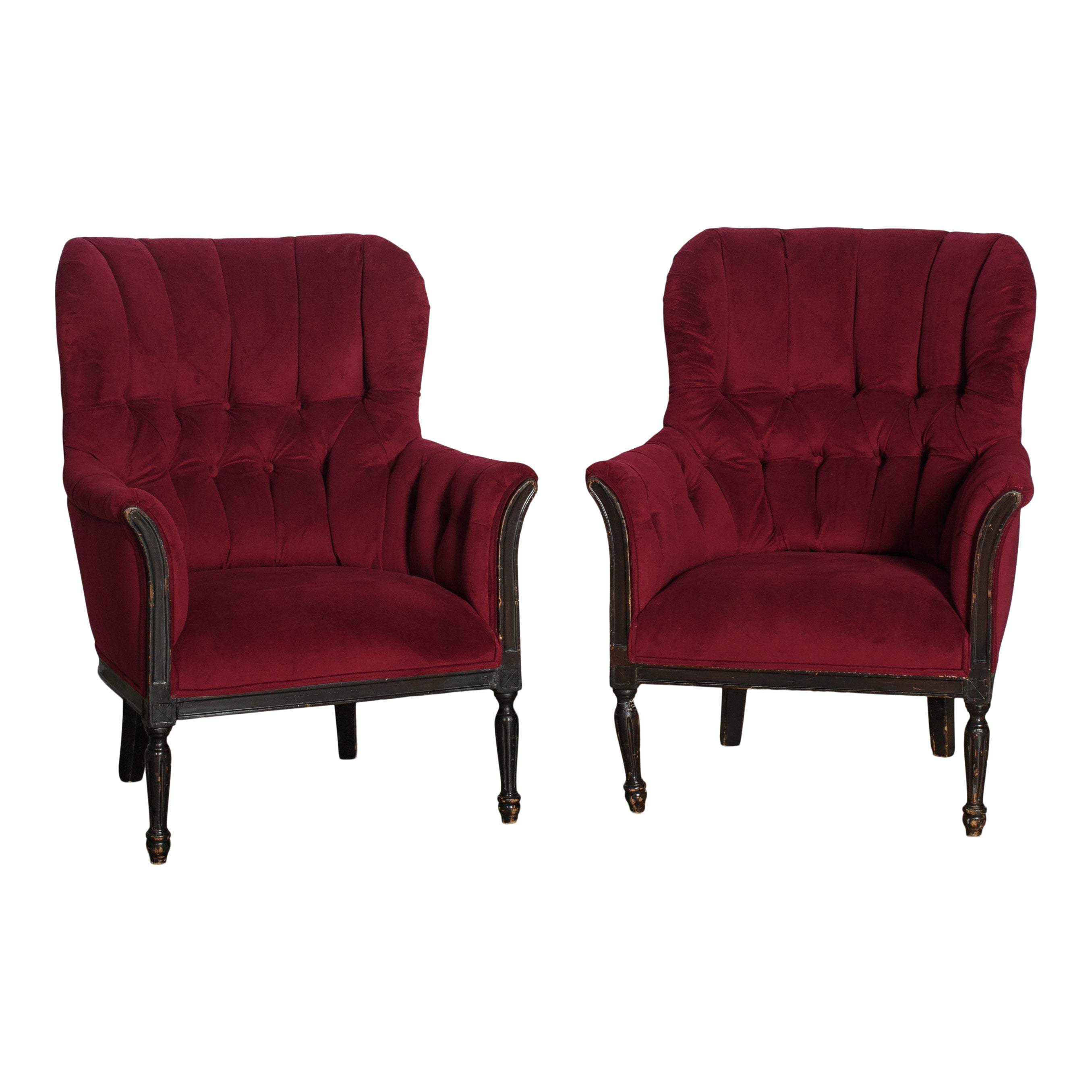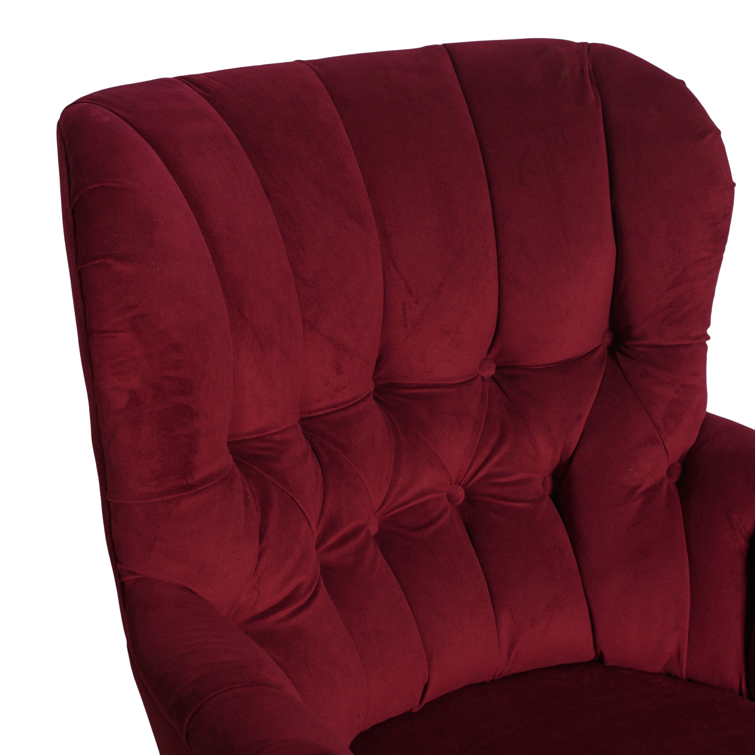 Tufted red velvet wingback chair. A luscious and moody seating addition perfect for any wedding or large event. Dimensions: 30 x 26 x 39