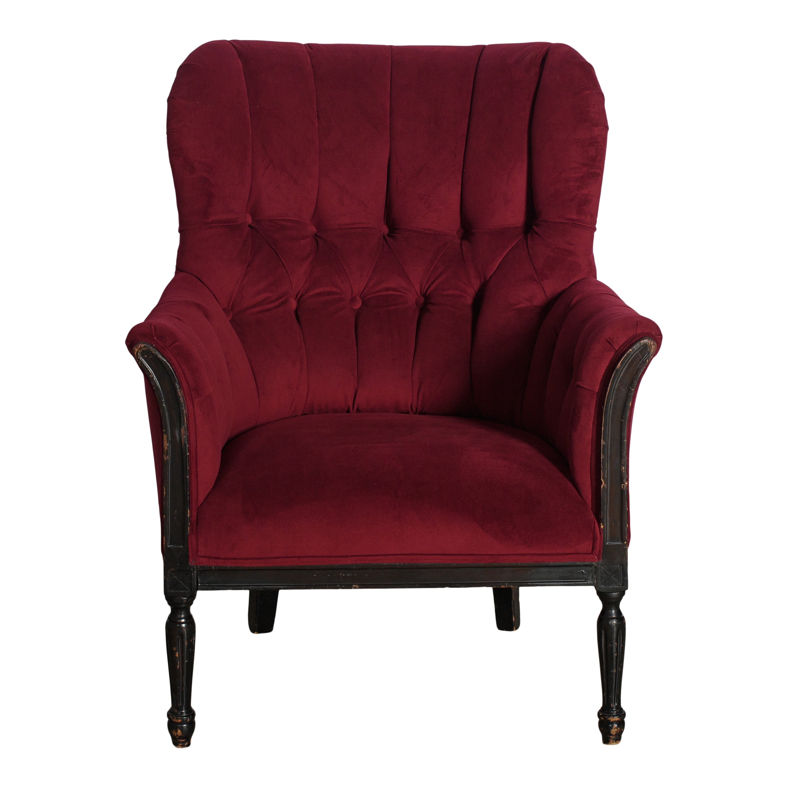 Tufted red velvet wingback chair. A luscious and moody seating addition perfect for any wedding or large event.