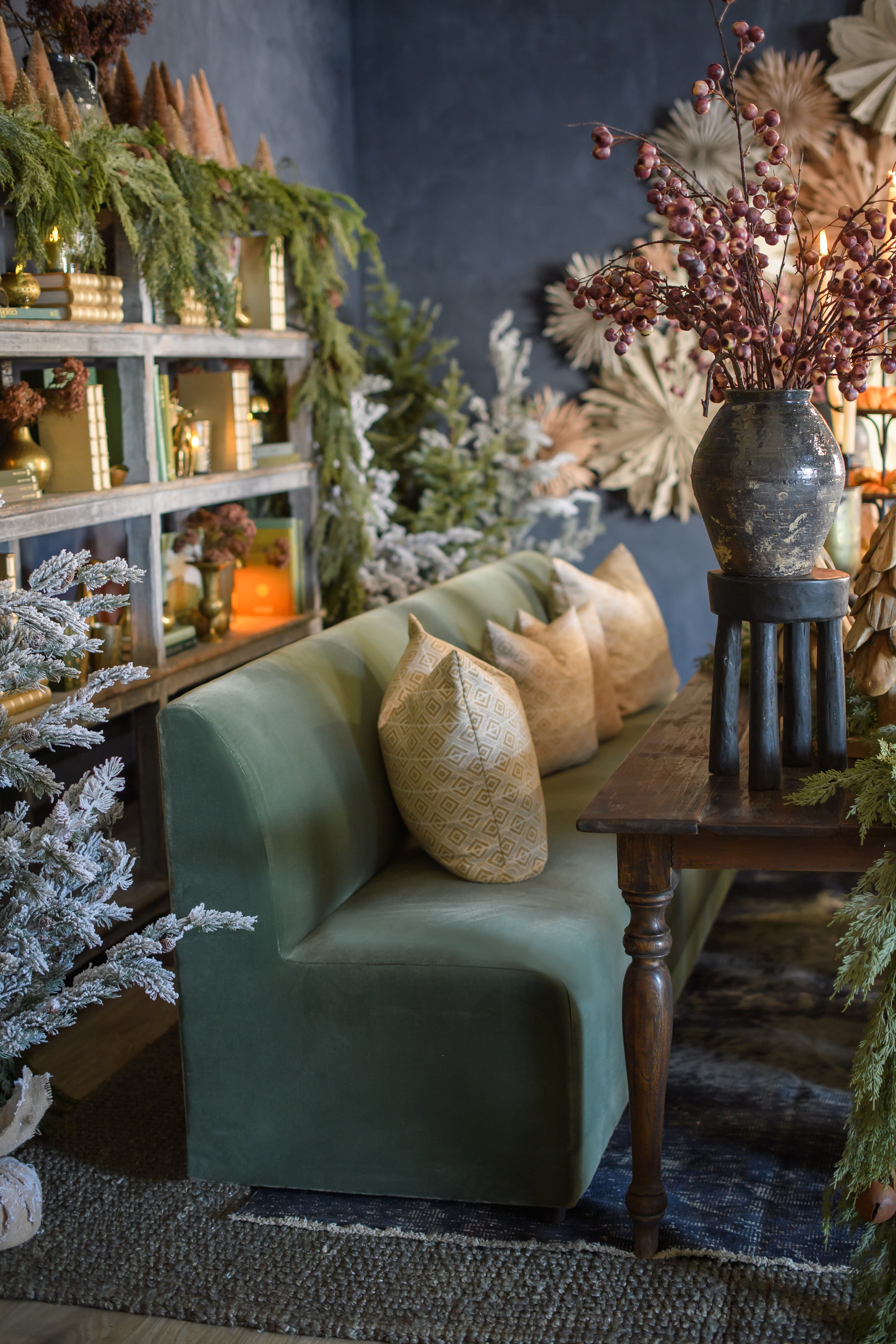 Add a pop of color and style with our custom Lucy Green Banquette Couch. Its rich velvet upholstery will spice up any dining or lounge design. Seat height: 20" Made by Found Dimensions: 108 x 27.5 x 36