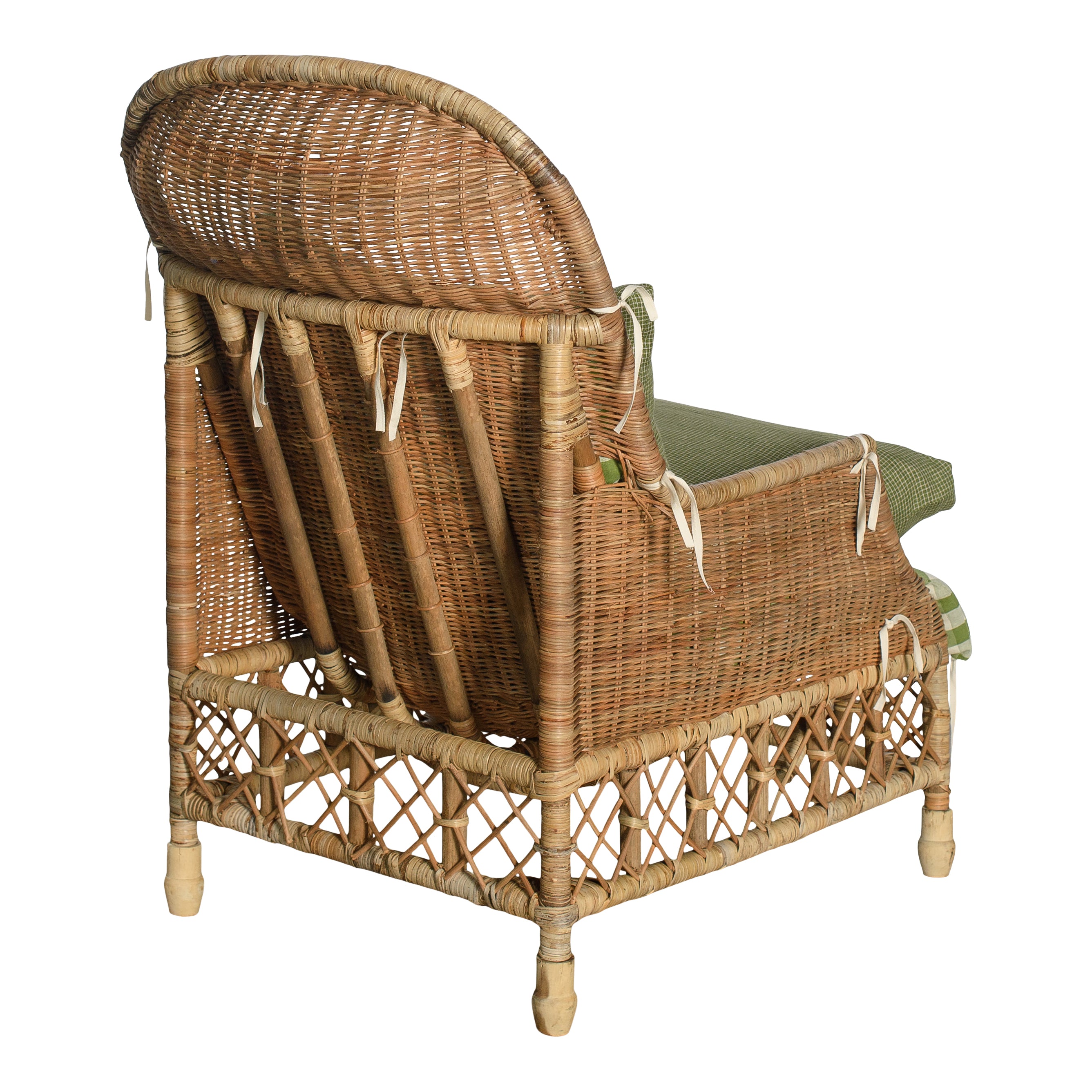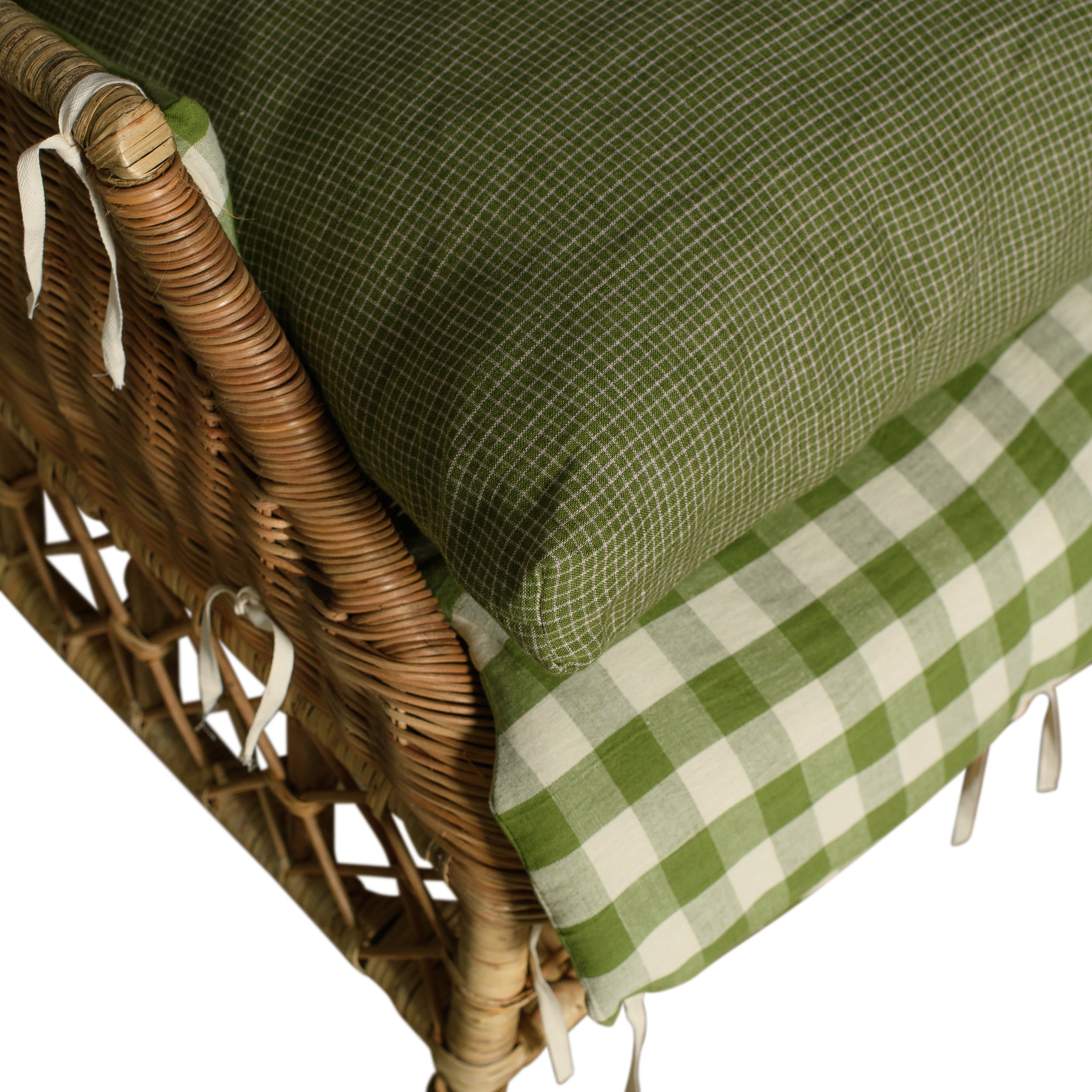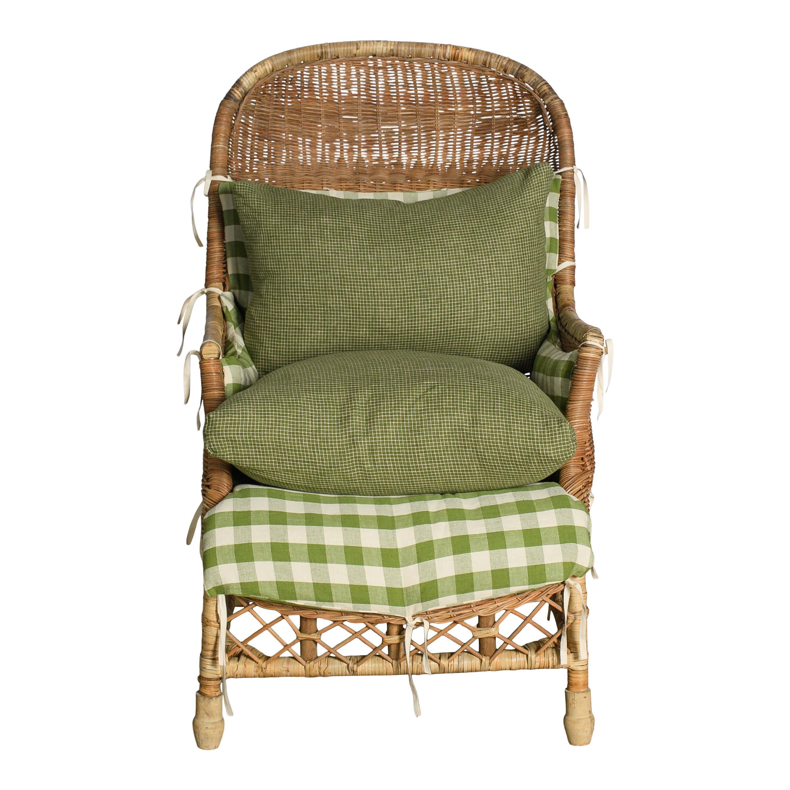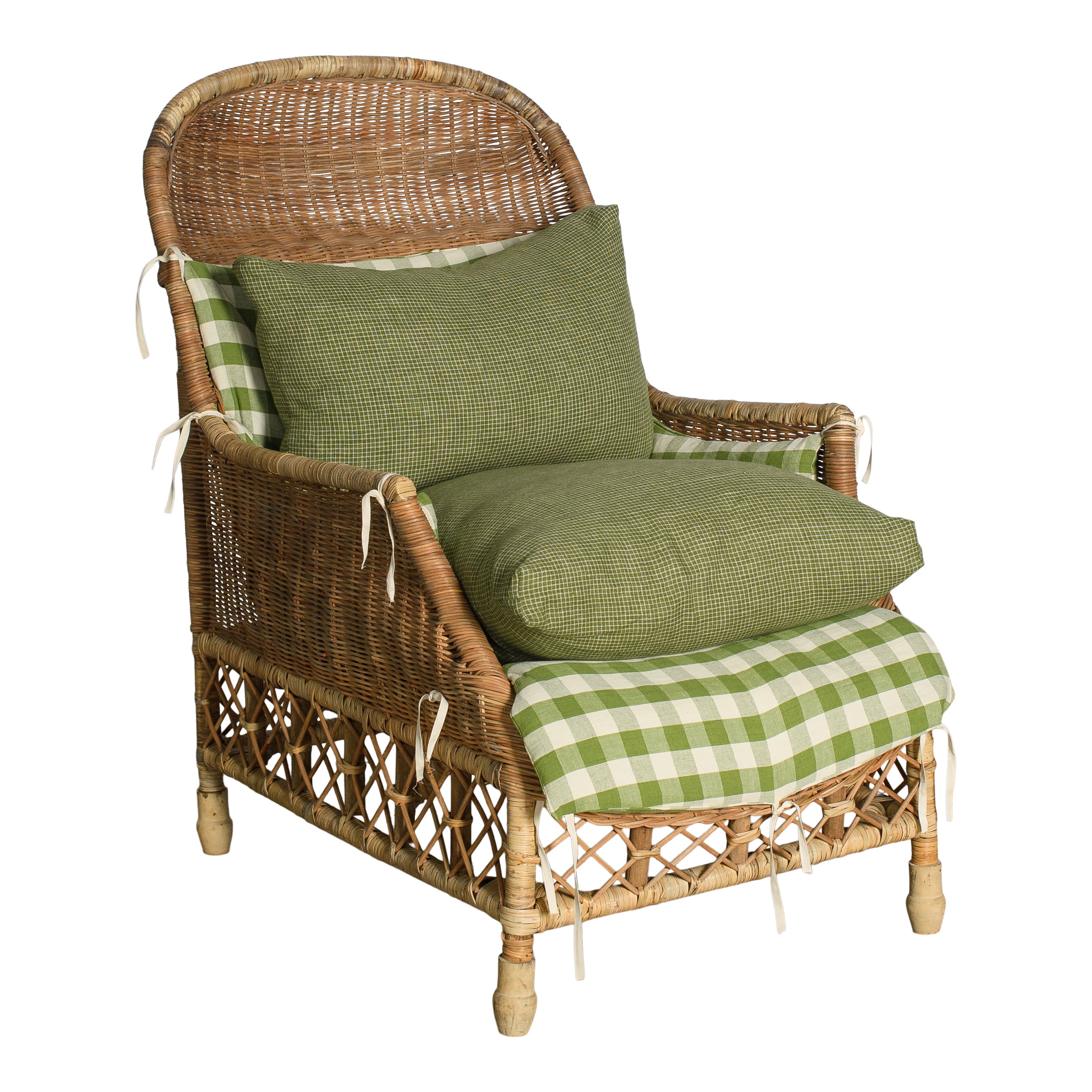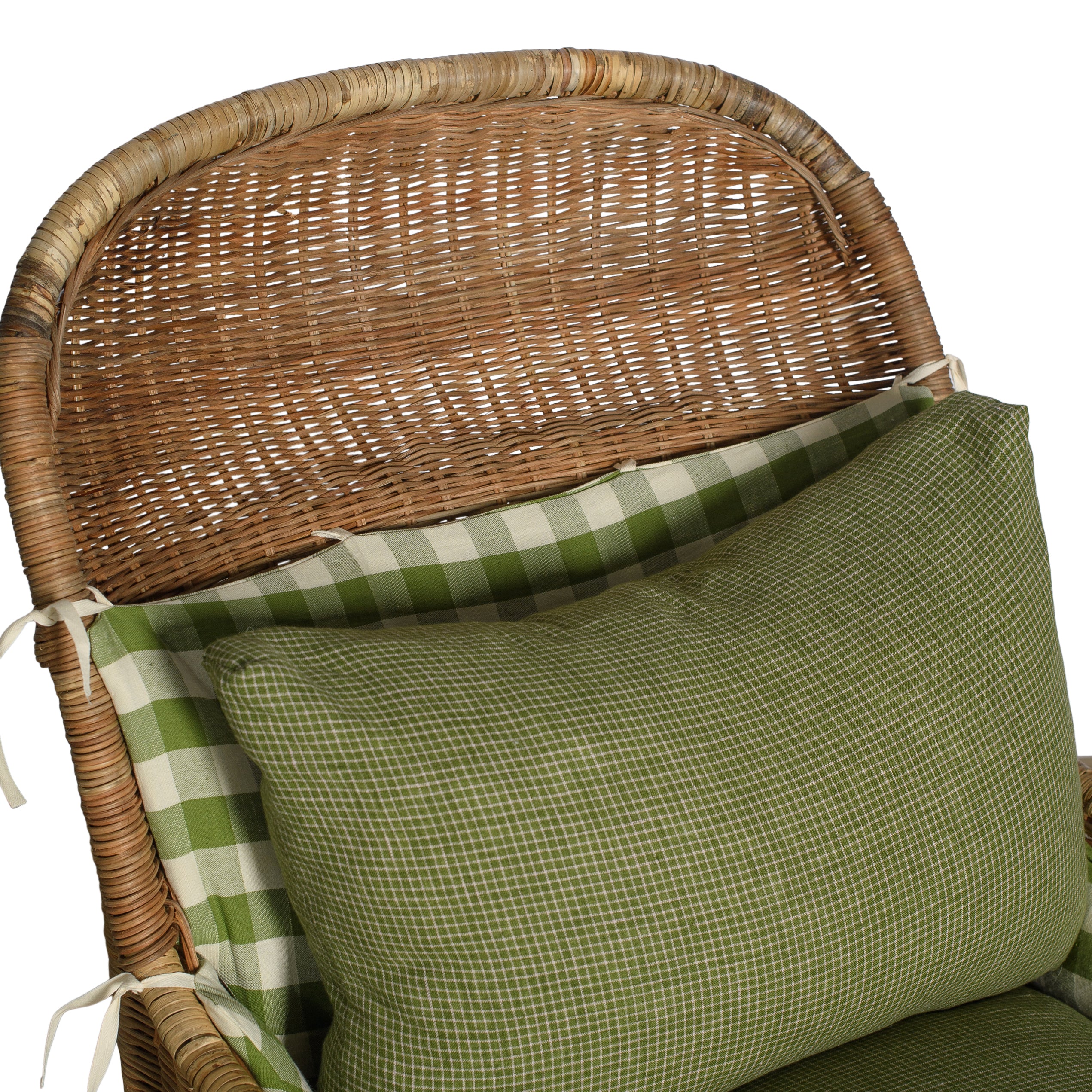 A woven rattan lounge chair featuring a curved back and open lattice base. It's paired with plush green micro-check and gingham cushions for a relaxed, inviting feel.