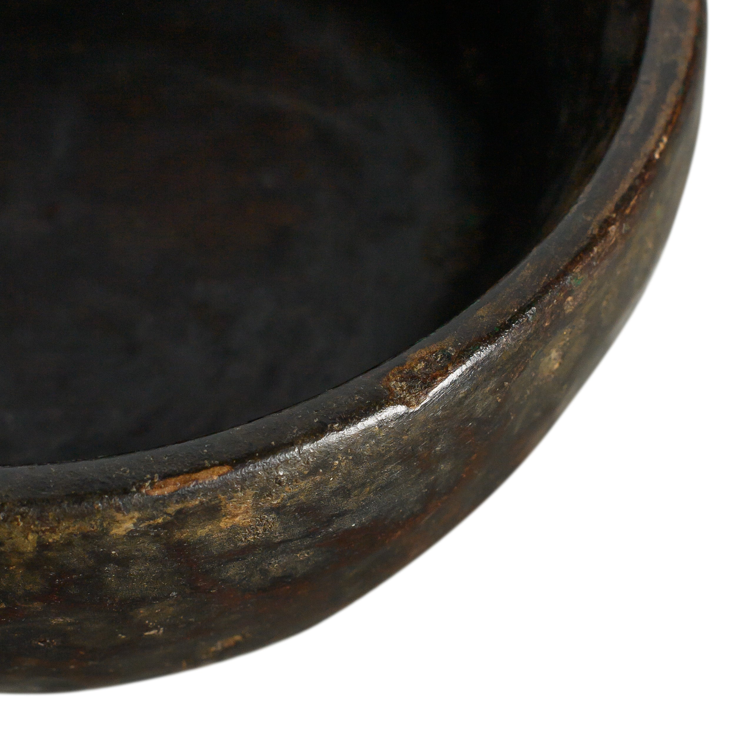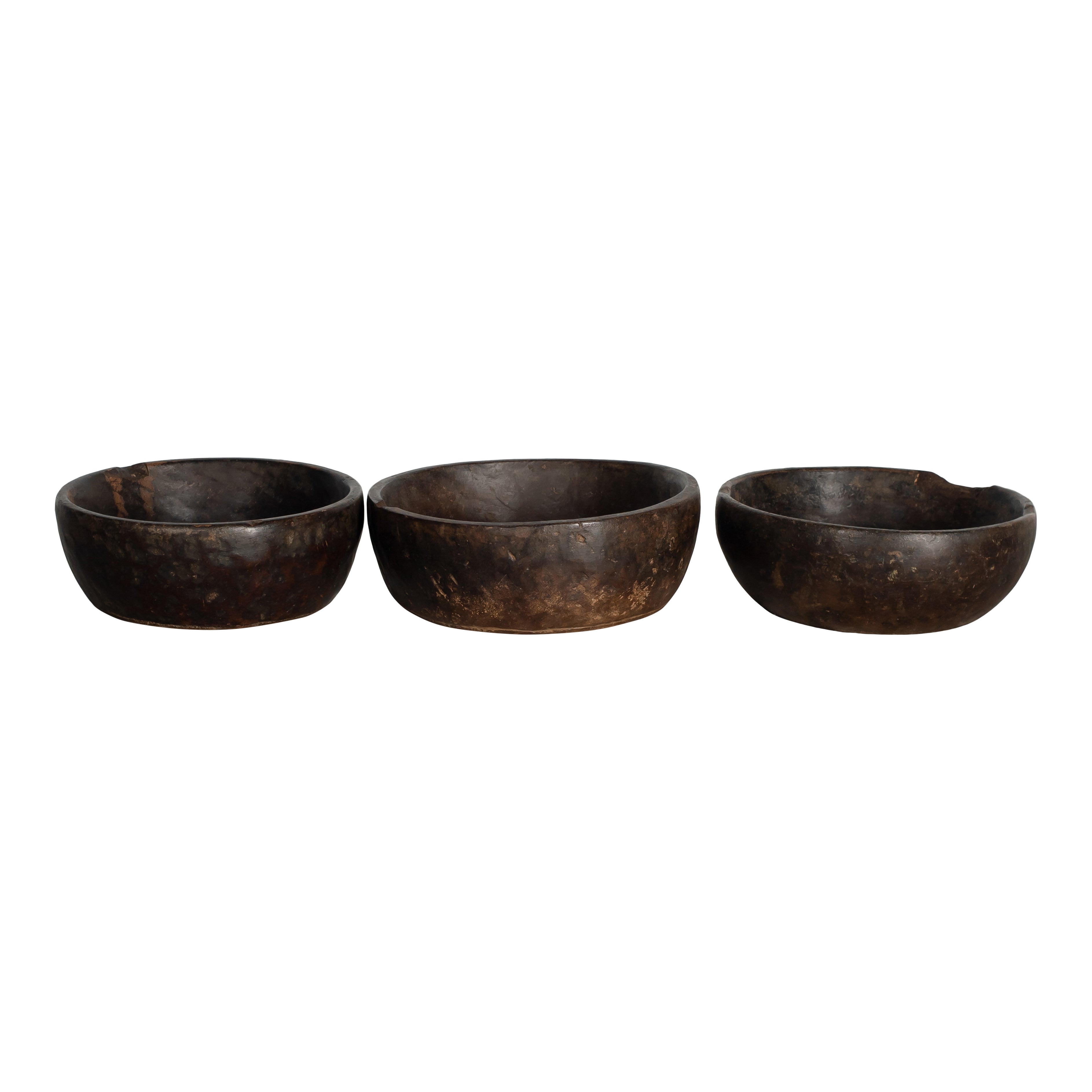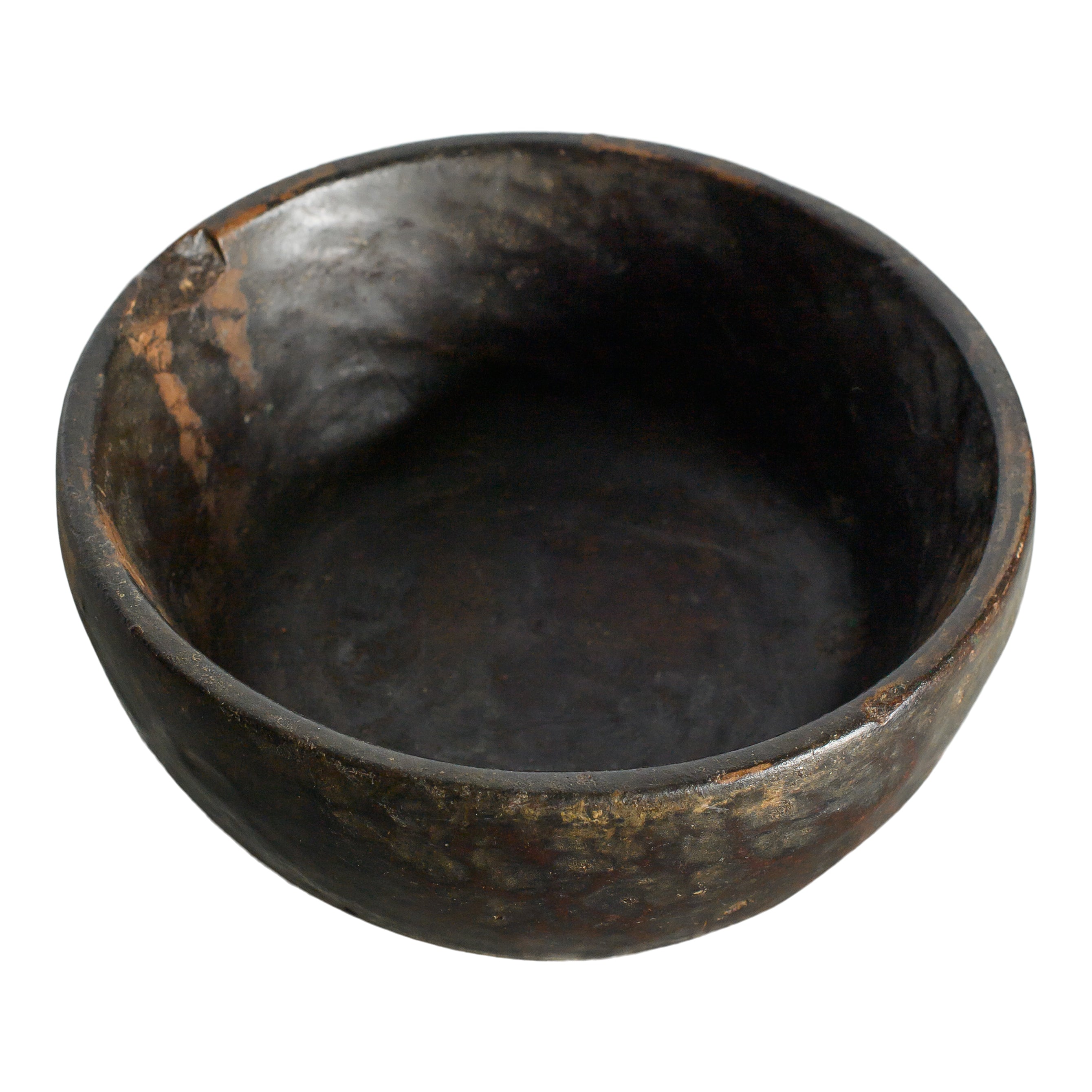 A hand-carved stone bowl with a wide, rounded form and a dark, mottled surface marked by natural variation and wear. The aged finish brings depth and an organic feel, making it a strong accent for tabletop styling or layered décor moments. Size and color may vary.