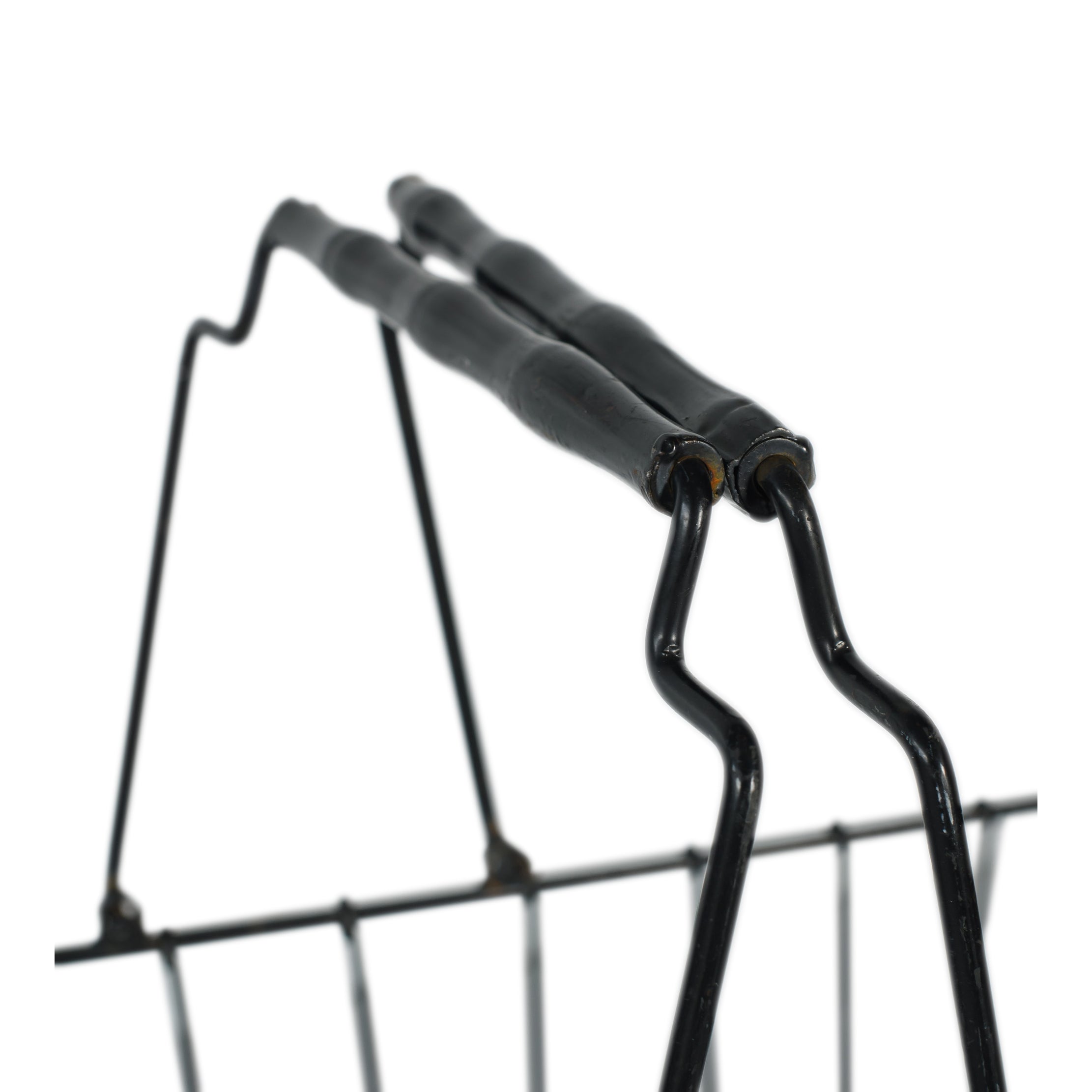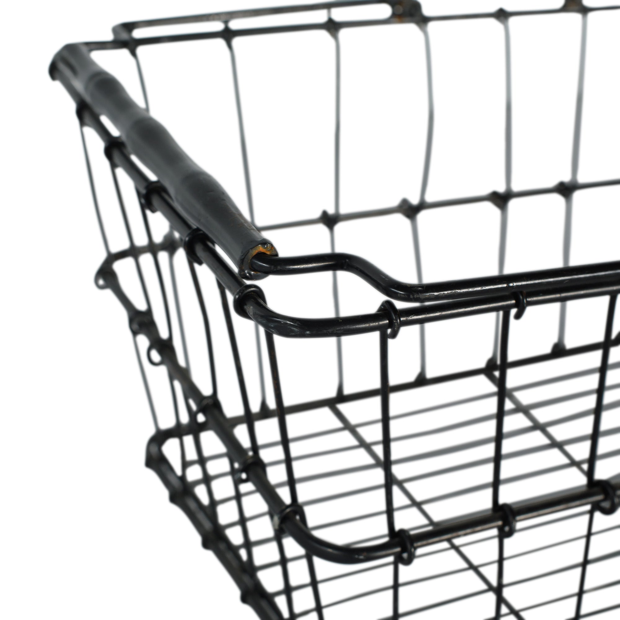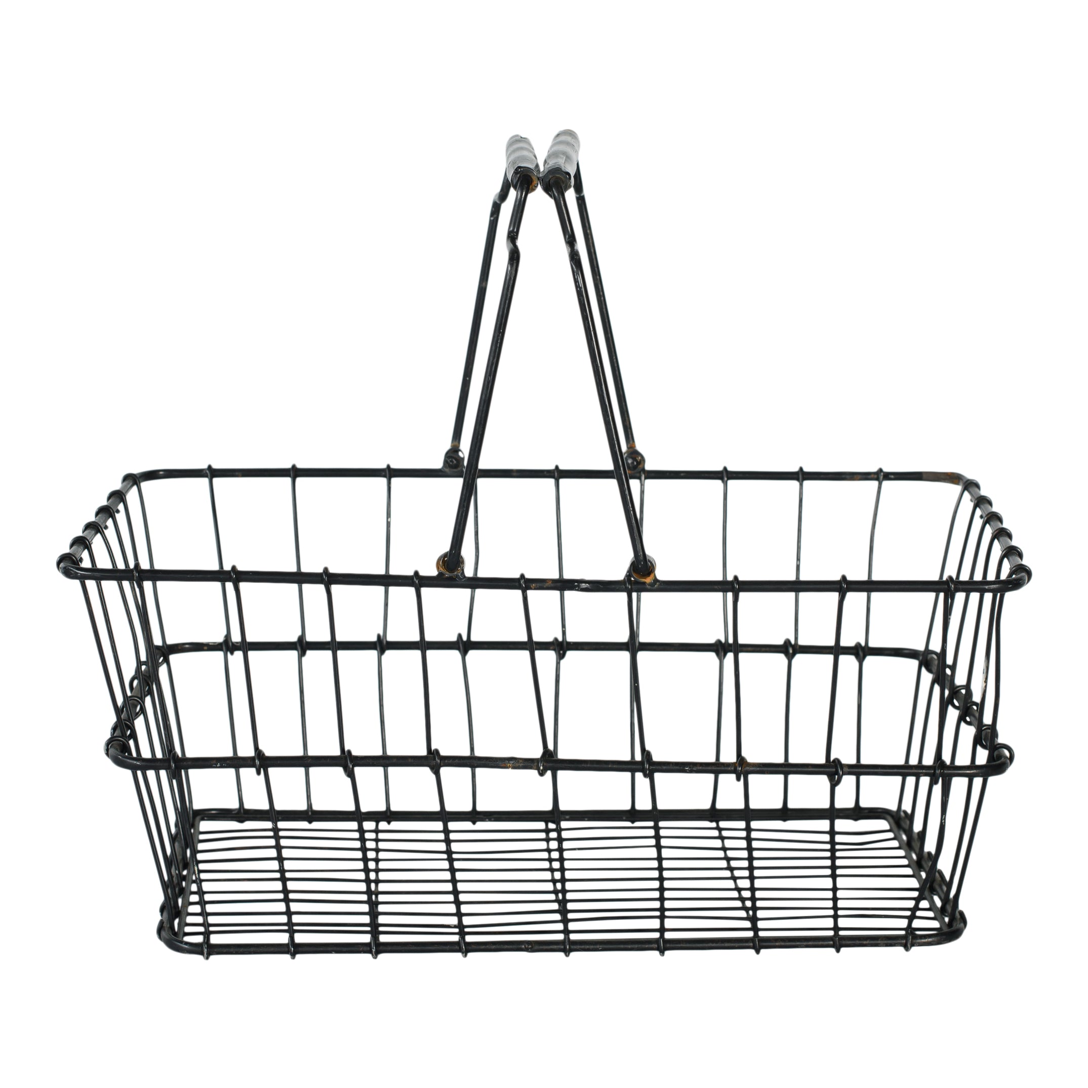 A structured wire market basket with a sleek black finish and easy-grip handles. Great for gathering welcome essentials, corralling ceremony programs, or adding a touch of utilitarian style to any display.